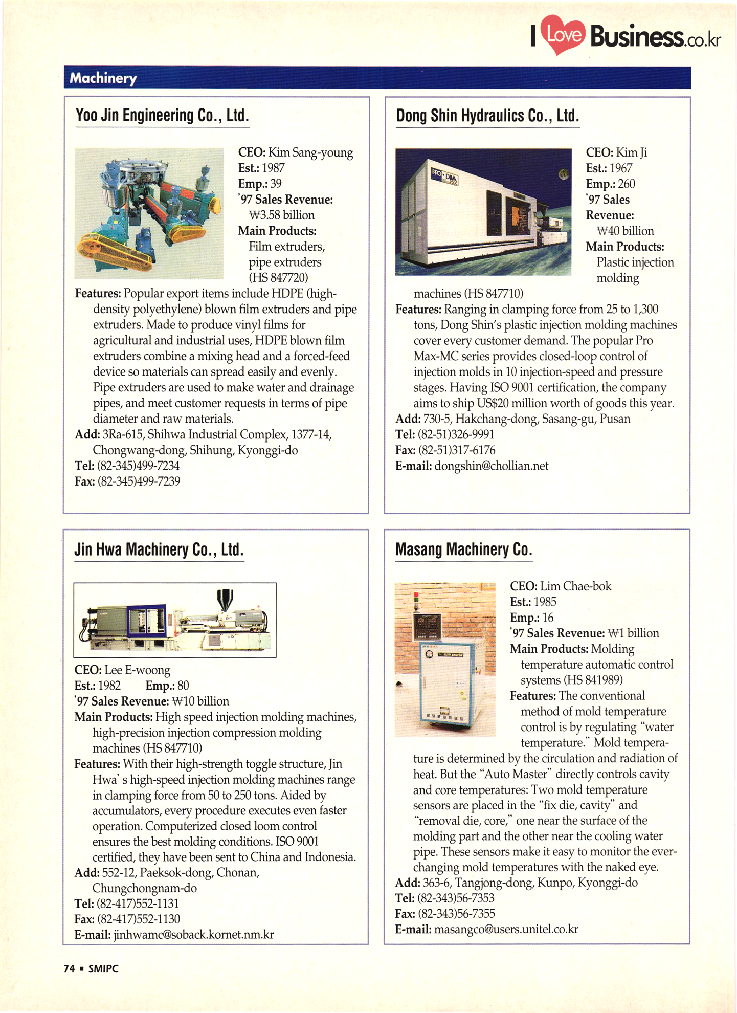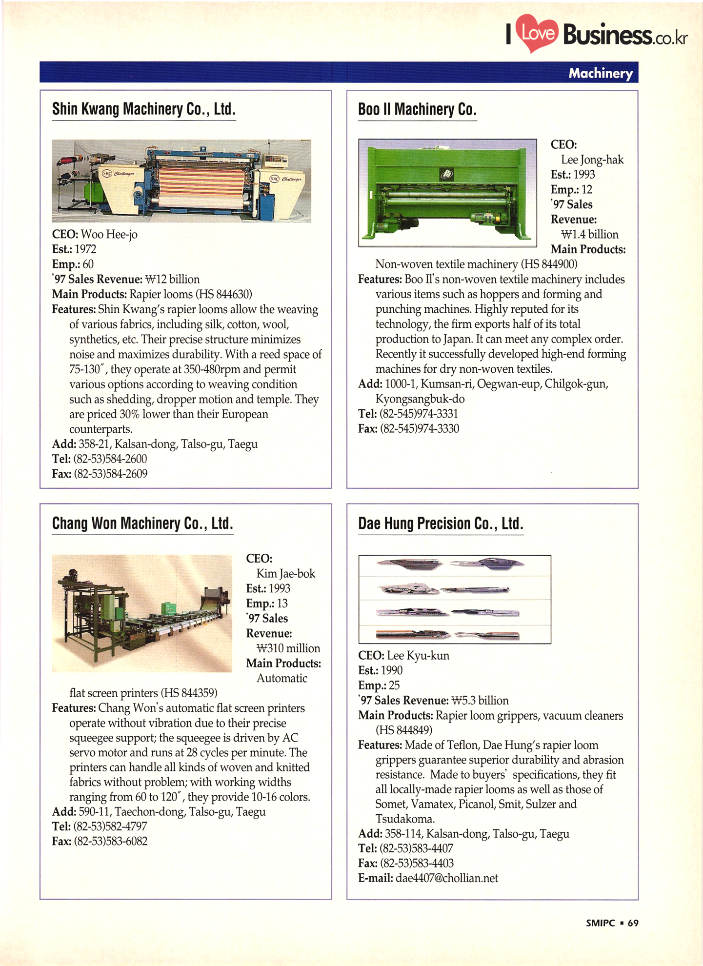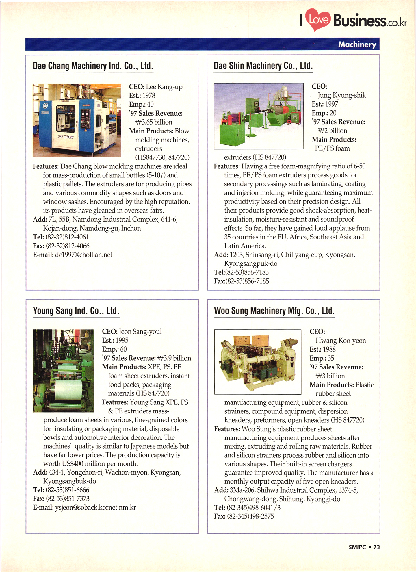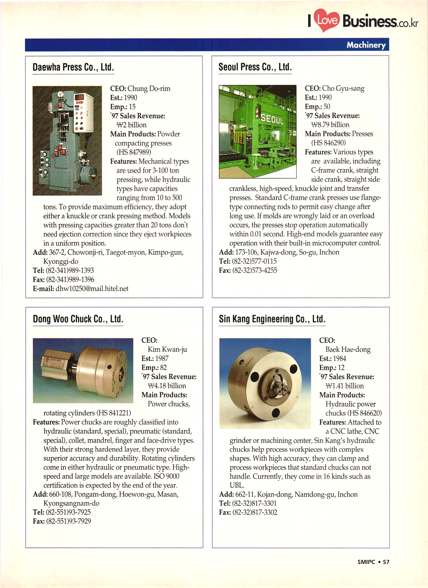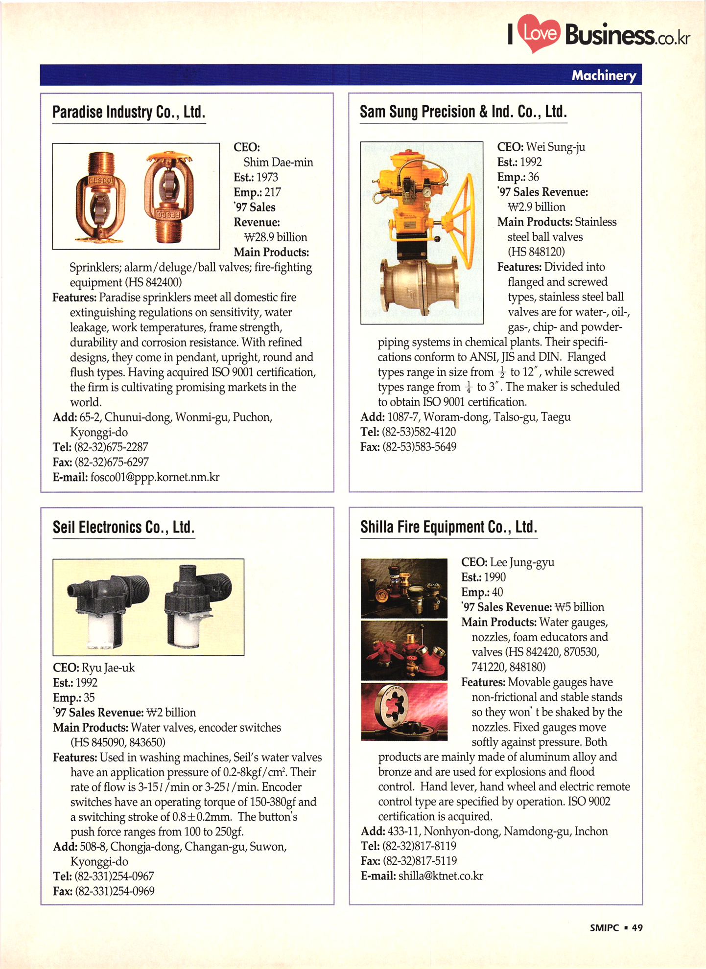 | I Love Business.co.kr small ME www.smallme.co.kr Quality Products from Korea CONTENTS • Metal Products • Machinery ..... Precision Equipment & Instrumentation • Electronic & Electric Products ........ 119 • Automobile Parts & ................... 191 Other Transportation Equipment • Chemical Products • Textile & Leather Products ......... Published on Aug. 5, 1998 by Small & Medium Industry Promotion Corporation (SMIPC) Add: 24-3, Yoido-dong, Yongdungpo-gu, Seoul, Korea Tel: (82-2)769-6841-50 Fax: (82-2)769-6959, 782-9702 E-mail: webmaster@smipc.or.kr URL: http://www.smipc.or.kr http://home.smipc.or.kr • Building Materials · • Household & Misc. Goods ........... Edited by Maekyung Buyers Guide Corp. Add: Trade Center PO Box 8, Seoul, Korea Tel: (82-2)551-2376-90 Fax: (82-2)551-2377, 2383 E-mail: mkbg@buyersguide.co.kr URL: http://www.buyersguide.co.kr Price: W20,000 Love Business Machinery Cutting tools Molds & dies Gears & reducers Material handling equipment Pumps & compressors Valves & fittings Blowers & fans Boilers Heat exchangers Packing M/C Metal working M/C Machine parts Welding M/C Automation equipment Construction equipment Food processing M/C Textile M/C & parts Paper working M/C Printing M/C Plastic processing M/C Semiconductor manufacturing equipment Refrigerators & air handling equipment 'Water treatment equipment Other industrial M/C |
