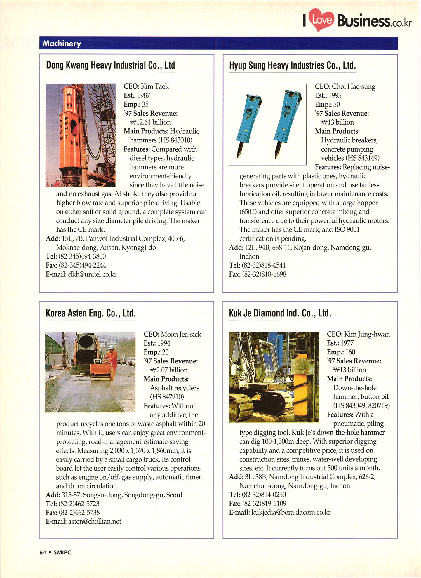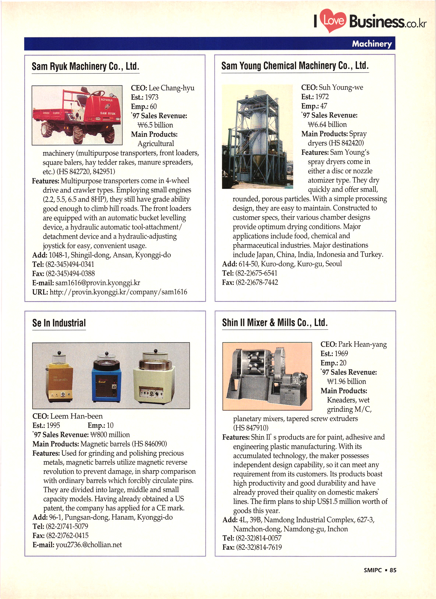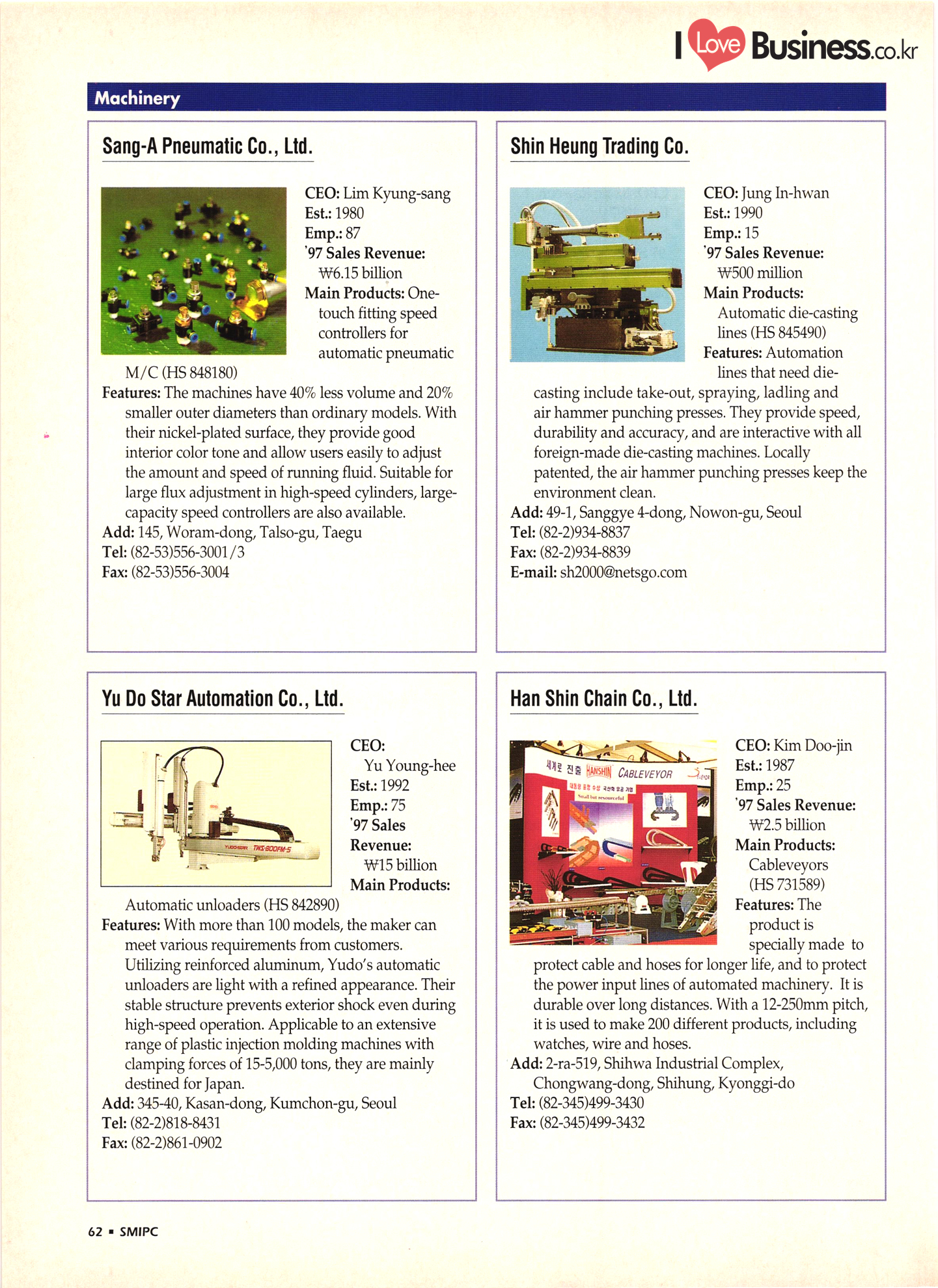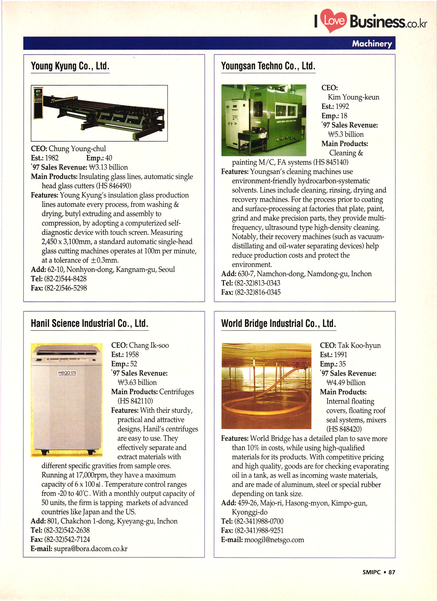 | I Love Business.co.kr small ME www.smallme.co.kr Quality Products from Korea CONTENTS • Metal Products • Machinery ..... Precision Equipment & Instrumentation • Electronic & Electric Products ........ 119 • Automobile Parts & ................... 191 Other Transportation Equipment • Chemical Products • Textile & Leather Products ......... Published on Aug. 5, 1998 by Small & Medium Industry Promotion Corporation (SMIPC) Add: 24-3, Yoido-dong, Yongdungpo-gu, Seoul, Korea Tel: (82-2)769-6841-50 Fax: (82-2)769-6959, 782-9702 E-mail: webmaster@smipc.or.kr URL: http://www.smipc.or.kr http://home.smipc.or.kr • Building Materials · • Household & Misc. Goods ........... Edited by Maekyung Buyers Guide Corp. Add: Trade Center PO Box 8, Seoul, Korea Tel: (82-2)551-2376-90 Fax: (82-2)551-2377, 2383 E-mail: mkbg@buyersguide.co.kr URL: http://www.buyersguide.co.kr Price: W20,000 Love Business Machinery Cutting tools Molds & dies Gears & reducers Material handling equipment Pumps & compressors Valves & fittings Blowers & fans Boilers Heat exchangers Packing M/C Metal working M/C Machine parts Welding M/C Automation equipment Construction equipment Food processing M/C Textile M/C & parts Paper working M/C Printing M/C Plastic processing M/C Semiconductor manufacturing equipment Refrigerators & air handling equipment 'Water treatment equipment Other industrial M/C |