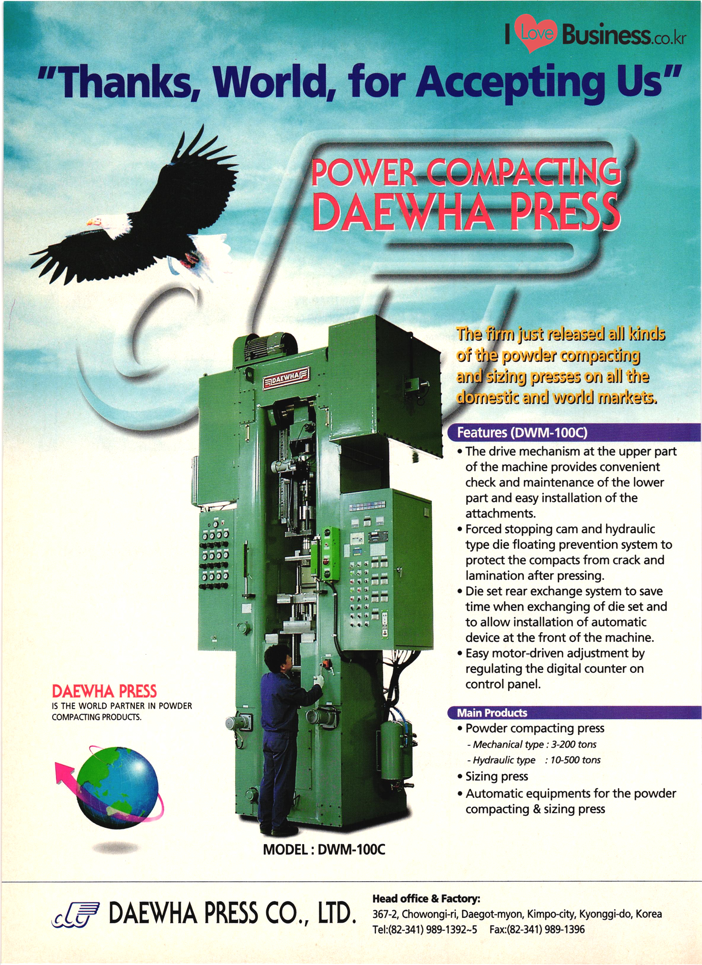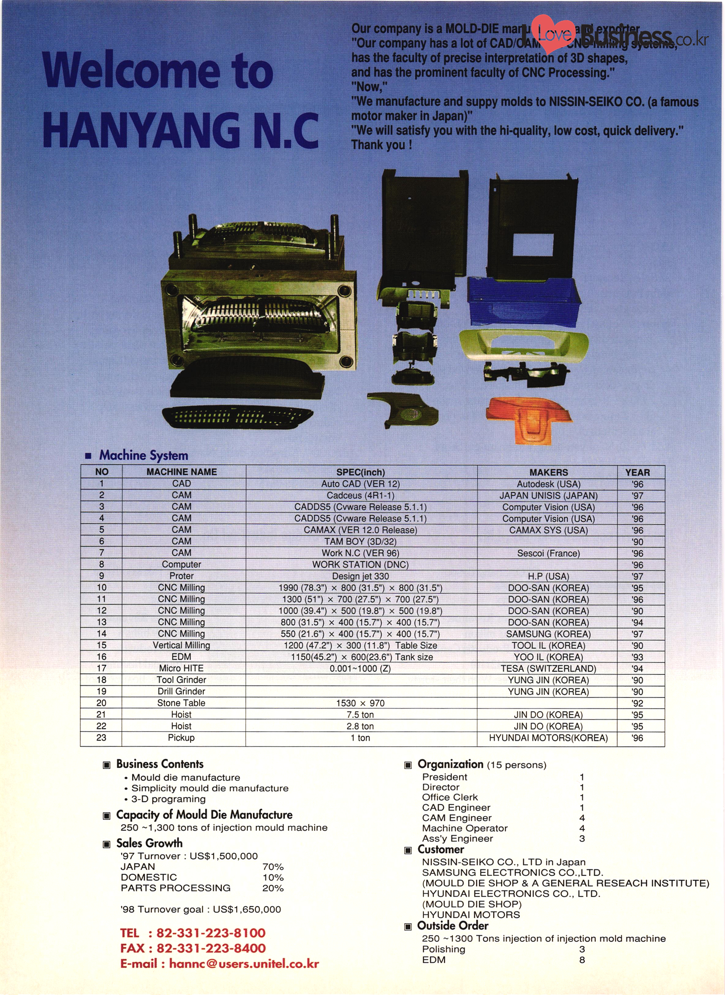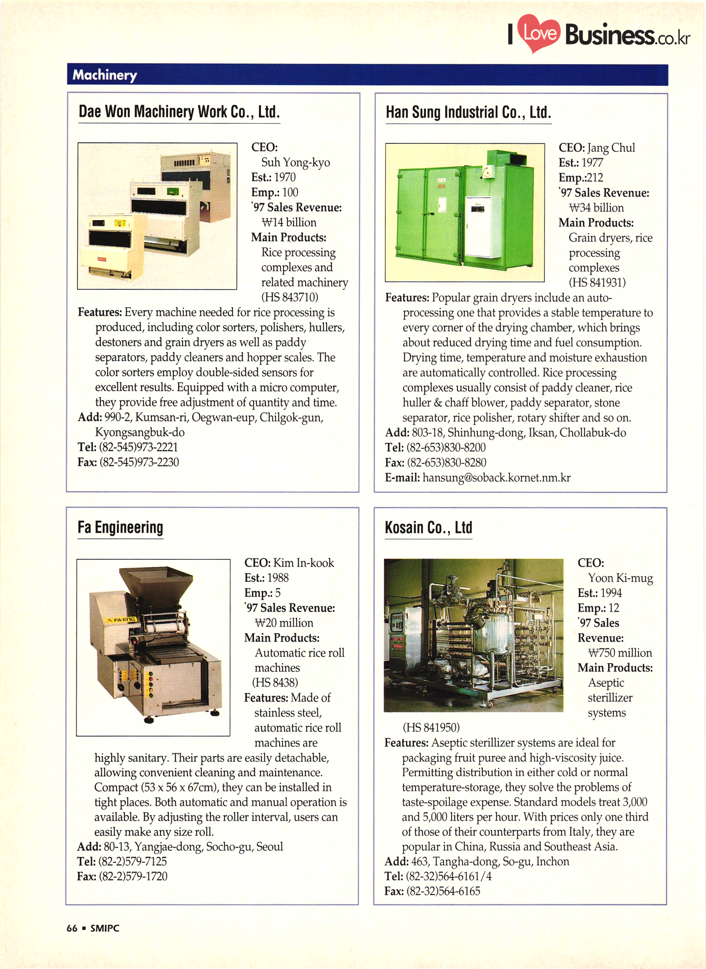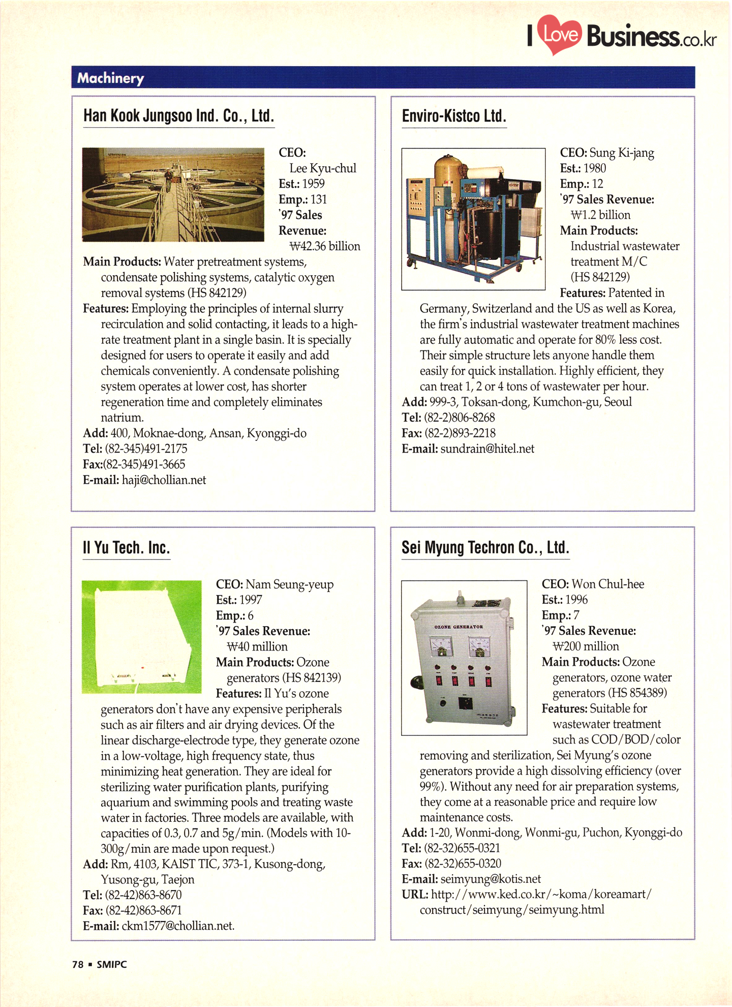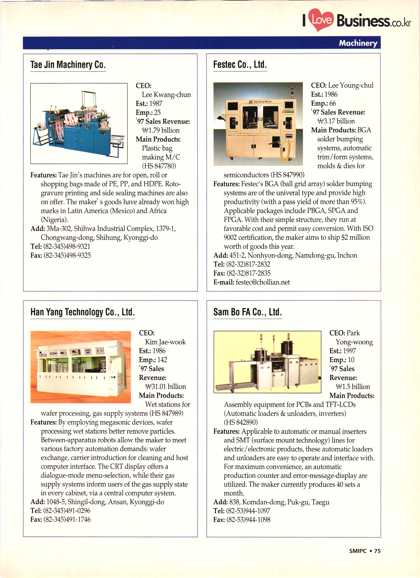 | I Love Business.co.kr small ME www.smallme.co.kr Quality Products from Korea CONTENTS • Metal Products • Machinery ..... Precision Equipment & Instrumentation • Electronic & Electric Products ........ 119 • Automobile Parts & ................... 191 Other Transportation Equipment • Chemical Products • Textile & Leather Products ......... Published on Aug. 5, 1998 by Small & Medium Industry Promotion Corporation (SMIPC) Add: 24-3, Yoido-dong, Yongdungpo-gu, Seoul, Korea Tel: (82-2)769-6841-50 Fax: (82-2)769-6959, 782-9702 E-mail: webmaster@smipc.or.kr URL: http://www.smipc.or.kr http://home.smipc.or.kr • Building Materials · • Household & Misc. Goods ........... Edited by Maekyung Buyers Guide Corp. Add: Trade Center PO Box 8, Seoul, Korea Tel: (82-2)551-2376-90 Fax: (82-2)551-2377, 2383 E-mail: mkbg@buyersguide.co.kr URL: http://www.buyersguide.co.kr Price: W20,000 Love Business Machinery Cutting tools Molds & dies Gears & reducers Material handling equipment Pumps & compressors Valves & fittings Blowers & fans Boilers Heat exchangers Packing M/C Metal working M/C Machine parts Welding M/C Automation equipment Construction equipment Food processing M/C Textile M/C & parts Paper working M/C Printing M/C Plastic processing M/C Semiconductor manufacturing equipment Refrigerators & air handling equipment 'Water treatment equipment Other industrial M/C |