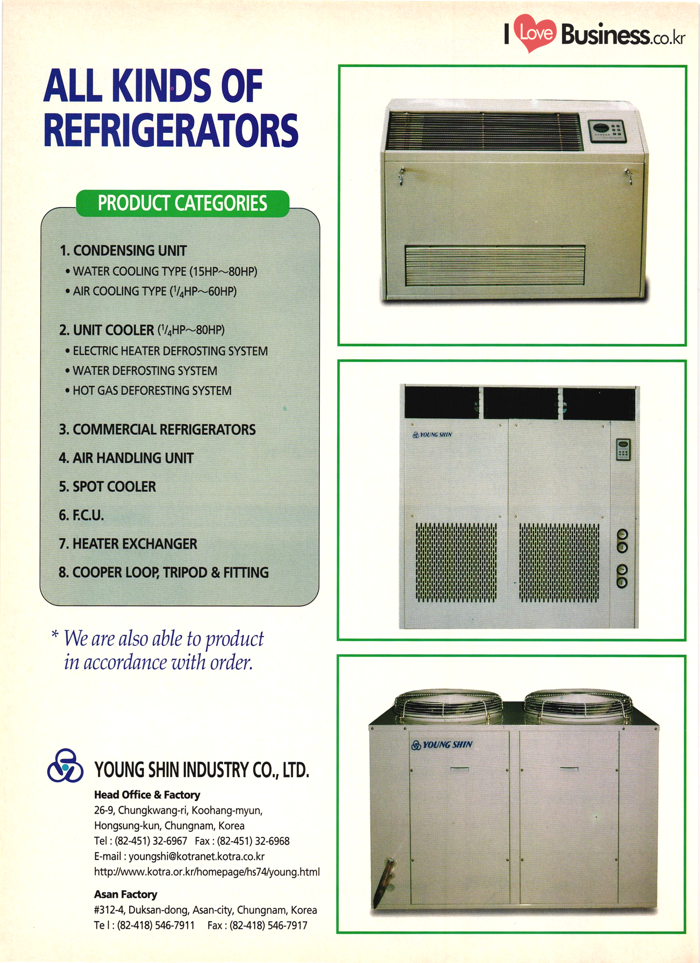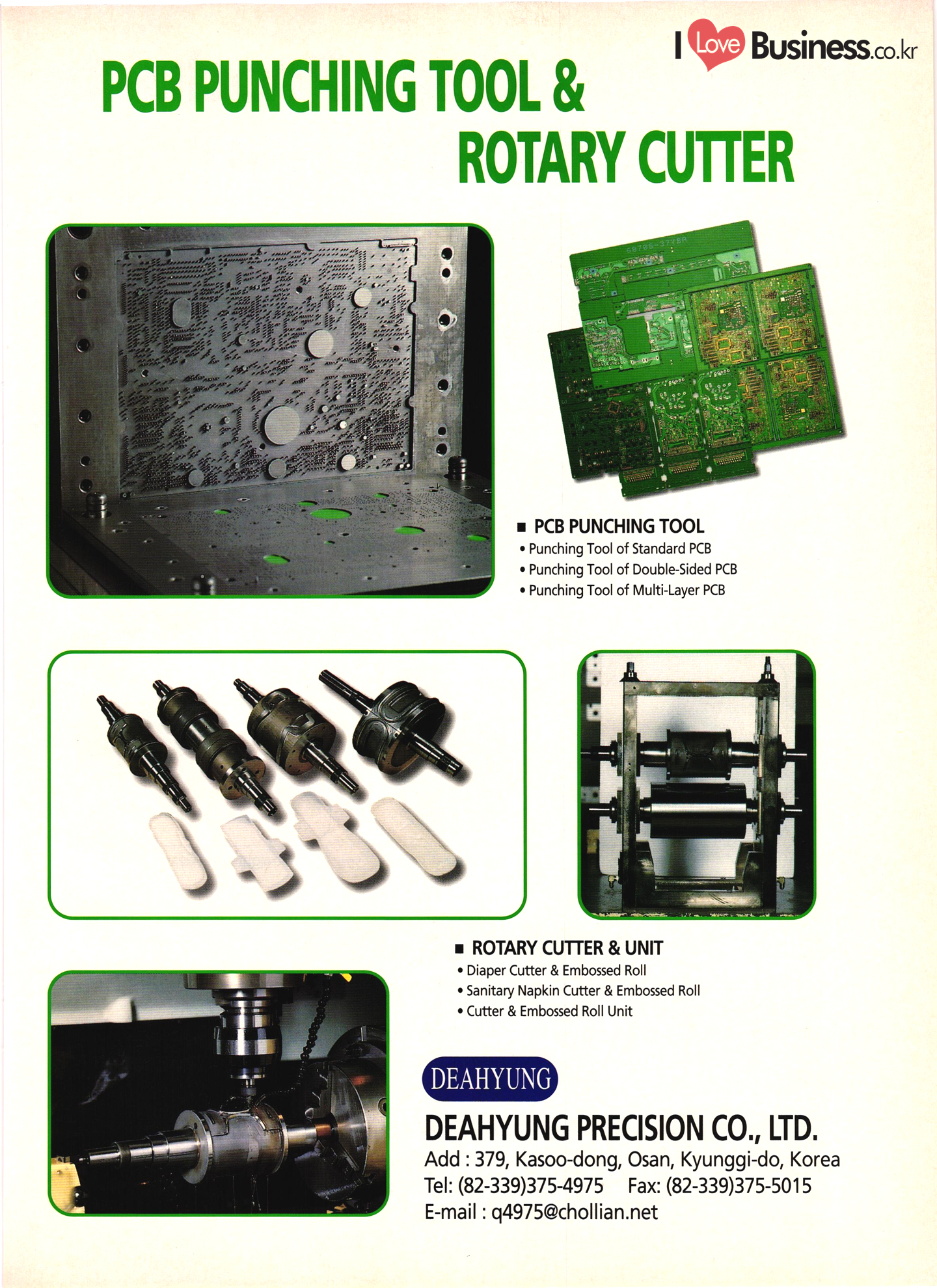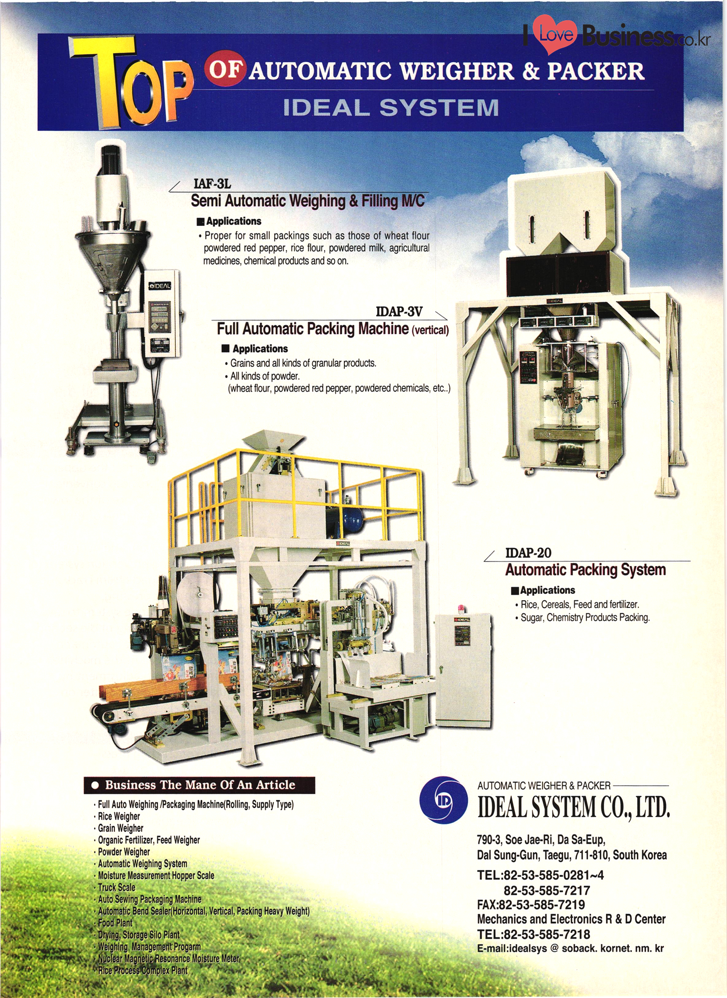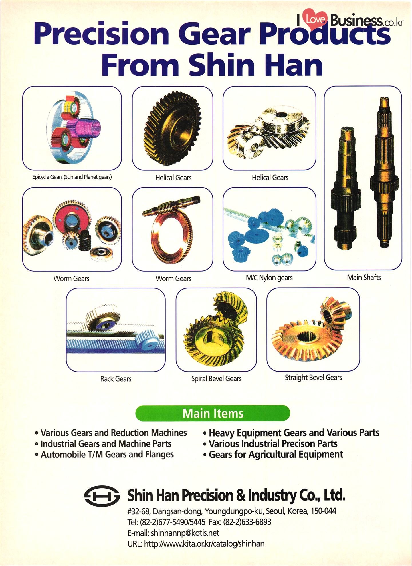Precision Equipment & Instrumentation Measuring & testing equipment Optical equipment Medical equipment I Love Business.cok Electronic & Electric Products Computer peripherals & accessories Software Business equipment Audio & components Communications equipment & parts CCTV systems Electronic parts & components PCBs Electric home appliances Alternators Motors & cores UPS & converters Batteries & chargers Transformers & transducers Circuit breakers Relays Wire & cable Other I Love Business.co.kr | Automobile Parts & Other Transportation Equipment Engine parts Brakes Gears & transmissions Electric & electronic parts Coolers & heaters Control cable Castings Metal parts Al wheels Rubber parts Filters Car security alarms Other auto parts & accessories Ship machinery & outfitting Lift trucks Heavy equipment parts Bicycle frames |