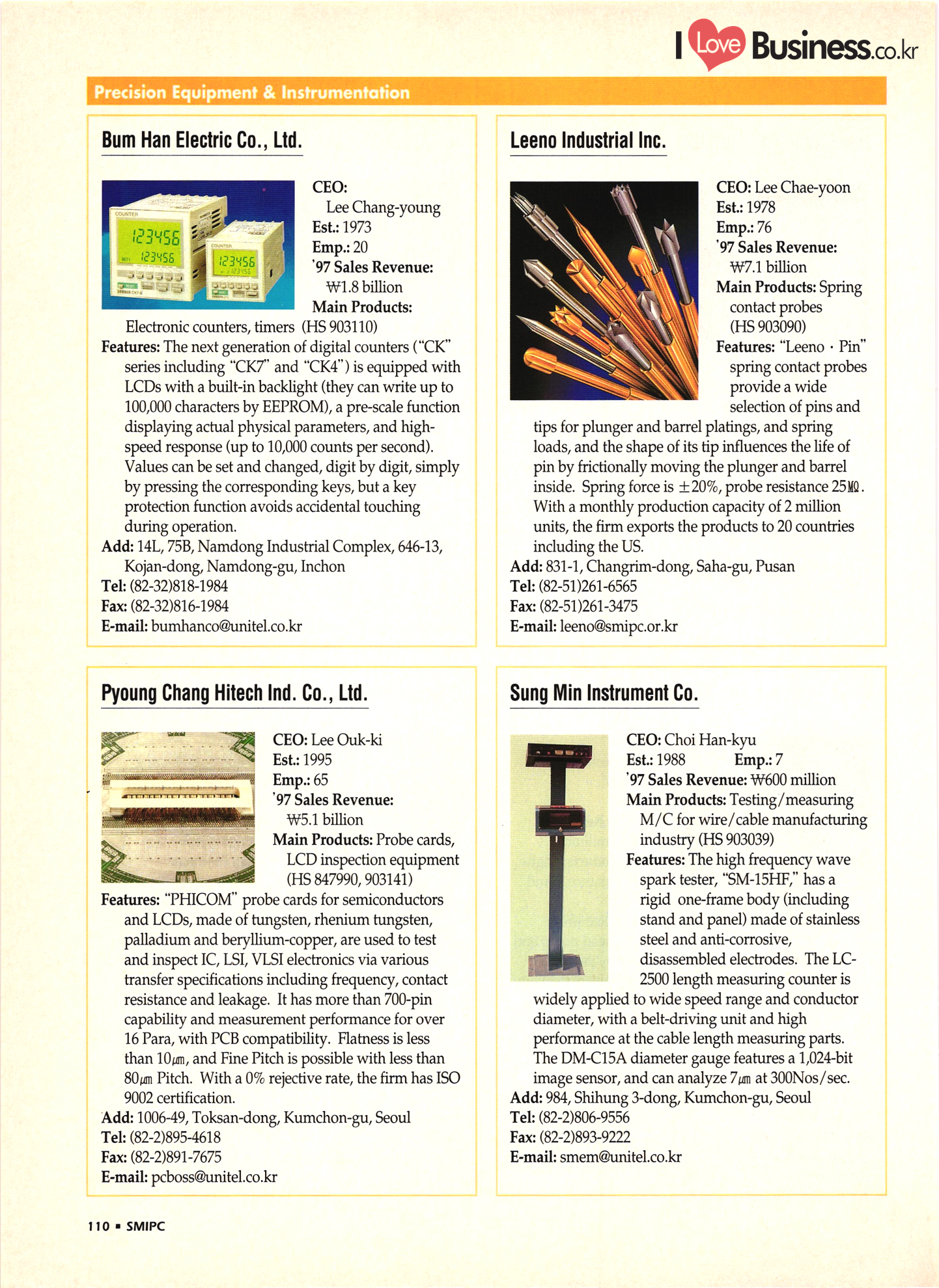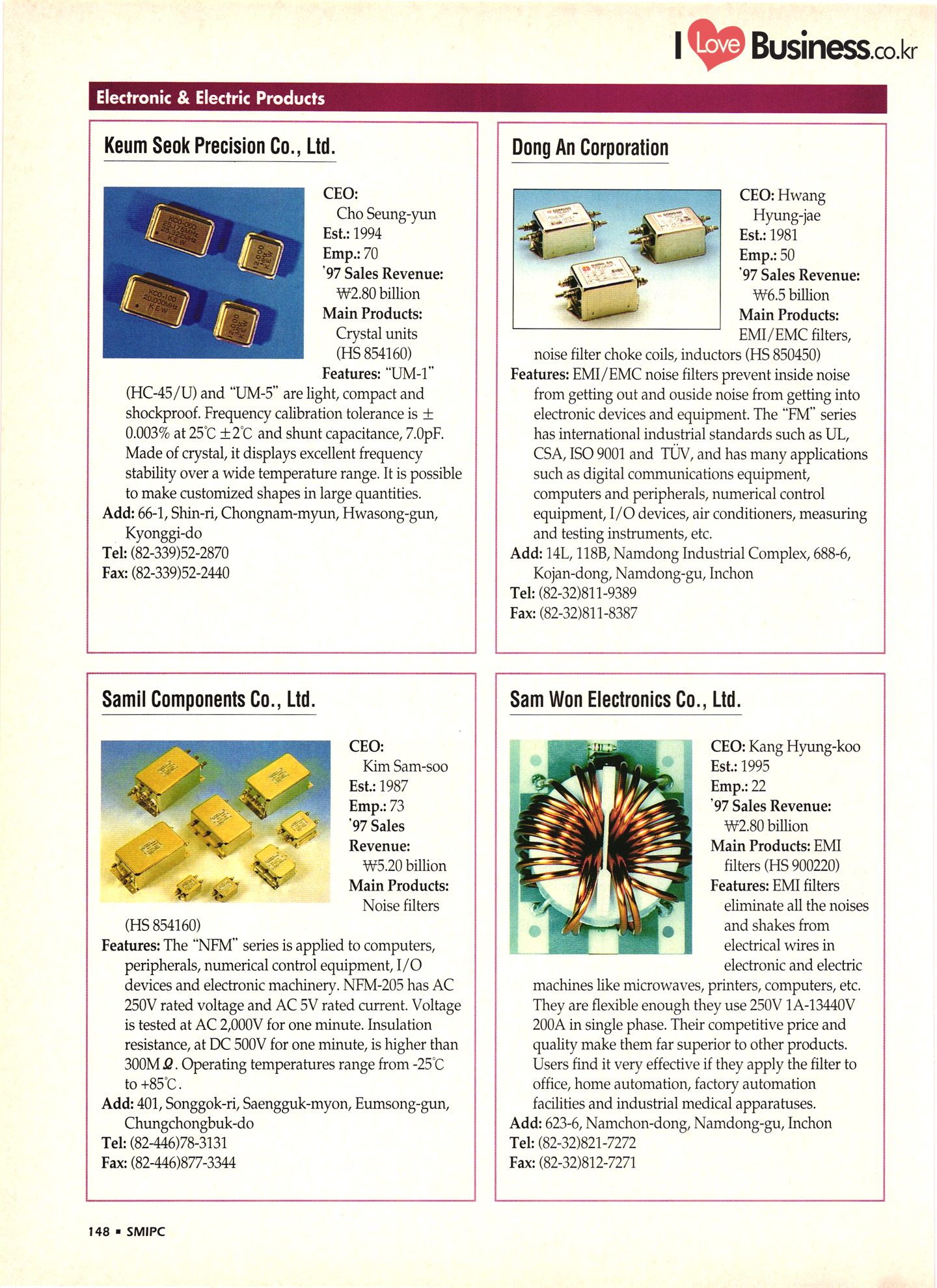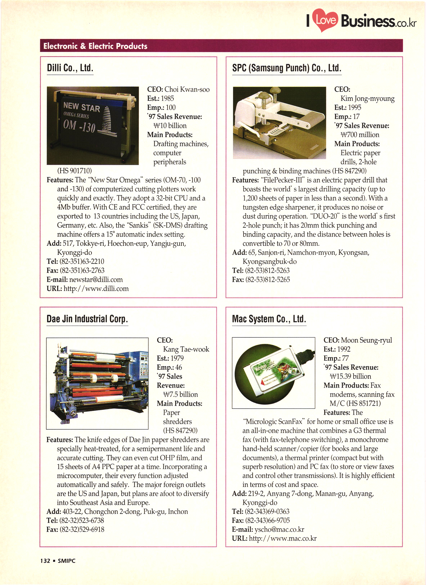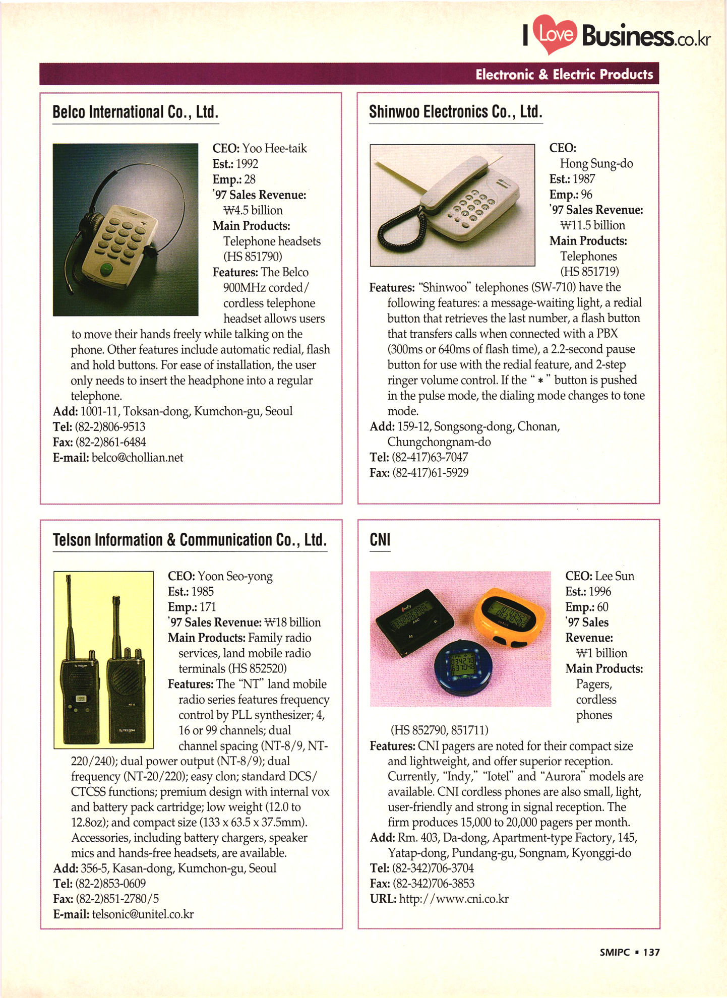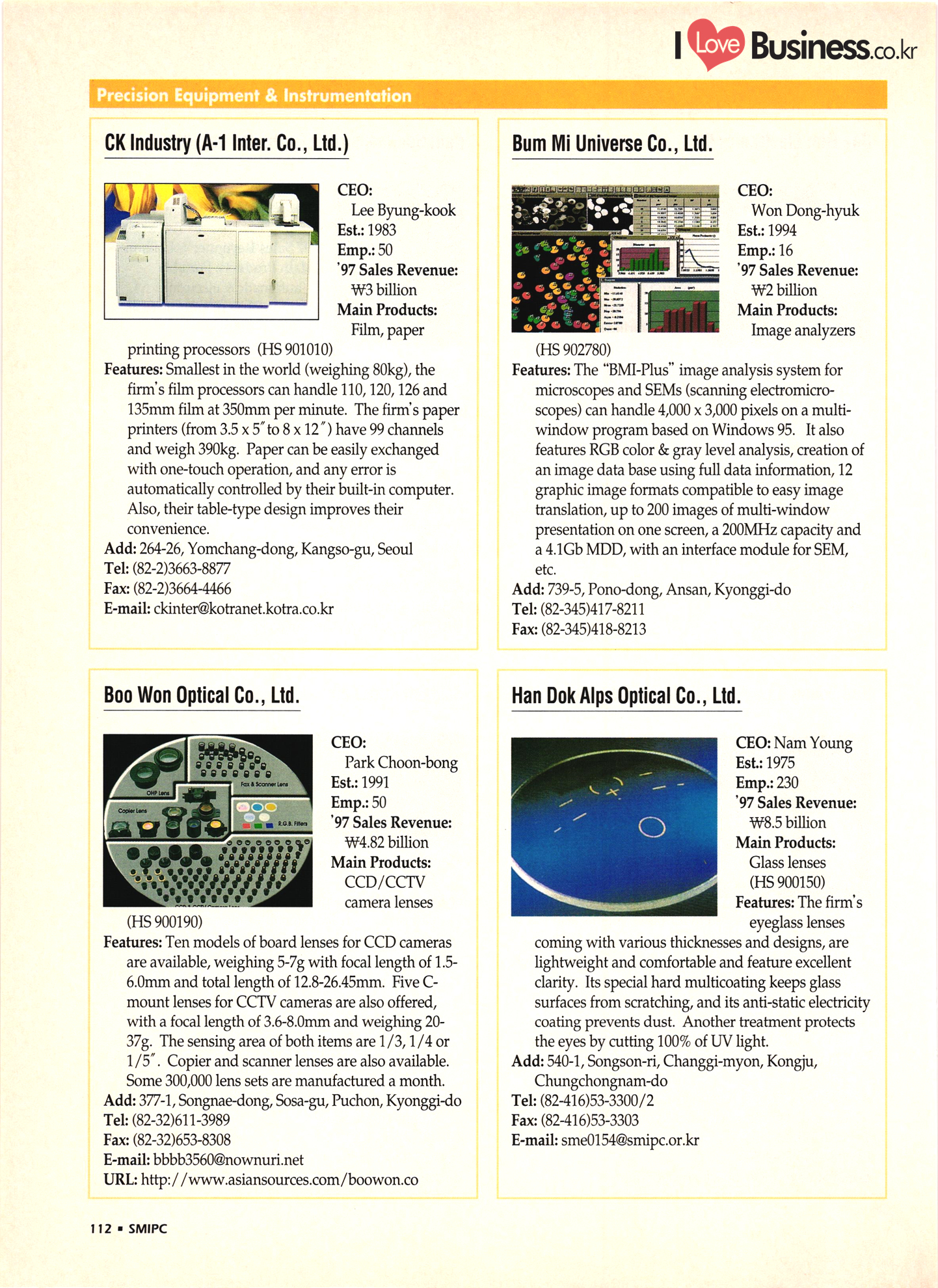 | I Love Business.co.kr small ME www.smallme.co.kr Quality Products from Korea CONTENTS • Metal Products • Machinery ..... Precision Equipment & Instrumentation • Electronic & Electric Products ........ 119 • Automobile Parts & ................... 191 Other Transportation Equipment • Chemical Products • Textile & Leather Products ......... Published on Aug. 5, 1998 by Small & Medium Industry Promotion Corporation (SMIPC) Add: 24-3, Yoido-dong, Yongdungpo-gu, Seoul, Korea Tel: (82-2)769-6841-50 Fax: (82-2)769-6959, 782-9702 E-mail: webmaster@smipc.or.kr URL: http://www.smipc.or.kr http://home.smipc.or.kr • Building Materials · • Household & Misc. Goods ........... Edited by Maekyung Buyers Guide Corp. Add: Trade Center PO Box 8, Seoul, Korea Tel: (82-2)551-2376-90 Fax: (82-2)551-2377, 2383 E-mail: mkbg@buyersguide.co.kr URL: http://www.buyersguide.co.kr Price: W20,000 Love Business Machinery Cutting tools Molds & dies Gears & reducers Material handling equipment Pumps & compressors Valves & fittings Blowers & fans Boilers Heat exchangers Packing M/C Metal working M/C Machine parts Welding M/C Automation equipment Construction equipment Food processing M/C Textile M/C & parts Paper working M/C Printing M/C Plastic processing M/C Semiconductor manufacturing equipment Refrigerators & air handling equipment 'Water treatment equipment Other industrial M/C |