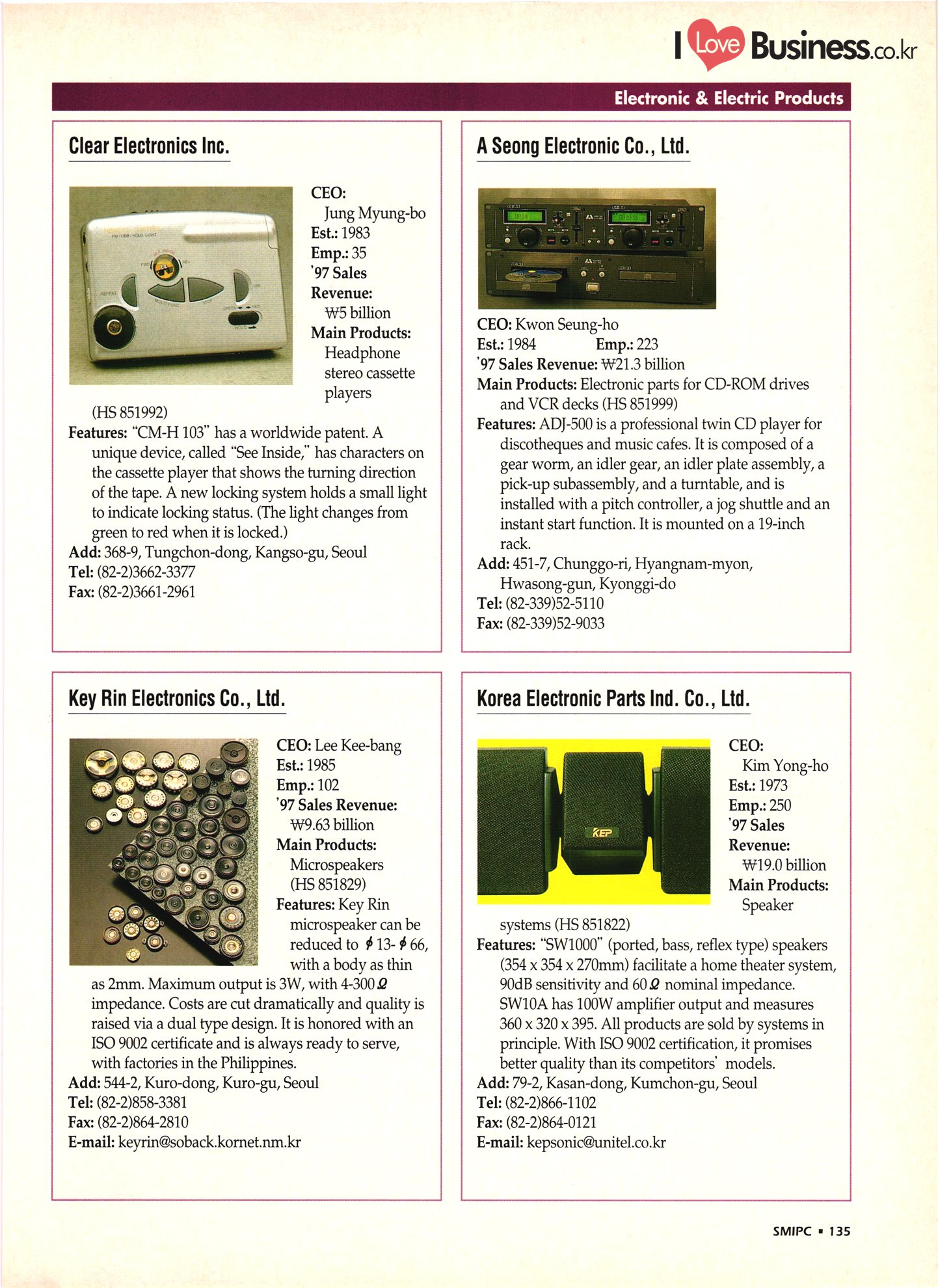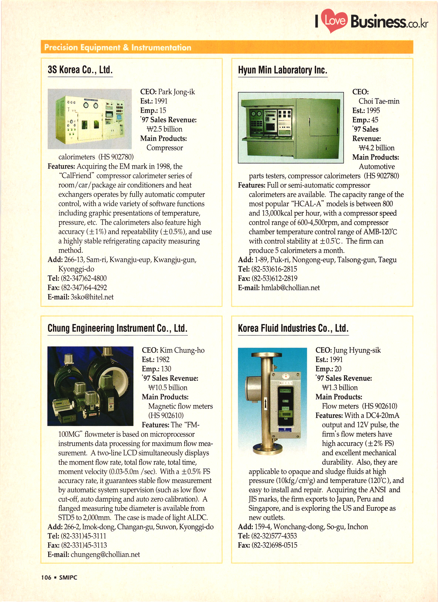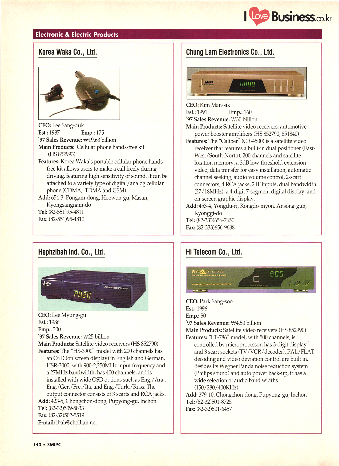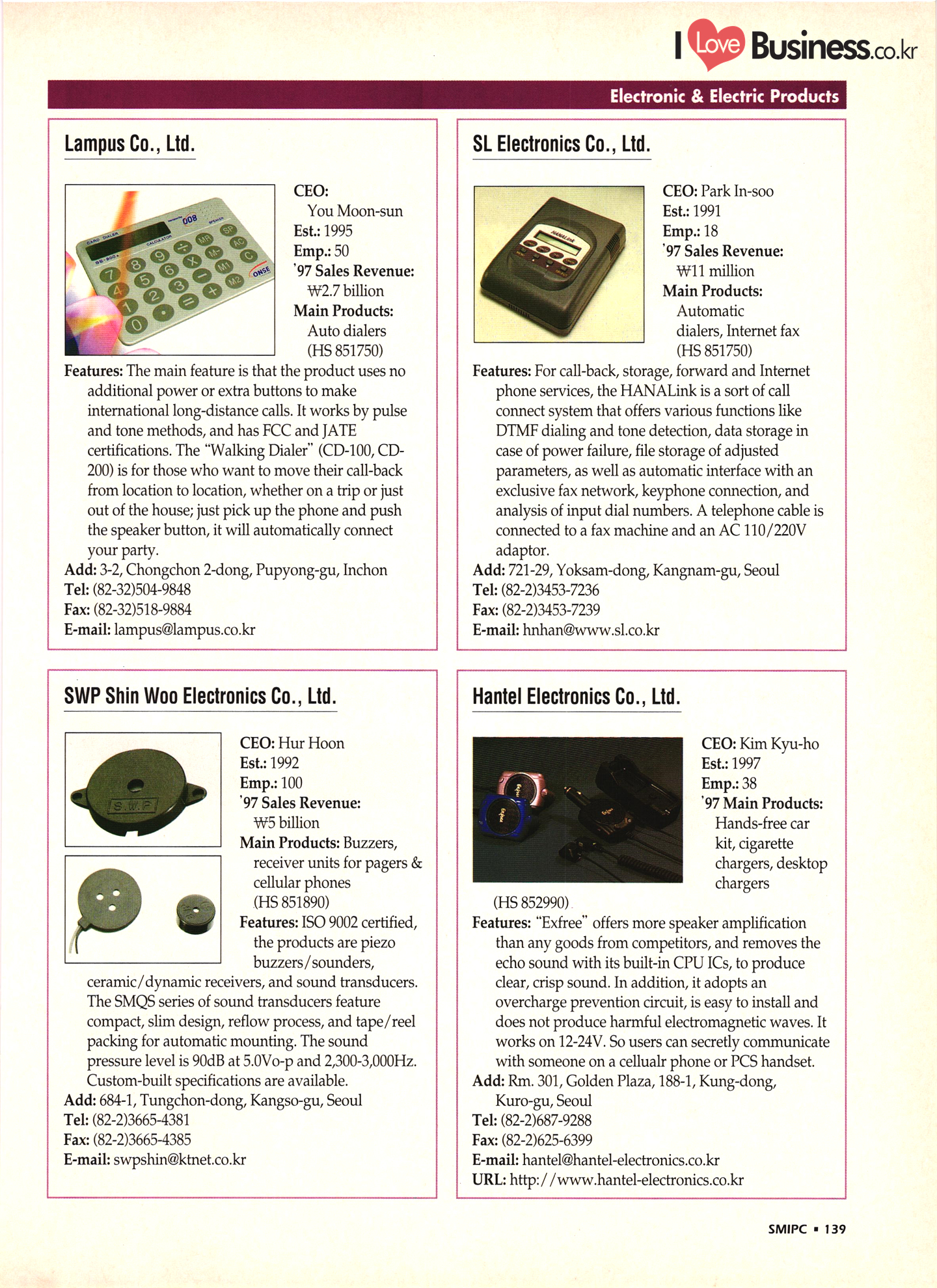 | I Love Business.co.kr small ME www.smallme.co.kr Quality Products from Korea CONTENTS • Metal Products • Machinery ..... Precision Equipment & Instrumentation • Electronic & Electric Products ........ 119 • Automobile Parts & ................... 191 Other Transportation Equipment • Chemical Products • Textile & Leather Products ......... Published on Aug. 5, 1998 by Small & Medium Industry Promotion Corporation (SMIPC) Add: 24-3, Yoido-dong, Yongdungpo-gu, Seoul, Korea Tel: (82-2)769-6841-50 Fax: (82-2)769-6959, 782-9702 E-mail: webmaster@smipc.or.kr URL: http://www.smipc.or.kr http://home.smipc.or.kr • Building Materials · • Household & Misc. Goods ........... Edited by Maekyung Buyers Guide Corp. Add: Trade Center PO Box 8, Seoul, Korea Tel: (82-2)551-2376-90 Fax: (82-2)551-2377, 2383 E-mail: mkbg@buyersguide.co.kr URL: http://www.buyersguide.co.kr Price: W20,000 Love Business Machinery Cutting tools Molds & dies Gears & reducers Material handling equipment Pumps & compressors Valves & fittings Blowers & fans Boilers Heat exchangers Packing M/C Metal working M/C Machine parts Welding M/C Automation equipment Construction equipment Food processing M/C Textile M/C & parts Paper working M/C Printing M/C Plastic processing M/C Semiconductor manufacturing equipment Refrigerators & air handling equipment 'Water treatment equipment Other industrial M/C |