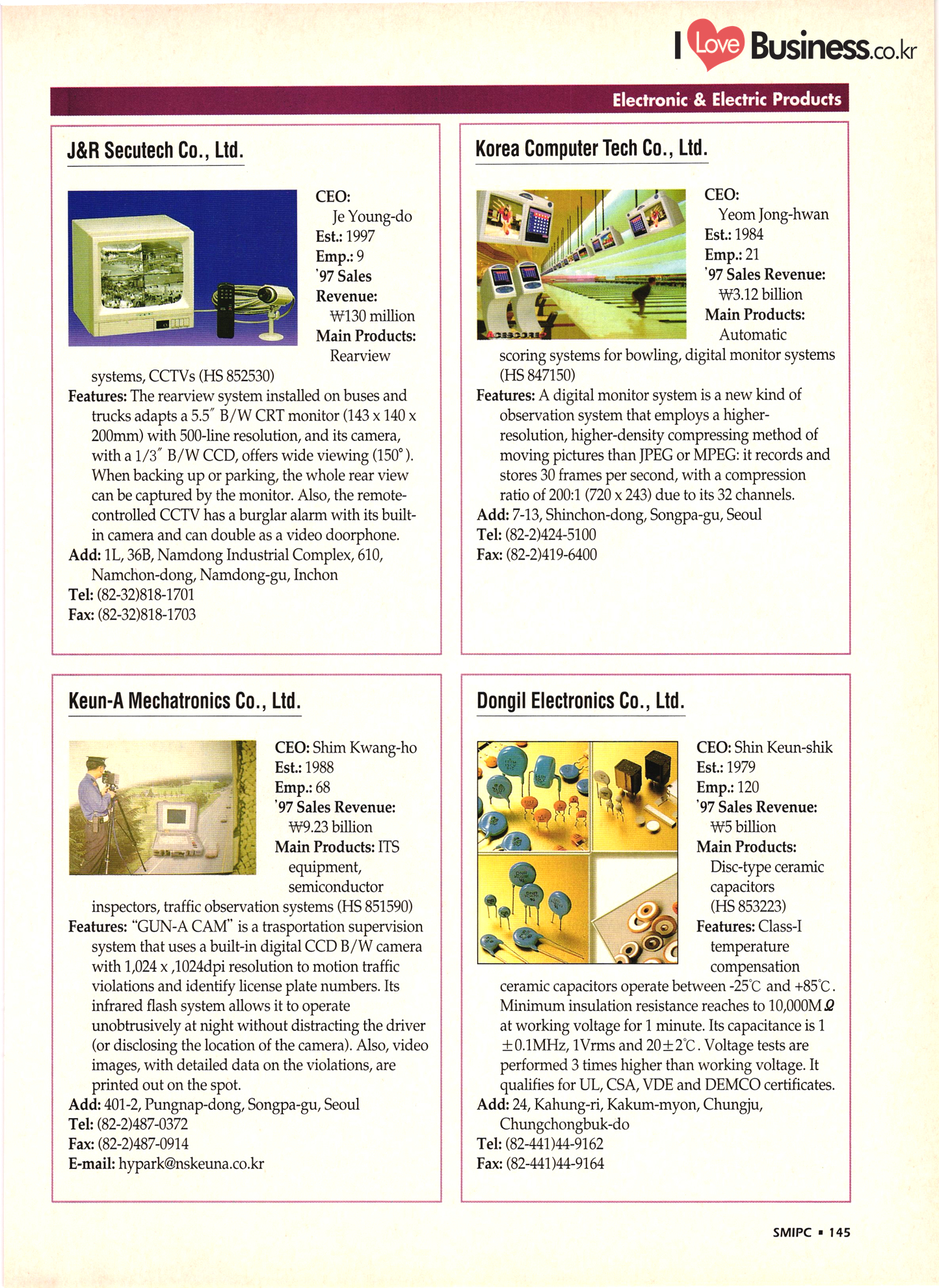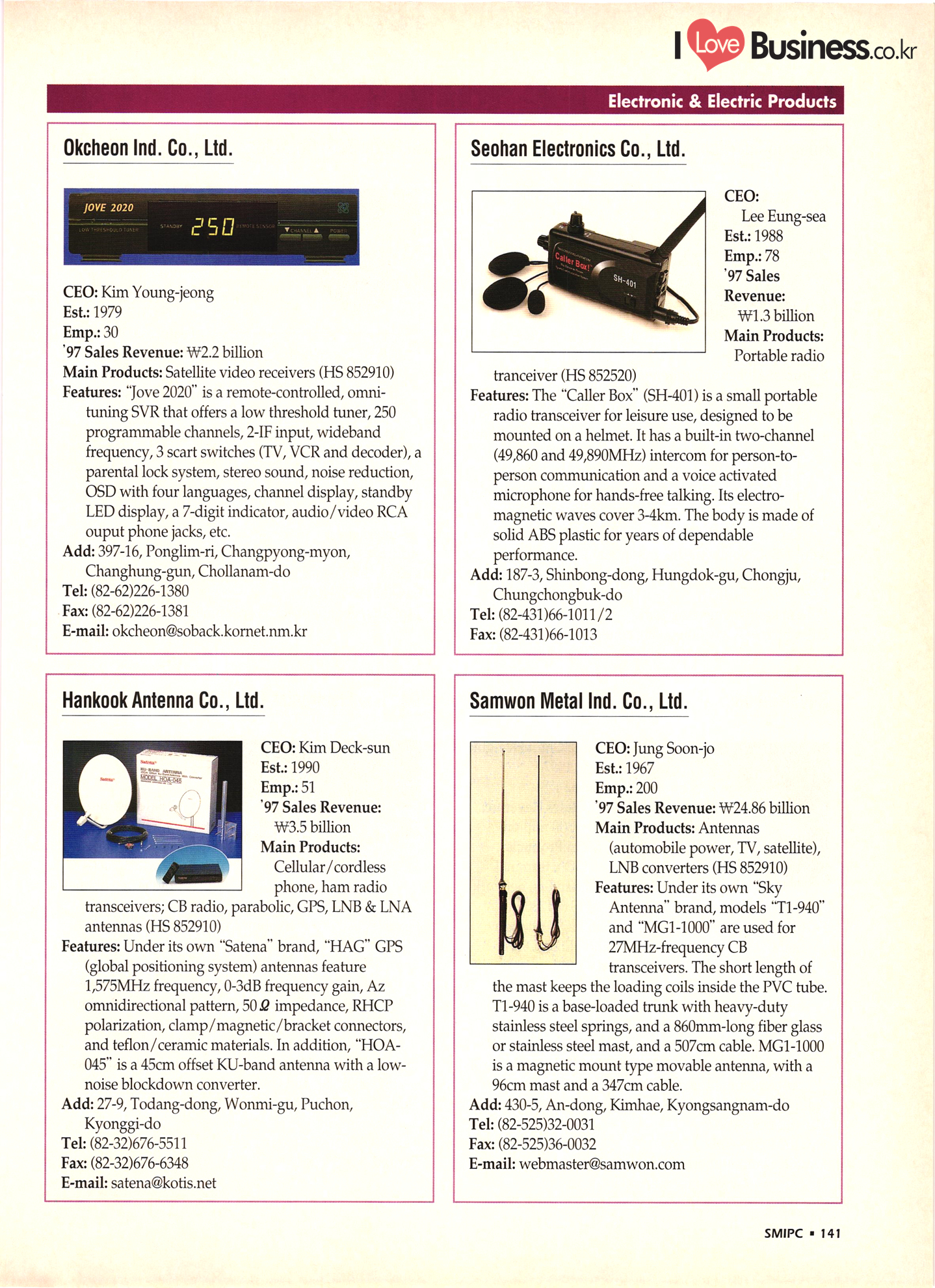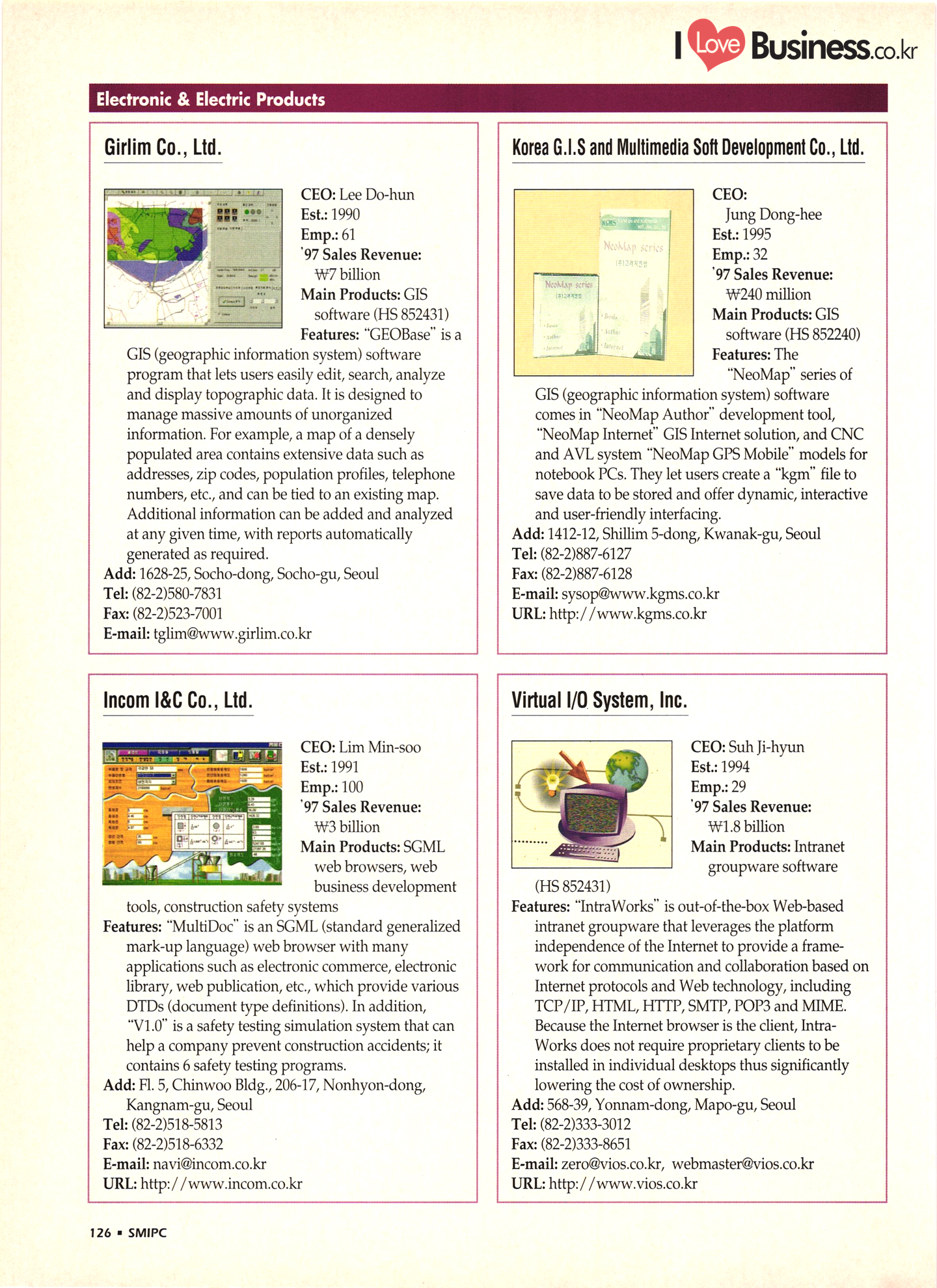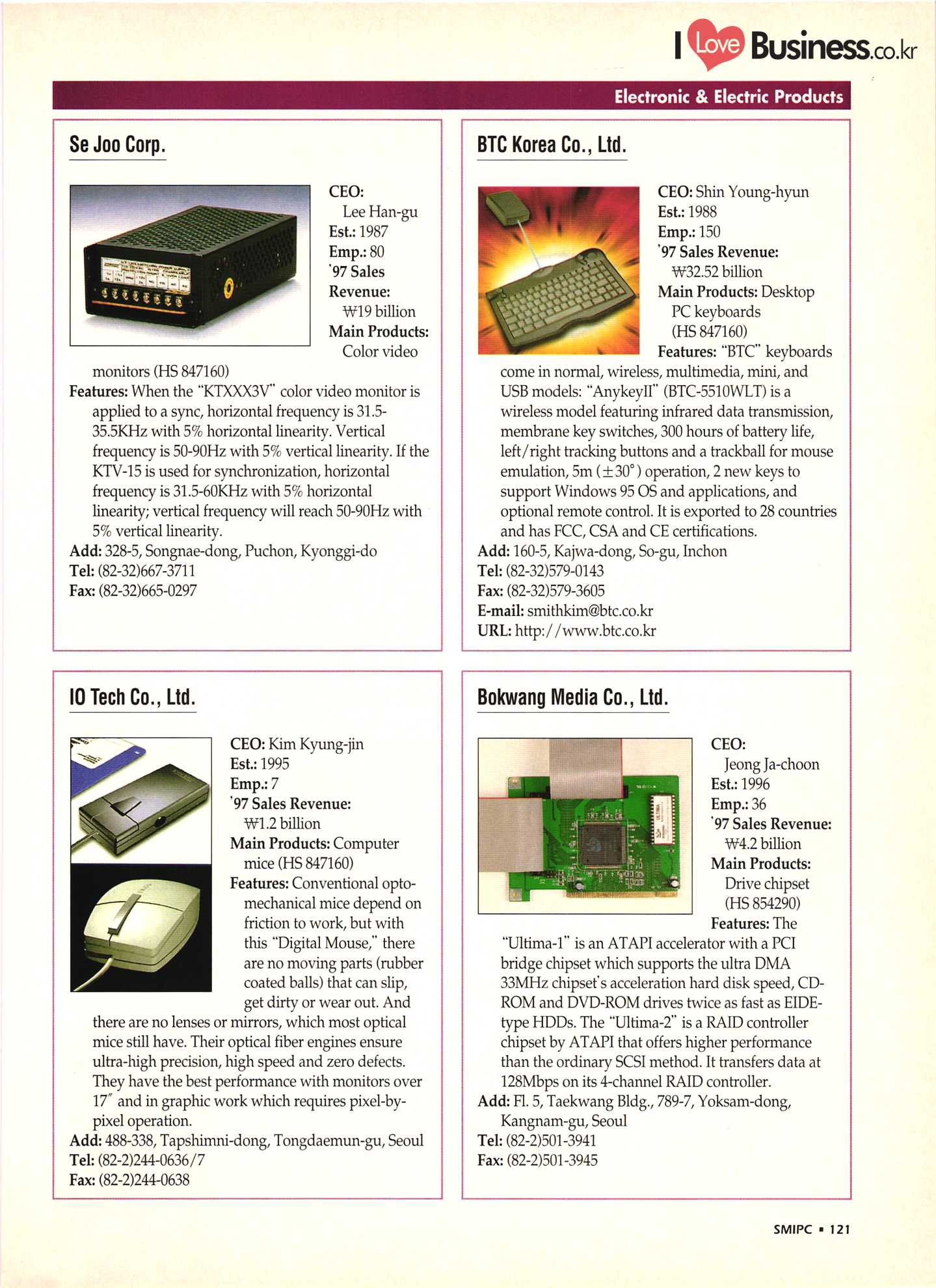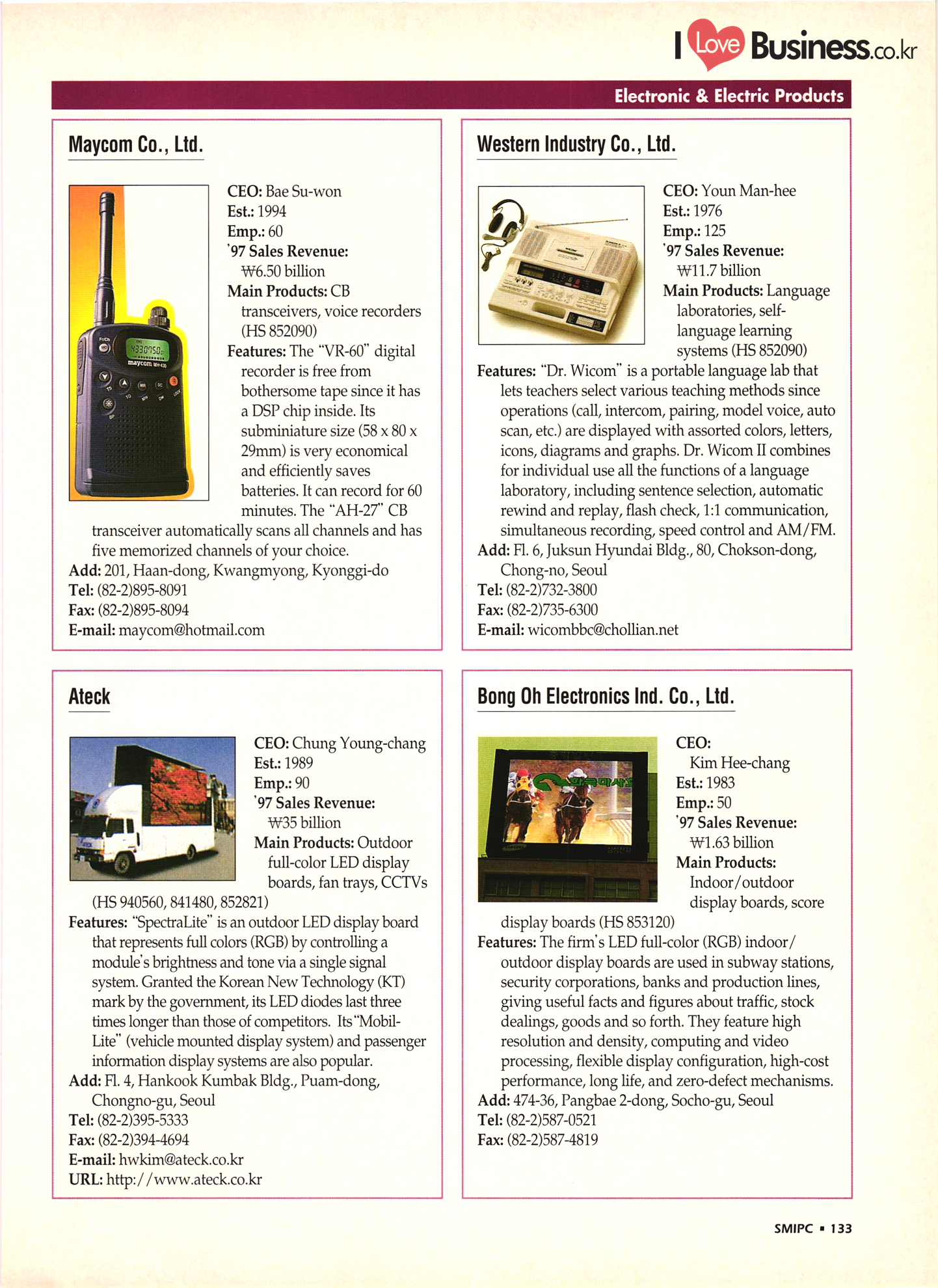 | I Love Business.co.kr small ME www.smallme.co.kr Quality Products from Korea CONTENTS • Metal Products • Machinery ..... Precision Equipment & Instrumentation • Electronic & Electric Products ........ 119 • Automobile Parts & ................... 191 Other Transportation Equipment • Chemical Products • Textile & Leather Products ......... Published on Aug. 5, 1998 by Small & Medium Industry Promotion Corporation (SMIPC) Add: 24-3, Yoido-dong, Yongdungpo-gu, Seoul, Korea Tel: (82-2)769-6841-50 Fax: (82-2)769-6959, 782-9702 E-mail: webmaster@smipc.or.kr URL: http://www.smipc.or.kr http://home.smipc.or.kr • Building Materials · • Household & Misc. Goods ........... Edited by Maekyung Buyers Guide Corp. Add: Trade Center PO Box 8, Seoul, Korea Tel: (82-2)551-2376-90 Fax: (82-2)551-2377, 2383 E-mail: mkbg@buyersguide.co.kr URL: http://www.buyersguide.co.kr Price: W20,000 Love Business Machinery Cutting tools Molds & dies Gears & reducers Material handling equipment Pumps & compressors Valves & fittings Blowers & fans Boilers Heat exchangers Packing M/C Metal working M/C Machine parts Welding M/C Automation equipment Construction equipment Food processing M/C Textile M/C & parts Paper working M/C Printing M/C Plastic processing M/C Semiconductor manufacturing equipment Refrigerators & air handling equipment 'Water treatment equipment Other industrial M/C |