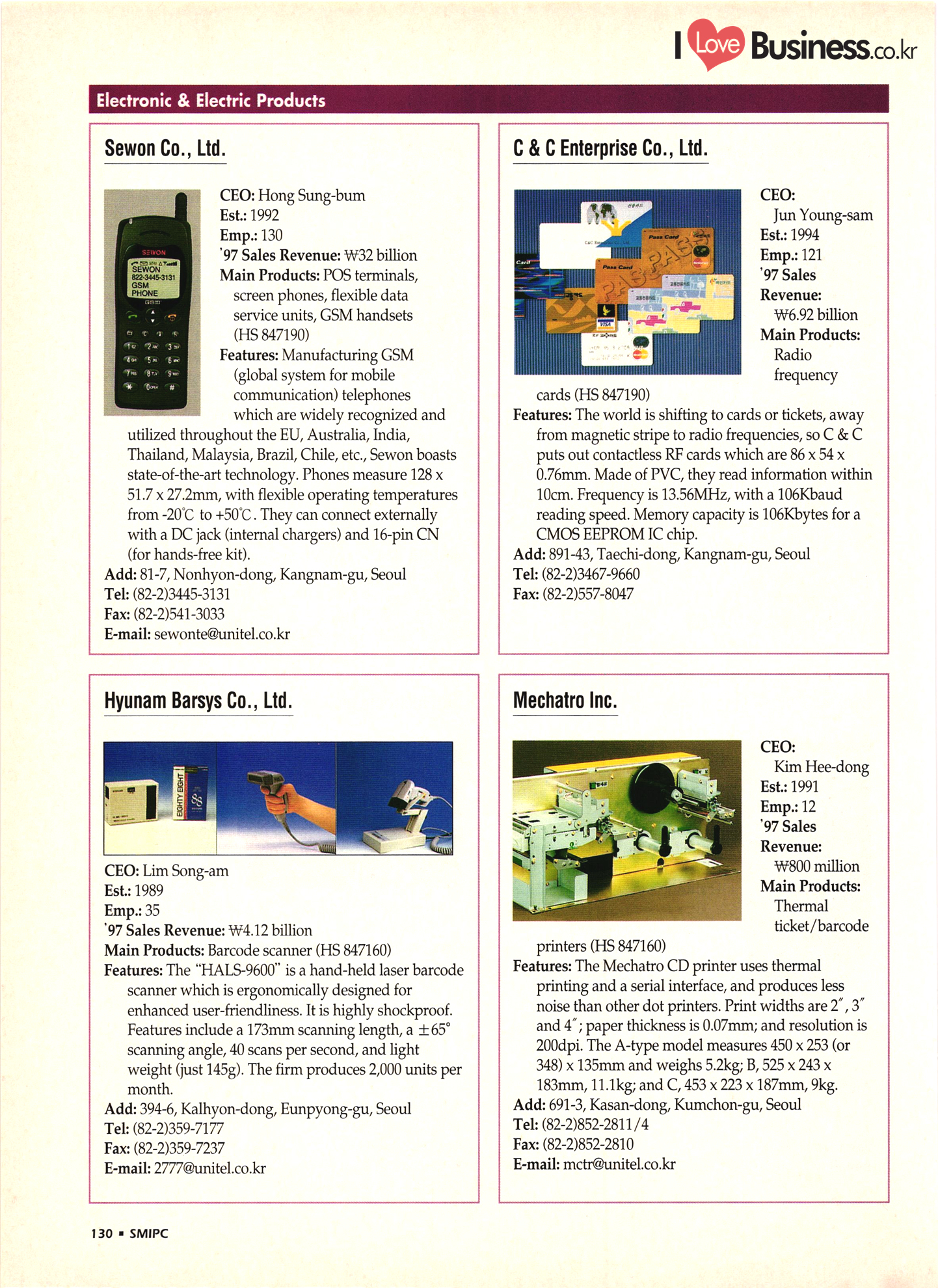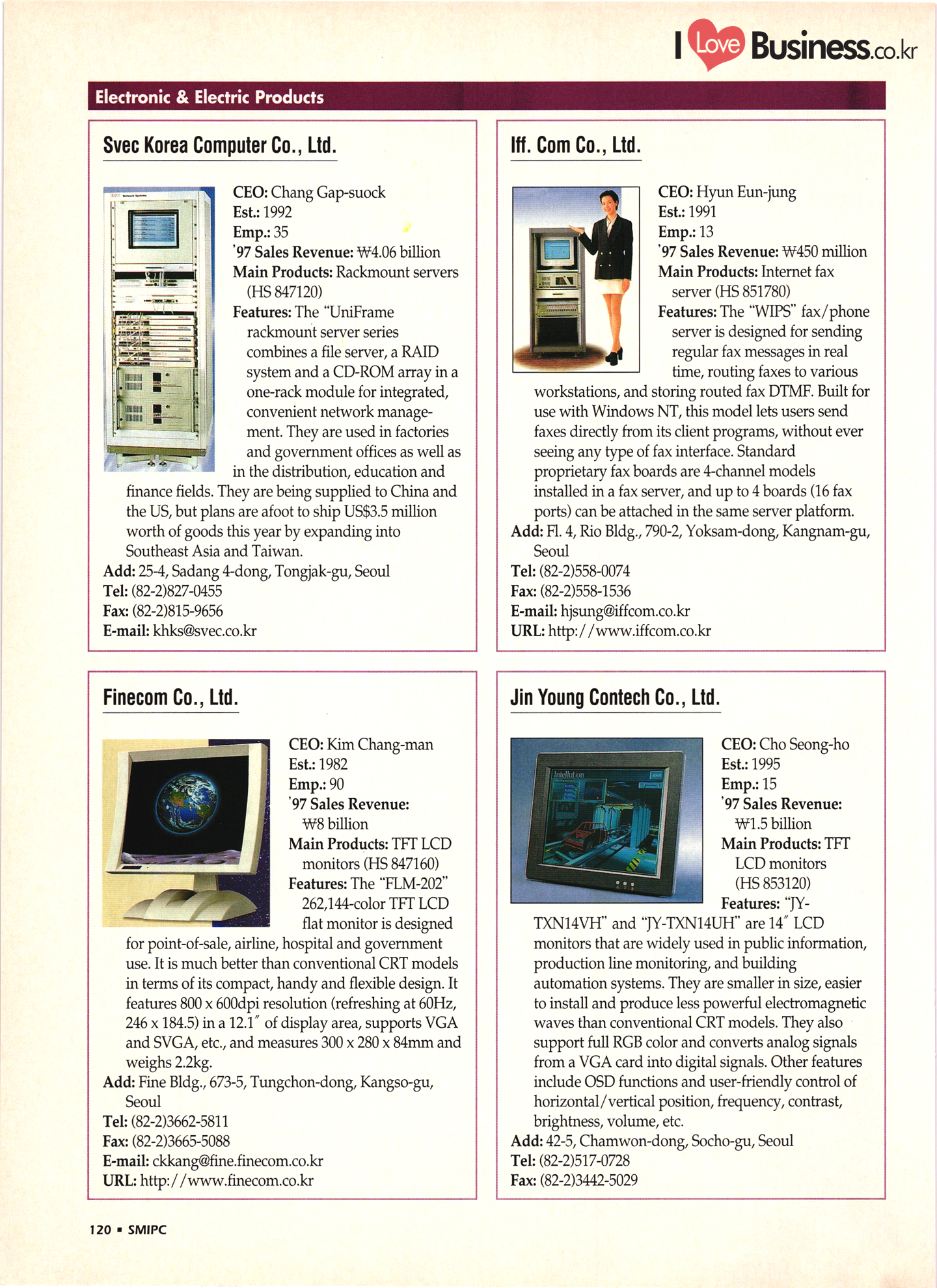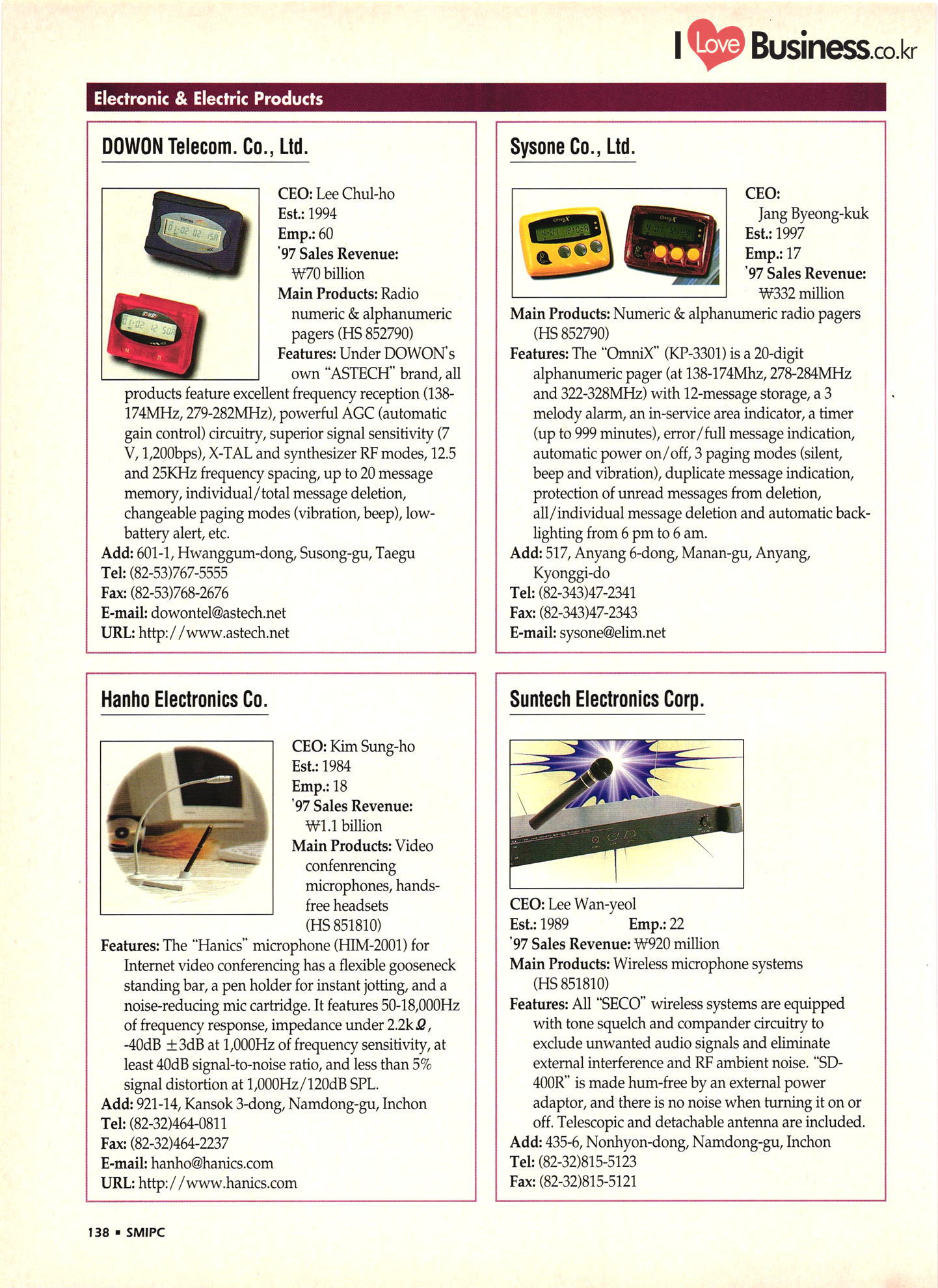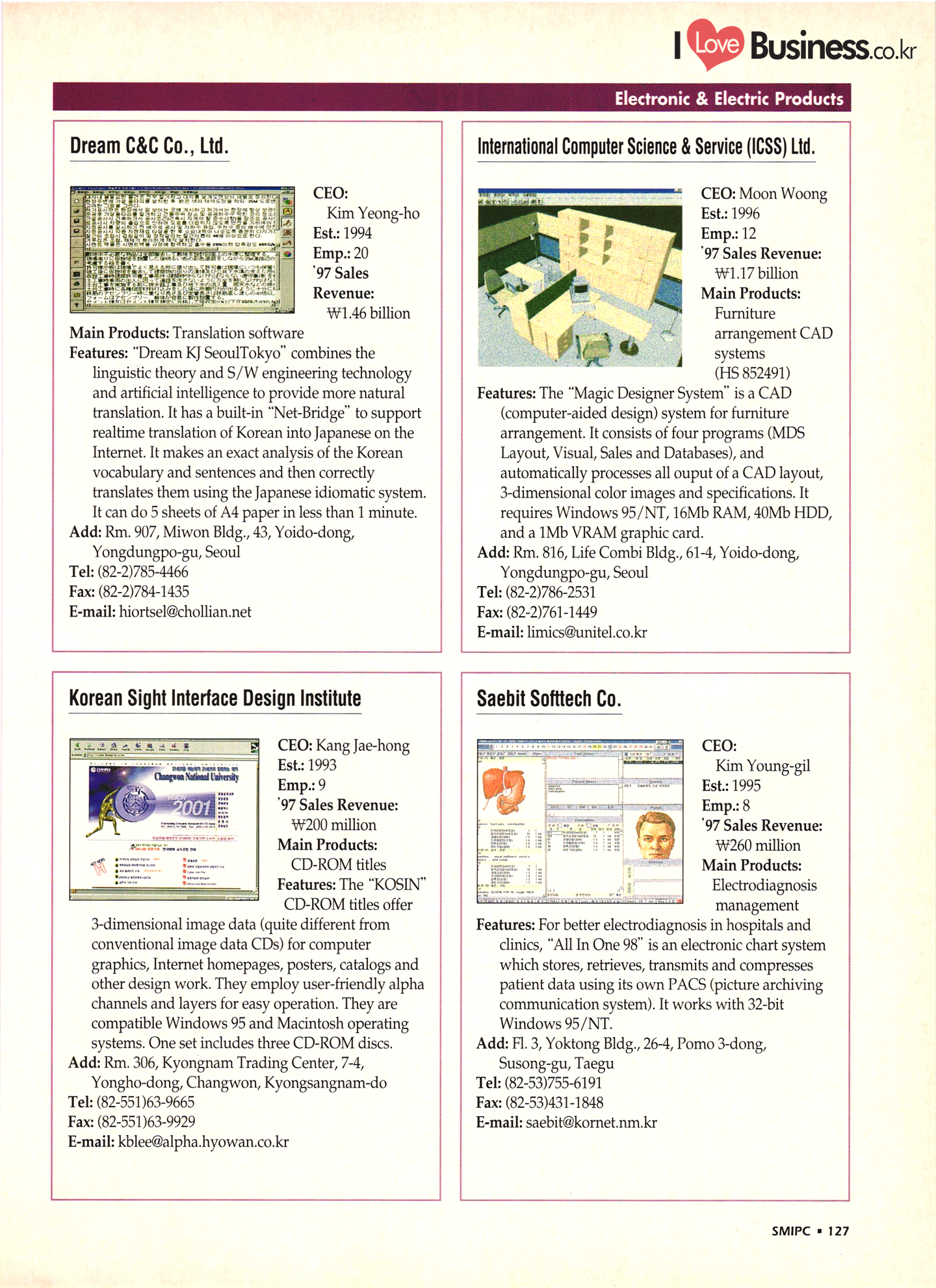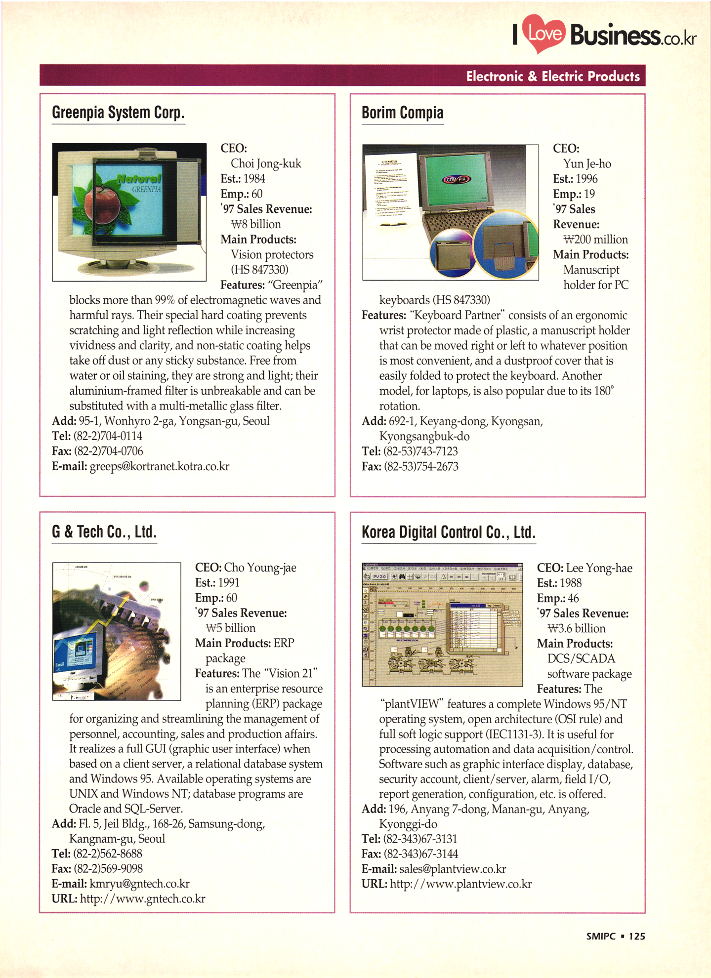 | I Love Business.co.kr small ME www.smallme.co.kr Quality Products from Korea CONTENTS • Metal Products • Machinery ..... Precision Equipment & Instrumentation • Electronic & Electric Products ........ 119 • Automobile Parts & ................... 191 Other Transportation Equipment • Chemical Products • Textile & Leather Products ......... Published on Aug. 5, 1998 by Small & Medium Industry Promotion Corporation (SMIPC) Add: 24-3, Yoido-dong, Yongdungpo-gu, Seoul, Korea Tel: (82-2)769-6841-50 Fax: (82-2)769-6959, 782-9702 E-mail: webmaster@smipc.or.kr URL: http://www.smipc.or.kr http://home.smipc.or.kr • Building Materials · • Household & Misc. Goods ........... Edited by Maekyung Buyers Guide Corp. Add: Trade Center PO Box 8, Seoul, Korea Tel: (82-2)551-2376-90 Fax: (82-2)551-2377, 2383 E-mail: mkbg@buyersguide.co.kr URL: http://www.buyersguide.co.kr Price: W20,000 Love Business Machinery Cutting tools Molds & dies Gears & reducers Material handling equipment Pumps & compressors Valves & fittings Blowers & fans Boilers Heat exchangers Packing M/C Metal working M/C Machine parts Welding M/C Automation equipment Construction equipment Food processing M/C Textile M/C & parts Paper working M/C Printing M/C Plastic processing M/C Semiconductor manufacturing equipment Refrigerators & air handling equipment 'Water treatment equipment Other industrial M/C |