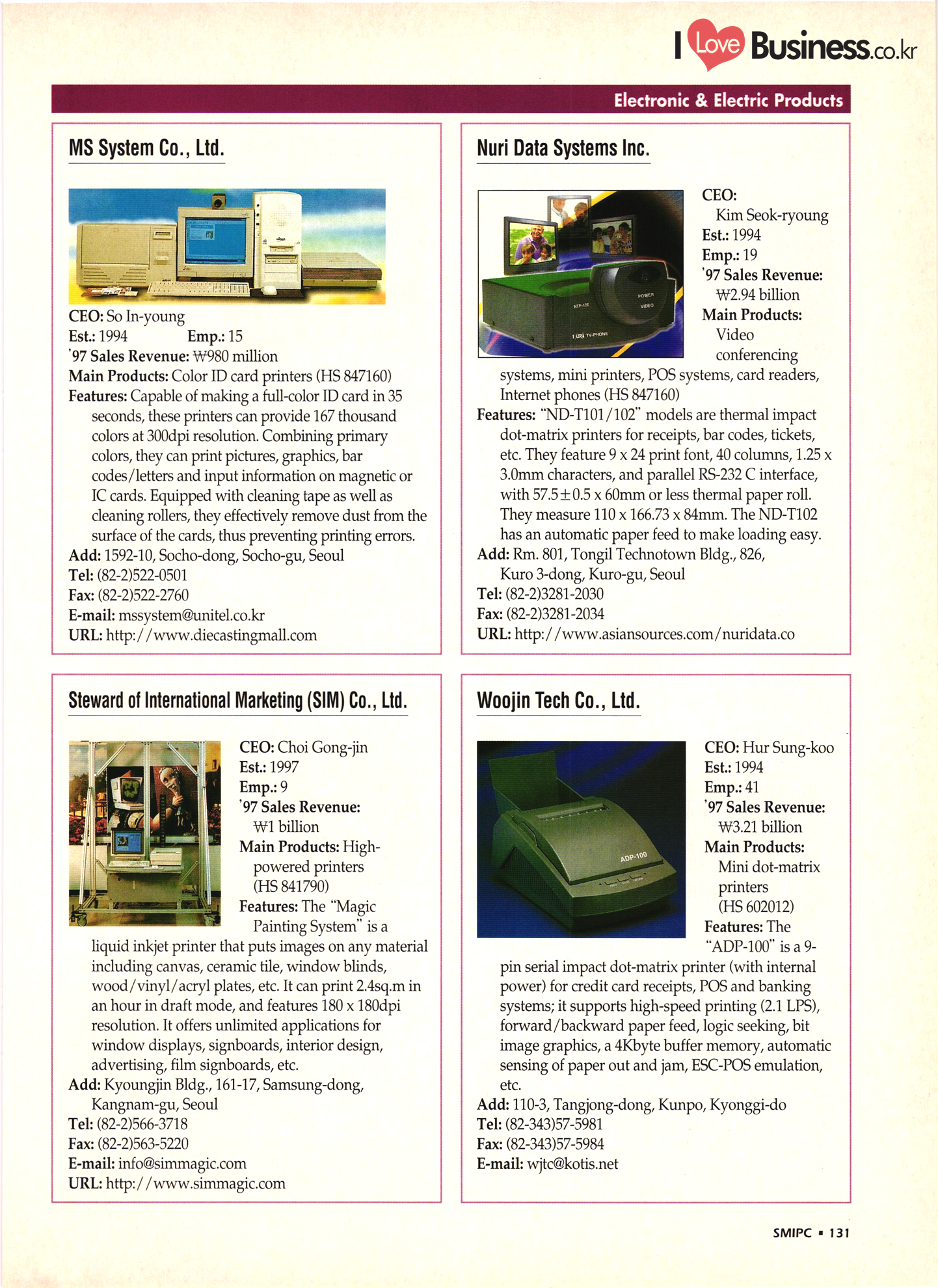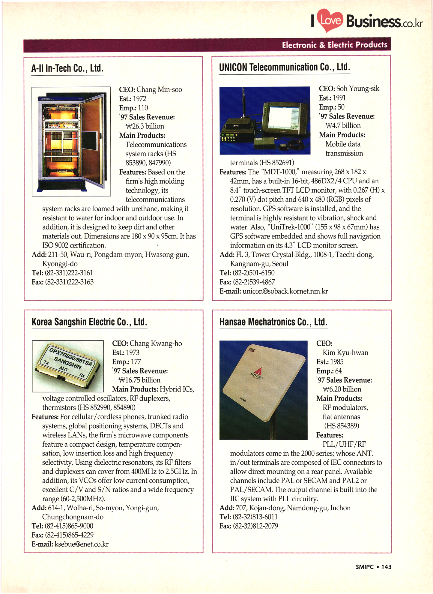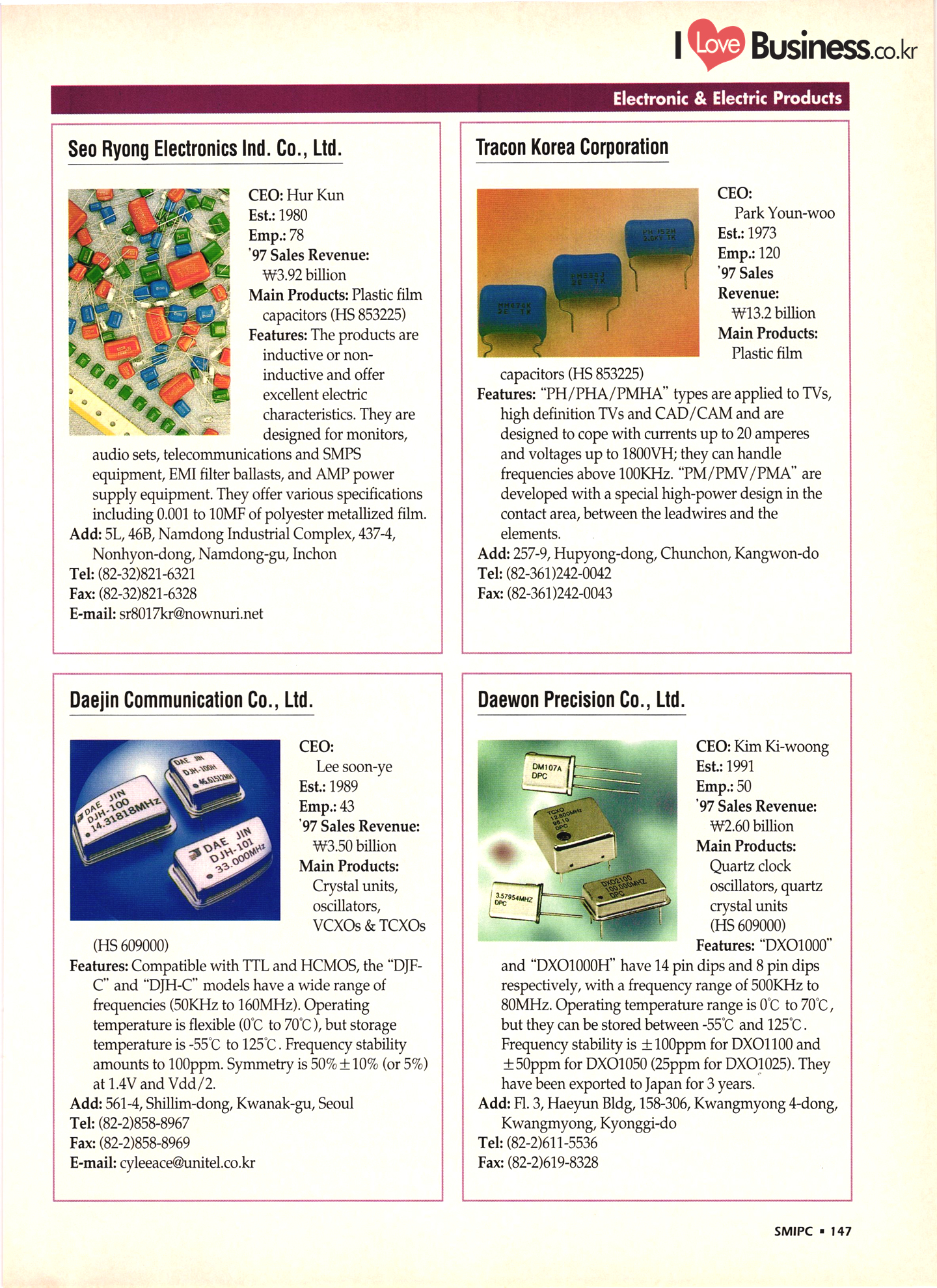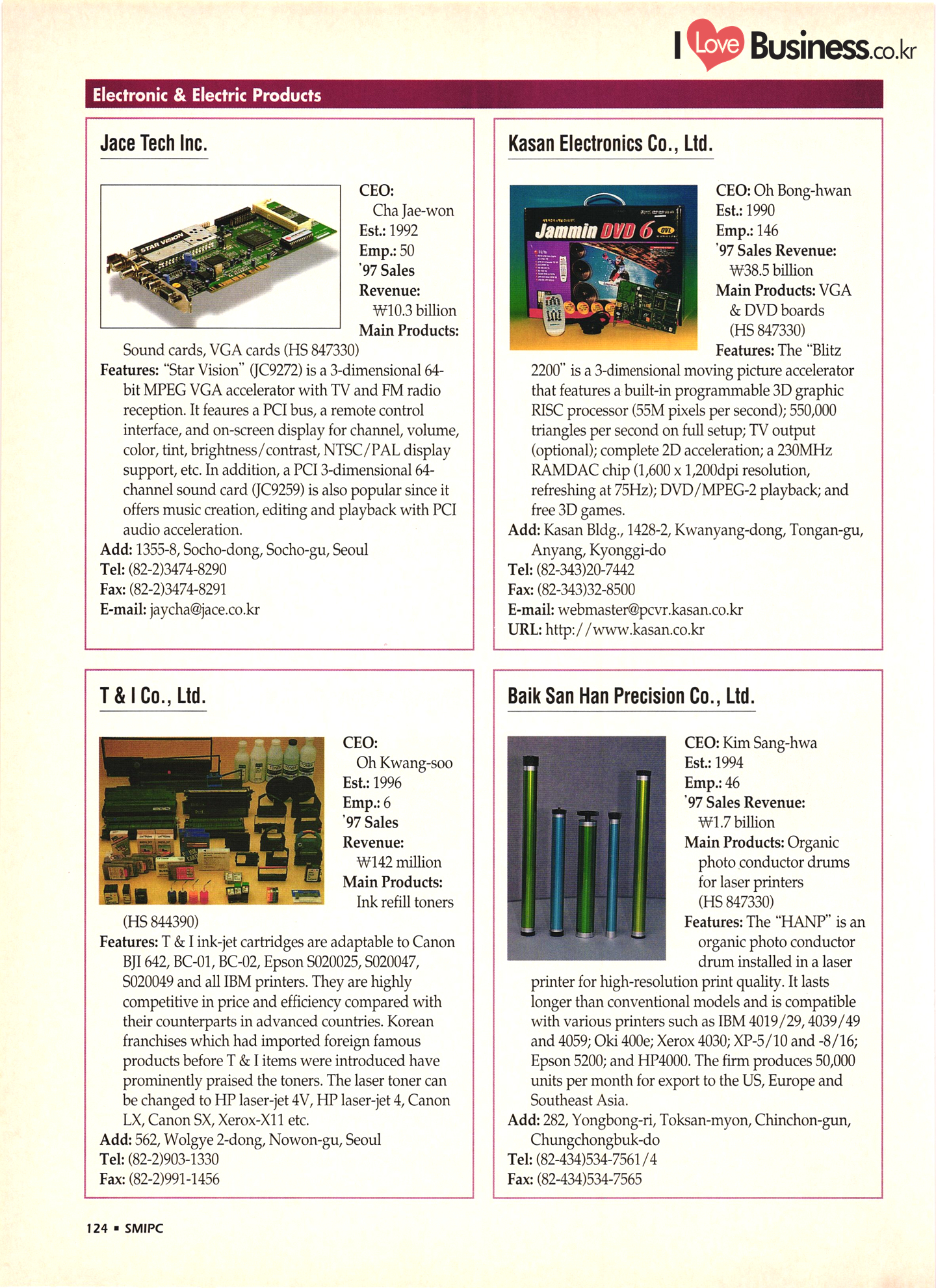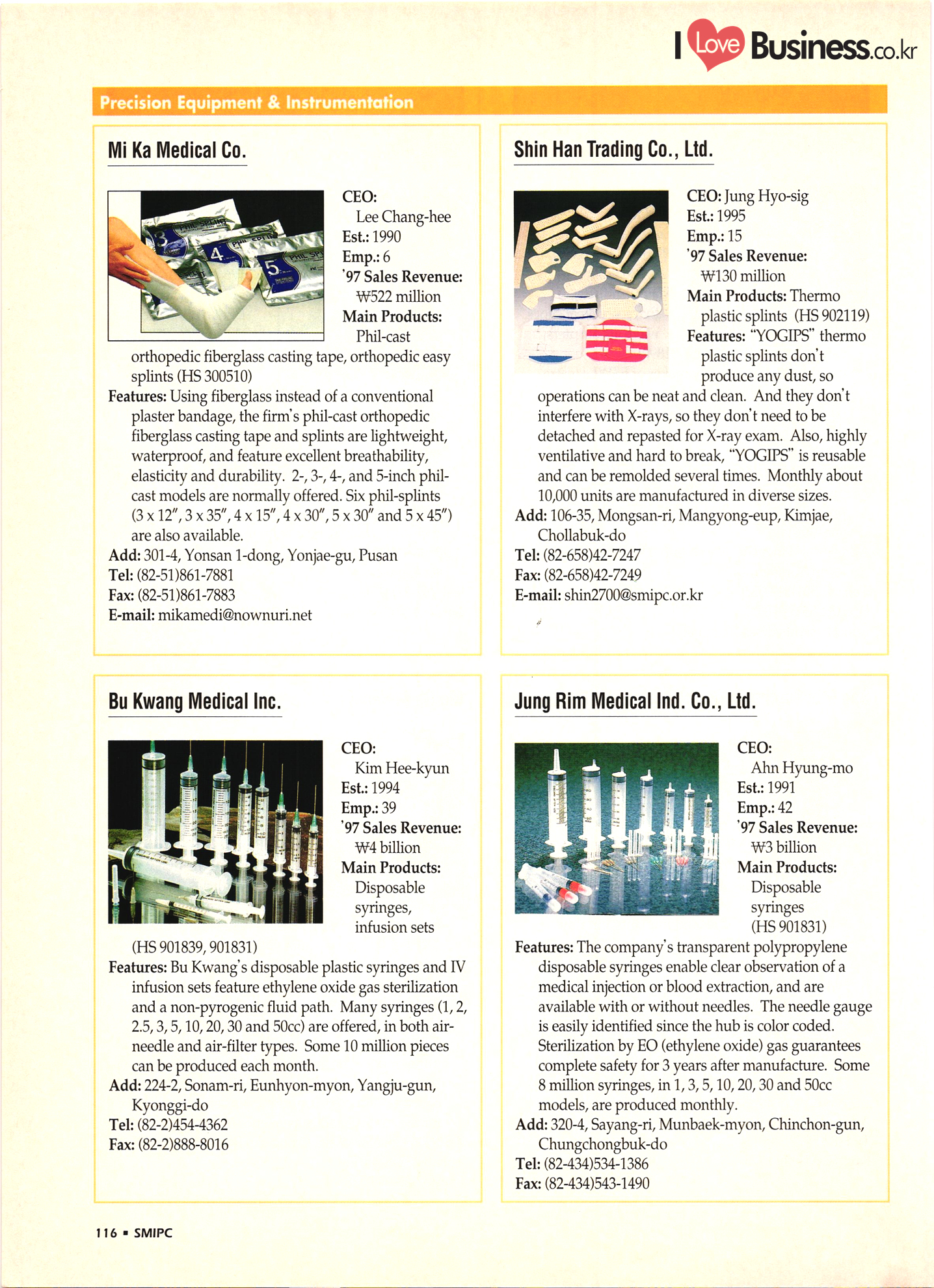 | I Love Business.co.kr small ME www.smallme.co.kr Quality Products from Korea CONTENTS • Metal Products • Machinery ..... Precision Equipment & Instrumentation • Electronic & Electric Products ........ 119 • Automobile Parts & ................... 191 Other Transportation Equipment • Chemical Products • Textile & Leather Products ......... Published on Aug. 5, 1998 by Small & Medium Industry Promotion Corporation (SMIPC) Add: 24-3, Yoido-dong, Yongdungpo-gu, Seoul, Korea Tel: (82-2)769-6841-50 Fax: (82-2)769-6959, 782-9702 E-mail: webmaster@smipc.or.kr URL: http://www.smipc.or.kr http://home.smipc.or.kr • Building Materials · • Household & Misc. Goods ........... Edited by Maekyung Buyers Guide Corp. Add: Trade Center PO Box 8, Seoul, Korea Tel: (82-2)551-2376-90 Fax: (82-2)551-2377, 2383 E-mail: mkbg@buyersguide.co.kr URL: http://www.buyersguide.co.kr Price: W20,000 Love Business Machinery Cutting tools Molds & dies Gears & reducers Material handling equipment Pumps & compressors Valves & fittings Blowers & fans Boilers Heat exchangers Packing M/C Metal working M/C Machine parts Welding M/C Automation equipment Construction equipment Food processing M/C Textile M/C & parts Paper working M/C Printing M/C Plastic processing M/C Semiconductor manufacturing equipment Refrigerators & air handling equipment 'Water treatment equipment Other industrial M/C |