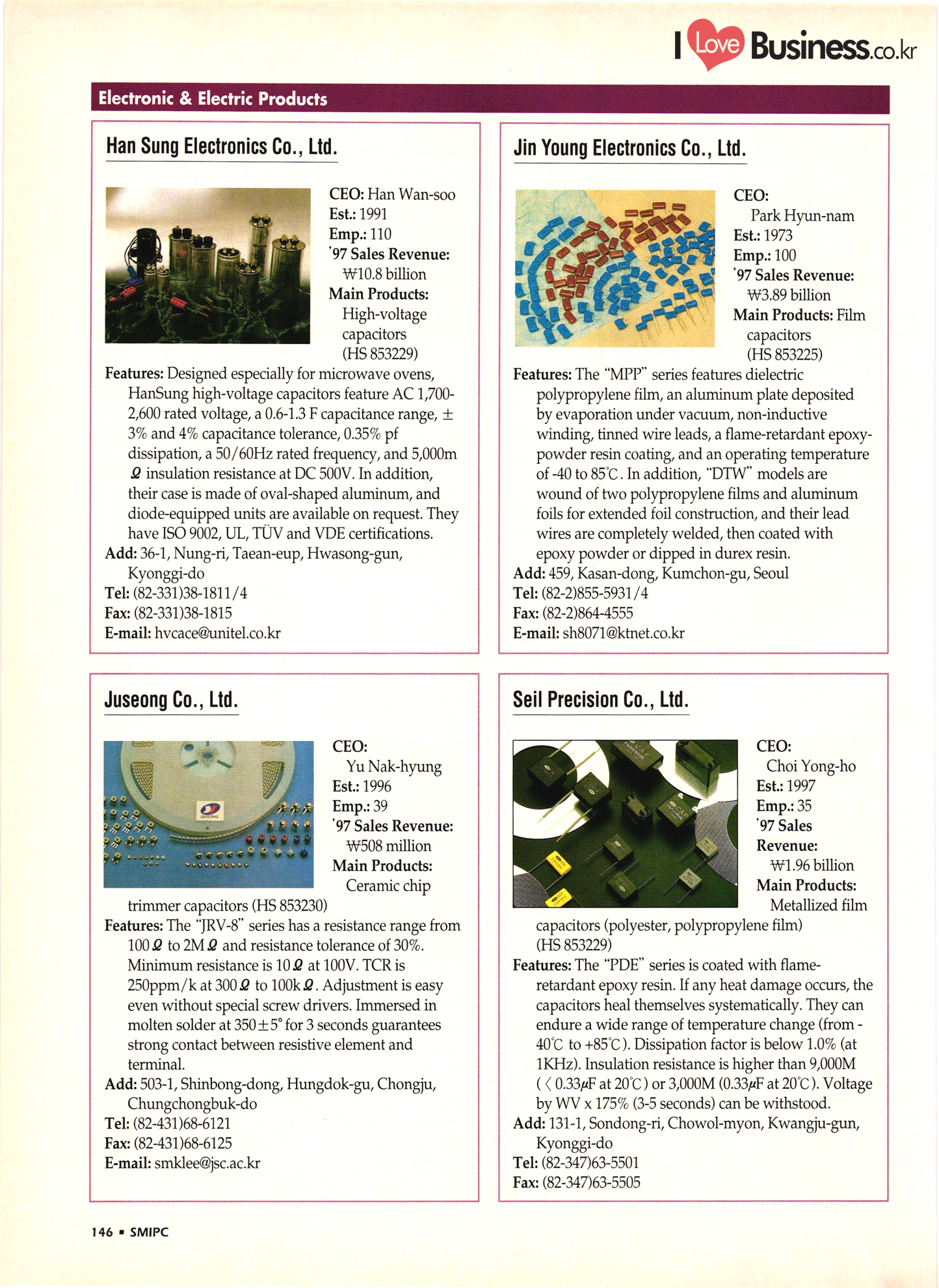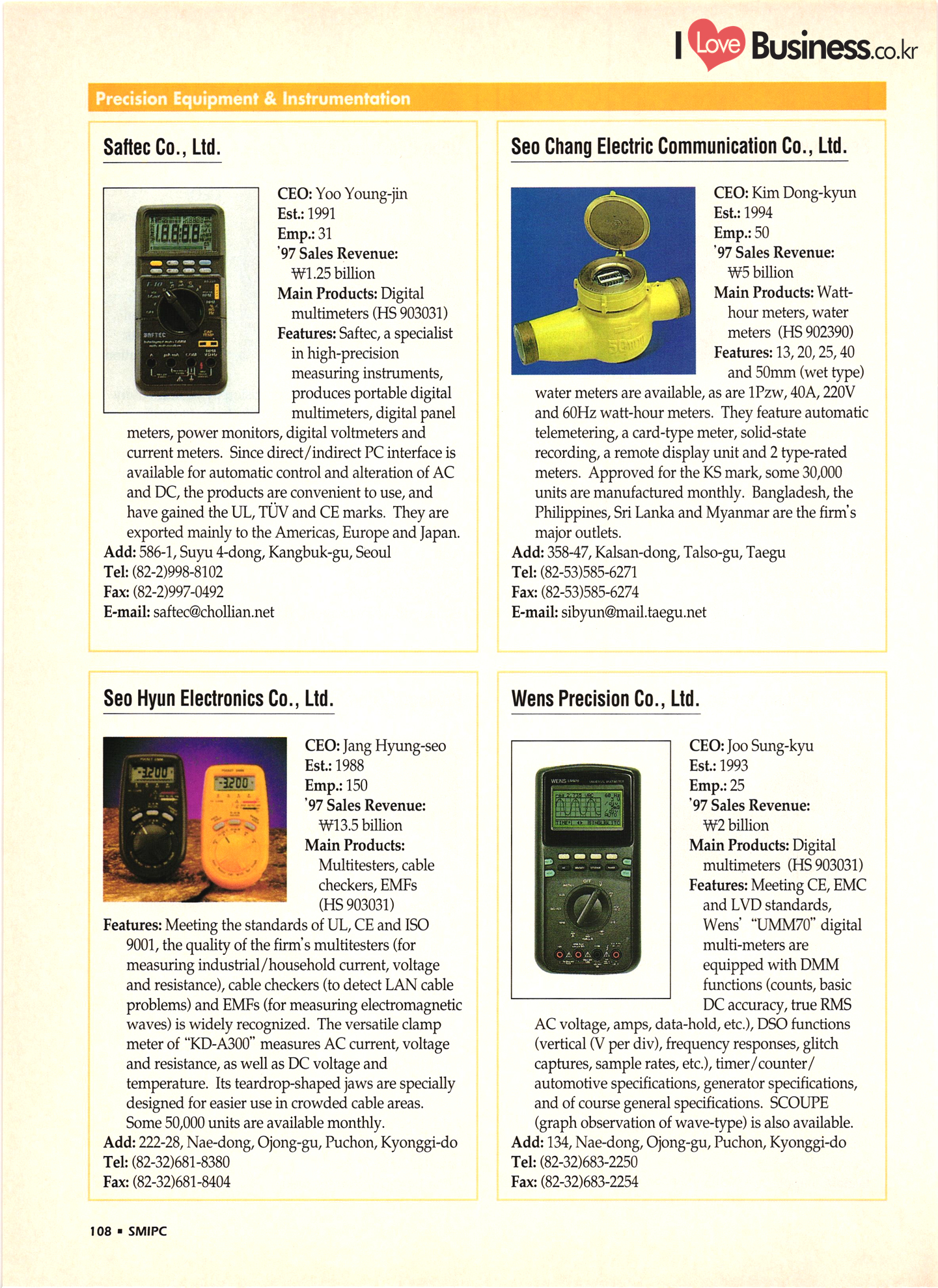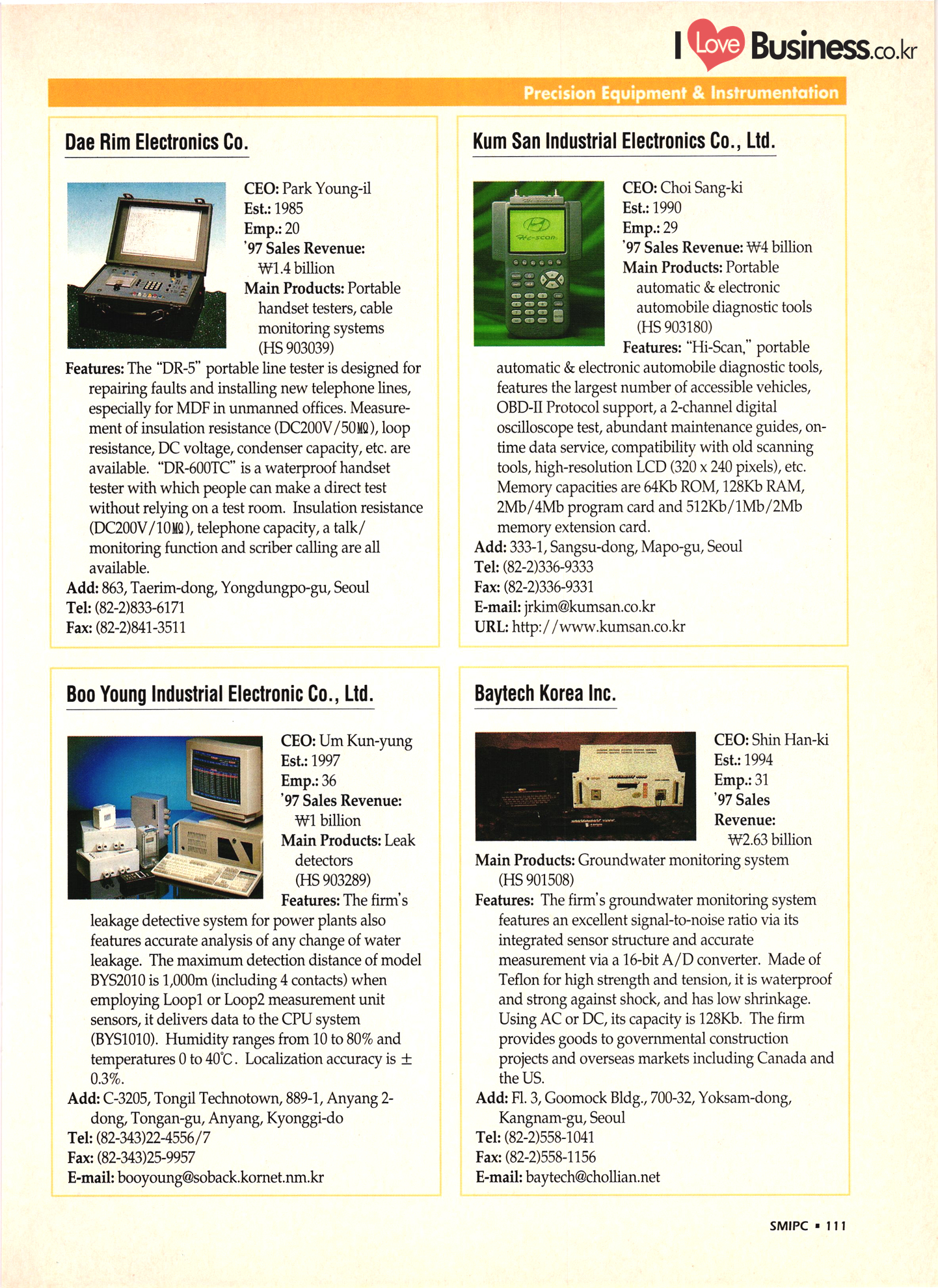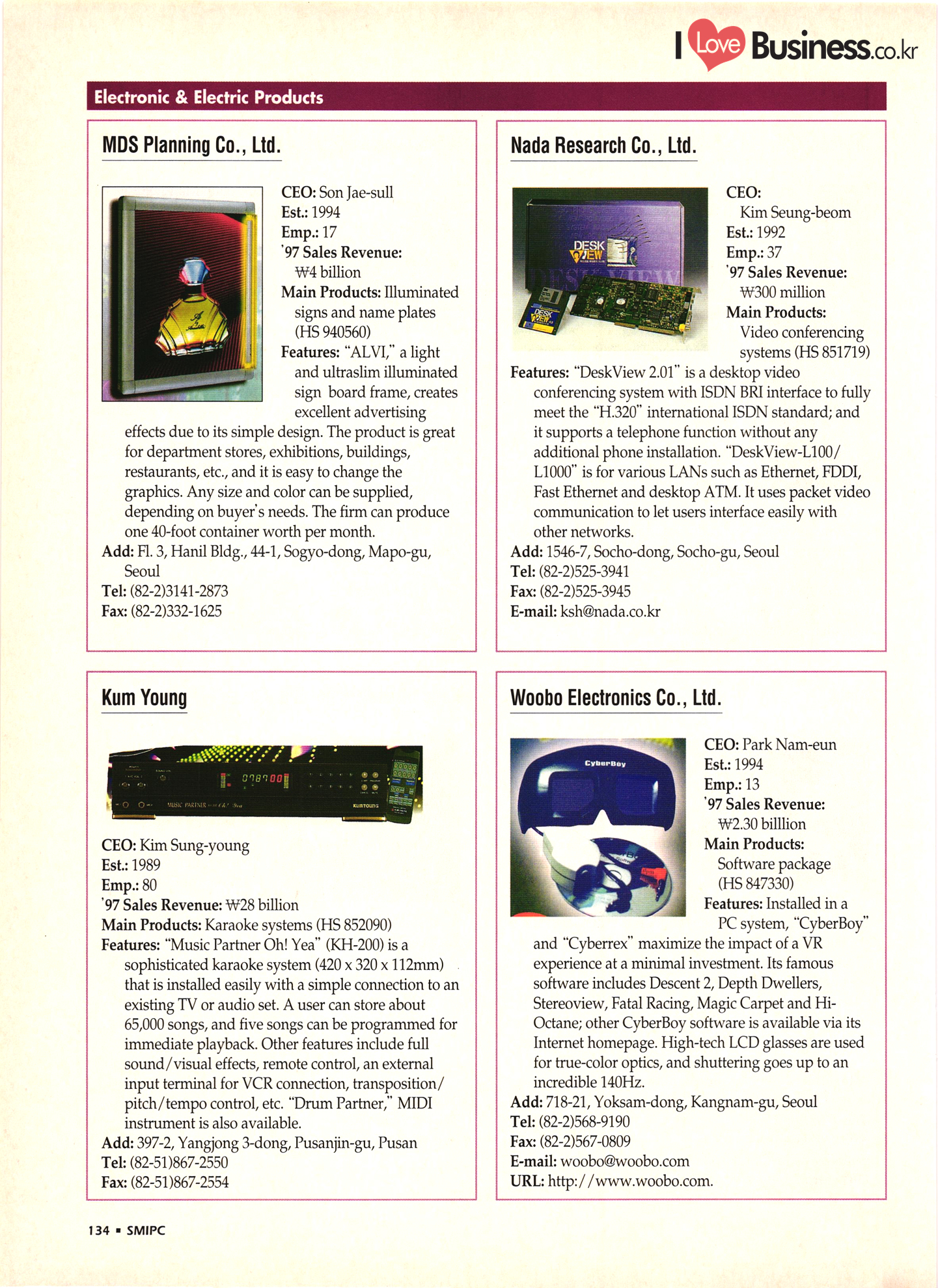 | I Love Business.co.kr small ME www.smallme.co.kr Quality Products from Korea CONTENTS • Metal Products • Machinery ..... Precision Equipment & Instrumentation • Electronic & Electric Products ........ 119 • Automobile Parts & ................... 191 Other Transportation Equipment • Chemical Products • Textile & Leather Products ......... Published on Aug. 5, 1998 by Small & Medium Industry Promotion Corporation (SMIPC) Add: 24-3, Yoido-dong, Yongdungpo-gu, Seoul, Korea Tel: (82-2)769-6841-50 Fax: (82-2)769-6959, 782-9702 E-mail: webmaster@smipc.or.kr URL: http://www.smipc.or.kr http://home.smipc.or.kr • Building Materials · • Household & Misc. Goods ........... Edited by Maekyung Buyers Guide Corp. Add: Trade Center PO Box 8, Seoul, Korea Tel: (82-2)551-2376-90 Fax: (82-2)551-2377, 2383 E-mail: mkbg@buyersguide.co.kr URL: http://www.buyersguide.co.kr Price: W20,000 Love Business Machinery Cutting tools Molds & dies Gears & reducers Material handling equipment Pumps & compressors Valves & fittings Blowers & fans Boilers Heat exchangers Packing M/C Metal working M/C Machine parts Welding M/C Automation equipment Construction equipment Food processing M/C Textile M/C & parts Paper working M/C Printing M/C Plastic processing M/C Semiconductor manufacturing equipment Refrigerators & air handling equipment 'Water treatment equipment Other industrial M/C |