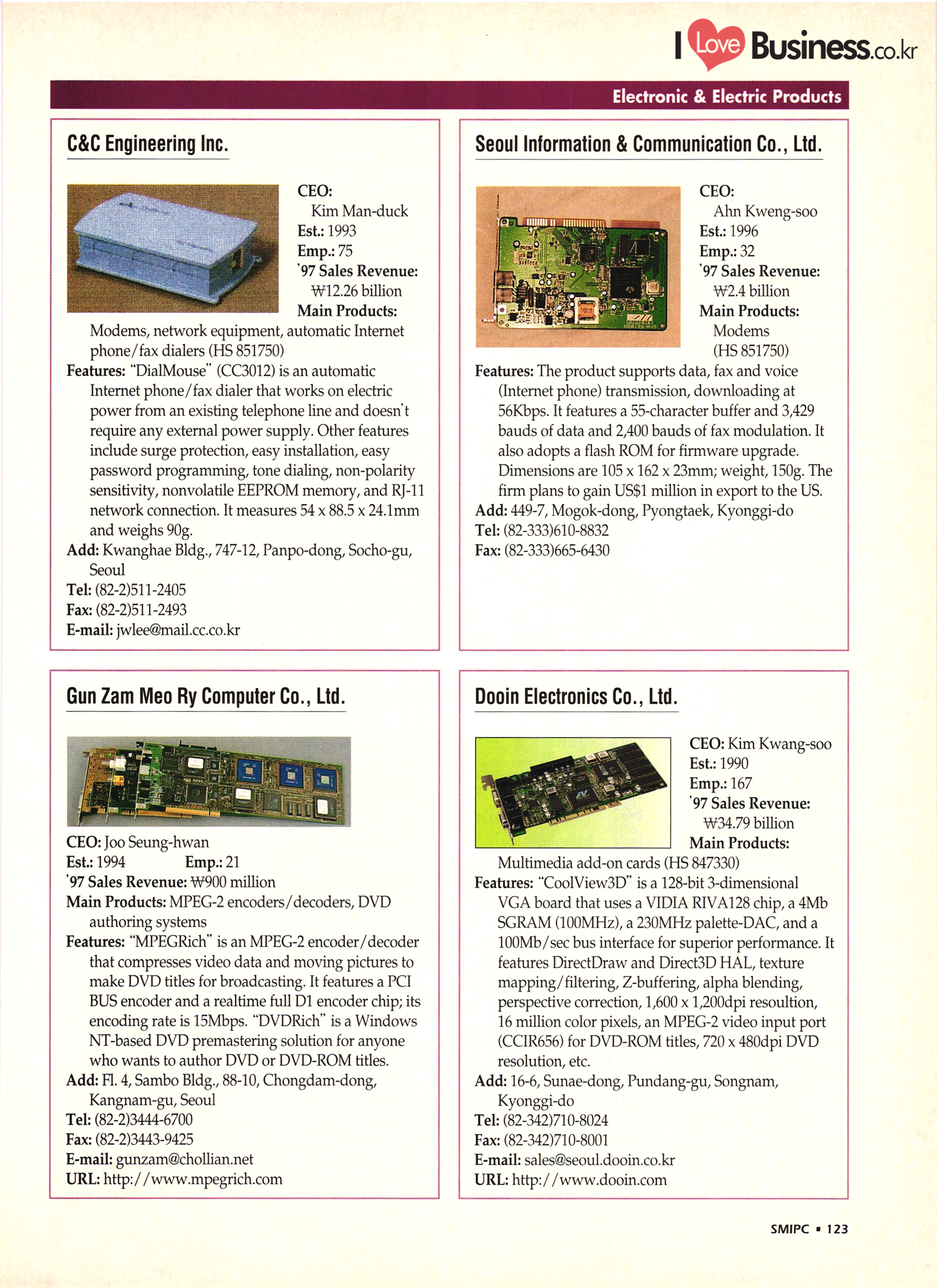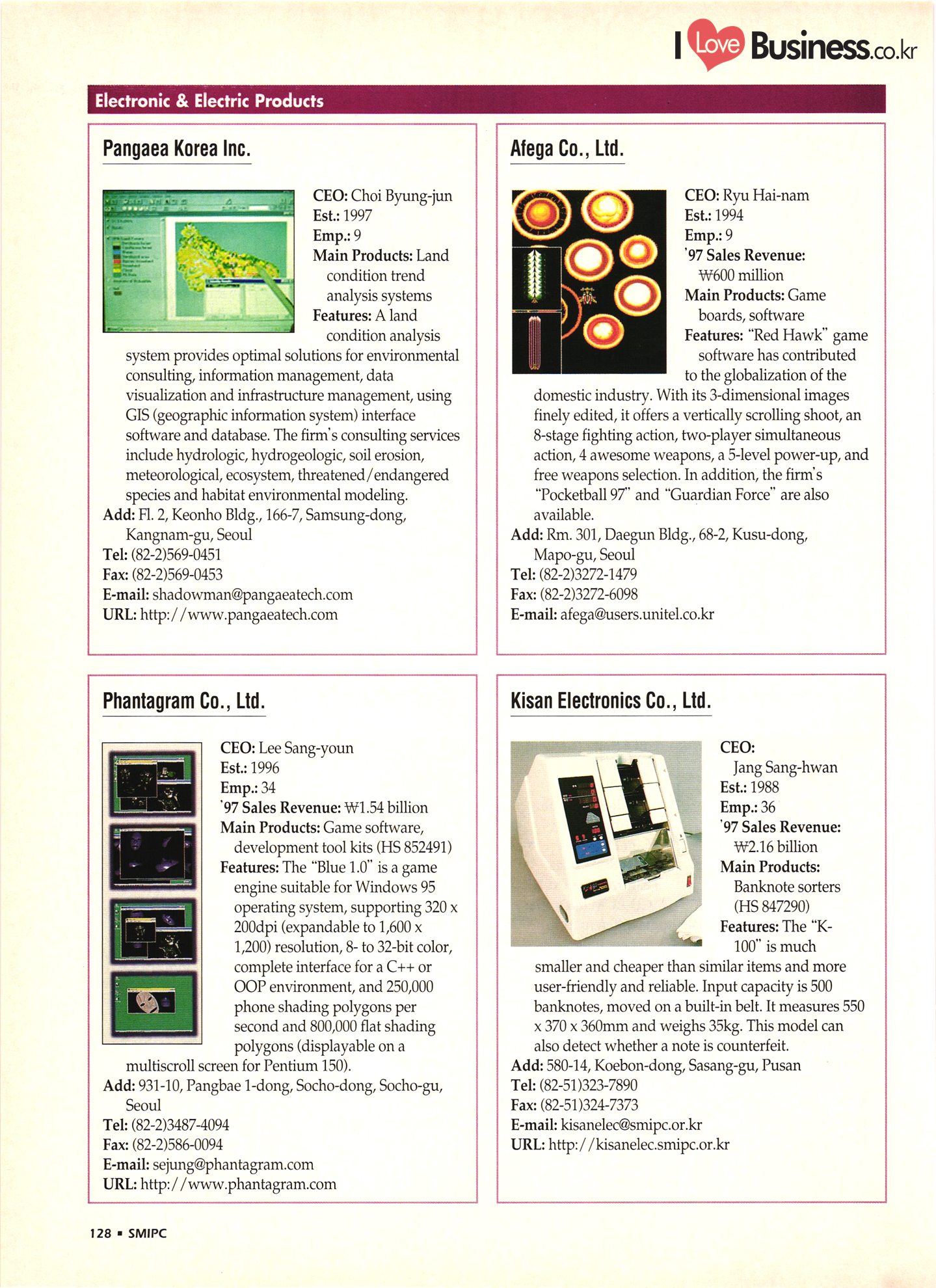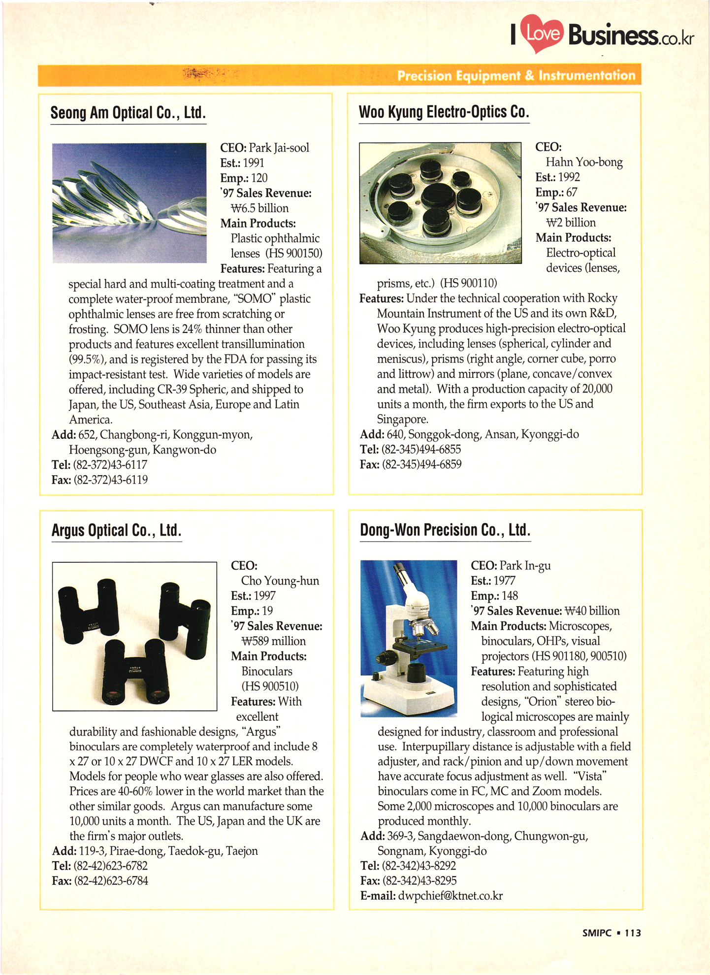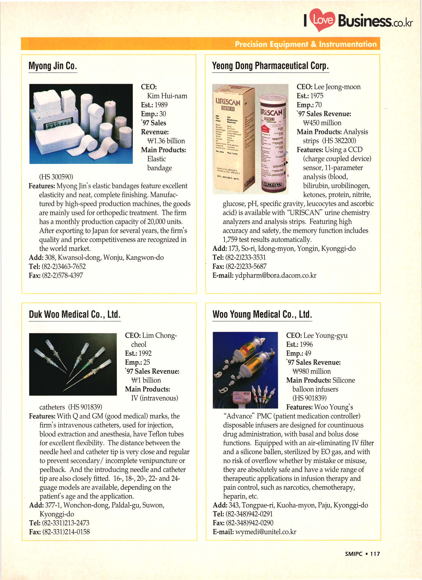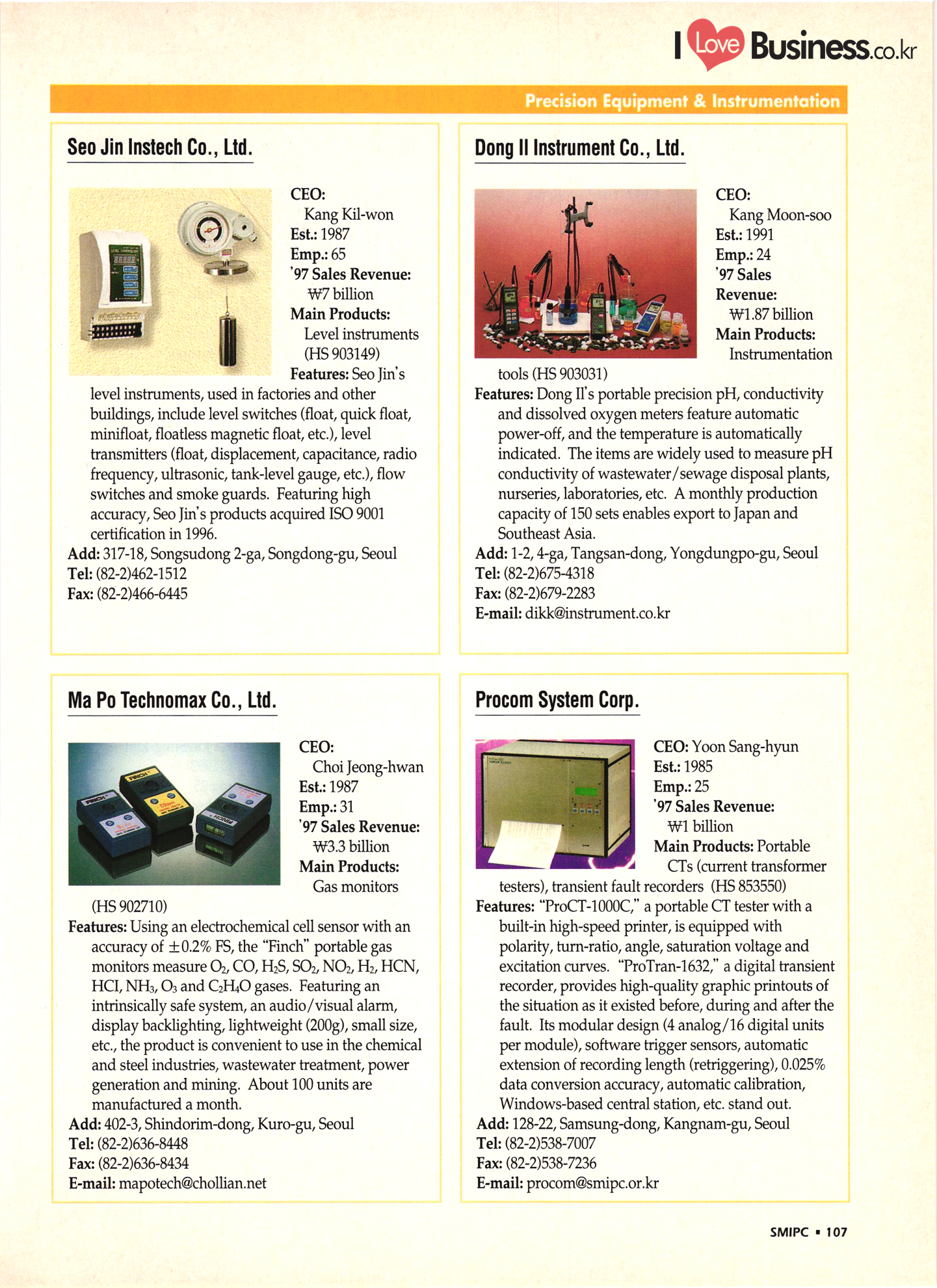 | I Love Business.co.kr small ME www.smallme.co.kr Quality Products from Korea CONTENTS • Metal Products • Machinery ..... Precision Equipment & Instrumentation • Electronic & Electric Products ........ 119 • Automobile Parts & ................... 191 Other Transportation Equipment • Chemical Products • Textile & Leather Products ......... Published on Aug. 5, 1998 by Small & Medium Industry Promotion Corporation (SMIPC) Add: 24-3, Yoido-dong, Yongdungpo-gu, Seoul, Korea Tel: (82-2)769-6841-50 Fax: (82-2)769-6959, 782-9702 E-mail: webmaster@smipc.or.kr URL: http://www.smipc.or.kr http://home.smipc.or.kr • Building Materials · • Household & Misc. Goods ........... Edited by Maekyung Buyers Guide Corp. Add: Trade Center PO Box 8, Seoul, Korea Tel: (82-2)551-2376-90 Fax: (82-2)551-2377, 2383 E-mail: mkbg@buyersguide.co.kr URL: http://www.buyersguide.co.kr Price: W20,000 Love Business Machinery Cutting tools Molds & dies Gears & reducers Material handling equipment Pumps & compressors Valves & fittings Blowers & fans Boilers Heat exchangers Packing M/C Metal working M/C Machine parts Welding M/C Automation equipment Construction equipment Food processing M/C Textile M/C & parts Paper working M/C Printing M/C Plastic processing M/C Semiconductor manufacturing equipment Refrigerators & air handling equipment 'Water treatment equipment Other industrial M/C |