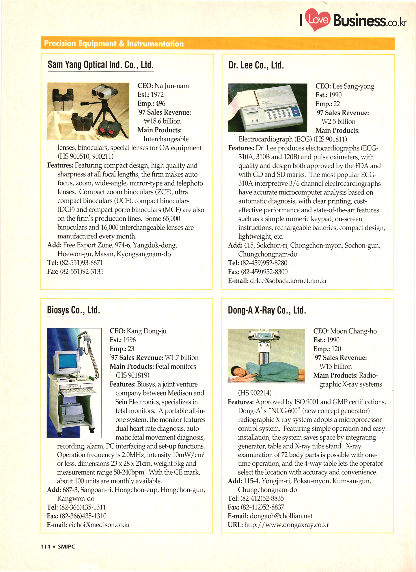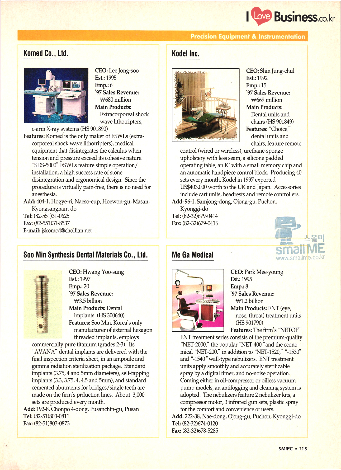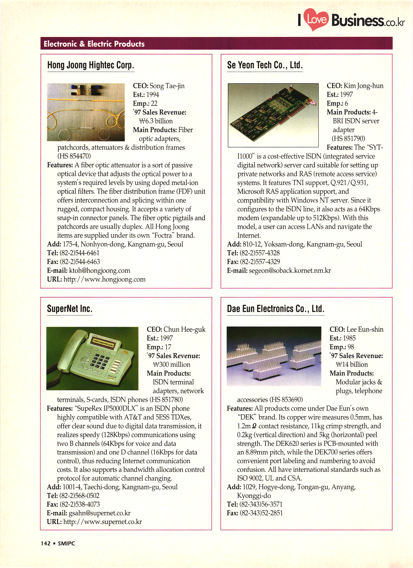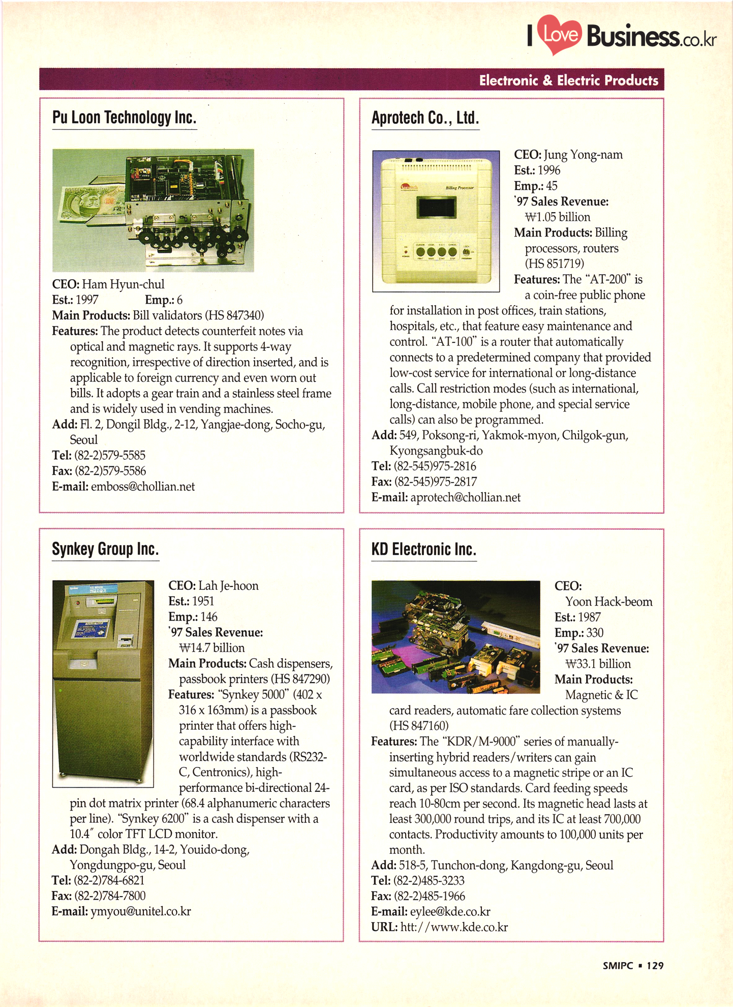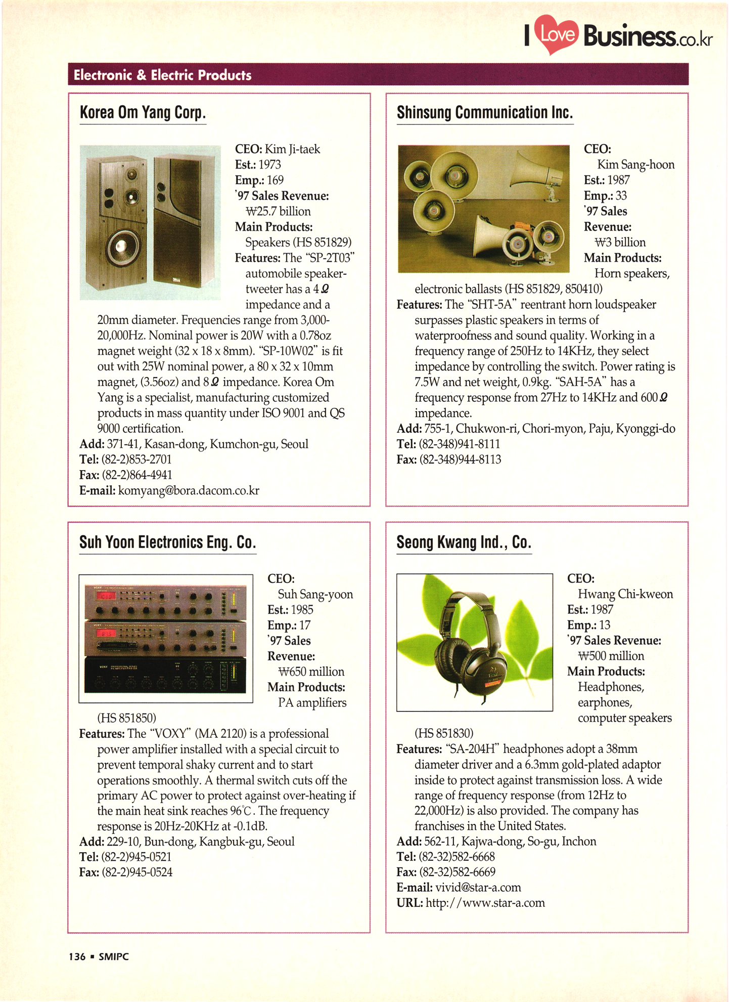 | I Love Business.co.kr small ME www.smallme.co.kr Quality Products from Korea CONTENTS • Metal Products • Machinery ..... Precision Equipment & Instrumentation • Electronic & Electric Products ........ 119 • Automobile Parts & ................... 191 Other Transportation Equipment • Chemical Products • Textile & Leather Products ......... Published on Aug. 5, 1998 by Small & Medium Industry Promotion Corporation (SMIPC) Add: 24-3, Yoido-dong, Yongdungpo-gu, Seoul, Korea Tel: (82-2)769-6841-50 Fax: (82-2)769-6959, 782-9702 E-mail: webmaster@smipc.or.kr URL: http://www.smipc.or.kr http://home.smipc.or.kr • Building Materials · • Household & Misc. Goods ........... Edited by Maekyung Buyers Guide Corp. Add: Trade Center PO Box 8, Seoul, Korea Tel: (82-2)551-2376-90 Fax: (82-2)551-2377, 2383 E-mail: mkbg@buyersguide.co.kr URL: http://www.buyersguide.co.kr Price: W20,000 Love Business Machinery Cutting tools Molds & dies Gears & reducers Material handling equipment Pumps & compressors Valves & fittings Blowers & fans Boilers Heat exchangers Packing M/C Metal working M/C Machine parts Welding M/C Automation equipment Construction equipment Food processing M/C Textile M/C & parts Paper working M/C Printing M/C Plastic processing M/C Semiconductor manufacturing equipment Refrigerators & air handling equipment 'Water treatment equipment Other industrial M/C |