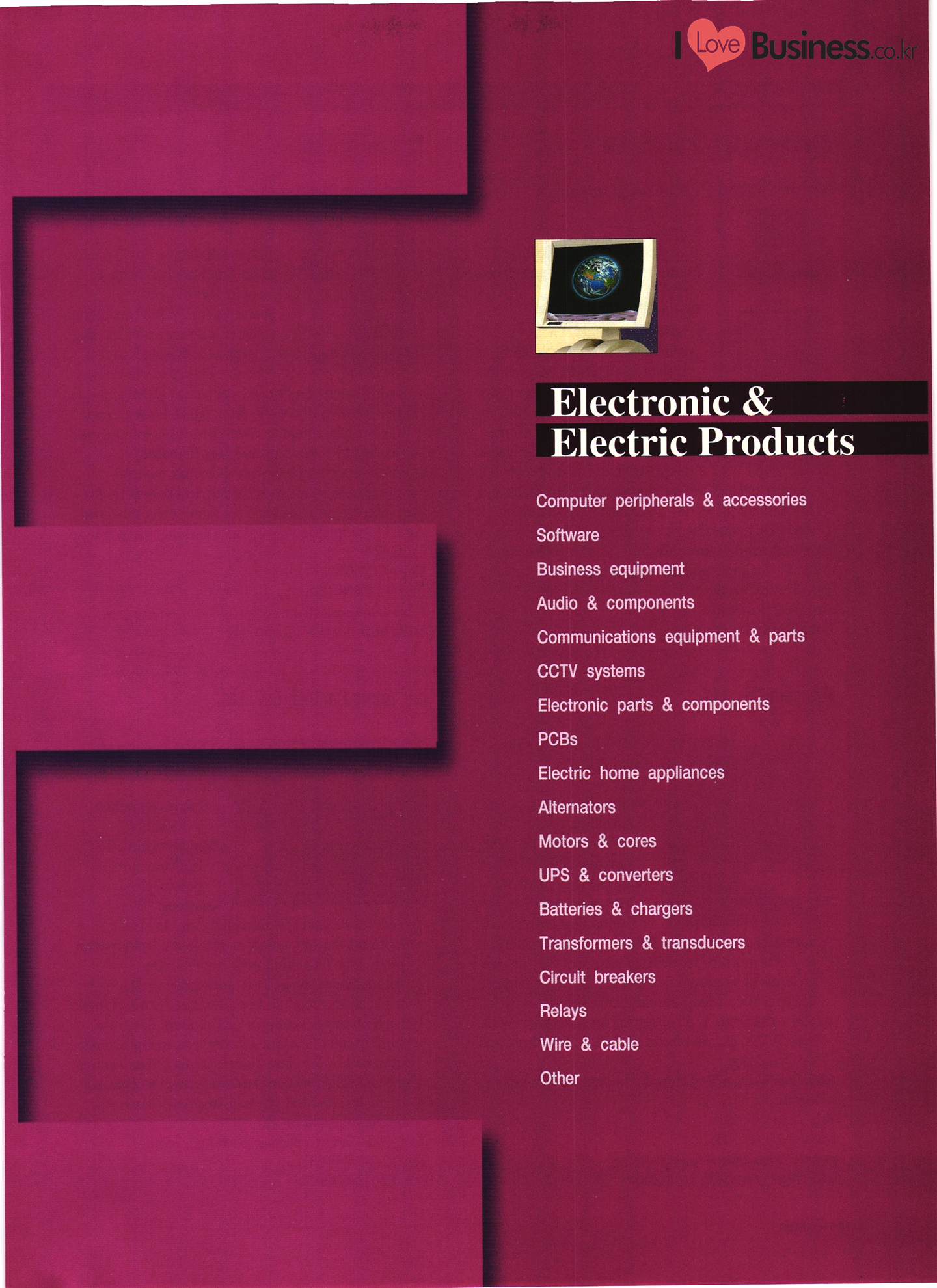 Precision Equipment & Instrumentation Measuring & testing equipment Optical equipment Medical equipment I Love Business.cok Electronic & Electric Products Computer peripherals & accessories Software Business equipment Audio & components Communications equipment & parts CCTV systems Electronic parts & components PCBs Electric home appliances Alternators Motors & cores UPS & converters Batteries & chargers Transformers & transducers Circuit breakers Relays Wire & cable Other I Love Business.co.kr | Automobile Parts & Other Transportation Equipment Engine parts Brakes Gears & transmissions Electric & electronic parts Coolers & heaters Control cable Castings Metal parts Al wheels Rubber parts Filters Car security alarms Other auto parts & accessories Ship machinery & outfitting Lift trucks Heavy equipment parts Bicycle frames |