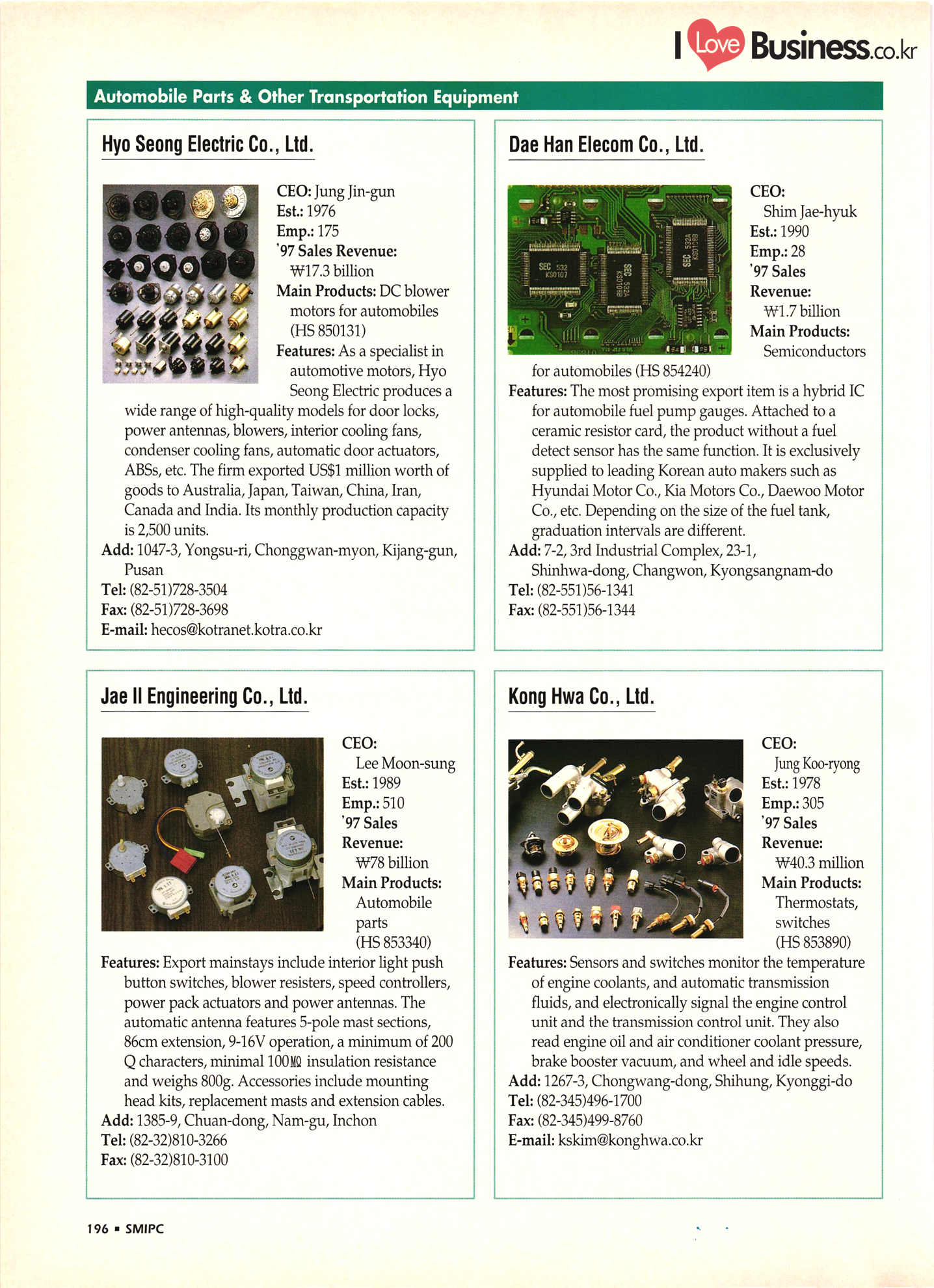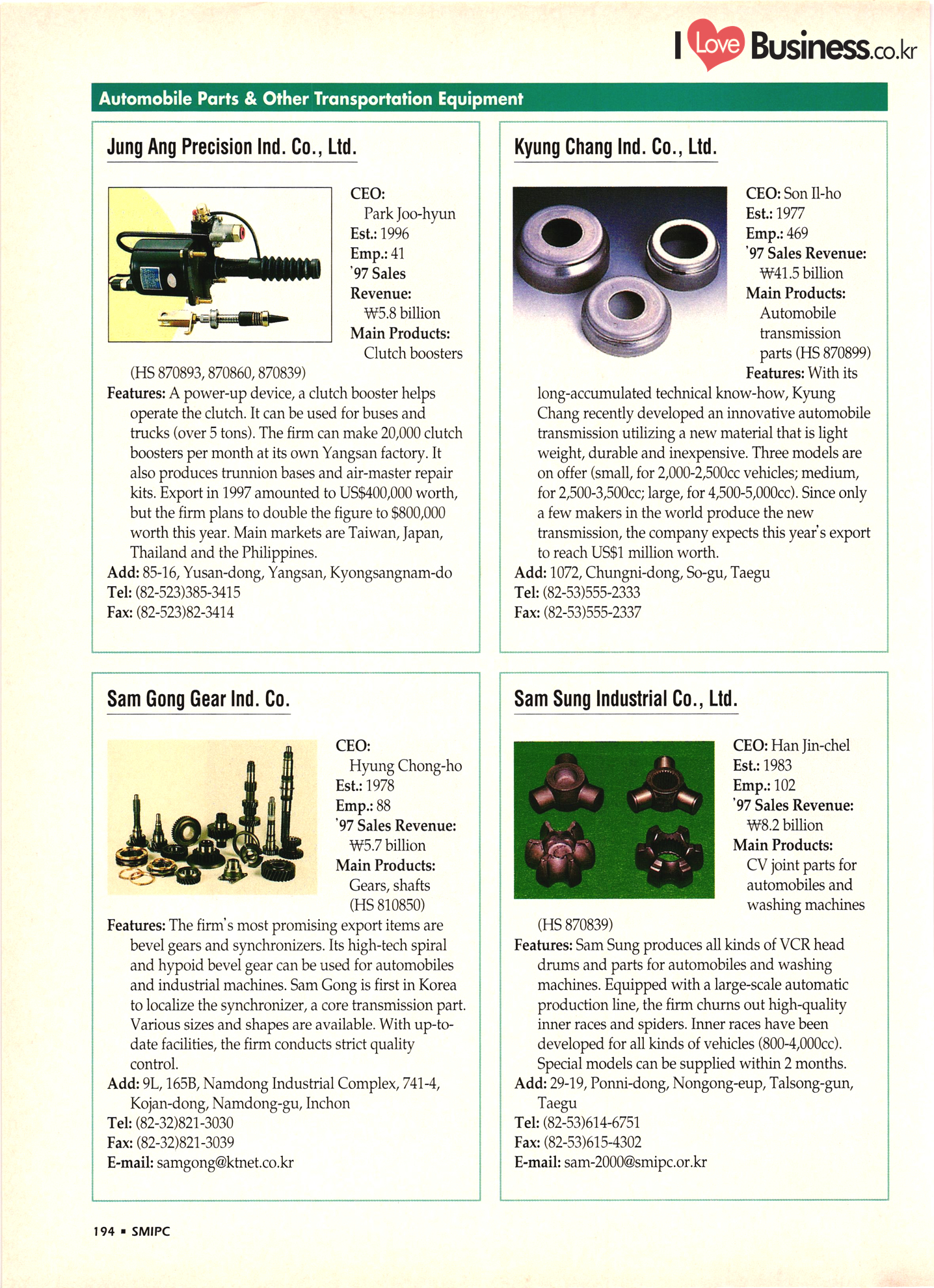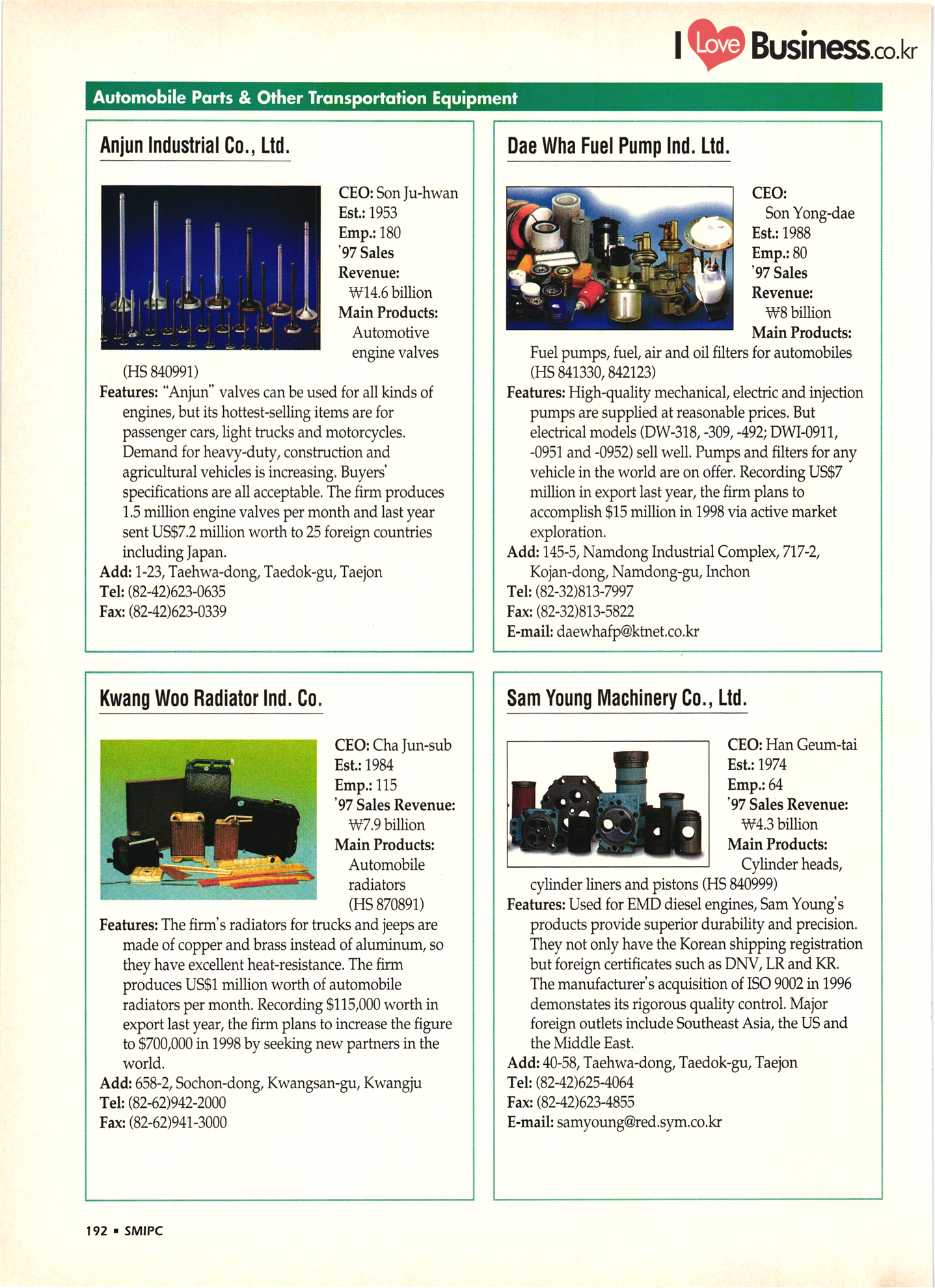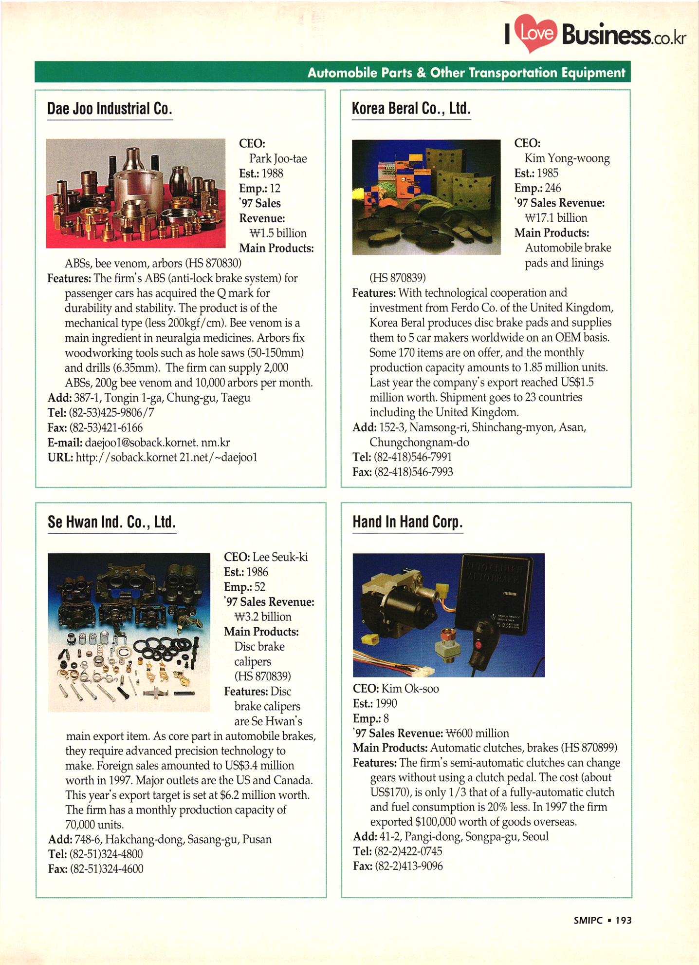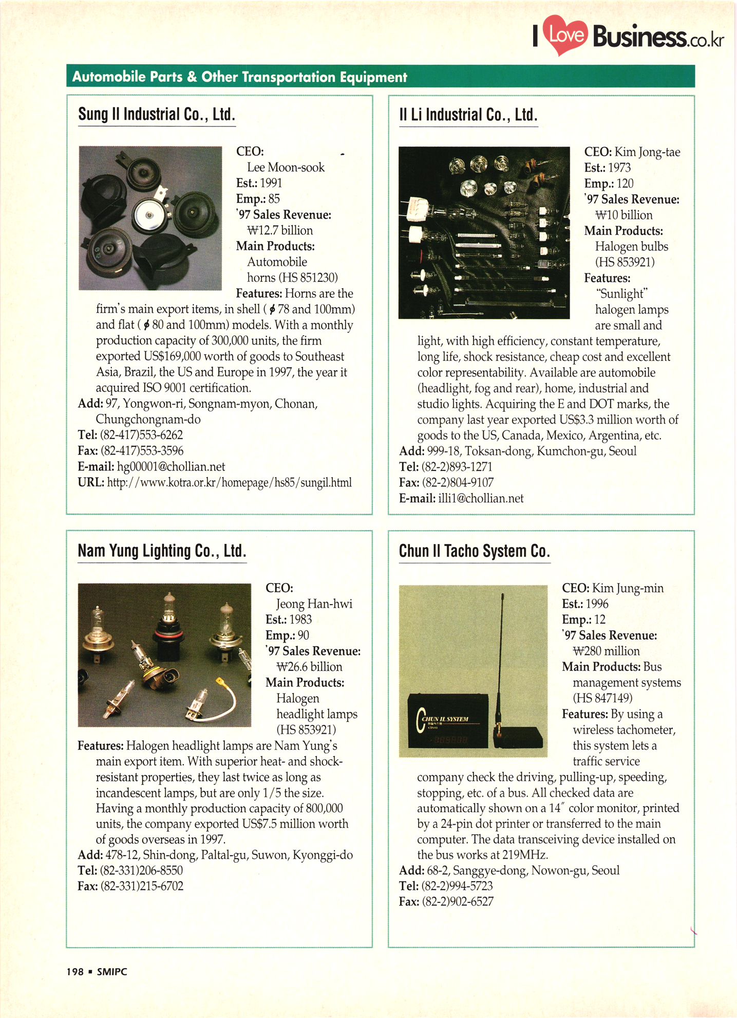 | I Love Business.co.kr small ME www.smallme.co.kr Quality Products from Korea CONTENTS • Metal Products • Machinery ..... Precision Equipment & Instrumentation • Electronic & Electric Products ........ 119 • Automobile Parts & ................... 191 Other Transportation Equipment • Chemical Products • Textile & Leather Products ......... Published on Aug. 5, 1998 by Small & Medium Industry Promotion Corporation (SMIPC) Add: 24-3, Yoido-dong, Yongdungpo-gu, Seoul, Korea Tel: (82-2)769-6841-50 Fax: (82-2)769-6959, 782-9702 E-mail: webmaster@smipc.or.kr URL: http://www.smipc.or.kr http://home.smipc.or.kr • Building Materials · • Household & Misc. Goods ........... Edited by Maekyung Buyers Guide Corp. Add: Trade Center PO Box 8, Seoul, Korea Tel: (82-2)551-2376-90 Fax: (82-2)551-2377, 2383 E-mail: mkbg@buyersguide.co.kr URL: http://www.buyersguide.co.kr Price: W20,000 Love Business Machinery Cutting tools Molds & dies Gears & reducers Material handling equipment Pumps & compressors Valves & fittings Blowers & fans Boilers Heat exchangers Packing M/C Metal working M/C Machine parts Welding M/C Automation equipment Construction equipment Food processing M/C Textile M/C & parts Paper working M/C Printing M/C Plastic processing M/C Semiconductor manufacturing equipment Refrigerators & air handling equipment 'Water treatment equipment Other industrial M/C |