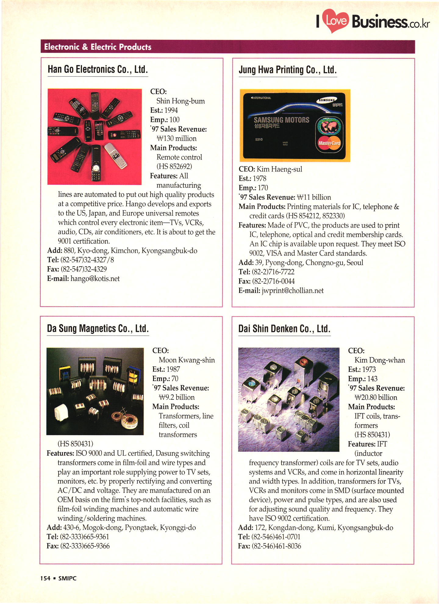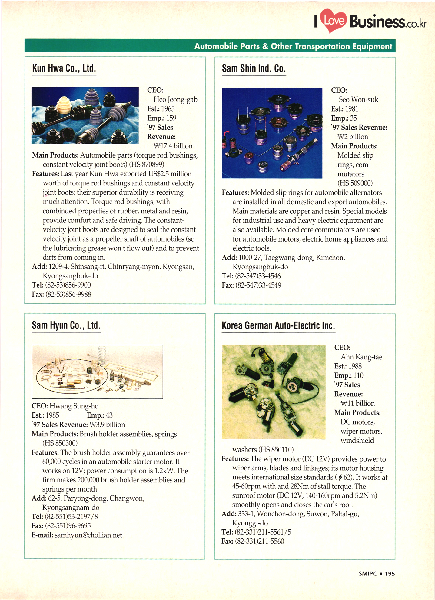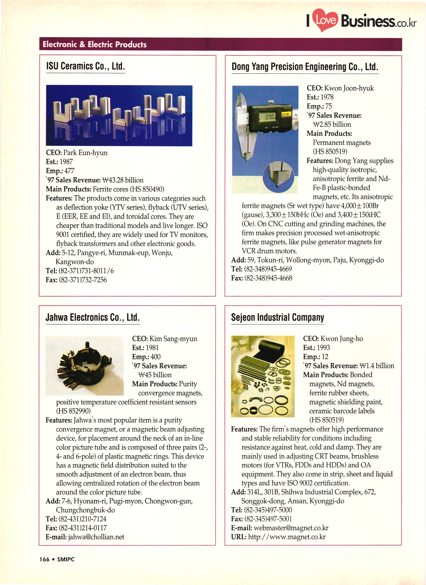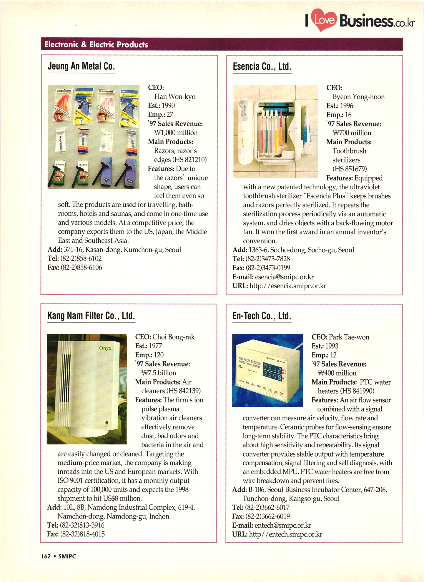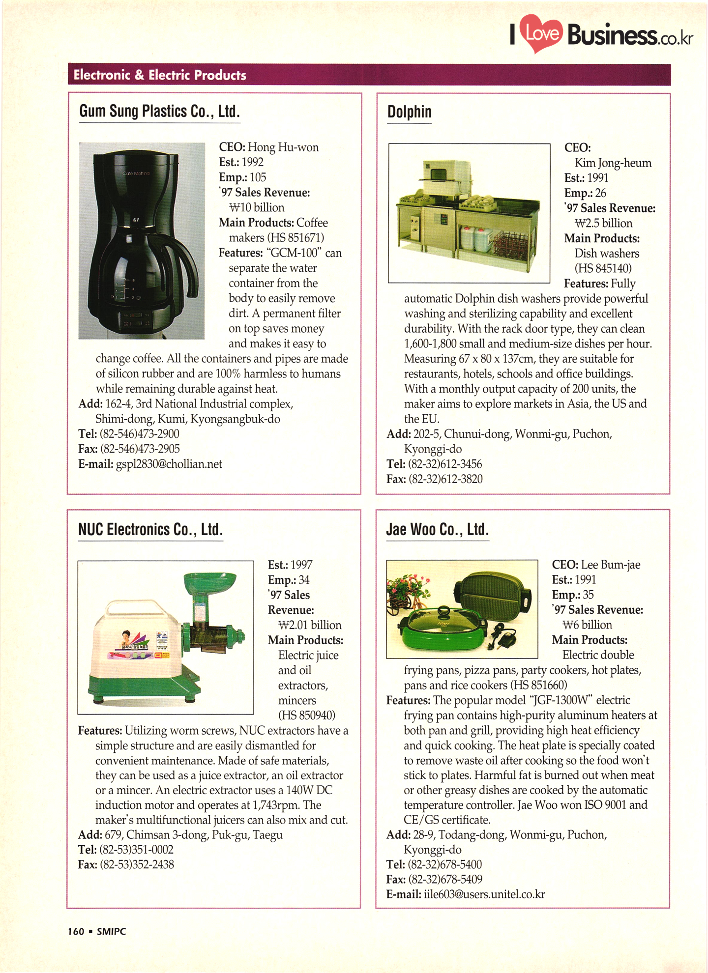 | I Love Business.co.kr small ME www.smallme.co.kr Quality Products from Korea CONTENTS • Metal Products • Machinery ..... Precision Equipment & Instrumentation • Electronic & Electric Products ........ 119 • Automobile Parts & ................... 191 Other Transportation Equipment • Chemical Products • Textile & Leather Products ......... Published on Aug. 5, 1998 by Small & Medium Industry Promotion Corporation (SMIPC) Add: 24-3, Yoido-dong, Yongdungpo-gu, Seoul, Korea Tel: (82-2)769-6841-50 Fax: (82-2)769-6959, 782-9702 E-mail: webmaster@smipc.or.kr URL: http://www.smipc.or.kr http://home.smipc.or.kr • Building Materials · • Household & Misc. Goods ........... Edited by Maekyung Buyers Guide Corp. Add: Trade Center PO Box 8, Seoul, Korea Tel: (82-2)551-2376-90 Fax: (82-2)551-2377, 2383 E-mail: mkbg@buyersguide.co.kr URL: http://www.buyersguide.co.kr Price: W20,000 Love Business Machinery Cutting tools Molds & dies Gears & reducers Material handling equipment Pumps & compressors Valves & fittings Blowers & fans Boilers Heat exchangers Packing M/C Metal working M/C Machine parts Welding M/C Automation equipment Construction equipment Food processing M/C Textile M/C & parts Paper working M/C Printing M/C Plastic processing M/C Semiconductor manufacturing equipment Refrigerators & air handling equipment 'Water treatment equipment Other industrial M/C |