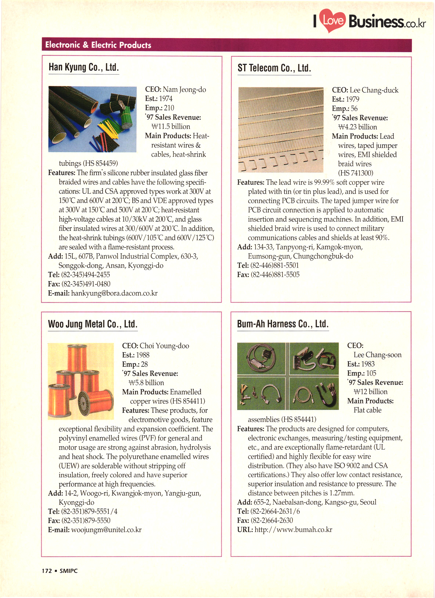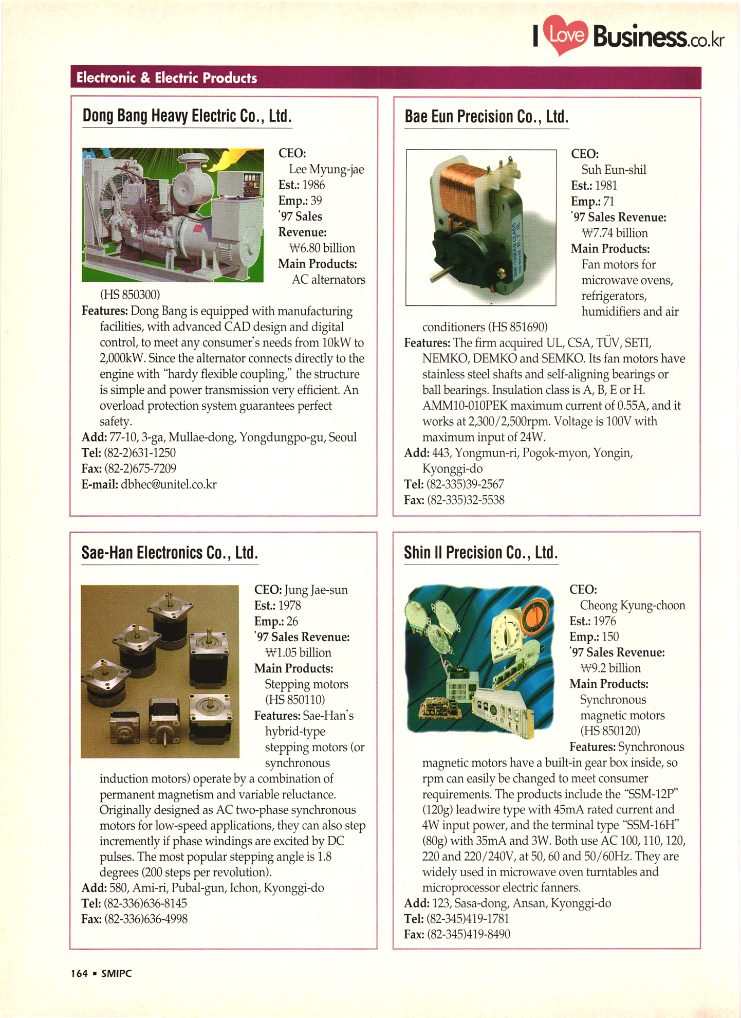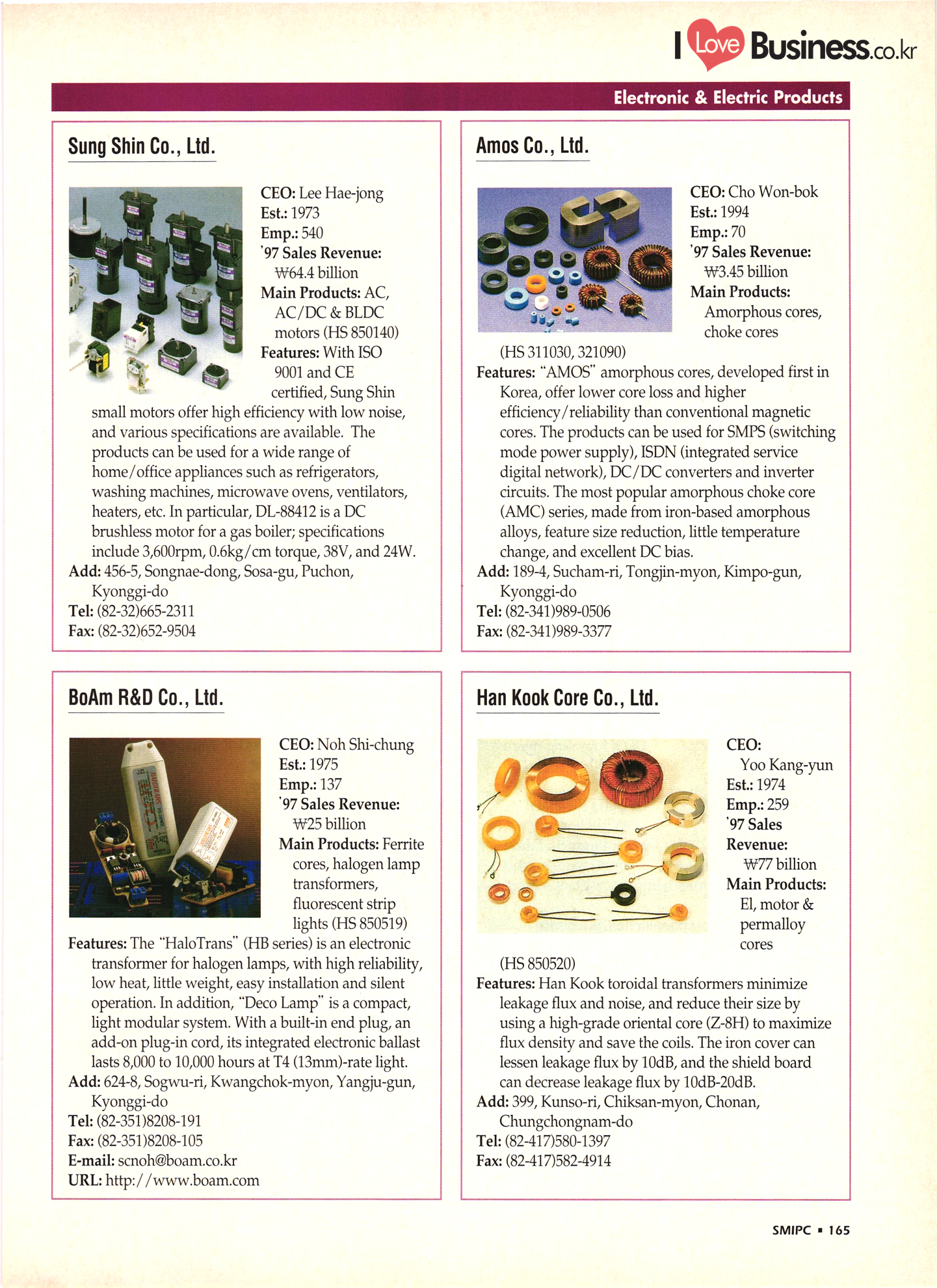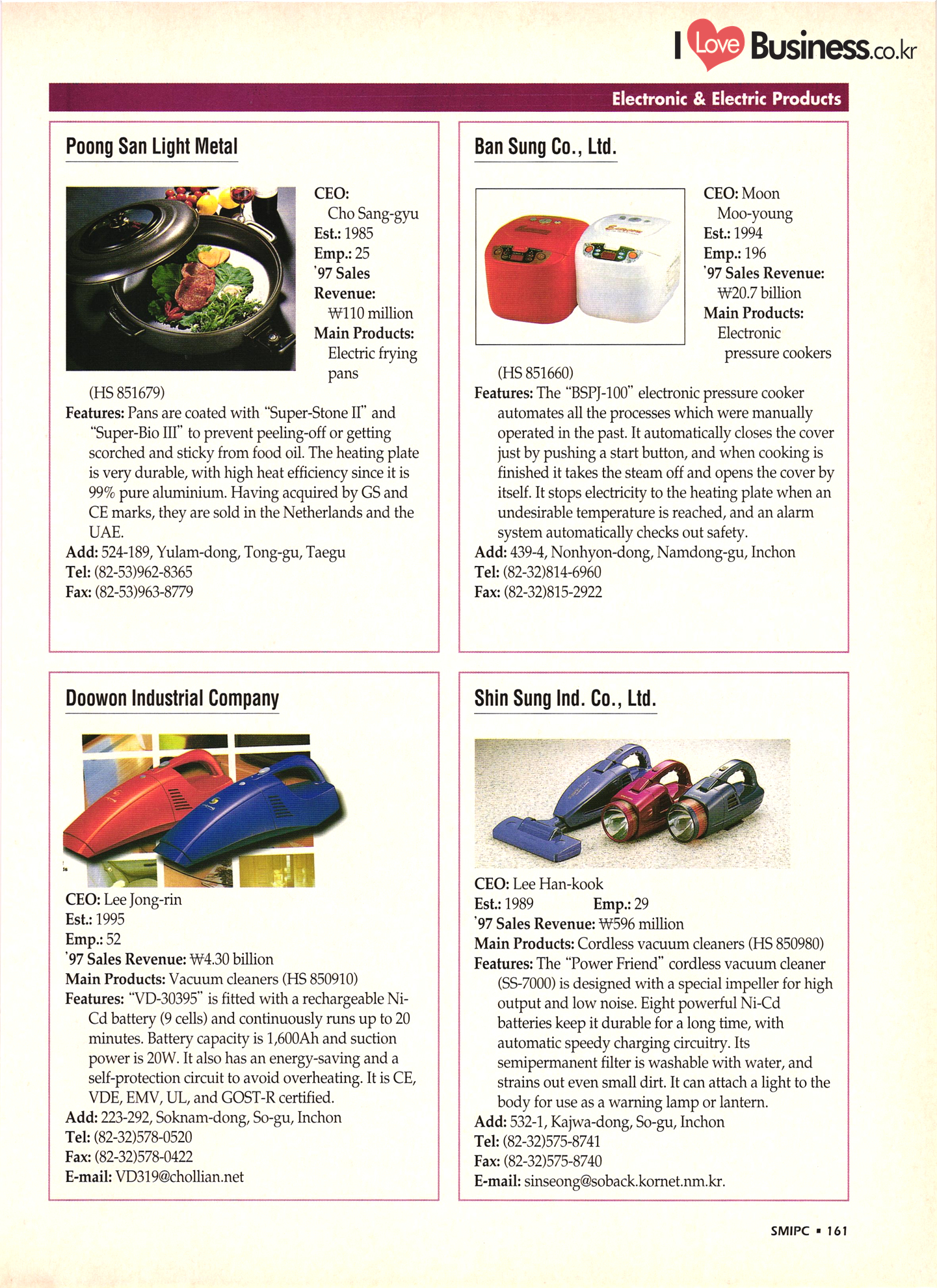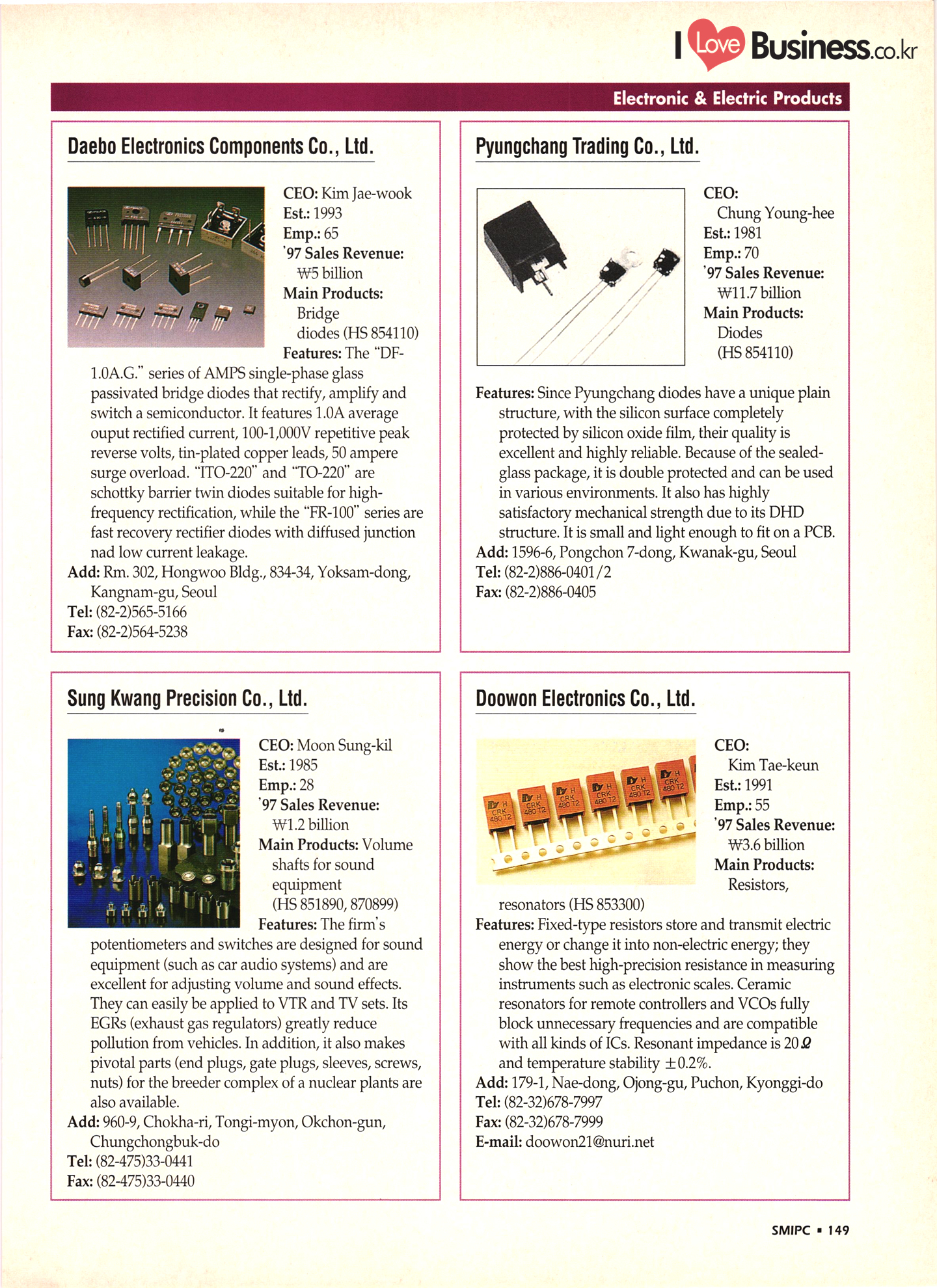| I Love Business.co.kr small ME www.smallme.co.kr Quality Products from Korea CONTENTS • Metal Products • Machinery ..... Precision Equipment & Instrumentation • Electronic & Electric Products ........ 119 • Automobile Parts & ................... 191 Other Transportation Equipment • Chemical Products • Textile & Leather Products ......... Published on Aug. 5, 1998 by Small & Medium Industry Promotion Corporation (SMIPC) Add: 24-3, Yoido-dong, Yongdungpo-gu, Seoul, Korea Tel: (82-2)769-6841-50 Fax: (82-2)769-6959, 782-9702 E-mail: webmaster@smipc.or.kr URL: http://www.smipc.or.kr http://home.smipc.or.kr • Building Materials · • Household & Misc. Goods ........... Edited by Maekyung Buyers Guide Corp. Add: Trade Center PO Box 8, Seoul, Korea Tel: (82-2)551-2376-90 Fax: (82-2)551-2377, 2383 E-mail: mkbg@buyersguide.co.kr URL: http://www.buyersguide.co.kr Price: W20,000 Love Business Machinery Cutting tools Molds & dies Gears & reducers Material handling equipment Pumps & compressors Valves & fittings Blowers & fans Boilers Heat exchangers Packing M/C Metal working M/C Machine parts Welding M/C Automation equipment Construction equipment Food processing M/C Textile M/C & parts Paper working M/C Printing M/C Plastic processing M/C Semiconductor manufacturing equipment Refrigerators & air handling equipment 'Water treatment equipment Other industrial M/C |