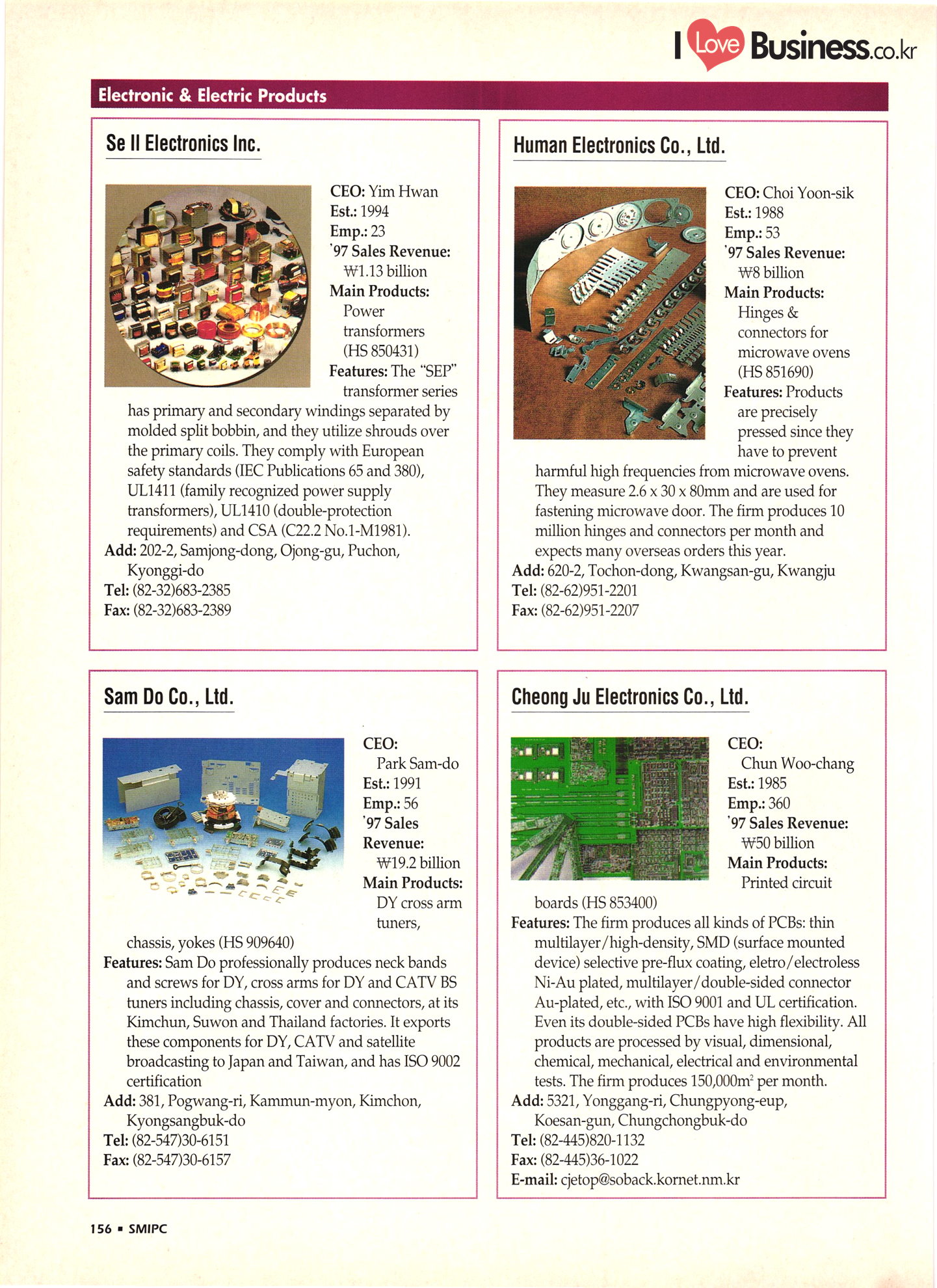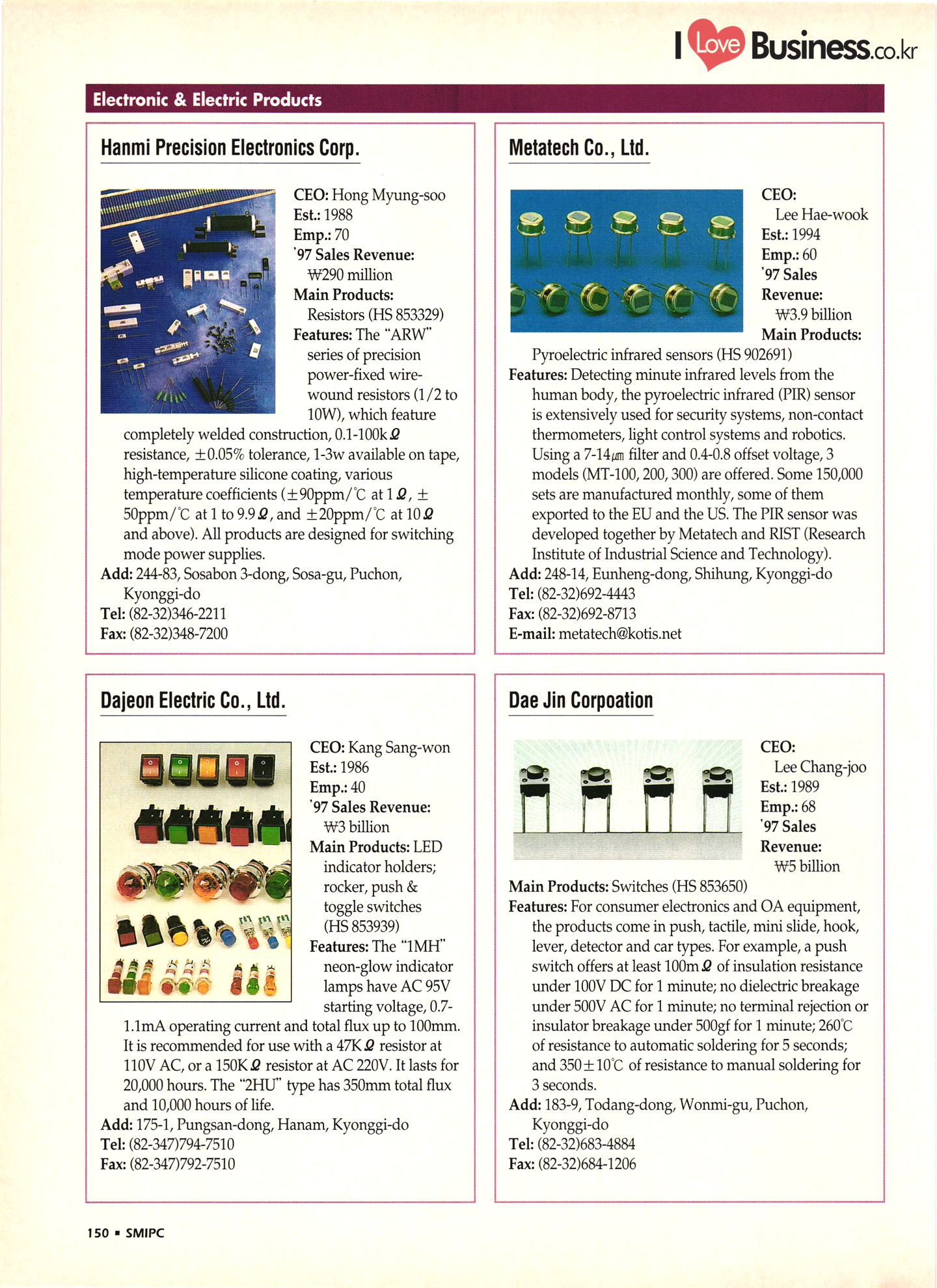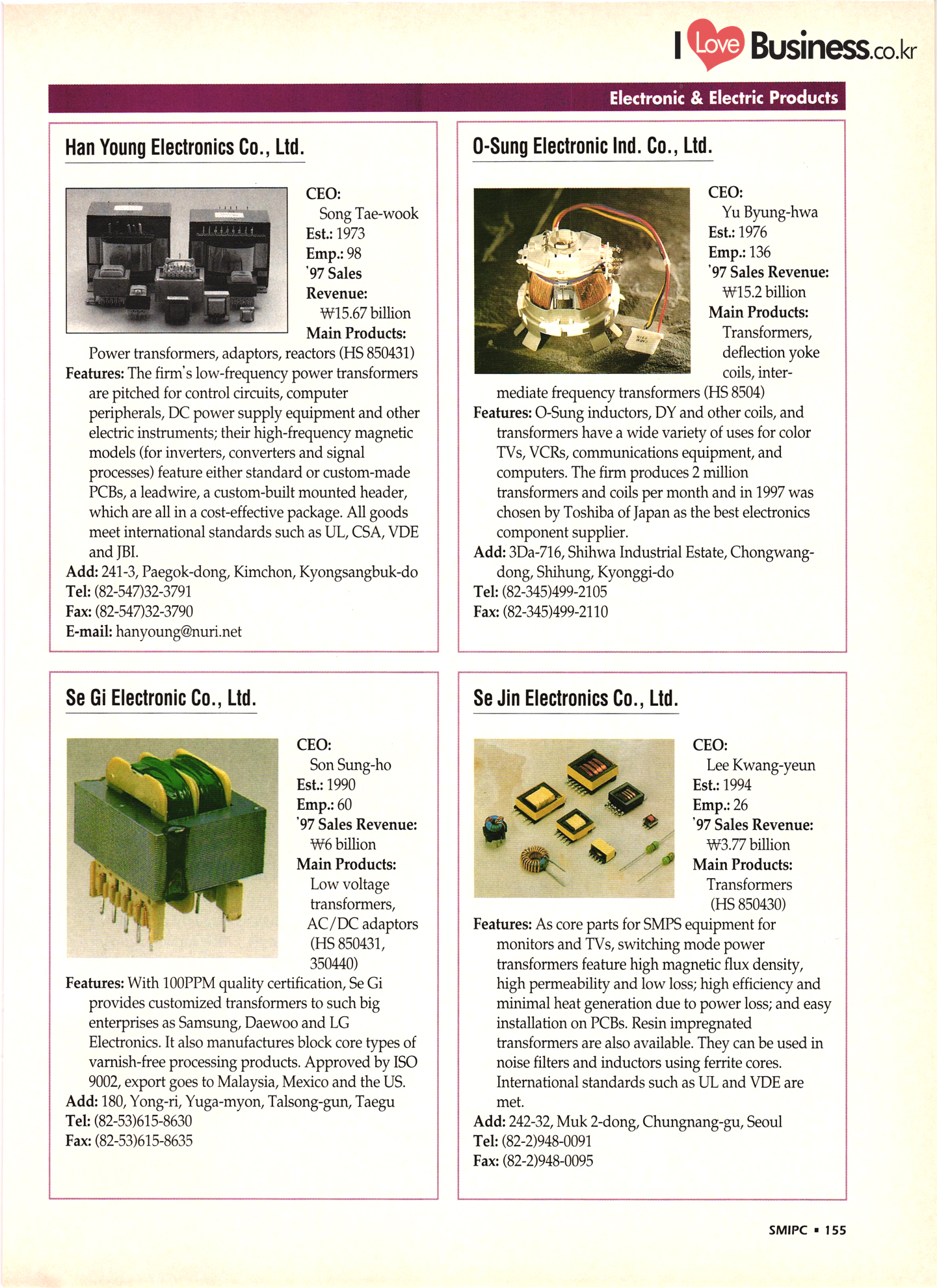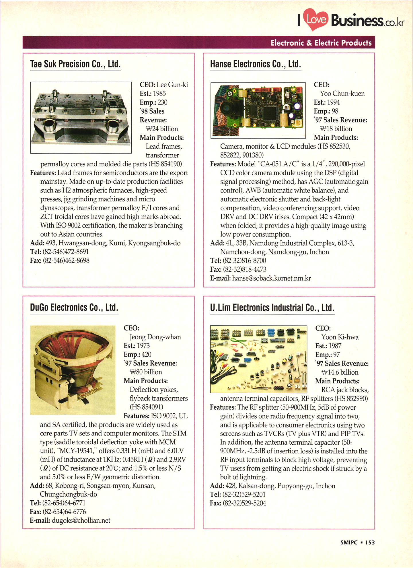 | I Love Business.co.kr small ME www.smallme.co.kr Quality Products from Korea CONTENTS • Metal Products • Machinery ..... Precision Equipment & Instrumentation • Electronic & Electric Products ........ 119 • Automobile Parts & ................... 191 Other Transportation Equipment • Chemical Products • Textile & Leather Products ......... Published on Aug. 5, 1998 by Small & Medium Industry Promotion Corporation (SMIPC) Add: 24-3, Yoido-dong, Yongdungpo-gu, Seoul, Korea Tel: (82-2)769-6841-50 Fax: (82-2)769-6959, 782-9702 E-mail: webmaster@smipc.or.kr URL: http://www.smipc.or.kr http://home.smipc.or.kr • Building Materials · • Household & Misc. Goods ........... Edited by Maekyung Buyers Guide Corp. Add: Trade Center PO Box 8, Seoul, Korea Tel: (82-2)551-2376-90 Fax: (82-2)551-2377, 2383 E-mail: mkbg@buyersguide.co.kr URL: http://www.buyersguide.co.kr Price: W20,000 Love Business Machinery Cutting tools Molds & dies Gears & reducers Material handling equipment Pumps & compressors Valves & fittings Blowers & fans Boilers Heat exchangers Packing M/C Metal working M/C Machine parts Welding M/C Automation equipment Construction equipment Food processing M/C Textile M/C & parts Paper working M/C Printing M/C Plastic processing M/C Semiconductor manufacturing equipment Refrigerators & air handling equipment 'Water treatment equipment Other industrial M/C |