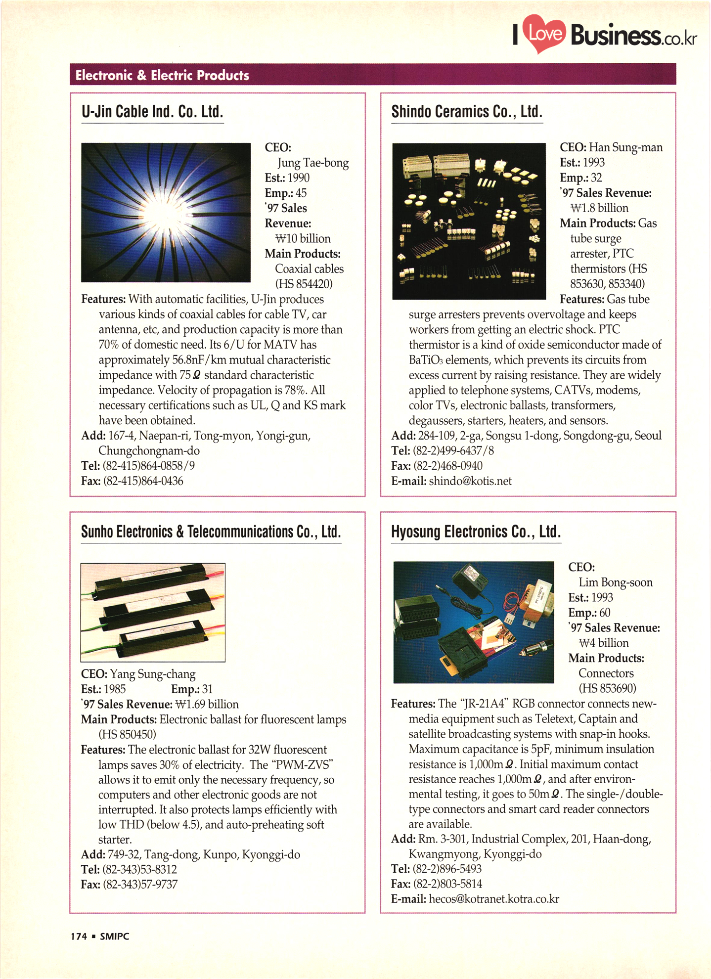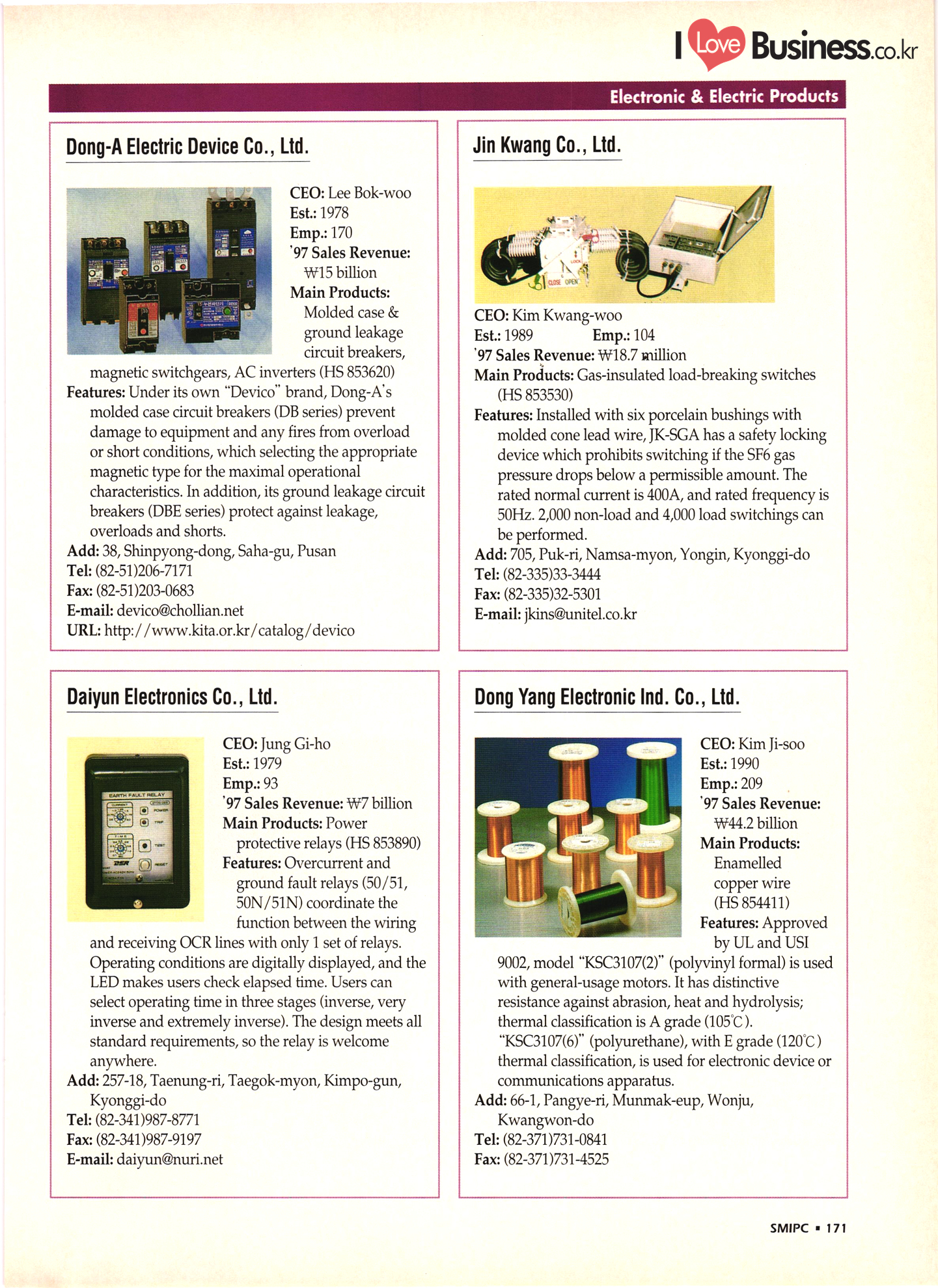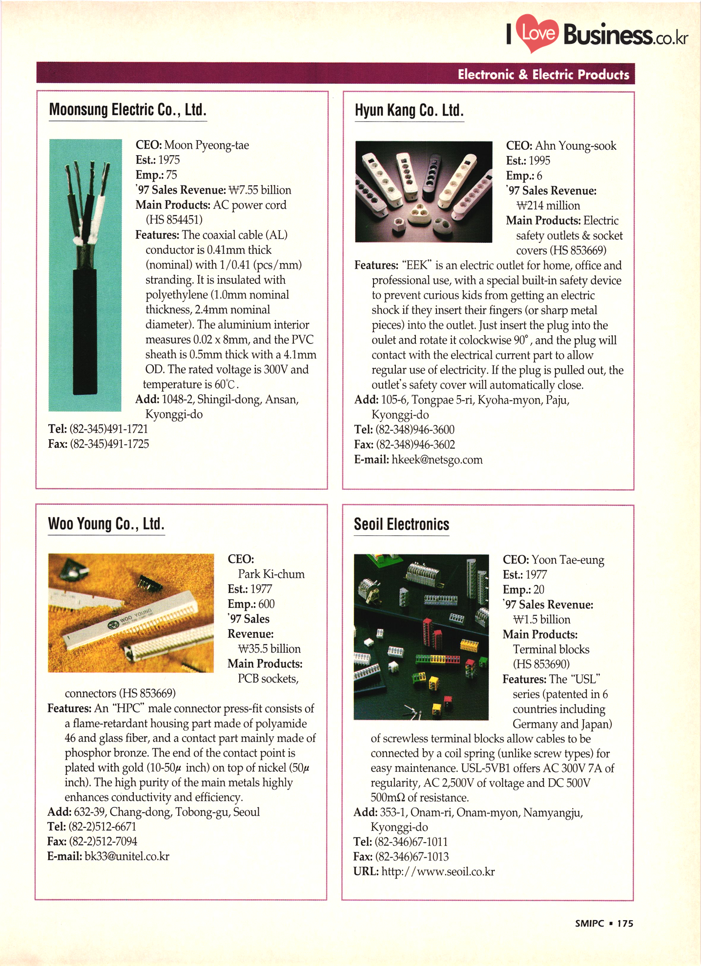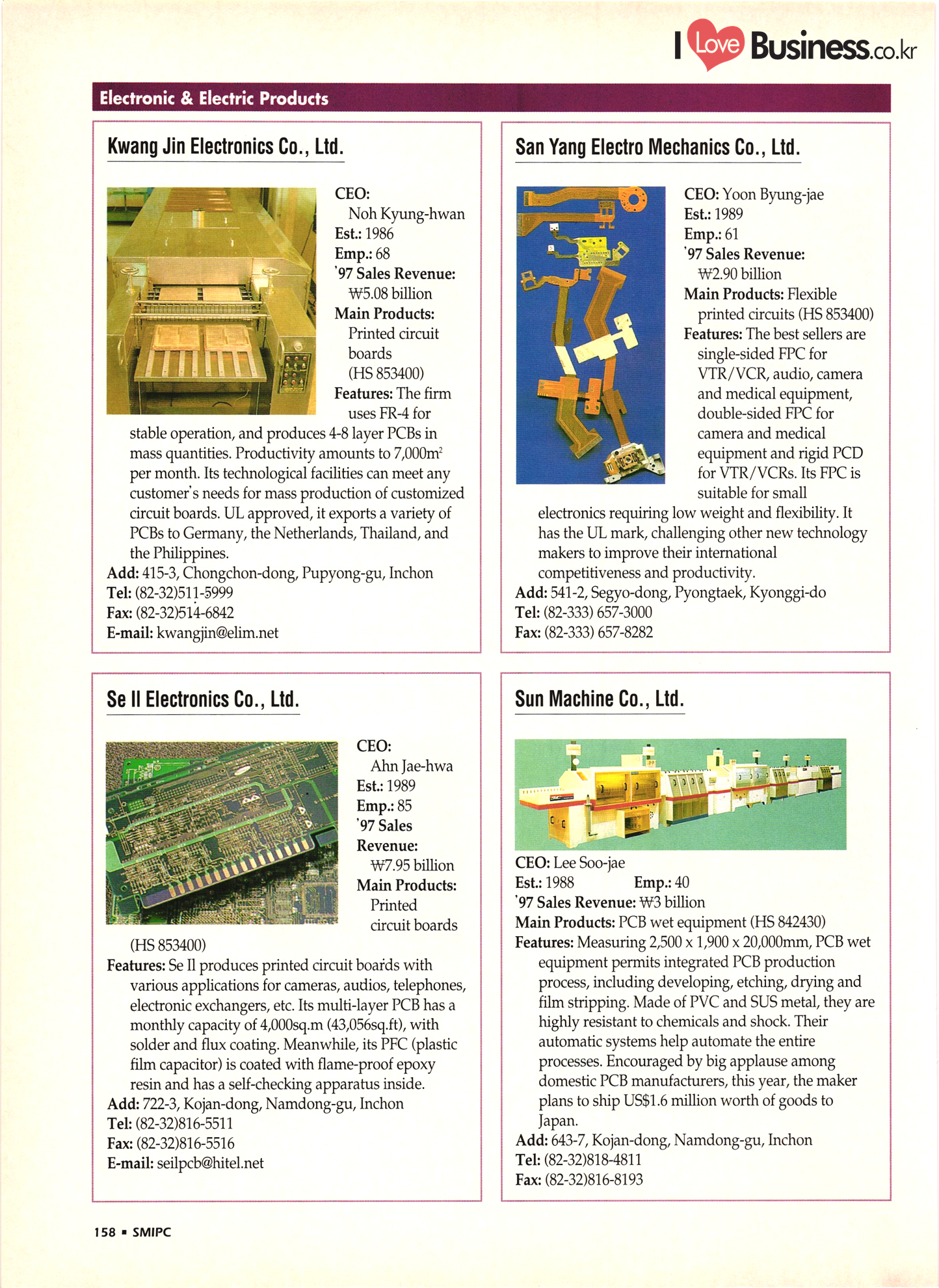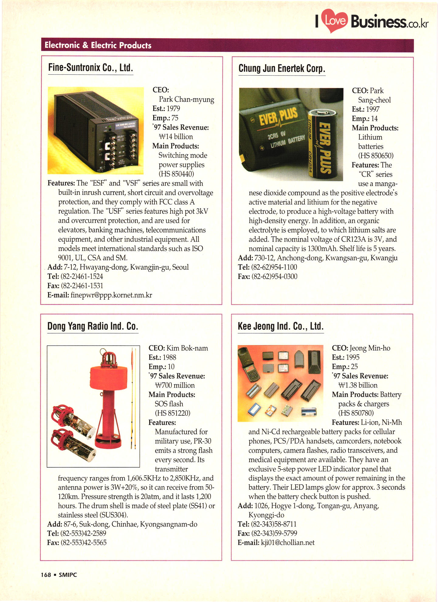 | I Love Business.co.kr small ME www.smallme.co.kr Quality Products from Korea CONTENTS • Metal Products • Machinery ..... Precision Equipment & Instrumentation • Electronic & Electric Products ........ 119 • Automobile Parts & ................... 191 Other Transportation Equipment • Chemical Products • Textile & Leather Products ......... Published on Aug. 5, 1998 by Small & Medium Industry Promotion Corporation (SMIPC) Add: 24-3, Yoido-dong, Yongdungpo-gu, Seoul, Korea Tel: (82-2)769-6841-50 Fax: (82-2)769-6959, 782-9702 E-mail: webmaster@smipc.or.kr URL: http://www.smipc.or.kr http://home.smipc.or.kr • Building Materials · • Household & Misc. Goods ........... Edited by Maekyung Buyers Guide Corp. Add: Trade Center PO Box 8, Seoul, Korea Tel: (82-2)551-2376-90 Fax: (82-2)551-2377, 2383 E-mail: mkbg@buyersguide.co.kr URL: http://www.buyersguide.co.kr Price: W20,000 Love Business Machinery Cutting tools Molds & dies Gears & reducers Material handling equipment Pumps & compressors Valves & fittings Blowers & fans Boilers Heat exchangers Packing M/C Metal working M/C Machine parts Welding M/C Automation equipment Construction equipment Food processing M/C Textile M/C & parts Paper working M/C Printing M/C Plastic processing M/C Semiconductor manufacturing equipment Refrigerators & air handling equipment 'Water treatment equipment Other industrial M/C |