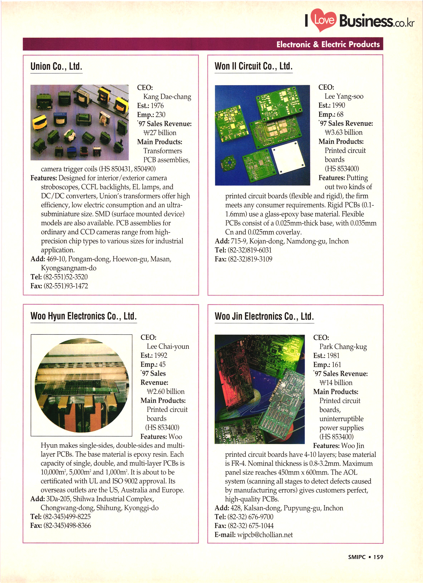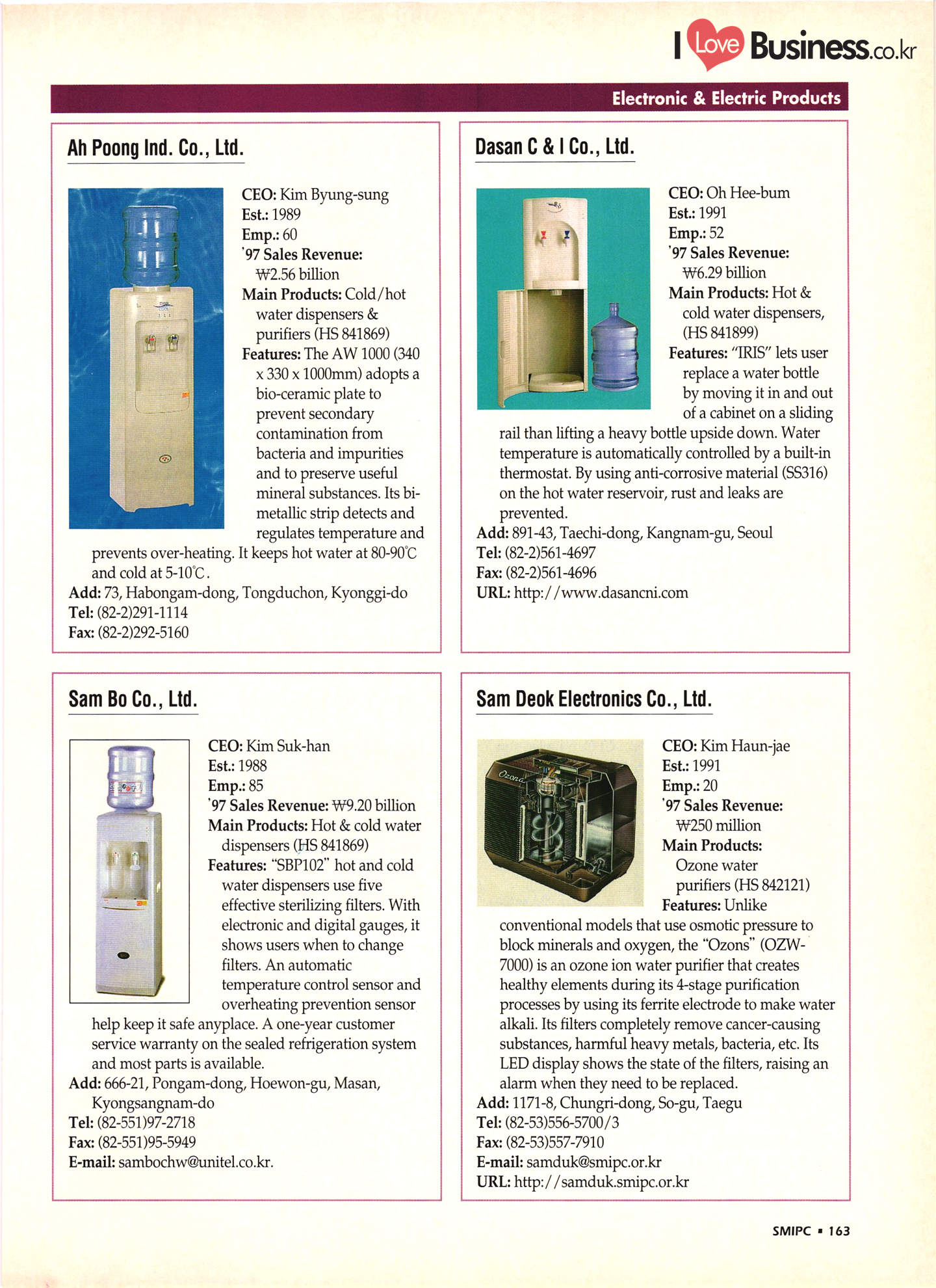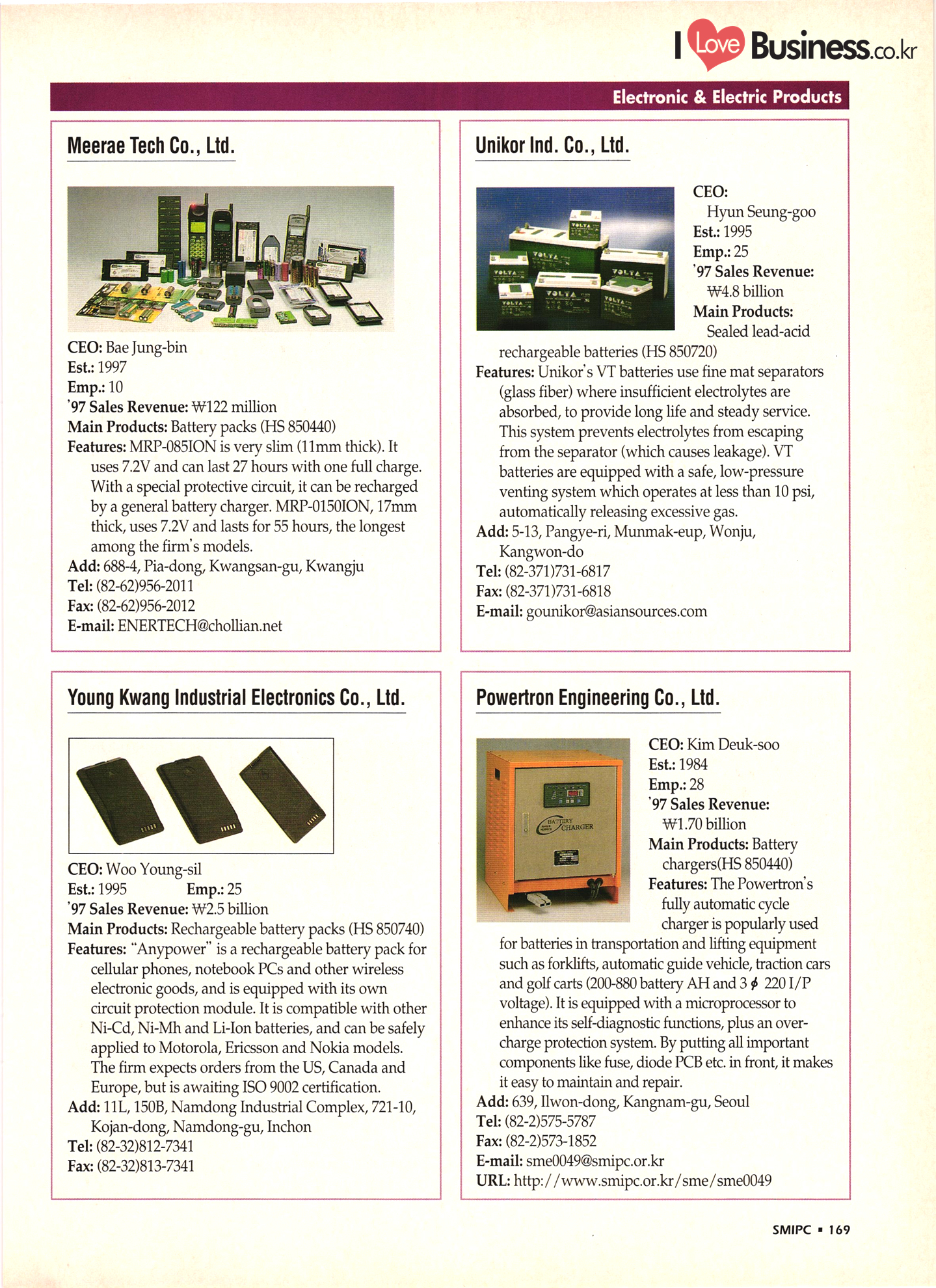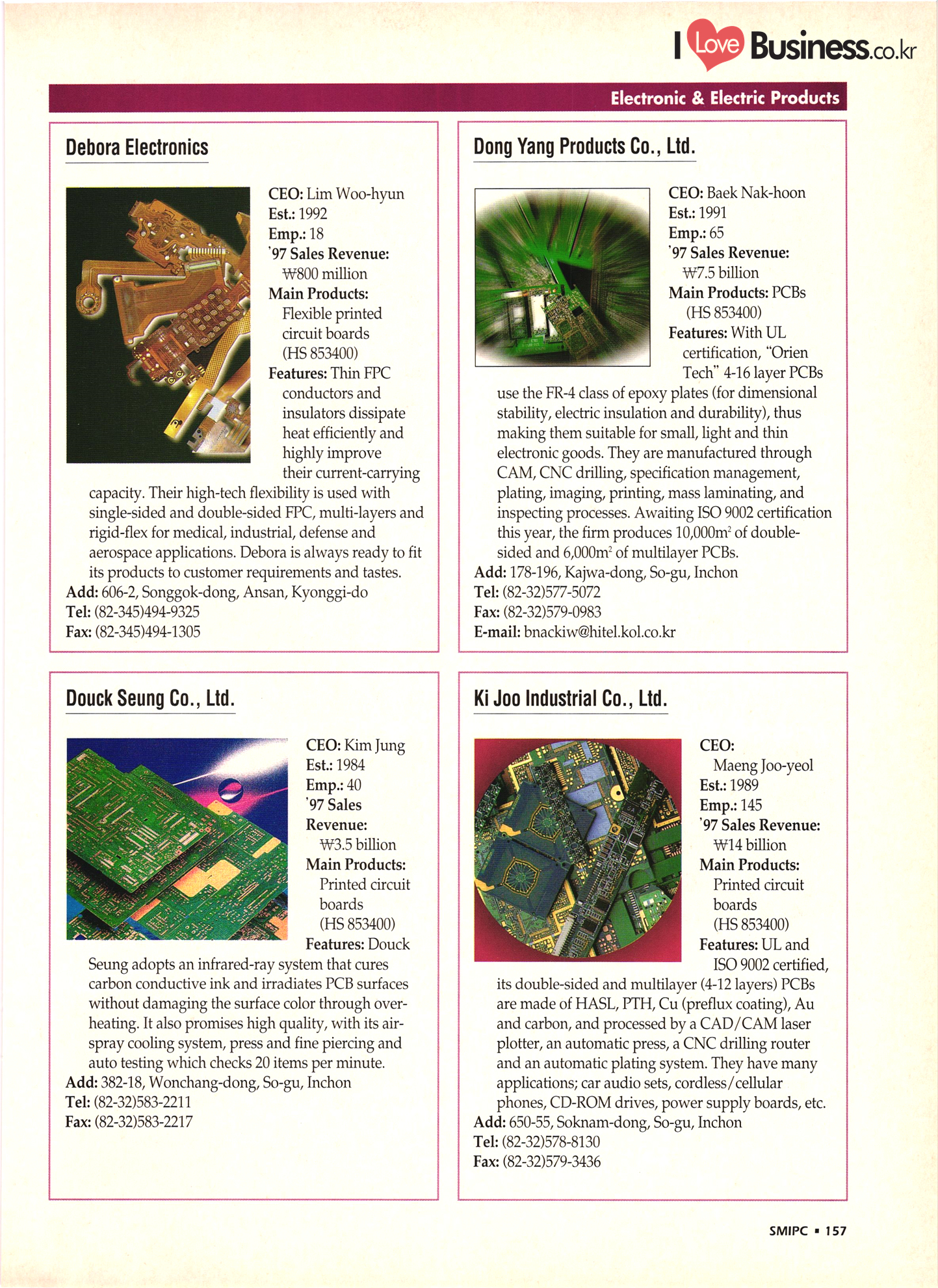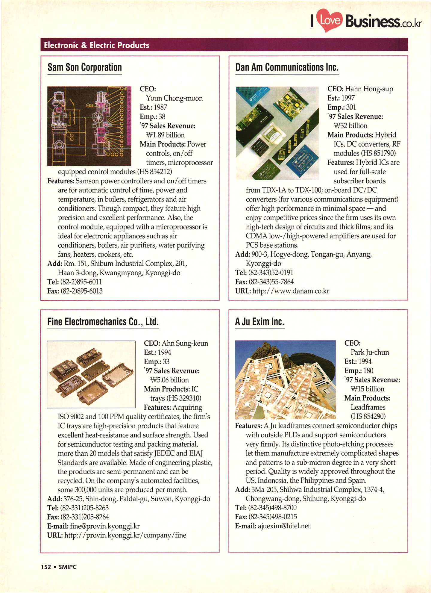 | I Love Business.co.kr small ME www.smallme.co.kr Quality Products from Korea CONTENTS • Metal Products • Machinery ..... Precision Equipment & Instrumentation • Electronic & Electric Products ........ 119 • Automobile Parts & ................... 191 Other Transportation Equipment • Chemical Products • Textile & Leather Products ......... Published on Aug. 5, 1998 by Small & Medium Industry Promotion Corporation (SMIPC) Add: 24-3, Yoido-dong, Yongdungpo-gu, Seoul, Korea Tel: (82-2)769-6841-50 Fax: (82-2)769-6959, 782-9702 E-mail: webmaster@smipc.or.kr URL: http://www.smipc.or.kr http://home.smipc.or.kr • Building Materials · • Household & Misc. Goods ........... Edited by Maekyung Buyers Guide Corp. Add: Trade Center PO Box 8, Seoul, Korea Tel: (82-2)551-2376-90 Fax: (82-2)551-2377, 2383 E-mail: mkbg@buyersguide.co.kr URL: http://www.buyersguide.co.kr Price: W20,000 Love Business Machinery Cutting tools Molds & dies Gears & reducers Material handling equipment Pumps & compressors Valves & fittings Blowers & fans Boilers Heat exchangers Packing M/C Metal working M/C Machine parts Welding M/C Automation equipment Construction equipment Food processing M/C Textile M/C & parts Paper working M/C Printing M/C Plastic processing M/C Semiconductor manufacturing equipment Refrigerators & air handling equipment 'Water treatment equipment Other industrial M/C |