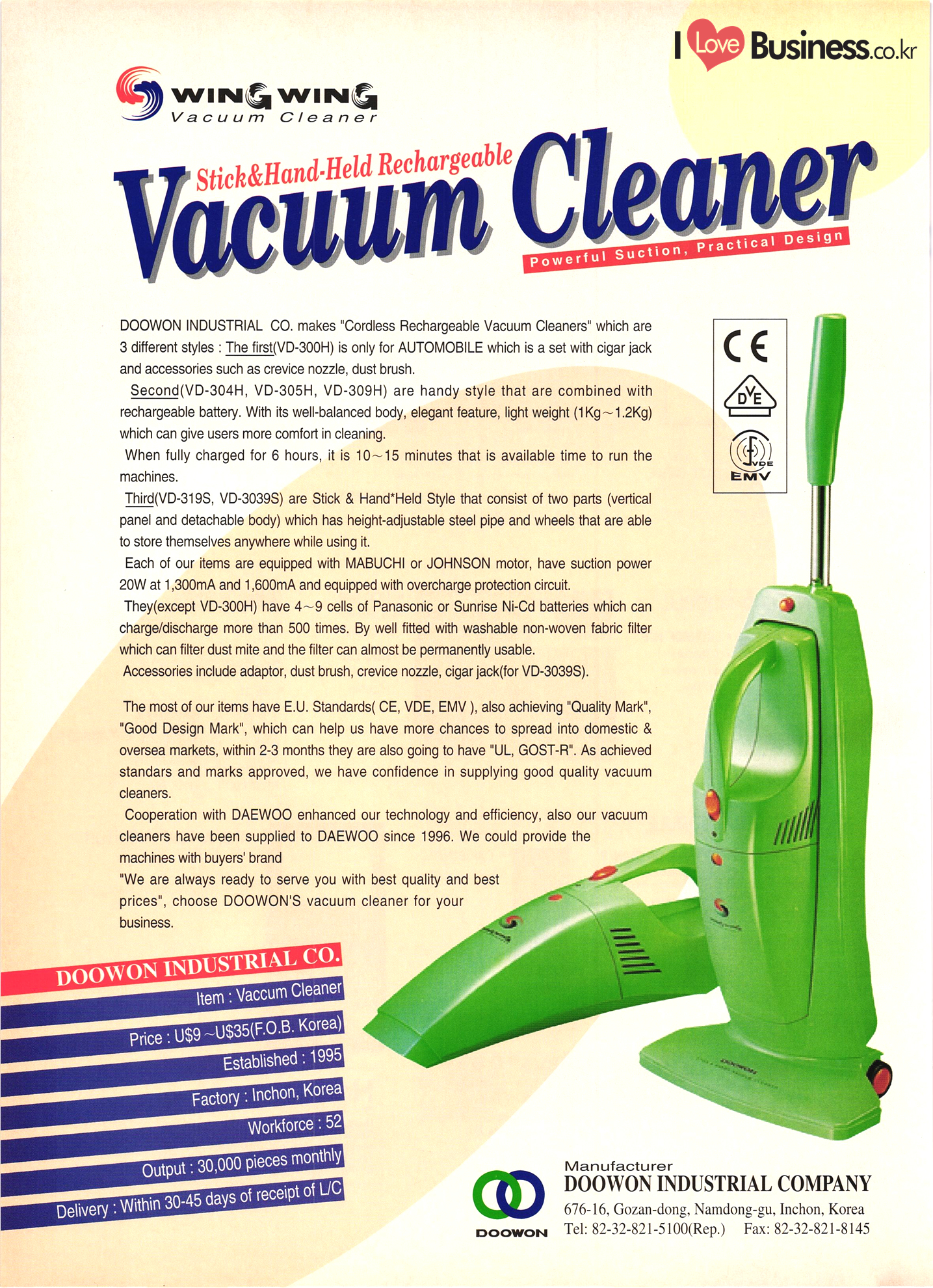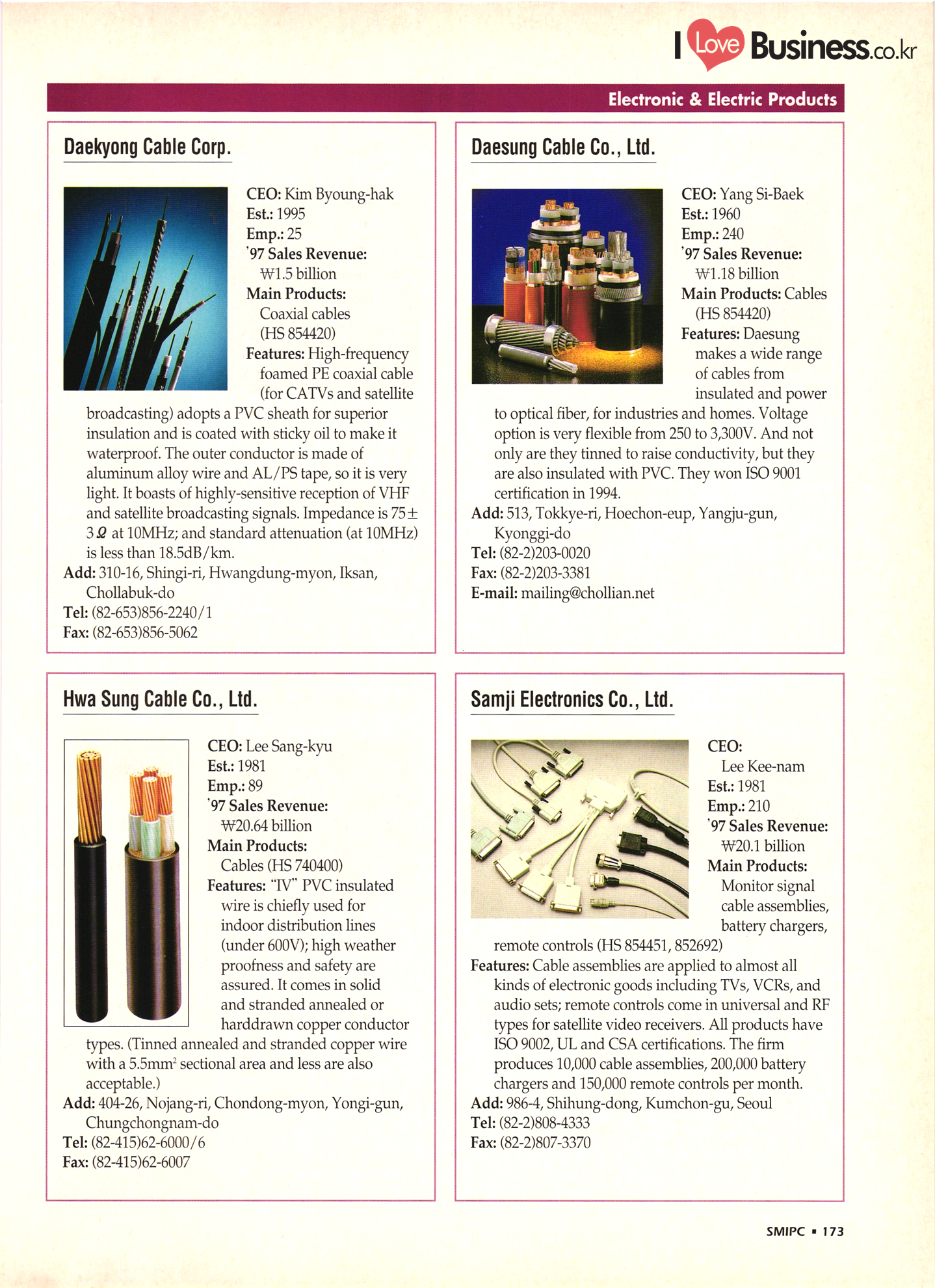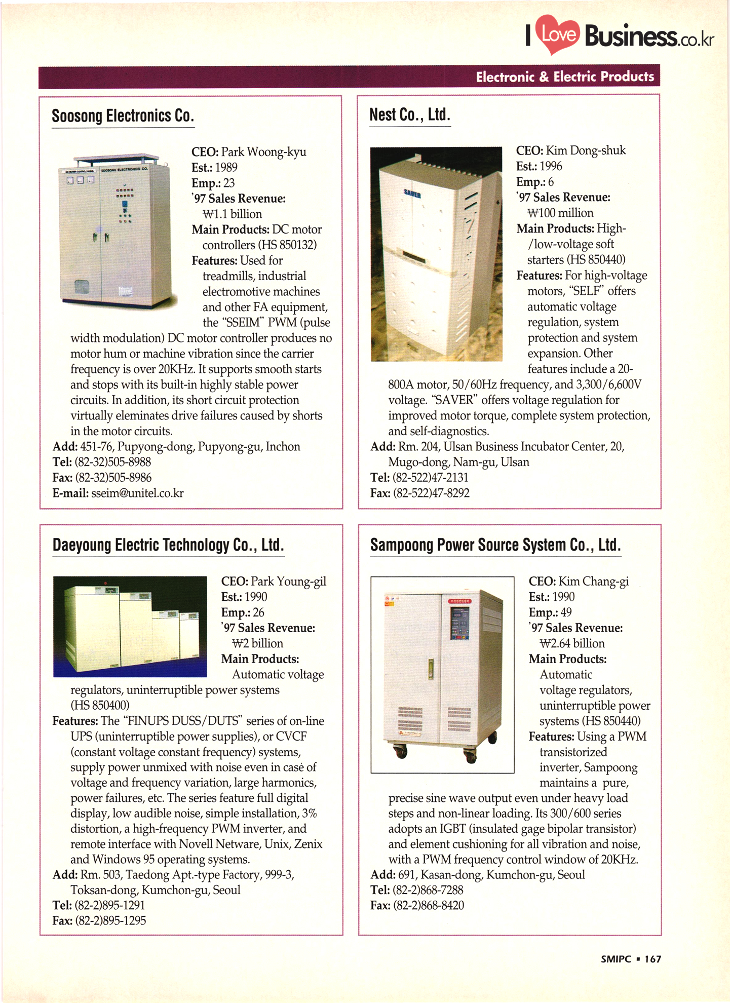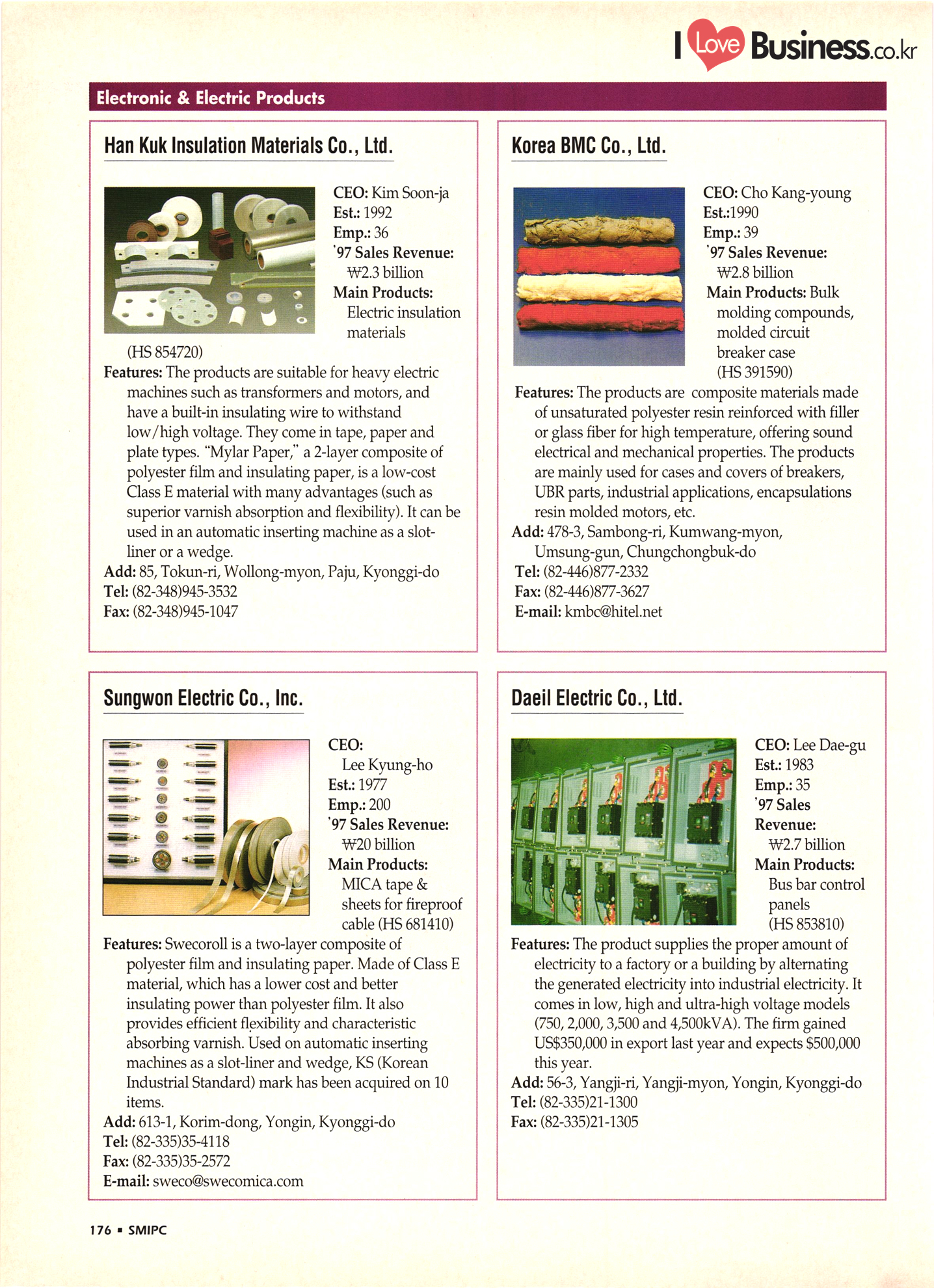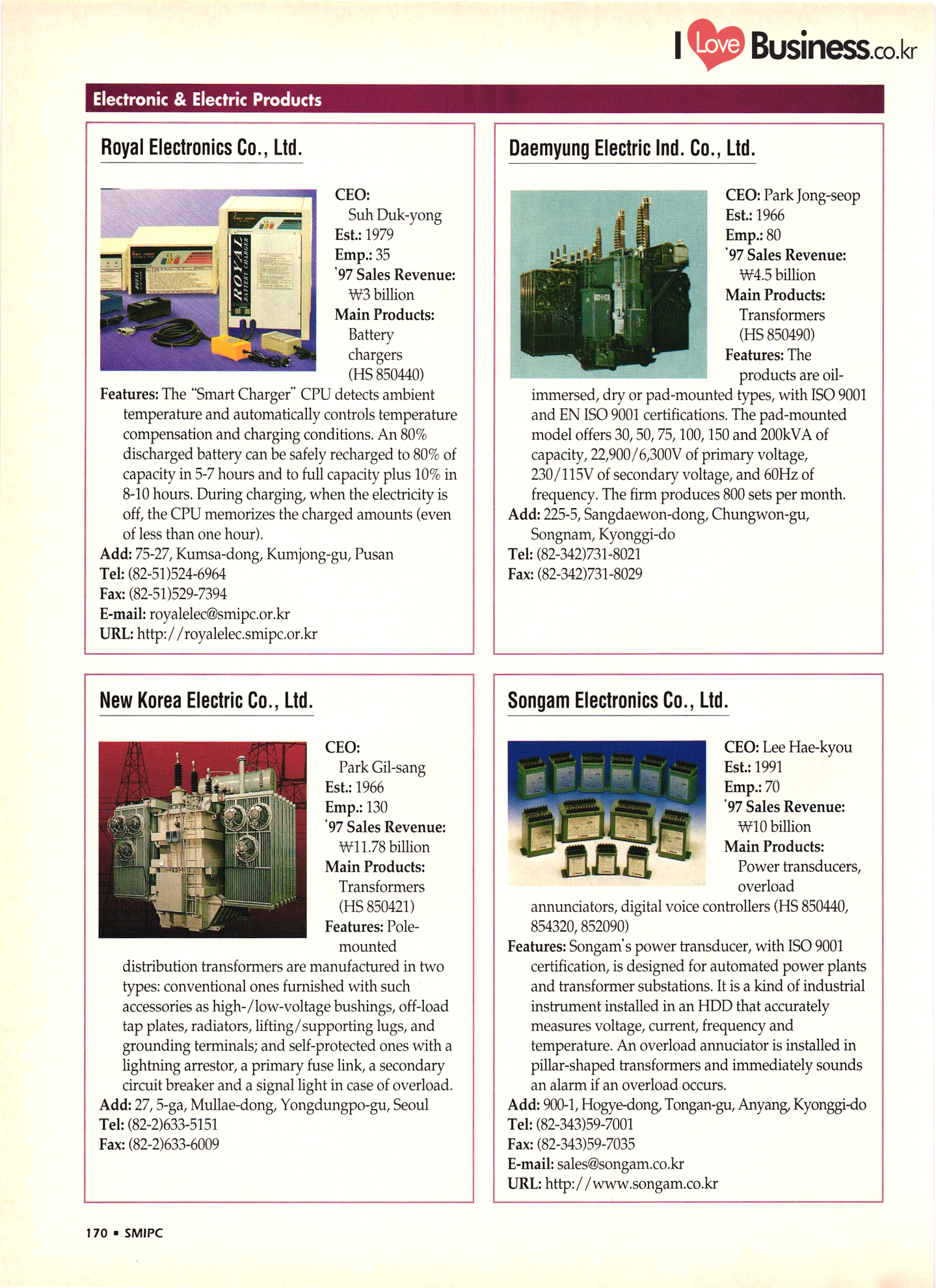 | I Love Business.co.kr small ME www.smallme.co.kr Quality Products from Korea CONTENTS • Metal Products • Machinery ..... Precision Equipment & Instrumentation • Electronic & Electric Products ........ 119 • Automobile Parts & ................... 191 Other Transportation Equipment • Chemical Products • Textile & Leather Products ......... Published on Aug. 5, 1998 by Small & Medium Industry Promotion Corporation (SMIPC) Add: 24-3, Yoido-dong, Yongdungpo-gu, Seoul, Korea Tel: (82-2)769-6841-50 Fax: (82-2)769-6959, 782-9702 E-mail: webmaster@smipc.or.kr URL: http://www.smipc.or.kr http://home.smipc.or.kr • Building Materials · • Household & Misc. Goods ........... Edited by Maekyung Buyers Guide Corp. Add: Trade Center PO Box 8, Seoul, Korea Tel: (82-2)551-2376-90 Fax: (82-2)551-2377, 2383 E-mail: mkbg@buyersguide.co.kr URL: http://www.buyersguide.co.kr Price: W20,000 Love Business Machinery Cutting tools Molds & dies Gears & reducers Material handling equipment Pumps & compressors Valves & fittings Blowers & fans Boilers Heat exchangers Packing M/C Metal working M/C Machine parts Welding M/C Automation equipment Construction equipment Food processing M/C Textile M/C & parts Paper working M/C Printing M/C Plastic processing M/C Semiconductor manufacturing equipment Refrigerators & air handling equipment 'Water treatment equipment Other industrial M/C |