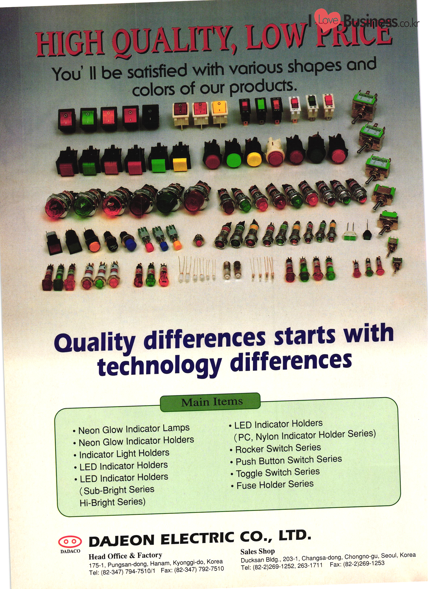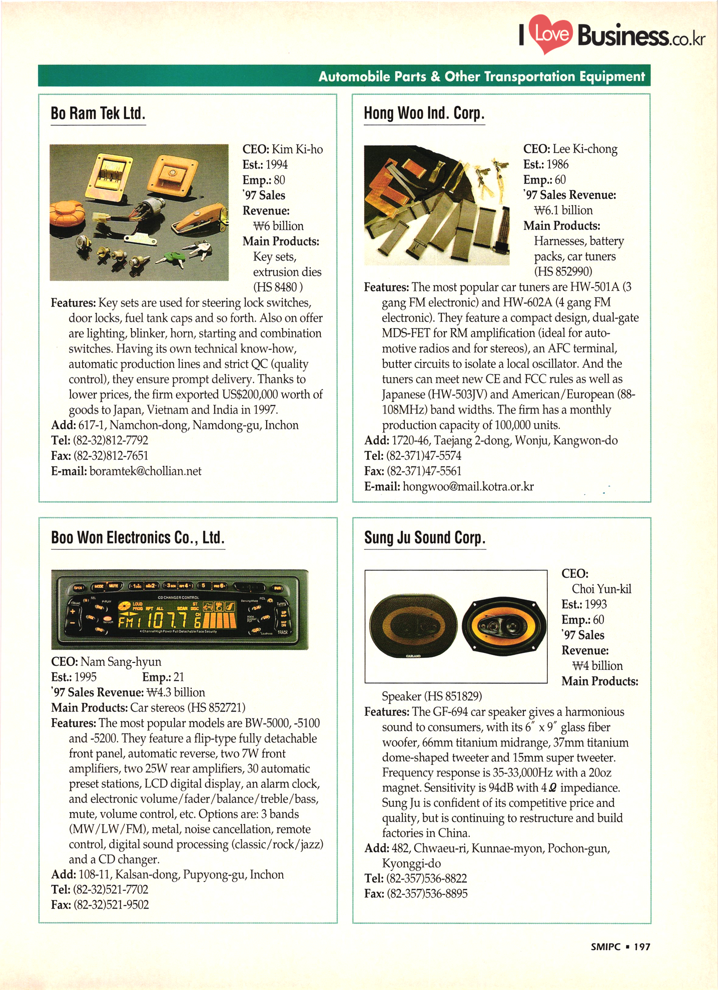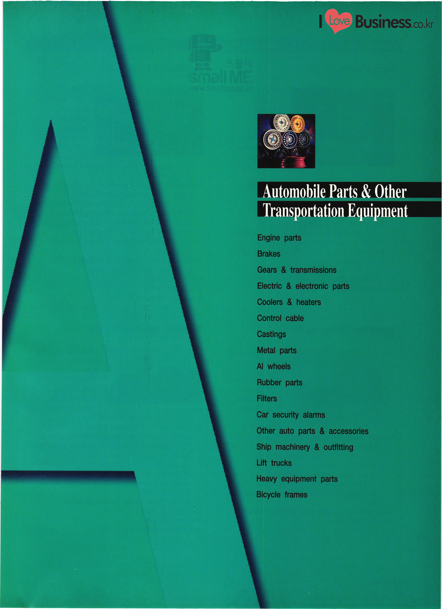 Precision Equipment & Instrumentation Measuring & testing equipment Optical equipment Medical equipment I Love Business.cok Electronic & Electric Products Computer peripherals & accessories Software Business equipment Audio & components Communications equipment & parts CCTV systems Electronic parts & components PCBs Electric home appliances Alternators Motors & cores UPS & converters Batteries & chargers Transformers & transducers Circuit breakers Relays Wire & cable Other I Love Business.co.kr | Automobile Parts & Other Transportation Equipment Engine parts Brakes Gears & transmissions Electric & electronic parts Coolers & heaters Control cable Castings Metal parts Al wheels Rubber parts Filters Car security alarms Other auto parts & accessories Ship machinery & outfitting Lift trucks Heavy equipment parts Bicycle frames |