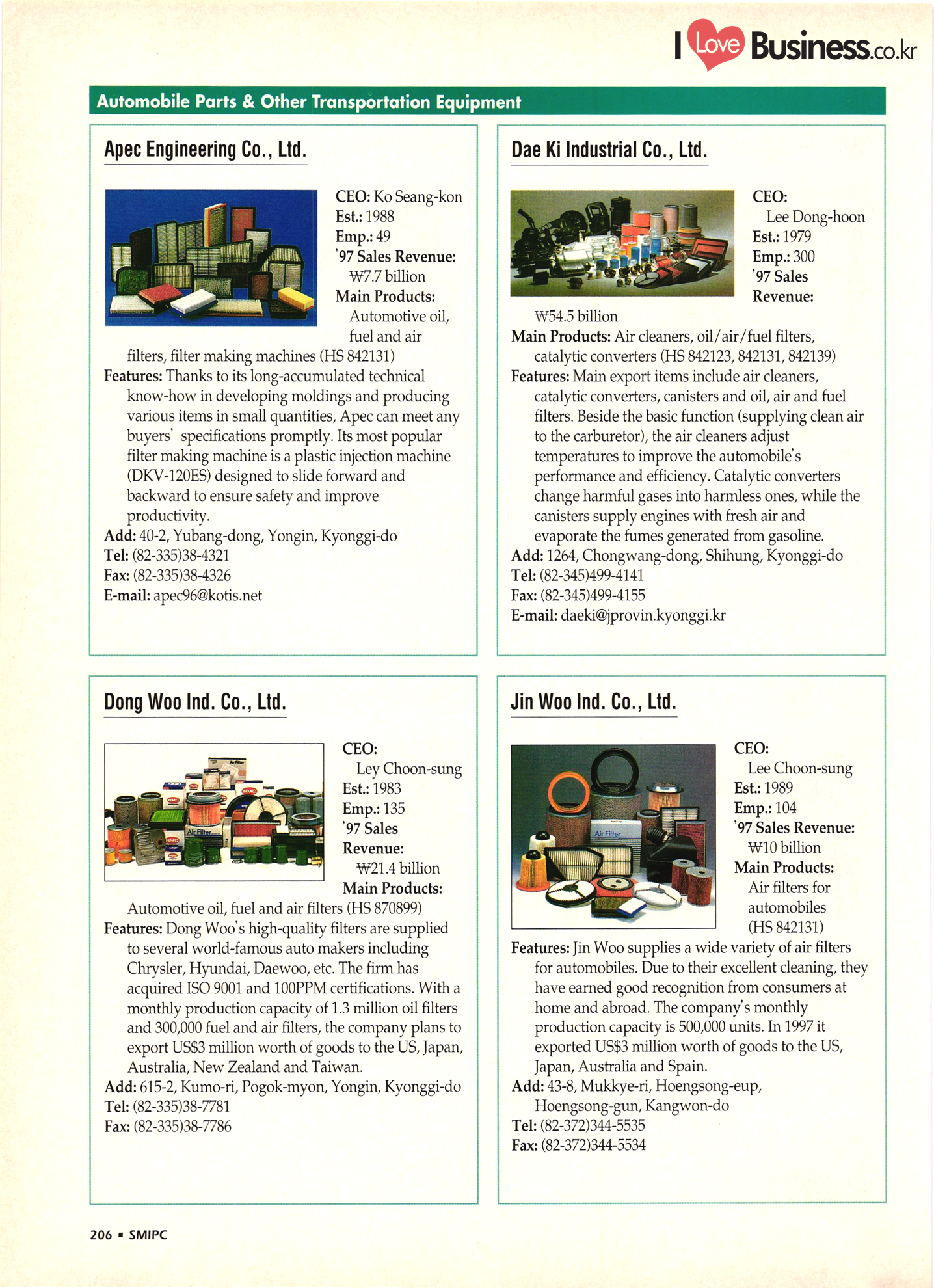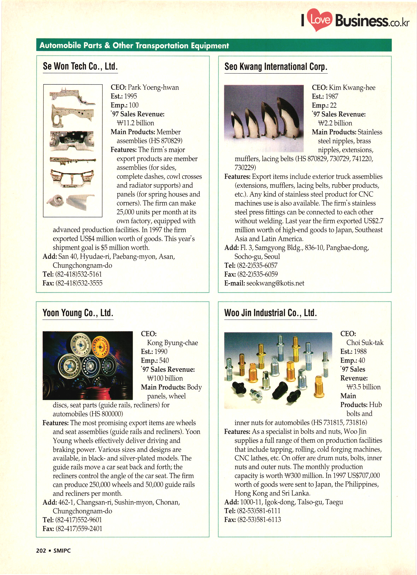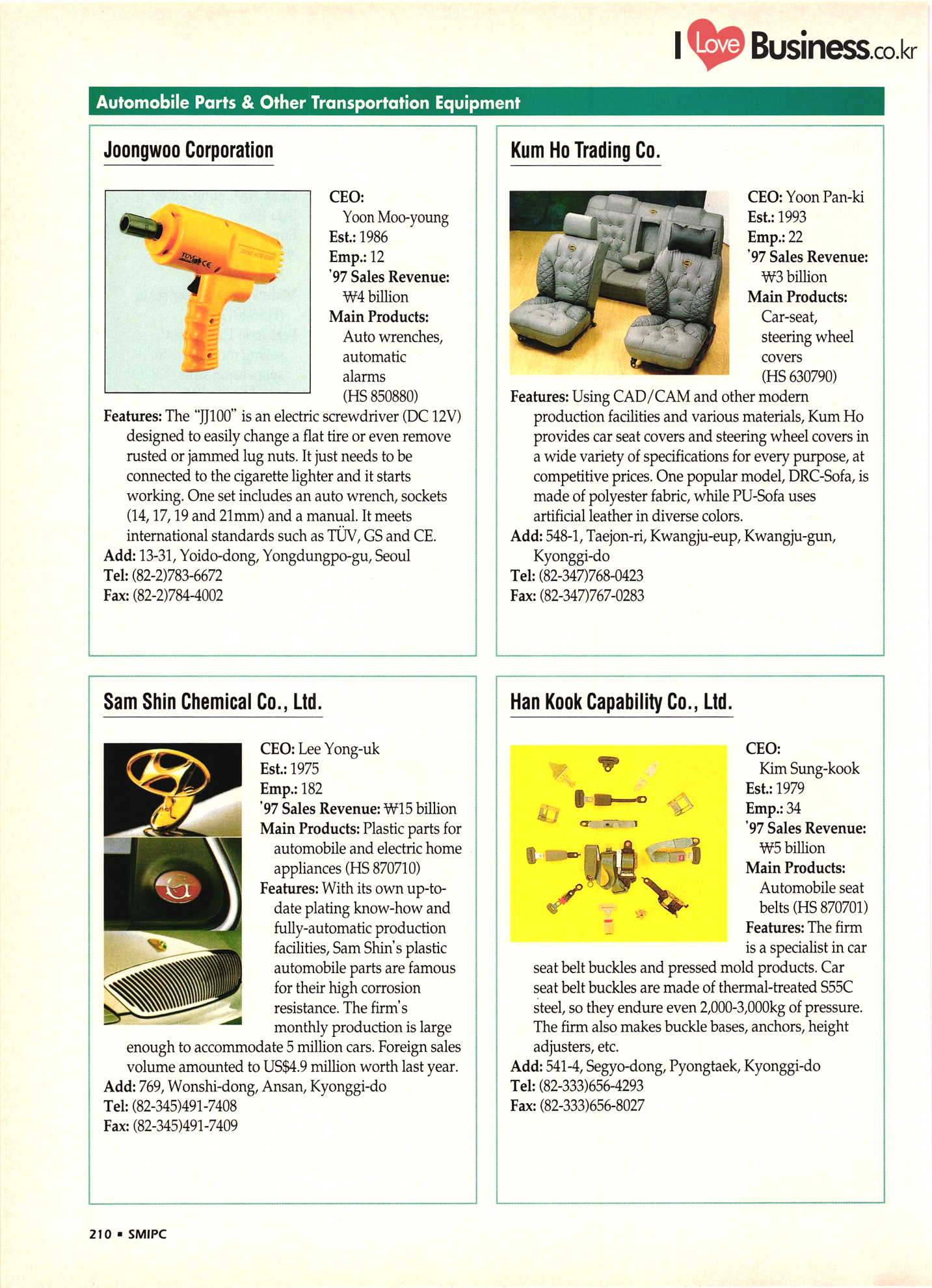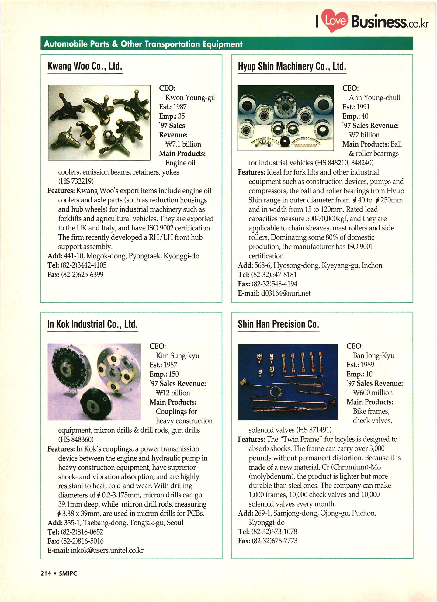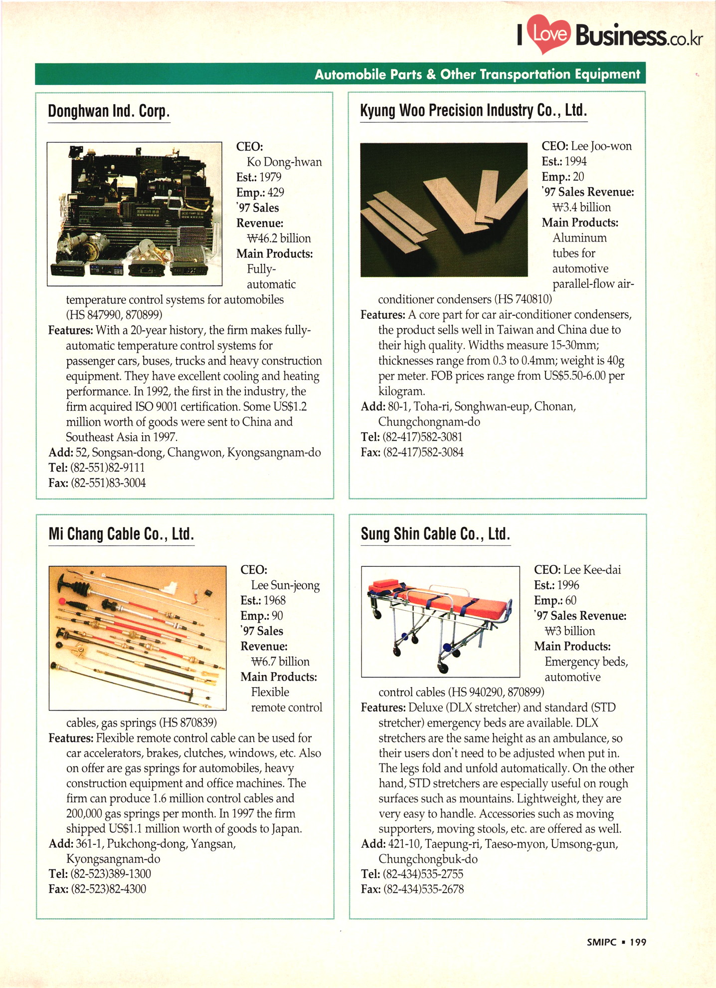 | I Love Business.co.kr small ME www.smallme.co.kr Quality Products from Korea CONTENTS • Metal Products • Machinery ..... Precision Equipment & Instrumentation • Electronic & Electric Products ........ 119 • Automobile Parts & ................... 191 Other Transportation Equipment • Chemical Products • Textile & Leather Products ......... Published on Aug. 5, 1998 by Small & Medium Industry Promotion Corporation (SMIPC) Add: 24-3, Yoido-dong, Yongdungpo-gu, Seoul, Korea Tel: (82-2)769-6841-50 Fax: (82-2)769-6959, 782-9702 E-mail: webmaster@smipc.or.kr URL: http://www.smipc.or.kr http://home.smipc.or.kr • Building Materials · • Household & Misc. Goods ........... Edited by Maekyung Buyers Guide Corp. Add: Trade Center PO Box 8, Seoul, Korea Tel: (82-2)551-2376-90 Fax: (82-2)551-2377, 2383 E-mail: mkbg@buyersguide.co.kr URL: http://www.buyersguide.co.kr Price: W20,000 Love Business Machinery Cutting tools Molds & dies Gears & reducers Material handling equipment Pumps & compressors Valves & fittings Blowers & fans Boilers Heat exchangers Packing M/C Metal working M/C Machine parts Welding M/C Automation equipment Construction equipment Food processing M/C Textile M/C & parts Paper working M/C Printing M/C Plastic processing M/C Semiconductor manufacturing equipment Refrigerators & air handling equipment 'Water treatment equipment Other industrial M/C |