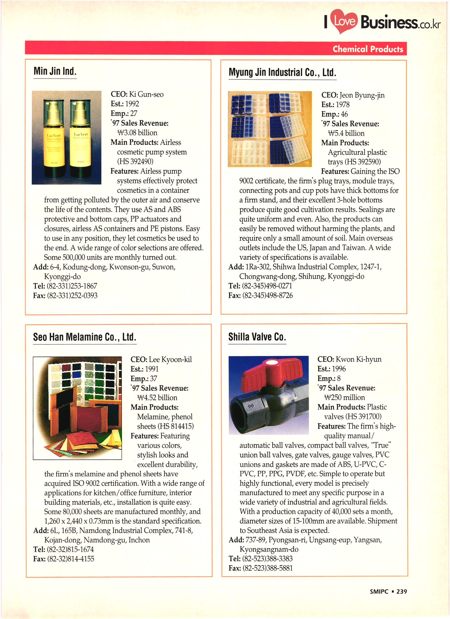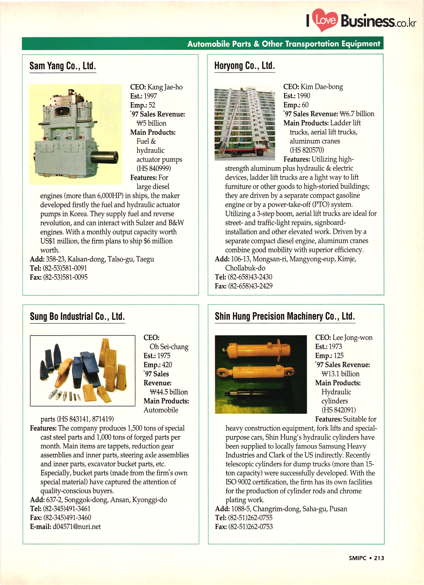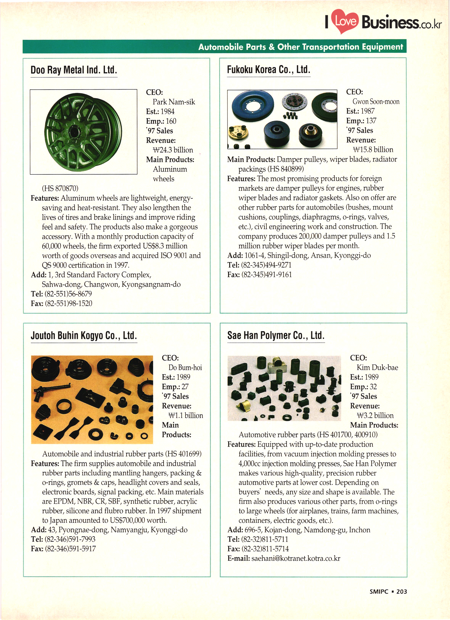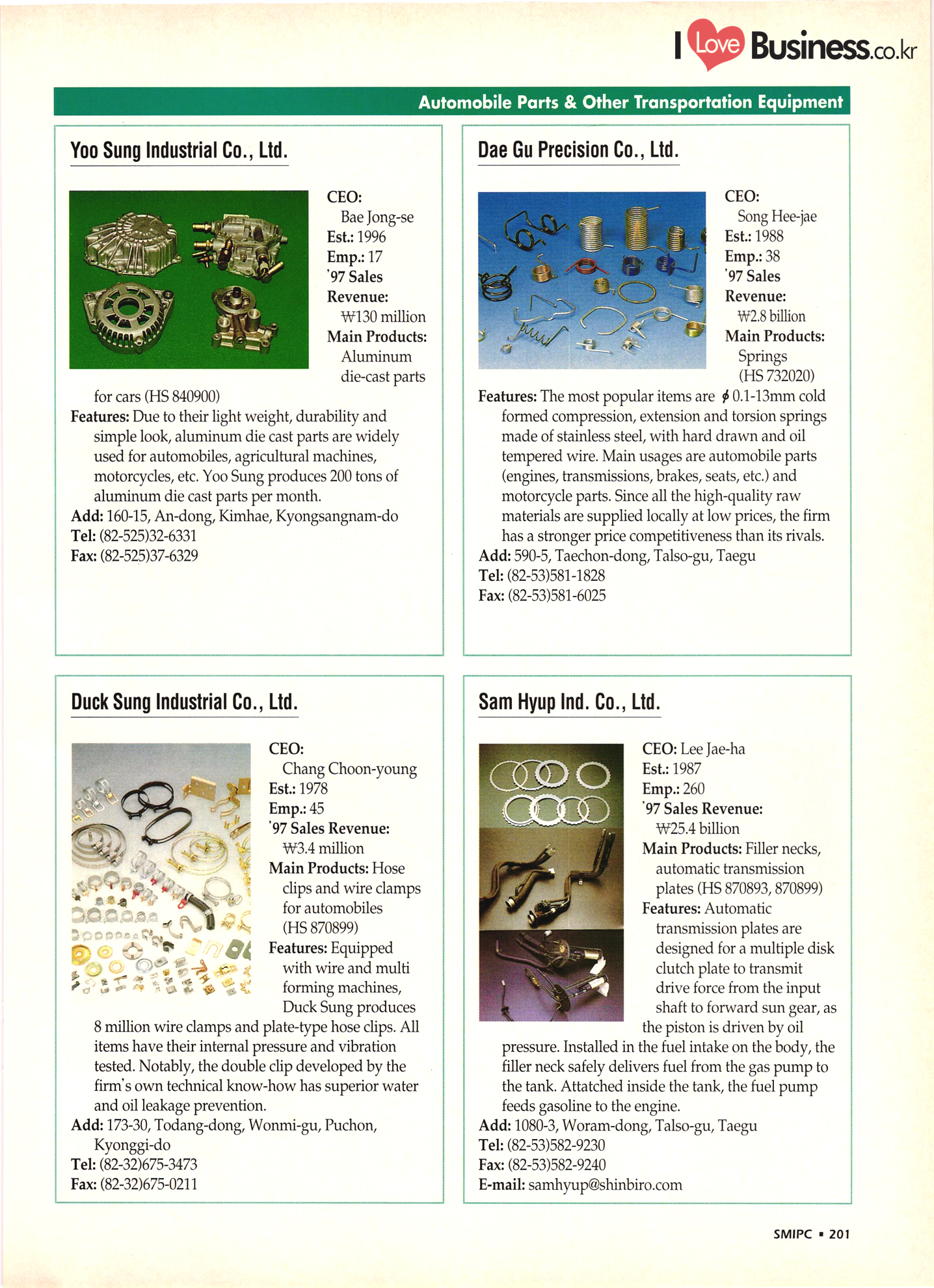 | I Love Business.co.kr small ME www.smallme.co.kr Quality Products from Korea CONTENTS • Metal Products • Machinery ..... Precision Equipment & Instrumentation • Electronic & Electric Products ........ 119 • Automobile Parts & ................... 191 Other Transportation Equipment • Chemical Products • Textile & Leather Products ......... Published on Aug. 5, 1998 by Small & Medium Industry Promotion Corporation (SMIPC) Add: 24-3, Yoido-dong, Yongdungpo-gu, Seoul, Korea Tel: (82-2)769-6841-50 Fax: (82-2)769-6959, 782-9702 E-mail: webmaster@smipc.or.kr URL: http://www.smipc.or.kr http://home.smipc.or.kr • Building Materials · • Household & Misc. Goods ........... Edited by Maekyung Buyers Guide Corp. Add: Trade Center PO Box 8, Seoul, Korea Tel: (82-2)551-2376-90 Fax: (82-2)551-2377, 2383 E-mail: mkbg@buyersguide.co.kr URL: http://www.buyersguide.co.kr Price: W20,000 Love Business Machinery Cutting tools Molds & dies Gears & reducers Material handling equipment Pumps & compressors Valves & fittings Blowers & fans Boilers Heat exchangers Packing M/C Metal working M/C Machine parts Welding M/C Automation equipment Construction equipment Food processing M/C Textile M/C & parts Paper working M/C Printing M/C Plastic processing M/C Semiconductor manufacturing equipment Refrigerators & air handling equipment 'Water treatment equipment Other industrial M/C |
