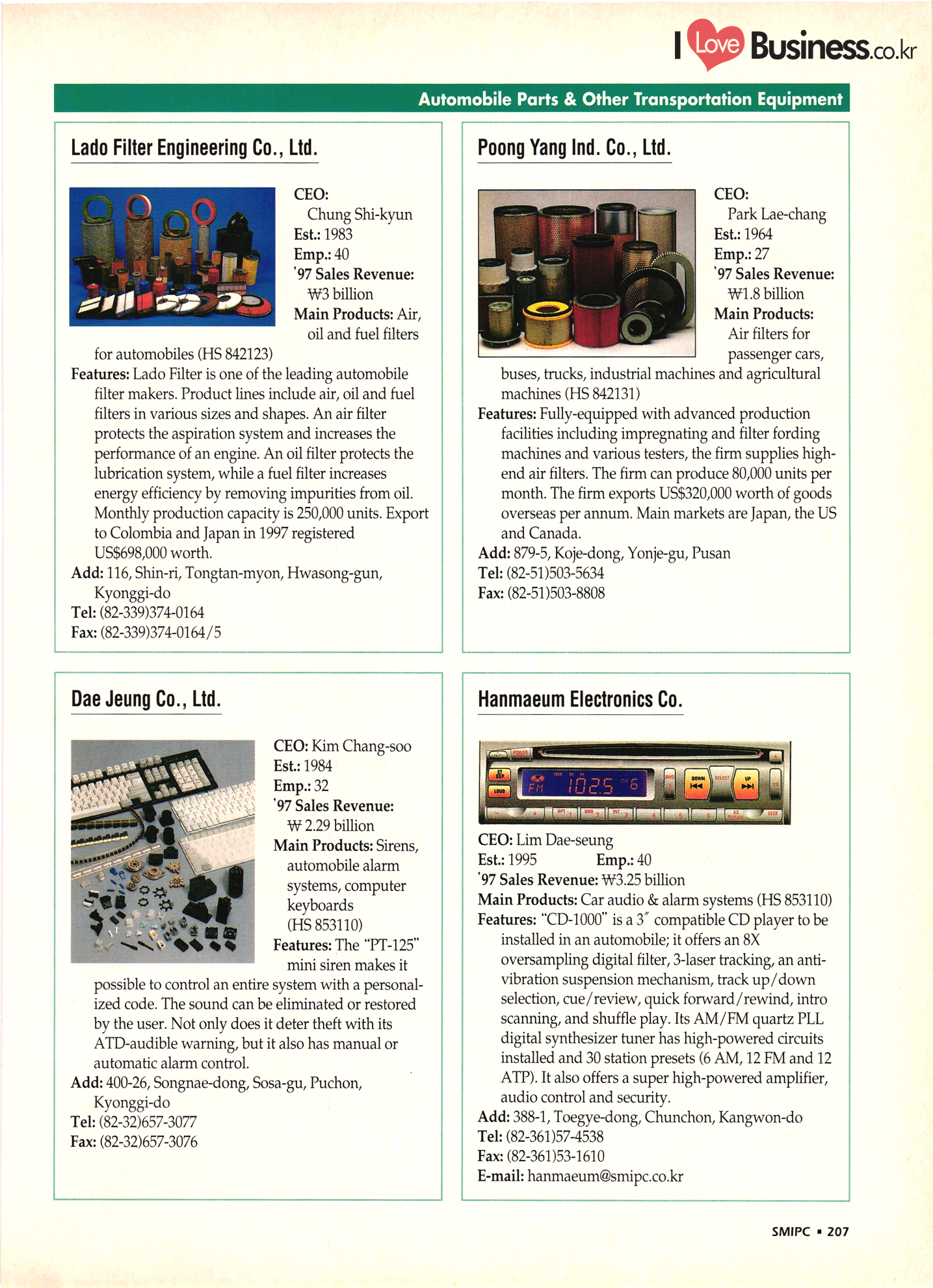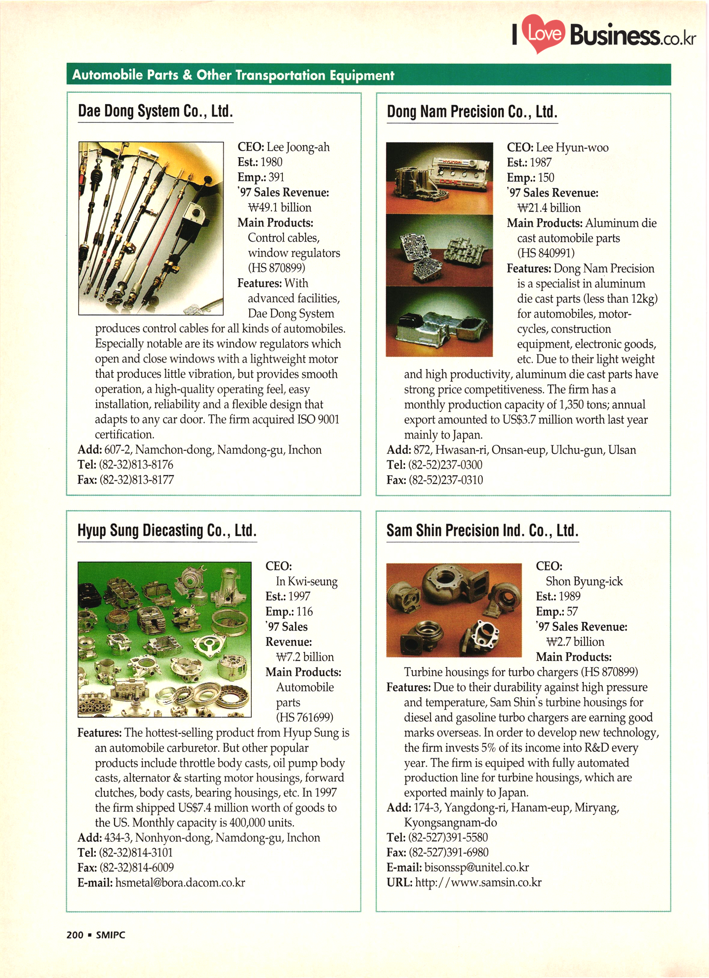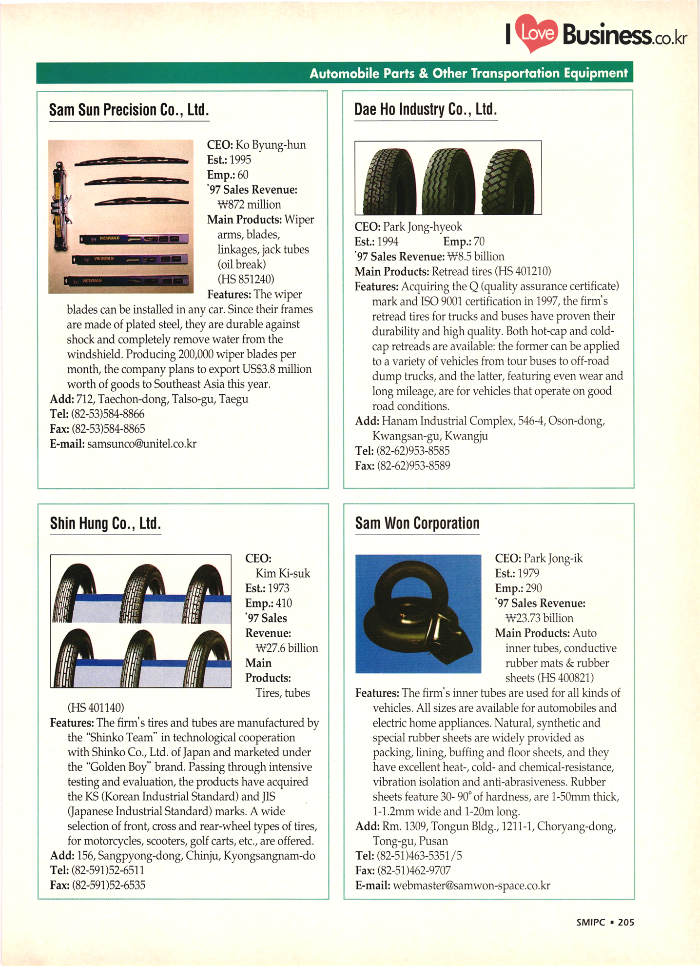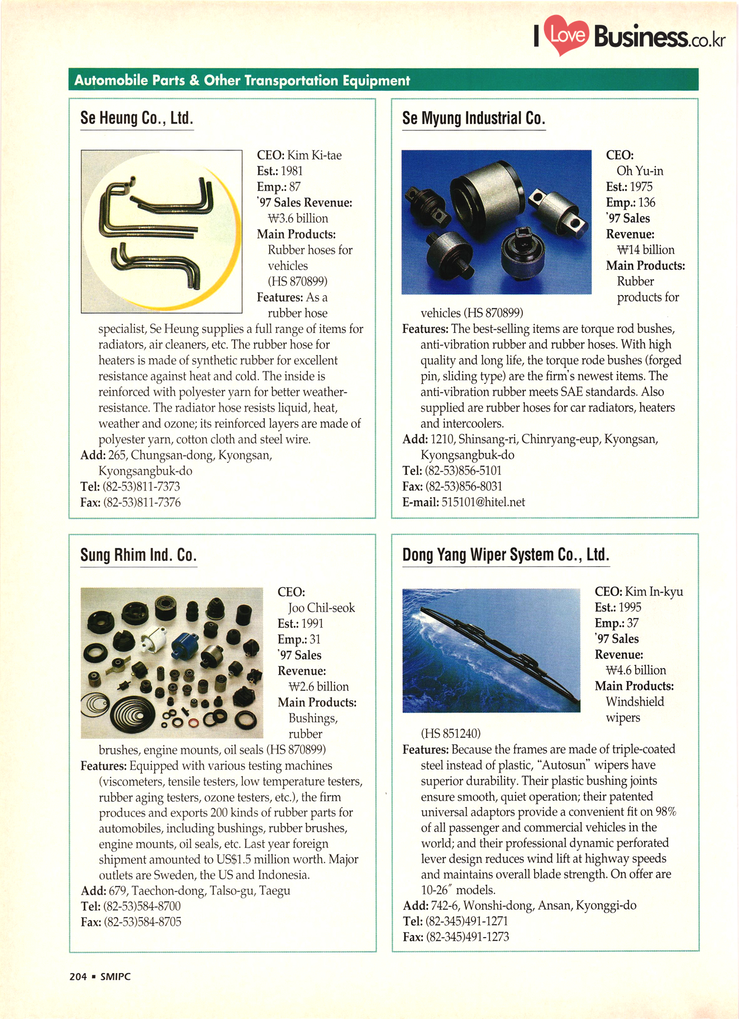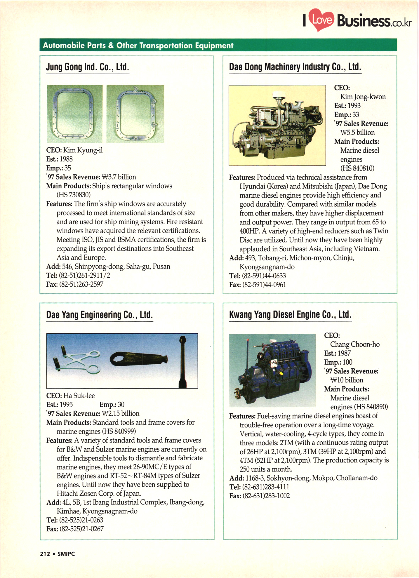 | I Love Business.co.kr small ME www.smallme.co.kr Quality Products from Korea CONTENTS • Metal Products • Machinery ..... Precision Equipment & Instrumentation • Electronic & Electric Products ........ 119 • Automobile Parts & ................... 191 Other Transportation Equipment • Chemical Products • Textile & Leather Products ......... Published on Aug. 5, 1998 by Small & Medium Industry Promotion Corporation (SMIPC) Add: 24-3, Yoido-dong, Yongdungpo-gu, Seoul, Korea Tel: (82-2)769-6841-50 Fax: (82-2)769-6959, 782-9702 E-mail: webmaster@smipc.or.kr URL: http://www.smipc.or.kr http://home.smipc.or.kr • Building Materials · • Household & Misc. Goods ........... Edited by Maekyung Buyers Guide Corp. Add: Trade Center PO Box 8, Seoul, Korea Tel: (82-2)551-2376-90 Fax: (82-2)551-2377, 2383 E-mail: mkbg@buyersguide.co.kr URL: http://www.buyersguide.co.kr Price: W20,000 Love Business Machinery Cutting tools Molds & dies Gears & reducers Material handling equipment Pumps & compressors Valves & fittings Blowers & fans Boilers Heat exchangers Packing M/C Metal working M/C Machine parts Welding M/C Automation equipment Construction equipment Food processing M/C Textile M/C & parts Paper working M/C Printing M/C Plastic processing M/C Semiconductor manufacturing equipment Refrigerators & air handling equipment 'Water treatment equipment Other industrial M/C |