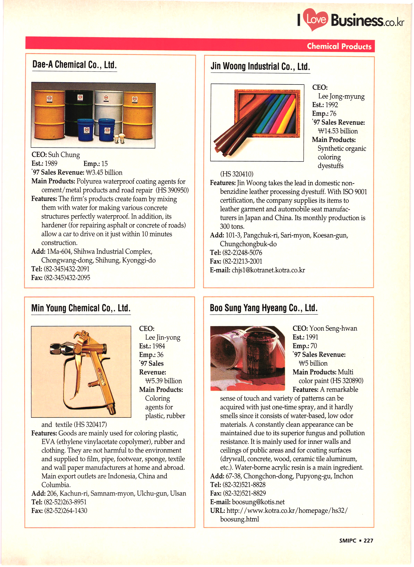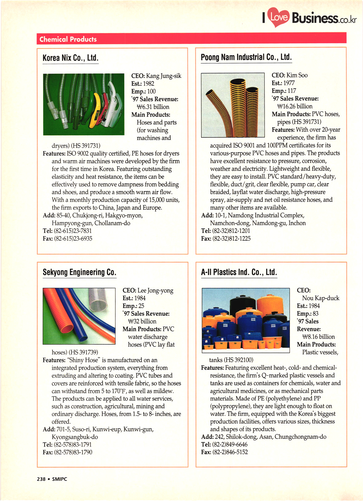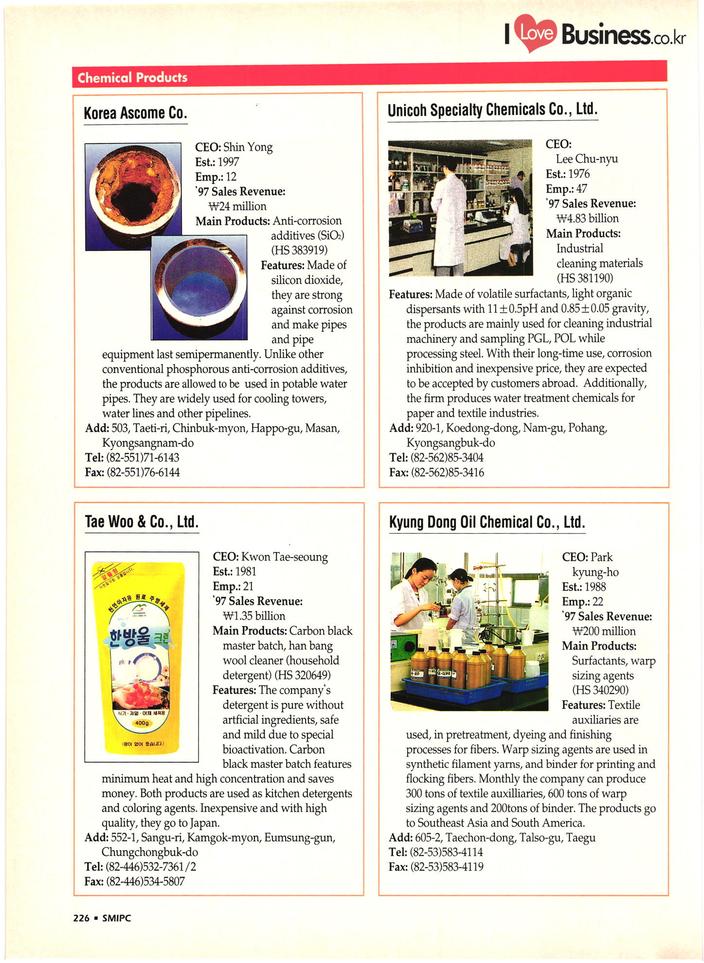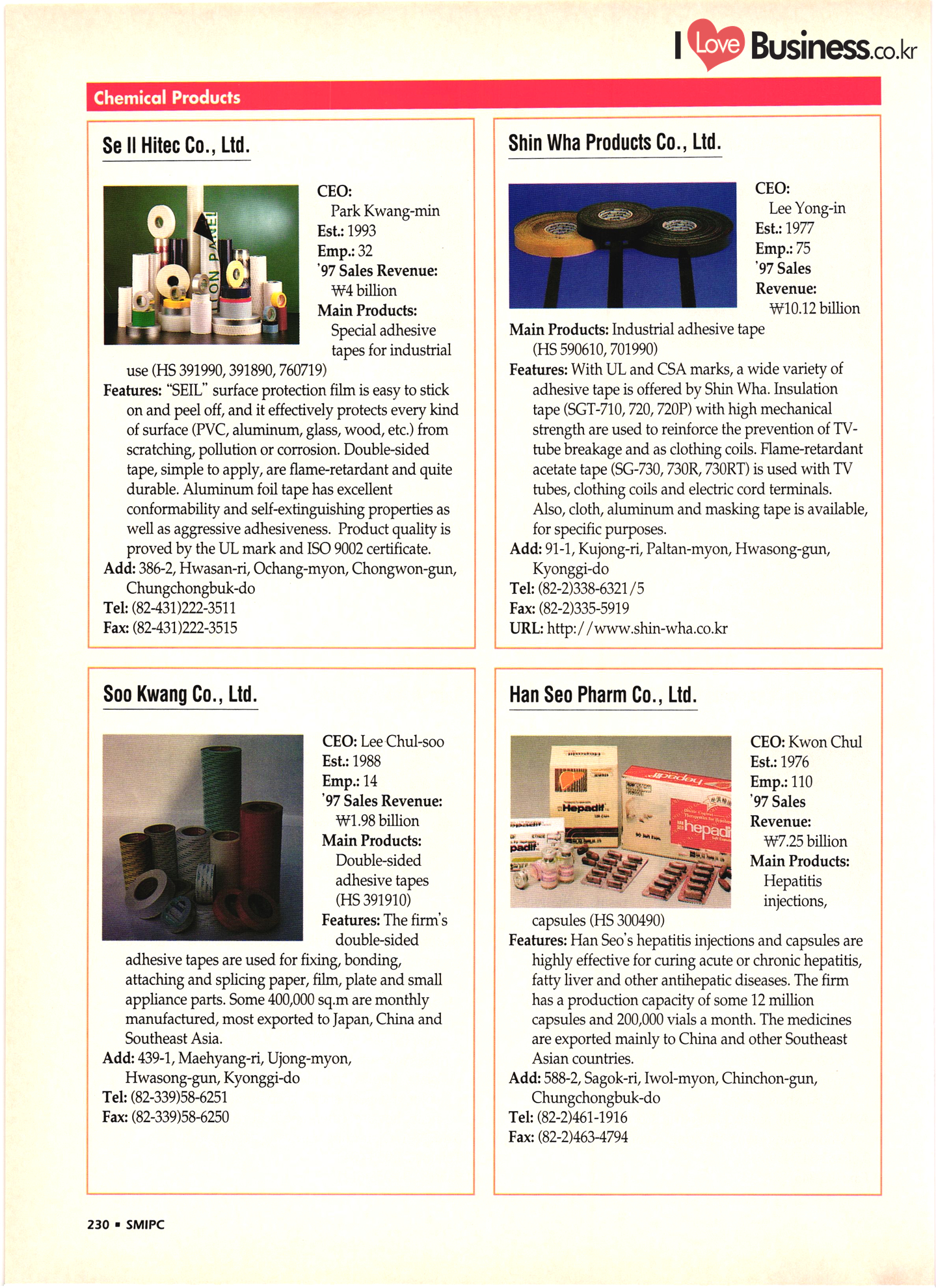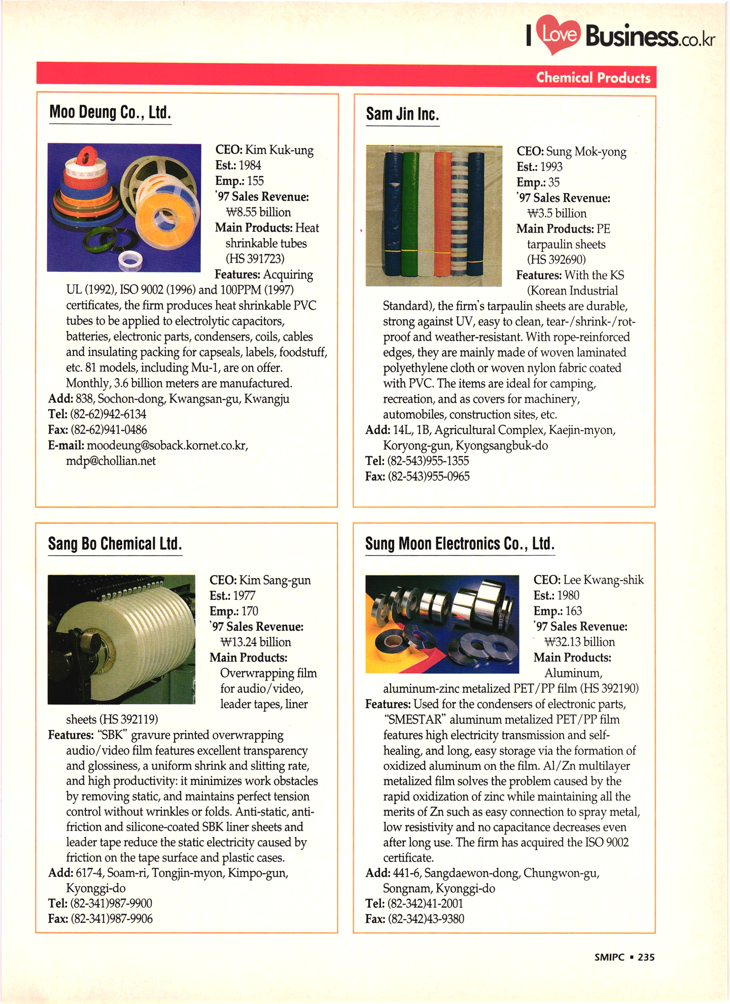 | I Love Business.co.kr small ME www.smallme.co.kr Quality Products from Korea CONTENTS • Metal Products • Machinery ..... Precision Equipment & Instrumentation • Electronic & Electric Products ........ 119 • Automobile Parts & ................... 191 Other Transportation Equipment • Chemical Products • Textile & Leather Products ......... Published on Aug. 5, 1998 by Small & Medium Industry Promotion Corporation (SMIPC) Add: 24-3, Yoido-dong, Yongdungpo-gu, Seoul, Korea Tel: (82-2)769-6841-50 Fax: (82-2)769-6959, 782-9702 E-mail: webmaster@smipc.or.kr URL: http://www.smipc.or.kr http://home.smipc.or.kr • Building Materials · • Household & Misc. Goods ........... Edited by Maekyung Buyers Guide Corp. Add: Trade Center PO Box 8, Seoul, Korea Tel: (82-2)551-2376-90 Fax: (82-2)551-2377, 2383 E-mail: mkbg@buyersguide.co.kr URL: http://www.buyersguide.co.kr Price: W20,000 Love Business Machinery Cutting tools Molds & dies Gears & reducers Material handling equipment Pumps & compressors Valves & fittings Blowers & fans Boilers Heat exchangers Packing M/C Metal working M/C Machine parts Welding M/C Automation equipment Construction equipment Food processing M/C Textile M/C & parts Paper working M/C Printing M/C Plastic processing M/C Semiconductor manufacturing equipment Refrigerators & air handling equipment 'Water treatment equipment Other industrial M/C |