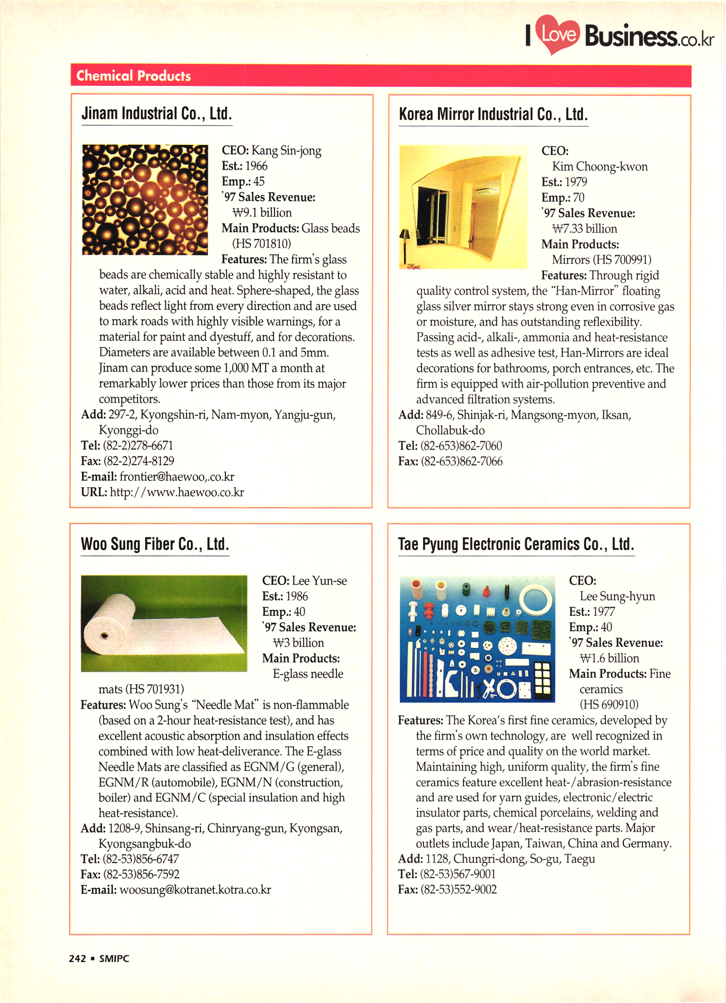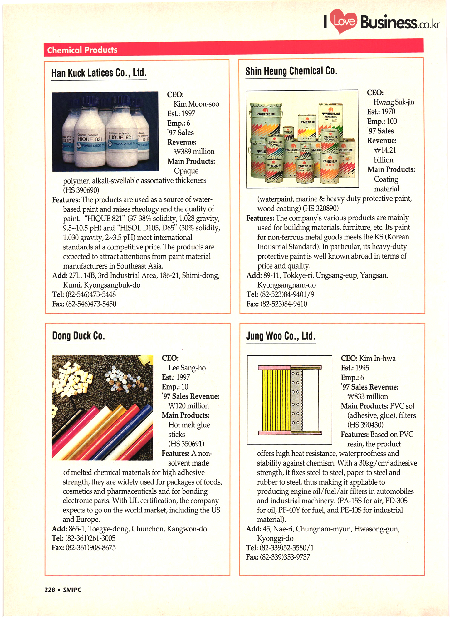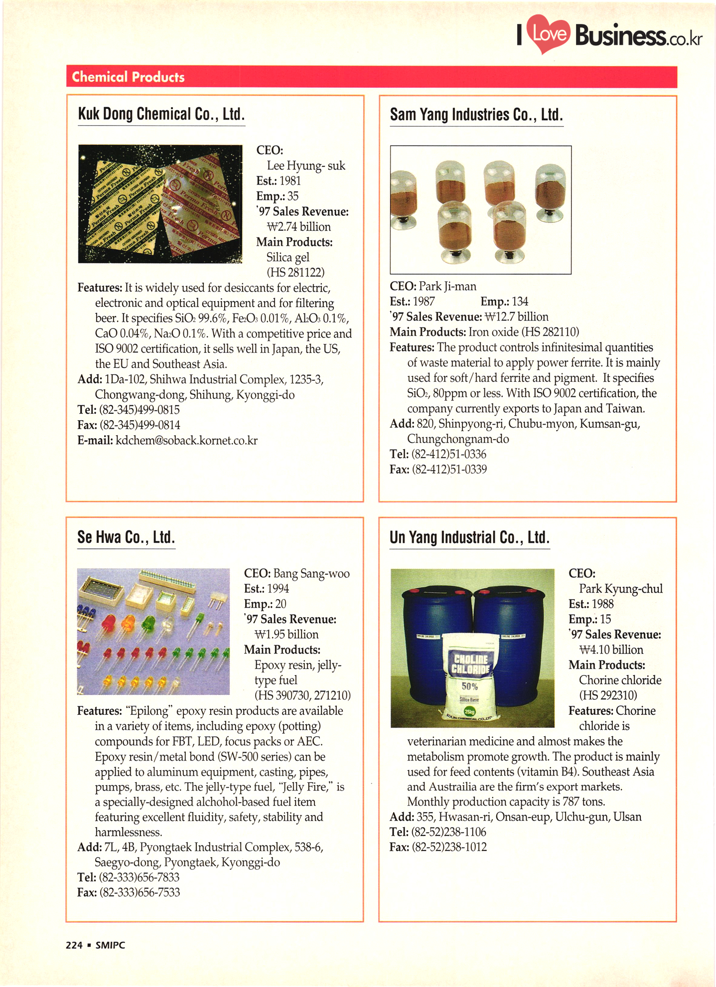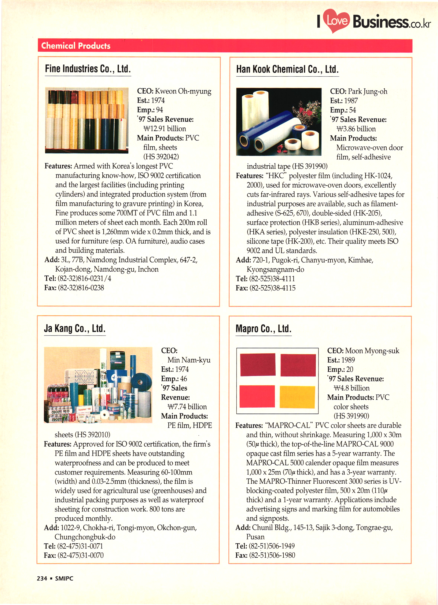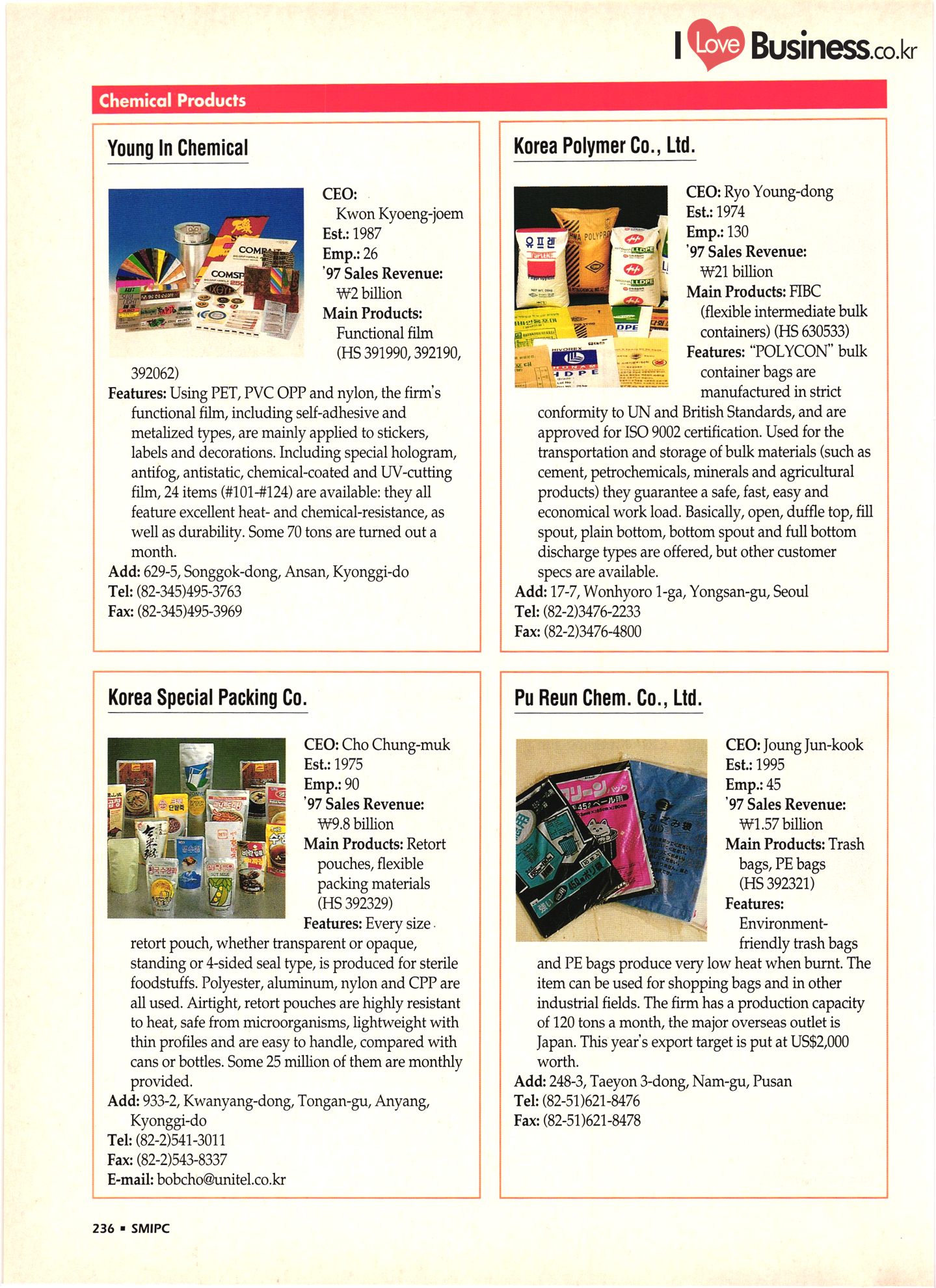 | I Love Business.co.kr small ME www.smallme.co.kr Quality Products from Korea CONTENTS • Metal Products • Machinery ..... Precision Equipment & Instrumentation • Electronic & Electric Products ........ 119 • Automobile Parts & ................... 191 Other Transportation Equipment • Chemical Products • Textile & Leather Products ......... Published on Aug. 5, 1998 by Small & Medium Industry Promotion Corporation (SMIPC) Add: 24-3, Yoido-dong, Yongdungpo-gu, Seoul, Korea Tel: (82-2)769-6841-50 Fax: (82-2)769-6959, 782-9702 E-mail: webmaster@smipc.or.kr URL: http://www.smipc.or.kr http://home.smipc.or.kr • Building Materials · • Household & Misc. Goods ........... Edited by Maekyung Buyers Guide Corp. Add: Trade Center PO Box 8, Seoul, Korea Tel: (82-2)551-2376-90 Fax: (82-2)551-2377, 2383 E-mail: mkbg@buyersguide.co.kr URL: http://www.buyersguide.co.kr Price: W20,000 Love Business Machinery Cutting tools Molds & dies Gears & reducers Material handling equipment Pumps & compressors Valves & fittings Blowers & fans Boilers Heat exchangers Packing M/C Metal working M/C Machine parts Welding M/C Automation equipment Construction equipment Food processing M/C Textile M/C & parts Paper working M/C Printing M/C Plastic processing M/C Semiconductor manufacturing equipment Refrigerators & air handling equipment 'Water treatment equipment Other industrial M/C |