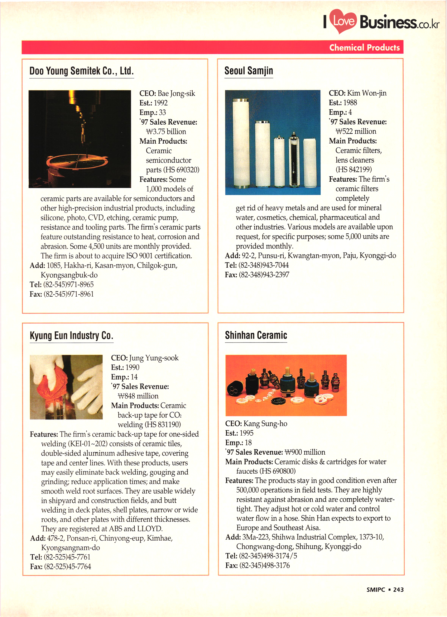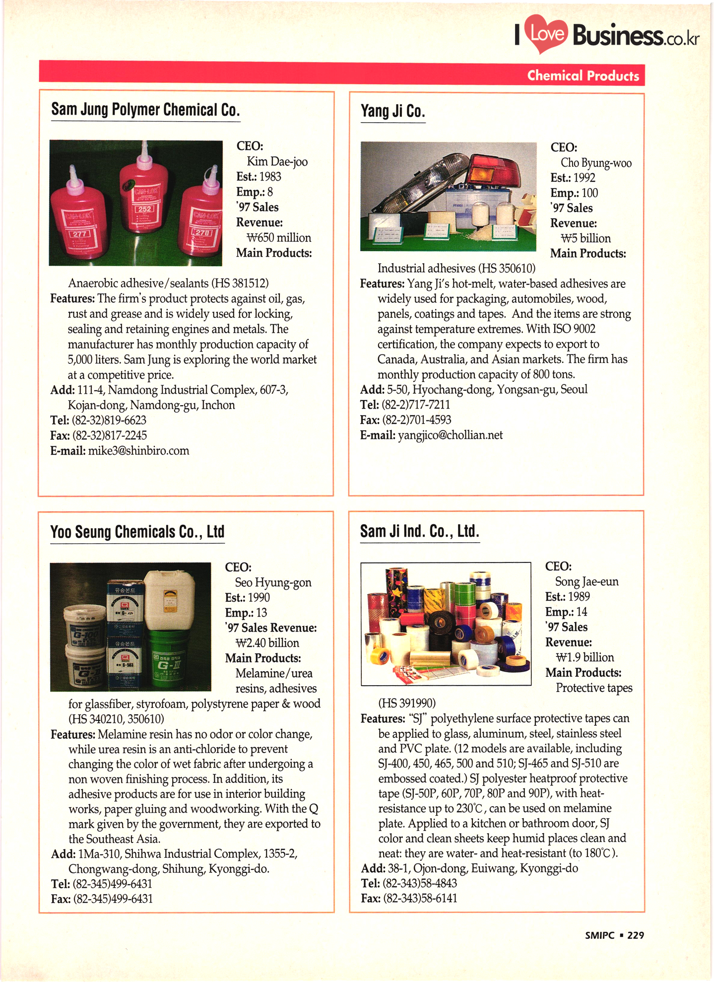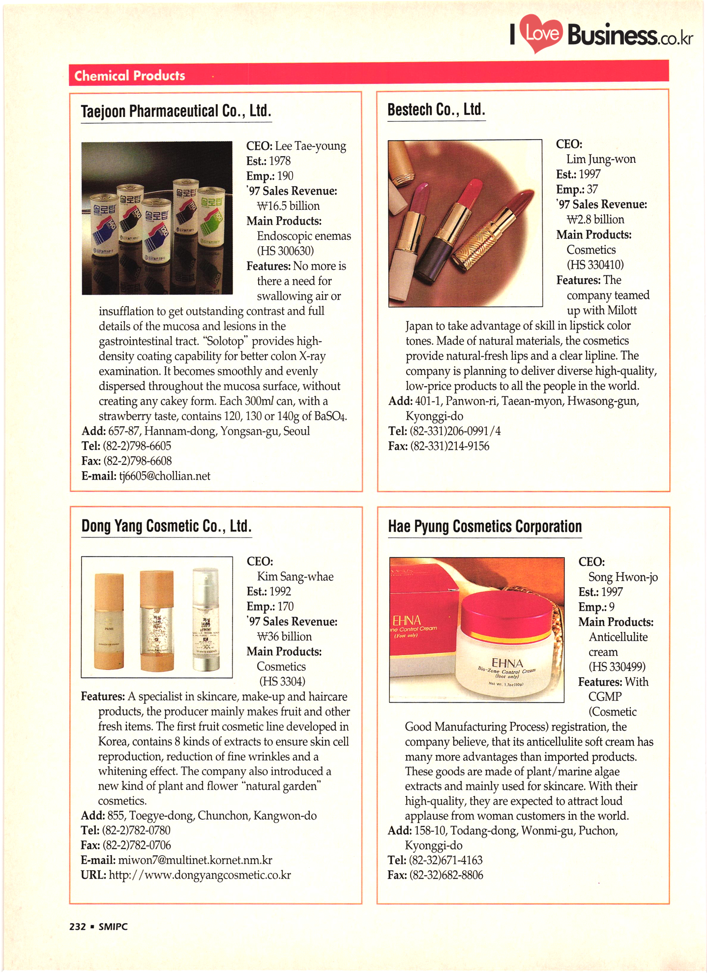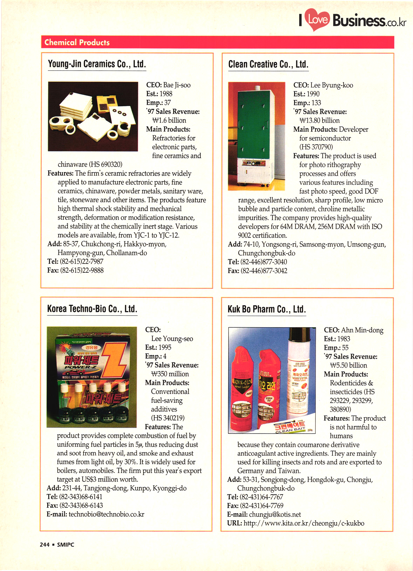 | I Love Business.co.kr small ME www.smallme.co.kr Quality Products from Korea CONTENTS • Metal Products • Machinery ..... Precision Equipment & Instrumentation • Electronic & Electric Products ........ 119 • Automobile Parts & ................... 191 Other Transportation Equipment • Chemical Products • Textile & Leather Products ......... Published on Aug. 5, 1998 by Small & Medium Industry Promotion Corporation (SMIPC) Add: 24-3, Yoido-dong, Yongdungpo-gu, Seoul, Korea Tel: (82-2)769-6841-50 Fax: (82-2)769-6959, 782-9702 E-mail: webmaster@smipc.or.kr URL: http://www.smipc.or.kr http://home.smipc.or.kr • Building Materials · • Household & Misc. Goods ........... Edited by Maekyung Buyers Guide Corp. Add: Trade Center PO Box 8, Seoul, Korea Tel: (82-2)551-2376-90 Fax: (82-2)551-2377, 2383 E-mail: mkbg@buyersguide.co.kr URL: http://www.buyersguide.co.kr Price: W20,000 Love Business Machinery Cutting tools Molds & dies Gears & reducers Material handling equipment Pumps & compressors Valves & fittings Blowers & fans Boilers Heat exchangers Packing M/C Metal working M/C Machine parts Welding M/C Automation equipment Construction equipment Food processing M/C Textile M/C & parts Paper working M/C Printing M/C Plastic processing M/C Semiconductor manufacturing equipment Refrigerators & air handling equipment 'Water treatment equipment Other industrial M/C |