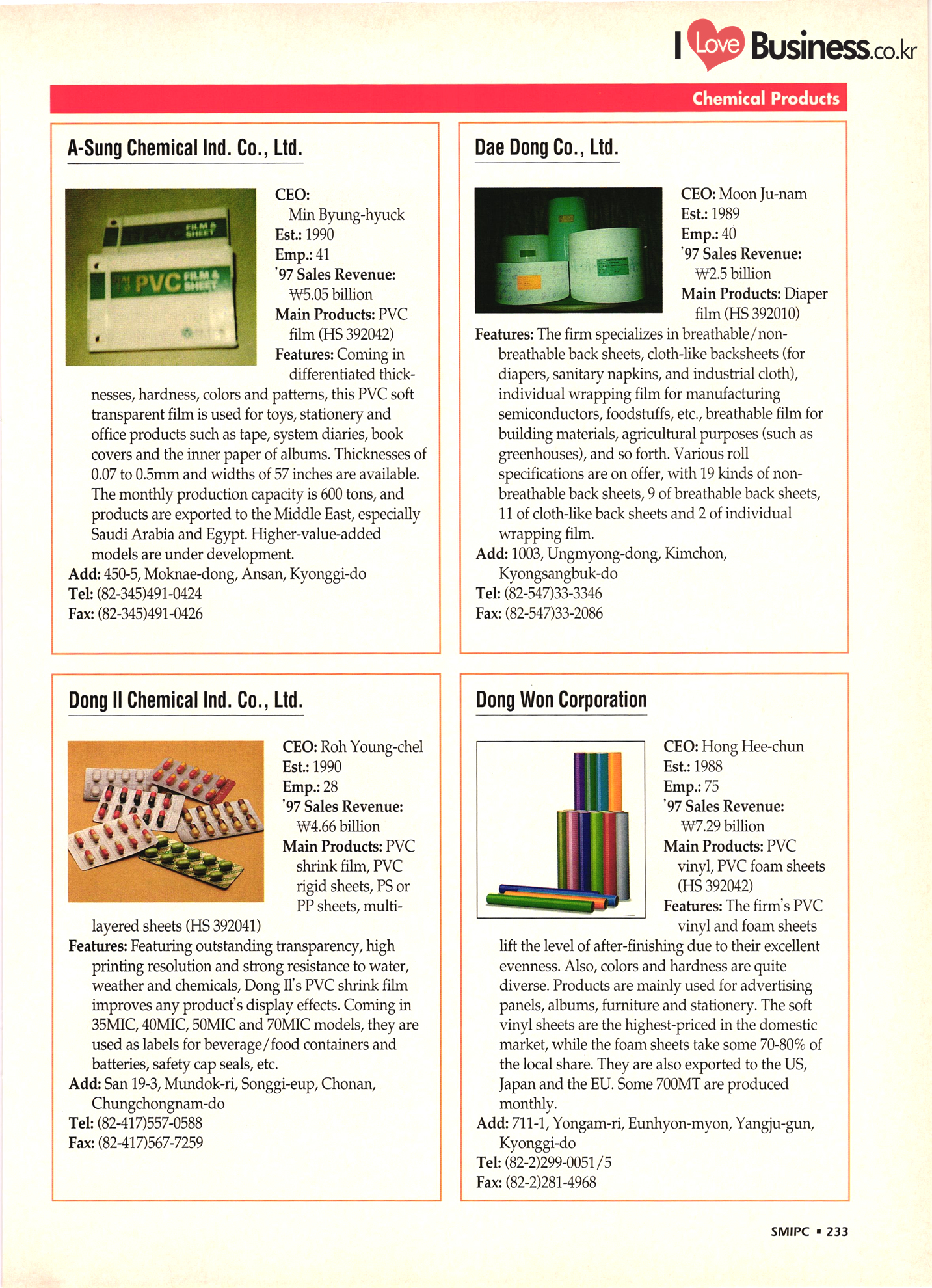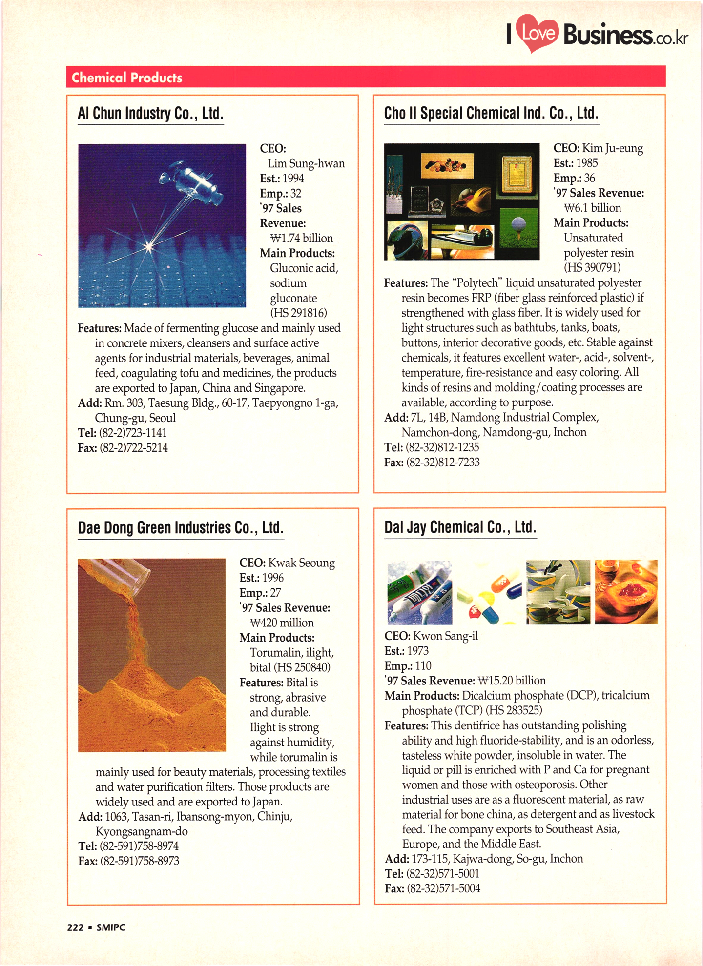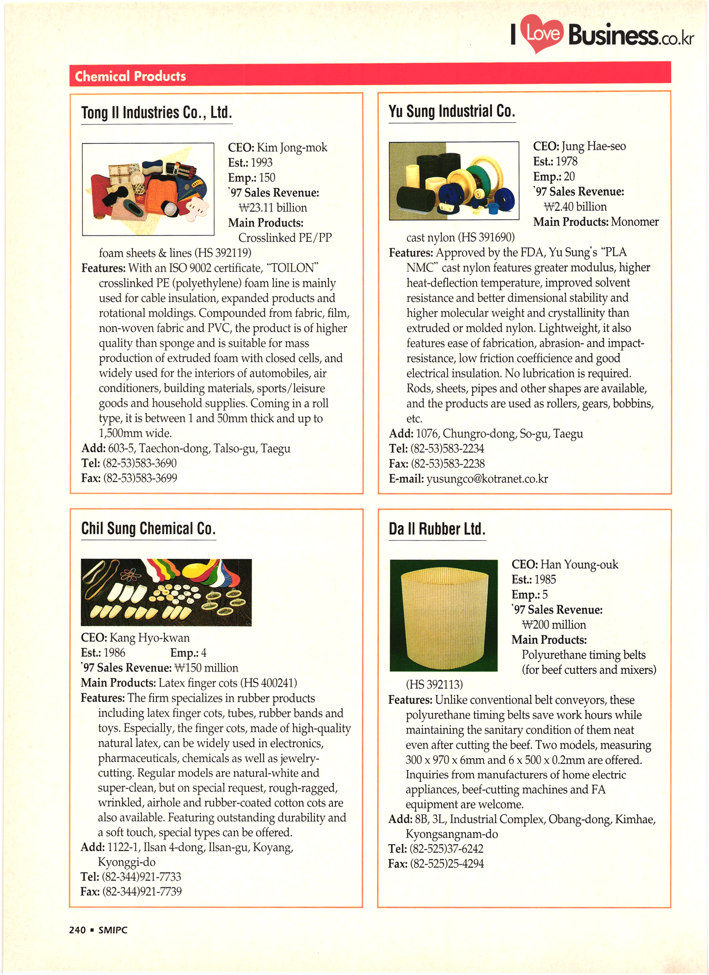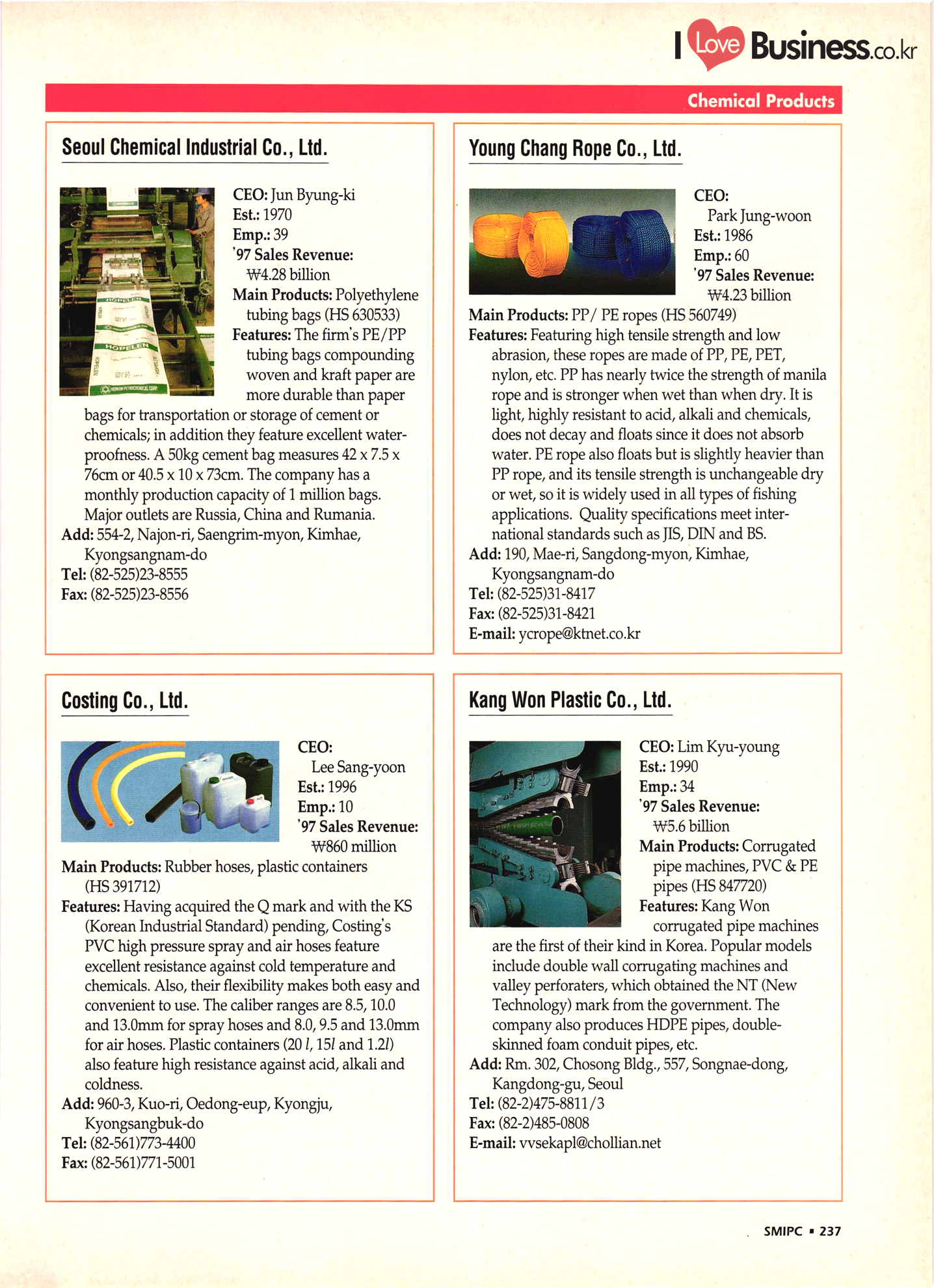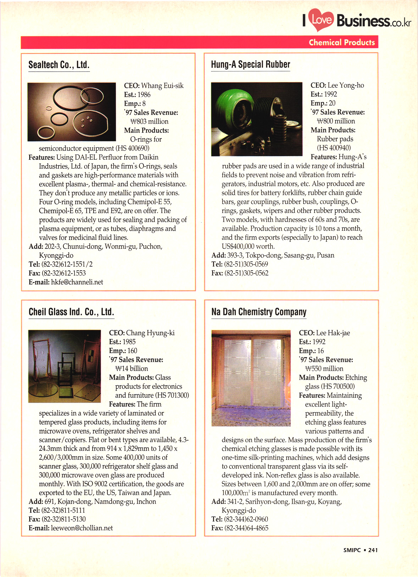 | I Love Business.co.kr small ME www.smallme.co.kr Quality Products from Korea CONTENTS • Metal Products • Machinery ..... Precision Equipment & Instrumentation • Electronic & Electric Products ........ 119 • Automobile Parts & ................... 191 Other Transportation Equipment • Chemical Products • Textile & Leather Products ......... Published on Aug. 5, 1998 by Small & Medium Industry Promotion Corporation (SMIPC) Add: 24-3, Yoido-dong, Yongdungpo-gu, Seoul, Korea Tel: (82-2)769-6841-50 Fax: (82-2)769-6959, 782-9702 E-mail: webmaster@smipc.or.kr URL: http://www.smipc.or.kr http://home.smipc.or.kr • Building Materials · • Household & Misc. Goods ........... Edited by Maekyung Buyers Guide Corp. Add: Trade Center PO Box 8, Seoul, Korea Tel: (82-2)551-2376-90 Fax: (82-2)551-2377, 2383 E-mail: mkbg@buyersguide.co.kr URL: http://www.buyersguide.co.kr Price: W20,000 Love Business Machinery Cutting tools Molds & dies Gears & reducers Material handling equipment Pumps & compressors Valves & fittings Blowers & fans Boilers Heat exchangers Packing M/C Metal working M/C Machine parts Welding M/C Automation equipment Construction equipment Food processing M/C Textile M/C & parts Paper working M/C Printing M/C Plastic processing M/C Semiconductor manufacturing equipment Refrigerators & air handling equipment 'Water treatment equipment Other industrial M/C |