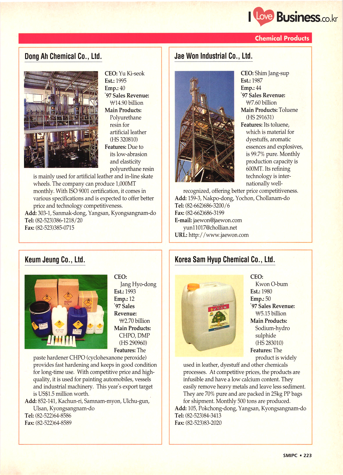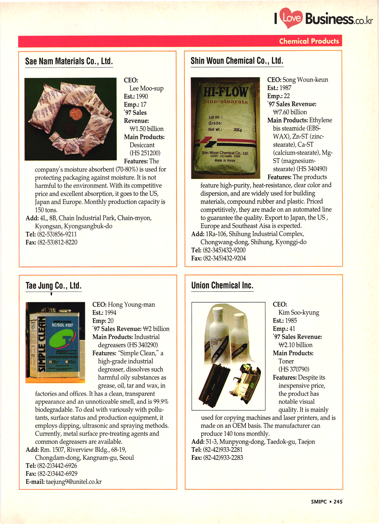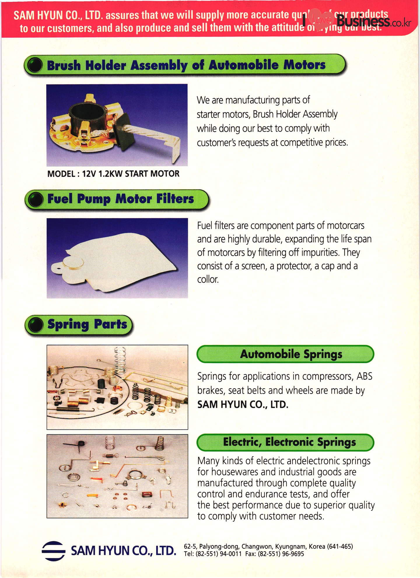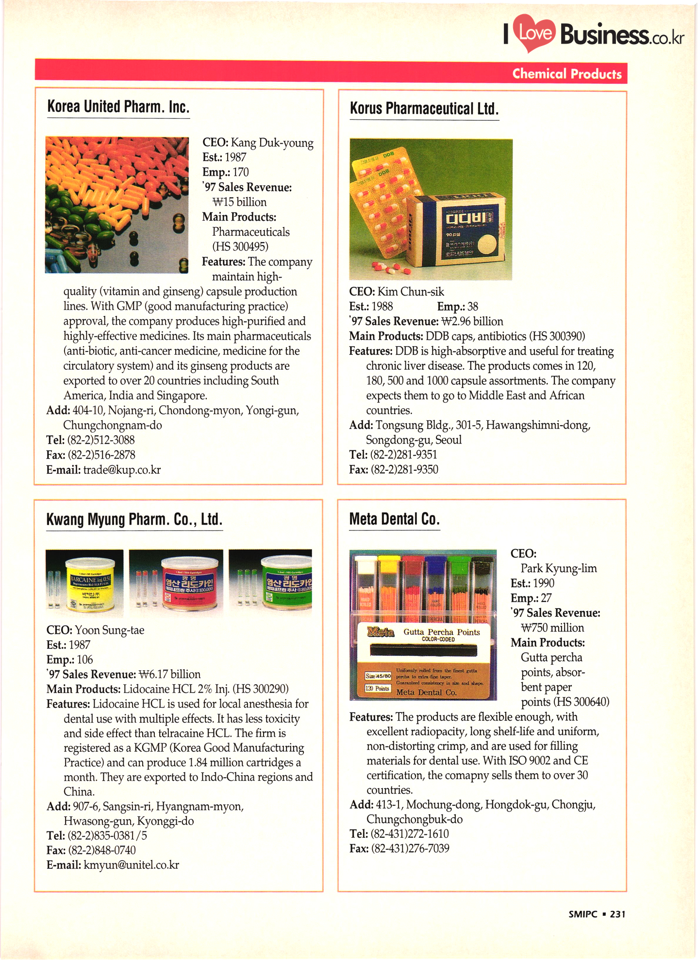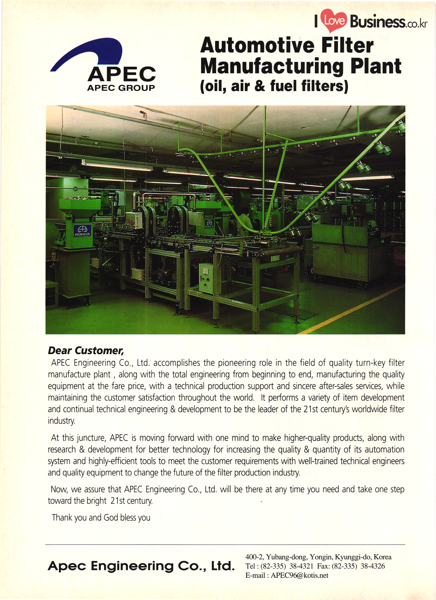 | I Love Business.co.kr small ME www.smallme.co.kr Quality Products from Korea CONTENTS • Metal Products • Machinery ..... Precision Equipment & Instrumentation • Electronic & Electric Products ........ 119 • Automobile Parts & ................... 191 Other Transportation Equipment • Chemical Products • Textile & Leather Products ......... Published on Aug. 5, 1998 by Small & Medium Industry Promotion Corporation (SMIPC) Add: 24-3, Yoido-dong, Yongdungpo-gu, Seoul, Korea Tel: (82-2)769-6841-50 Fax: (82-2)769-6959, 782-9702 E-mail: webmaster@smipc.or.kr URL: http://www.smipc.or.kr http://home.smipc.or.kr • Building Materials · • Household & Misc. Goods ........... Edited by Maekyung Buyers Guide Corp. Add: Trade Center PO Box 8, Seoul, Korea Tel: (82-2)551-2376-90 Fax: (82-2)551-2377, 2383 E-mail: mkbg@buyersguide.co.kr URL: http://www.buyersguide.co.kr Price: W20,000 Love Business Machinery Cutting tools Molds & dies Gears & reducers Material handling equipment Pumps & compressors Valves & fittings Blowers & fans Boilers Heat exchangers Packing M/C Metal working M/C Machine parts Welding M/C Automation equipment Construction equipment Food processing M/C Textile M/C & parts Paper working M/C Printing M/C Plastic processing M/C Semiconductor manufacturing equipment Refrigerators & air handling equipment 'Water treatment equipment Other industrial M/C |