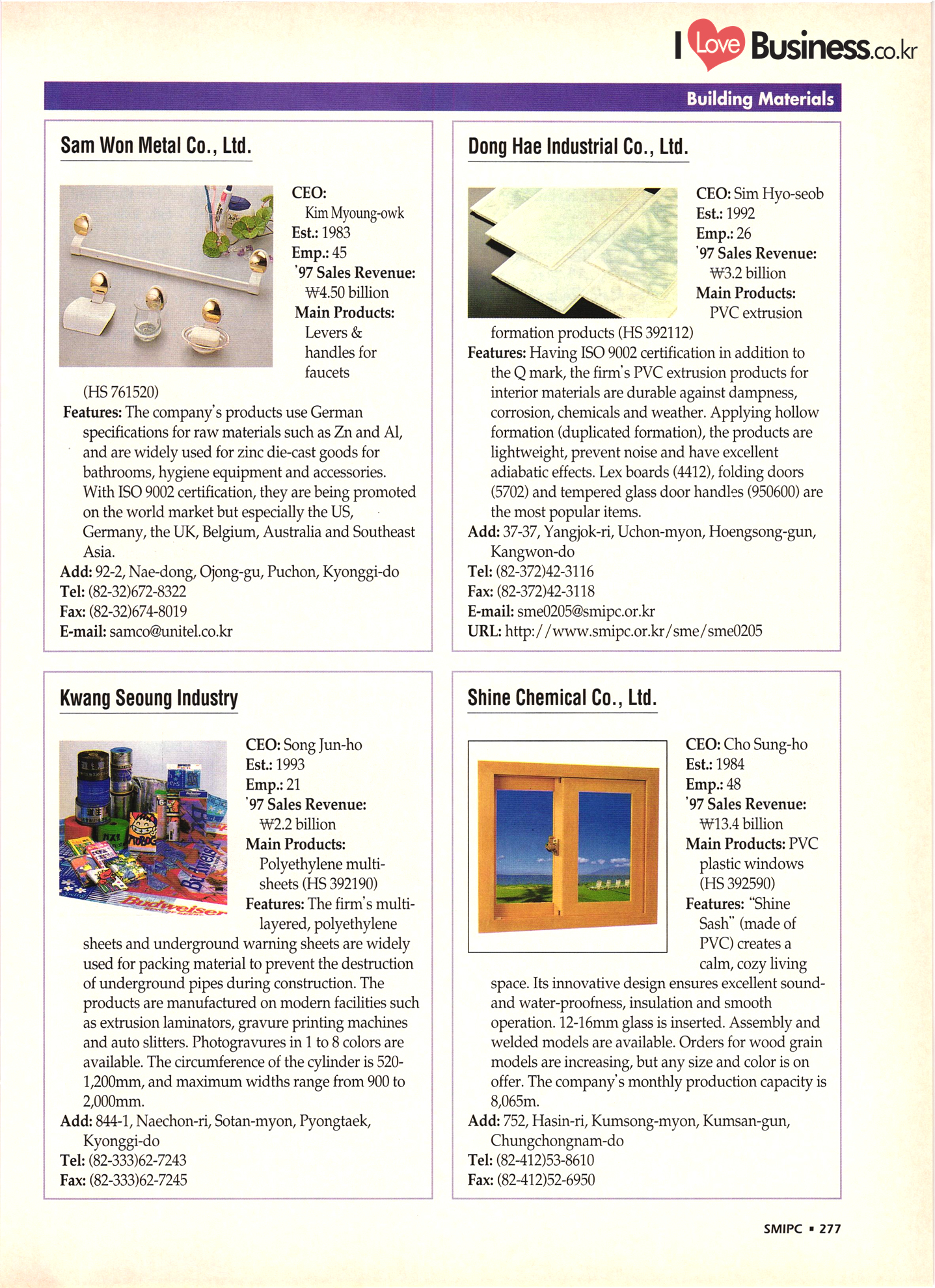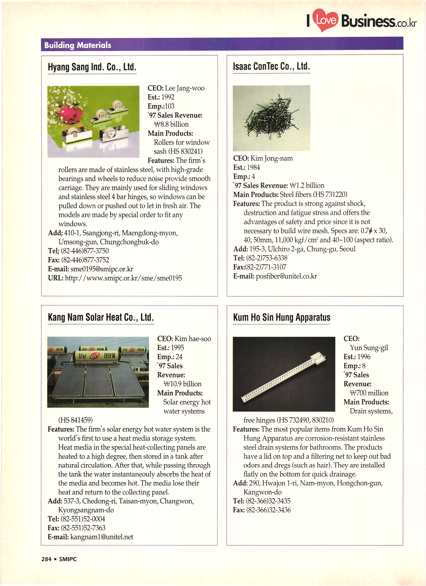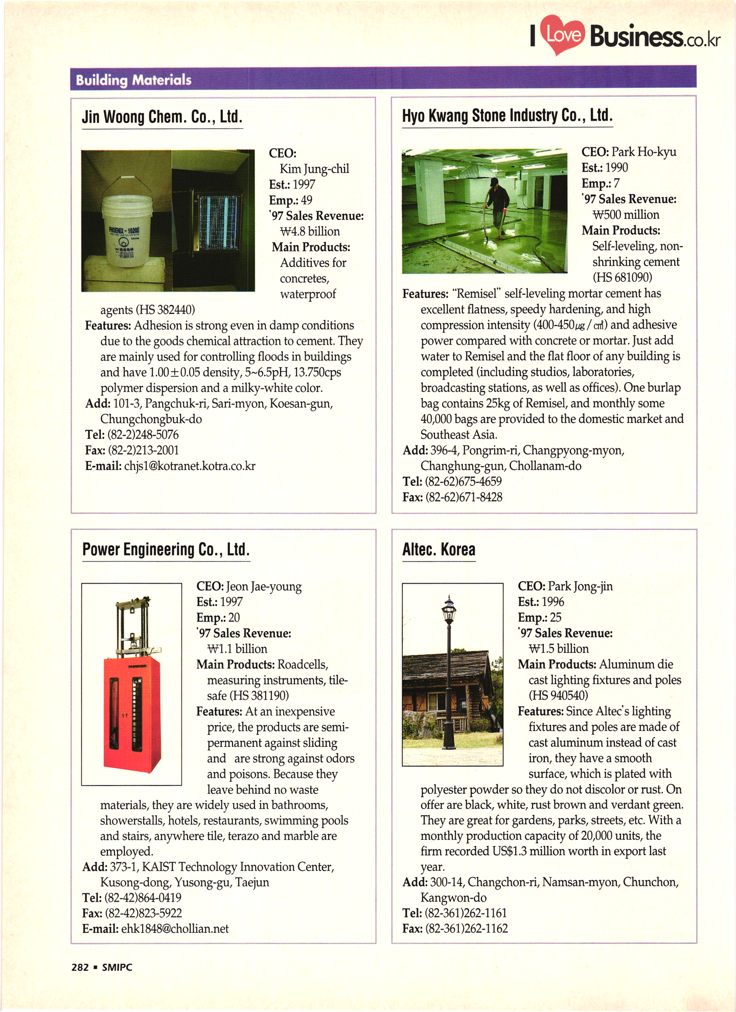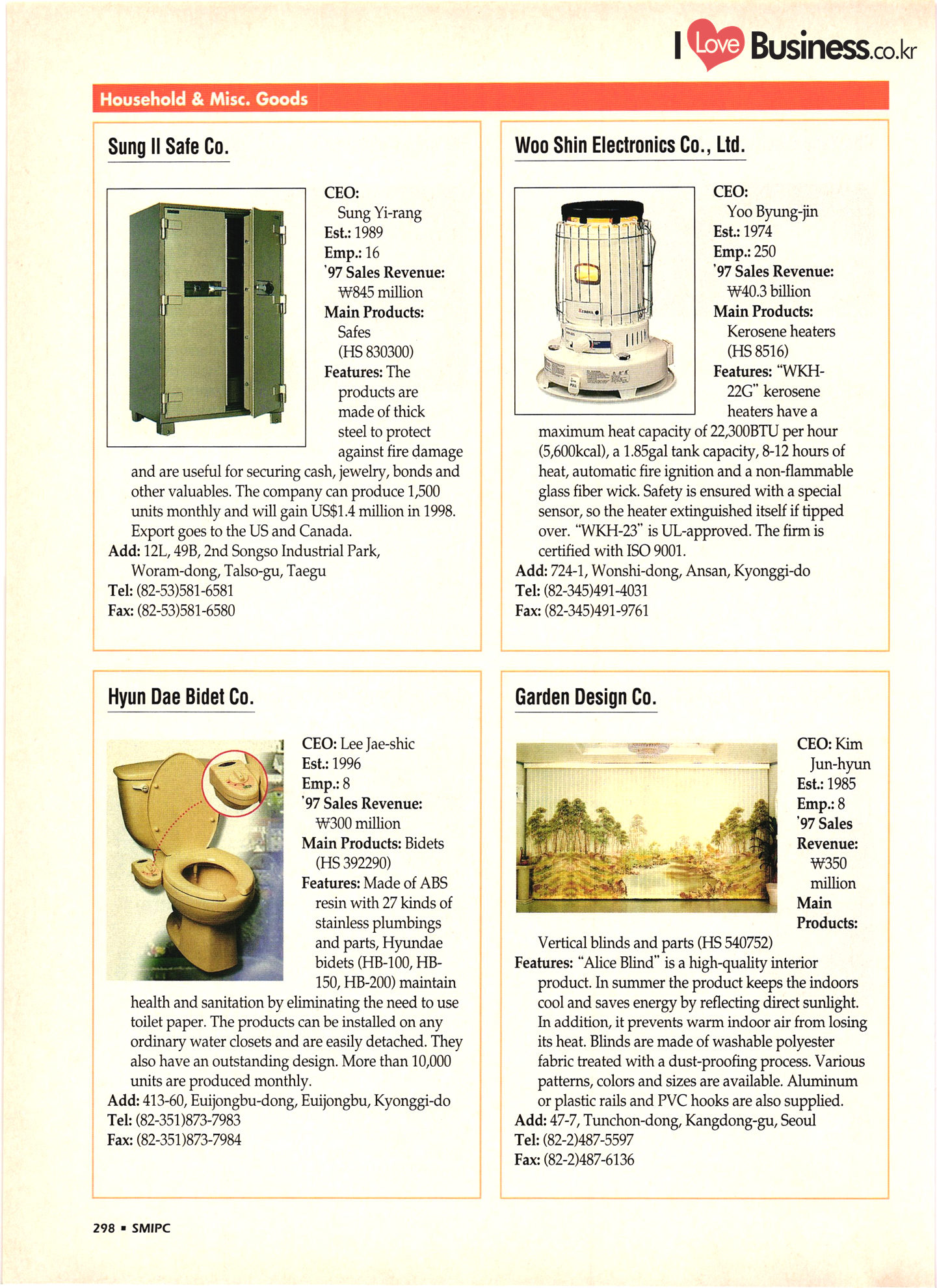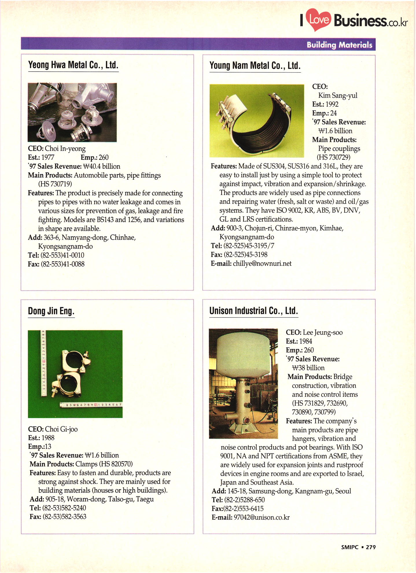 | I Love Business.co.kr small ME www.smallme.co.kr Quality Products from Korea CONTENTS • Metal Products • Machinery ..... Precision Equipment & Instrumentation • Electronic & Electric Products ........ 119 • Automobile Parts & ................... 191 Other Transportation Equipment • Chemical Products • Textile & Leather Products ......... Published on Aug. 5, 1998 by Small & Medium Industry Promotion Corporation (SMIPC) Add: 24-3, Yoido-dong, Yongdungpo-gu, Seoul, Korea Tel: (82-2)769-6841-50 Fax: (82-2)769-6959, 782-9702 E-mail: webmaster@smipc.or.kr URL: http://www.smipc.or.kr http://home.smipc.or.kr • Building Materials · • Household & Misc. Goods ........... Edited by Maekyung Buyers Guide Corp. Add: Trade Center PO Box 8, Seoul, Korea Tel: (82-2)551-2376-90 Fax: (82-2)551-2377, 2383 E-mail: mkbg@buyersguide.co.kr URL: http://www.buyersguide.co.kr Price: W20,000 Love Business Machinery Cutting tools Molds & dies Gears & reducers Material handling equipment Pumps & compressors Valves & fittings Blowers & fans Boilers Heat exchangers Packing M/C Metal working M/C Machine parts Welding M/C Automation equipment Construction equipment Food processing M/C Textile M/C & parts Paper working M/C Printing M/C Plastic processing M/C Semiconductor manufacturing equipment Refrigerators & air handling equipment 'Water treatment equipment Other industrial M/C |