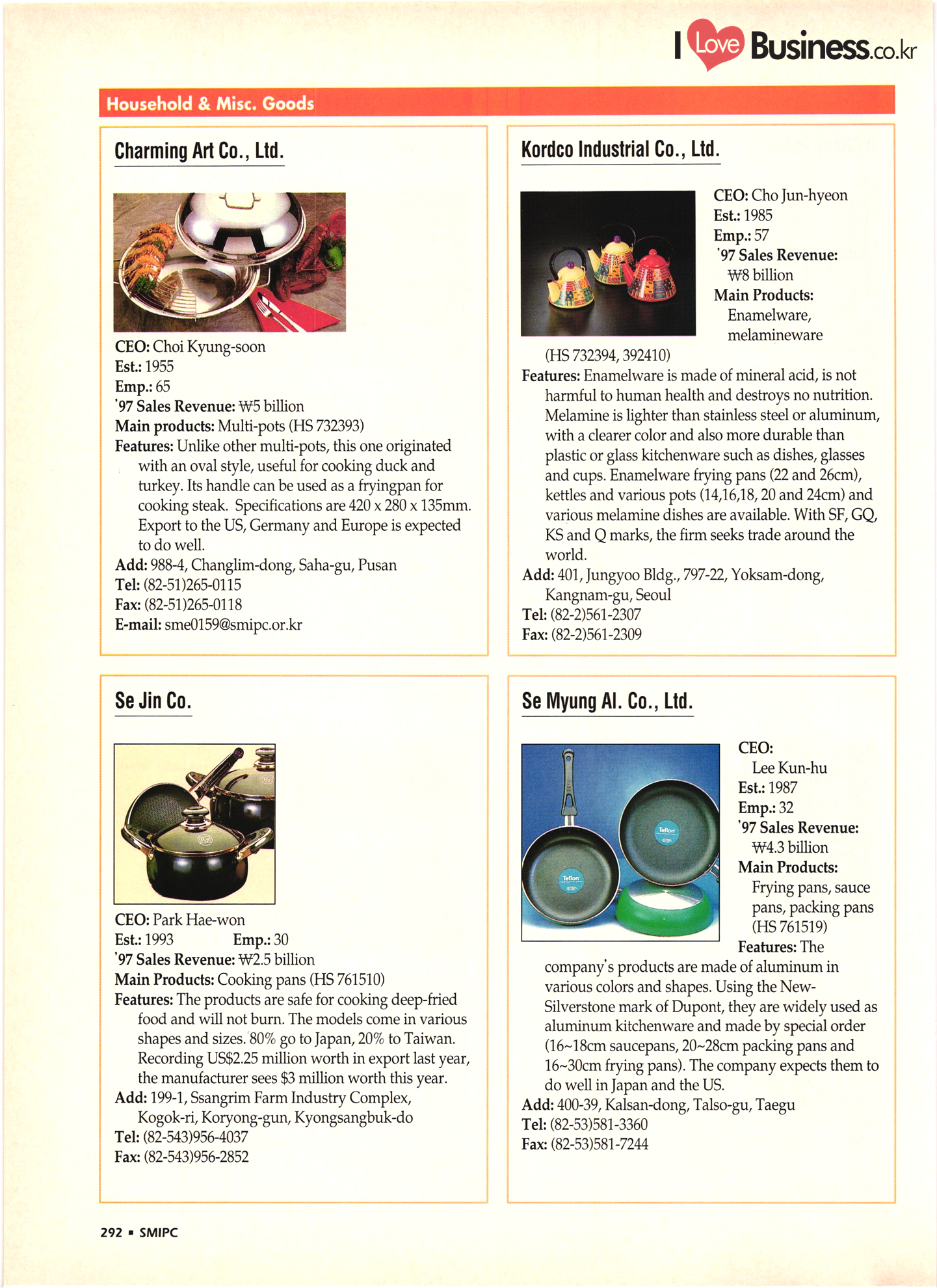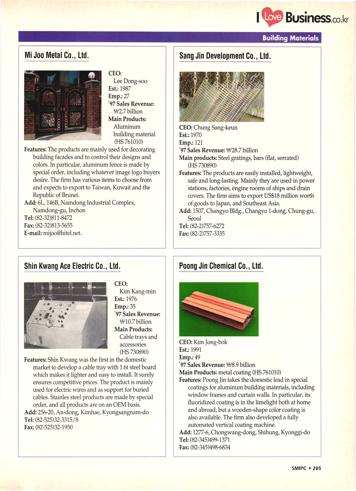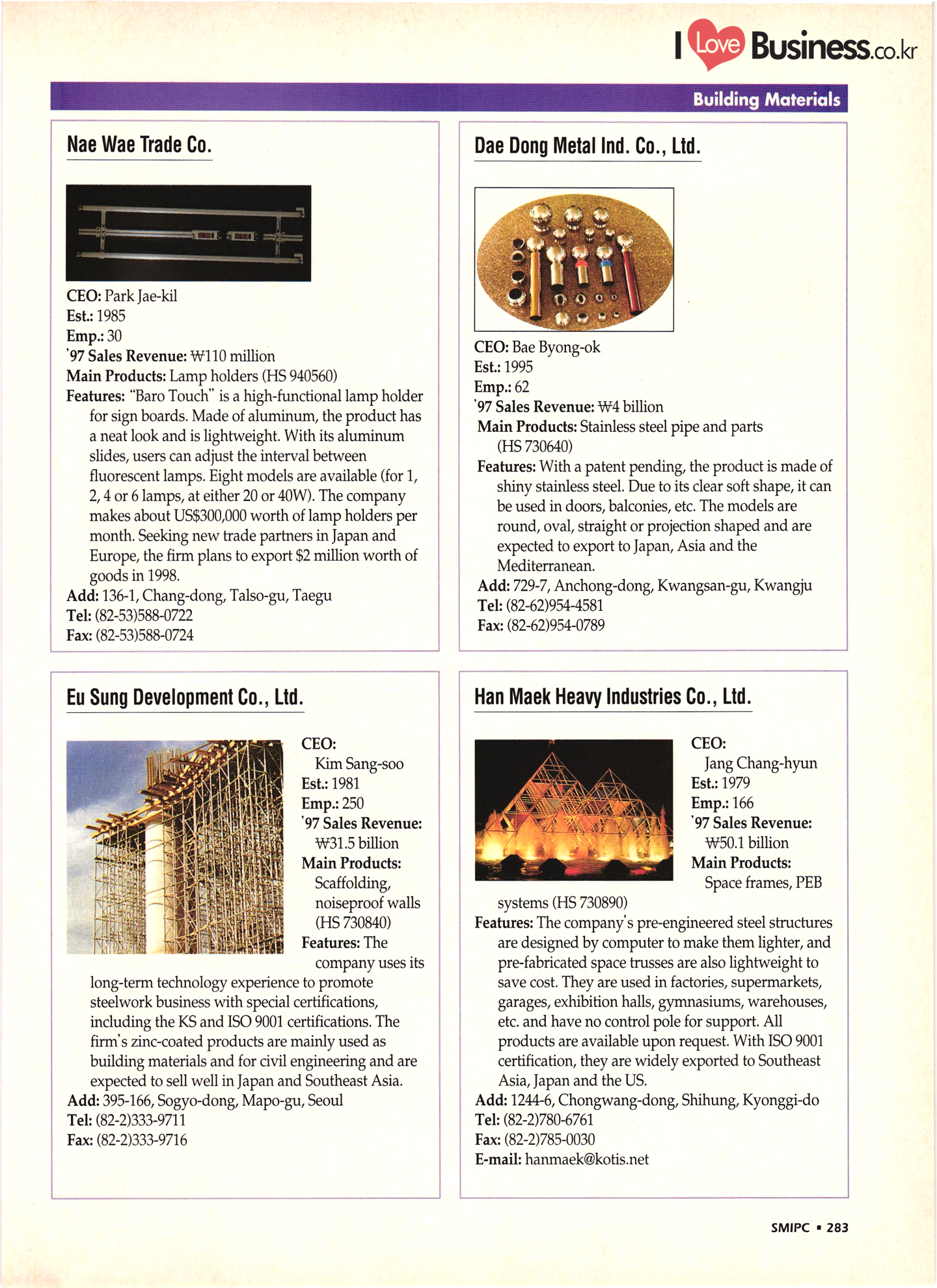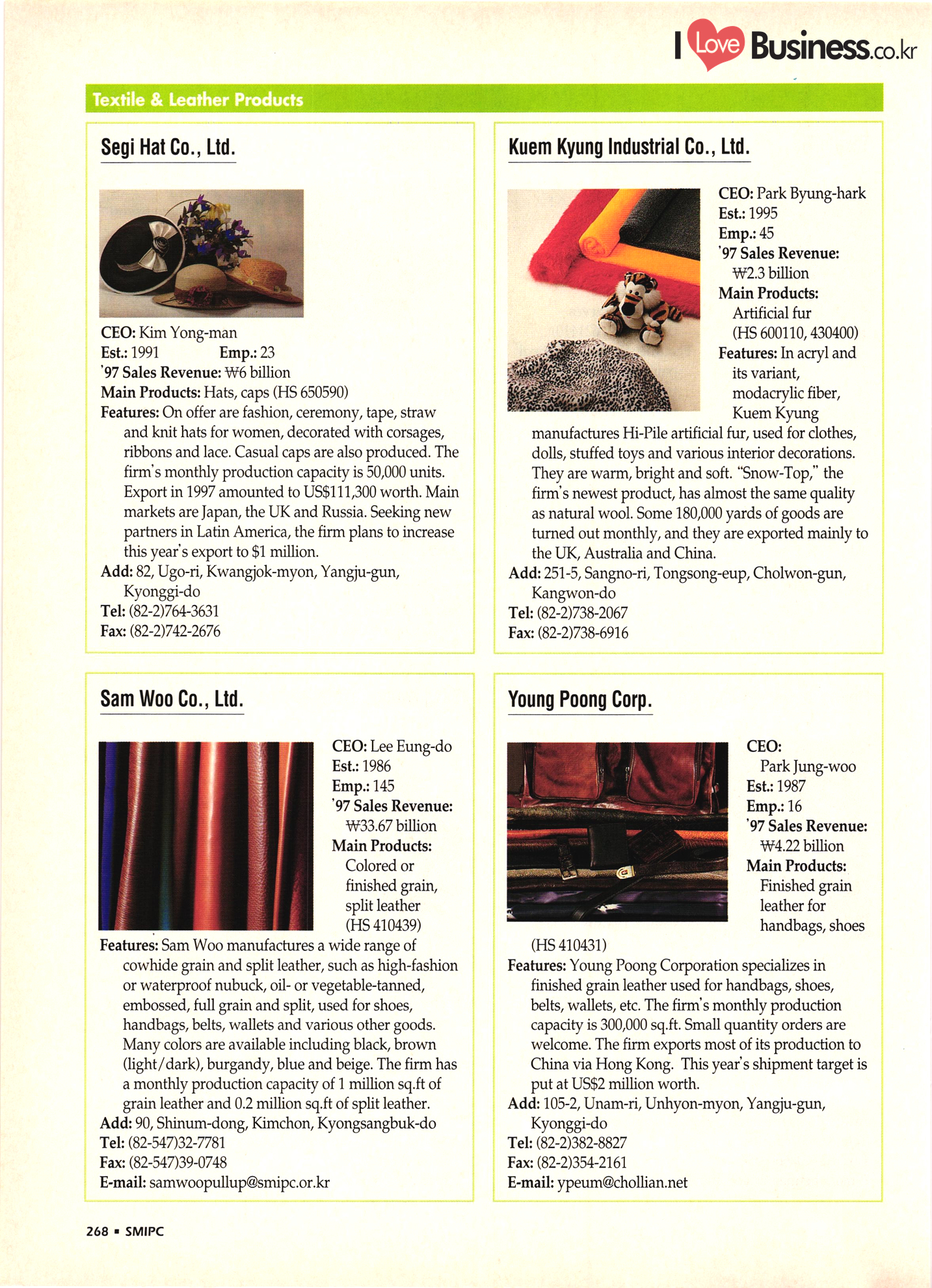 | I Love Business.co.kr small ME www.smallme.co.kr Quality Products from Korea CONTENTS • Metal Products • Machinery ..... Precision Equipment & Instrumentation • Electronic & Electric Products ........ 119 • Automobile Parts & ................... 191 Other Transportation Equipment • Chemical Products • Textile & Leather Products ......... Published on Aug. 5, 1998 by Small & Medium Industry Promotion Corporation (SMIPC) Add: 24-3, Yoido-dong, Yongdungpo-gu, Seoul, Korea Tel: (82-2)769-6841-50 Fax: (82-2)769-6959, 782-9702 E-mail: webmaster@smipc.or.kr URL: http://www.smipc.or.kr http://home.smipc.or.kr • Building Materials · • Household & Misc. Goods ........... Edited by Maekyung Buyers Guide Corp. Add: Trade Center PO Box 8, Seoul, Korea Tel: (82-2)551-2376-90 Fax: (82-2)551-2377, 2383 E-mail: mkbg@buyersguide.co.kr URL: http://www.buyersguide.co.kr Price: W20,000 Love Business Machinery Cutting tools Molds & dies Gears & reducers Material handling equipment Pumps & compressors Valves & fittings Blowers & fans Boilers Heat exchangers Packing M/C Metal working M/C Machine parts Welding M/C Automation equipment Construction equipment Food processing M/C Textile M/C & parts Paper working M/C Printing M/C Plastic processing M/C Semiconductor manufacturing equipment Refrigerators & air handling equipment 'Water treatment equipment Other industrial M/C |