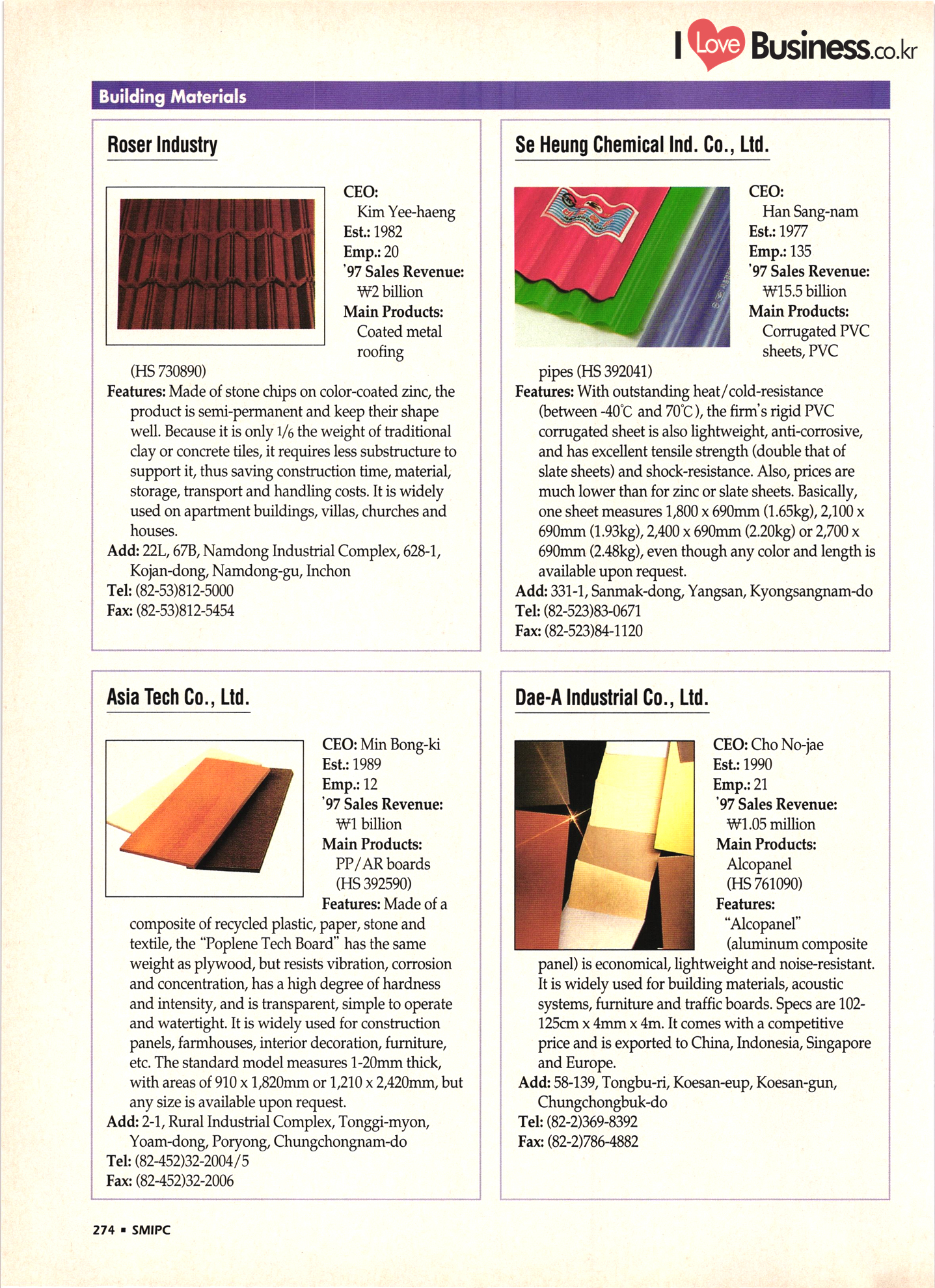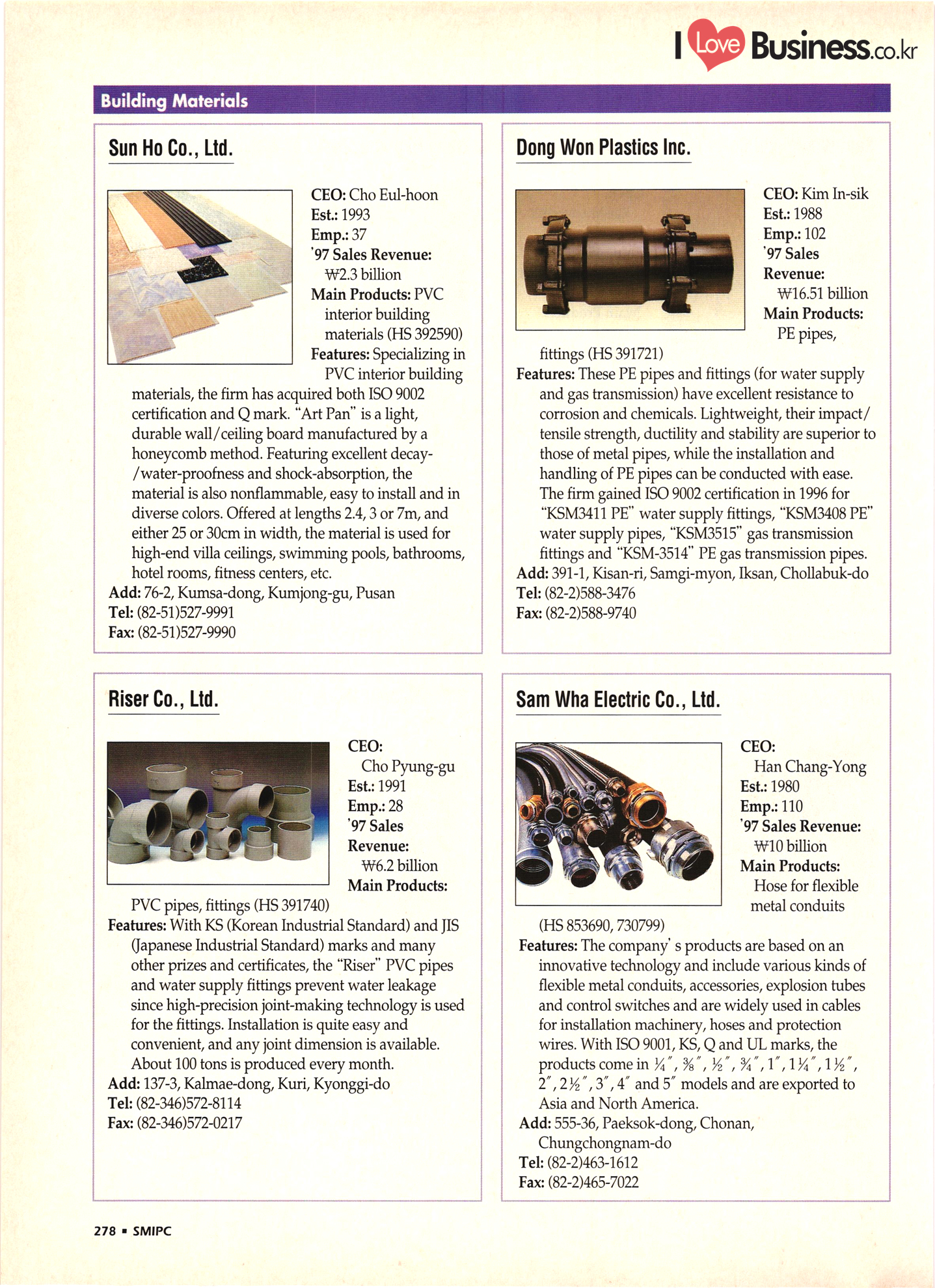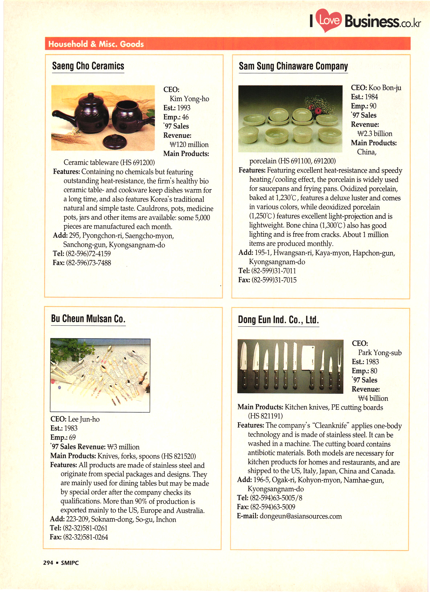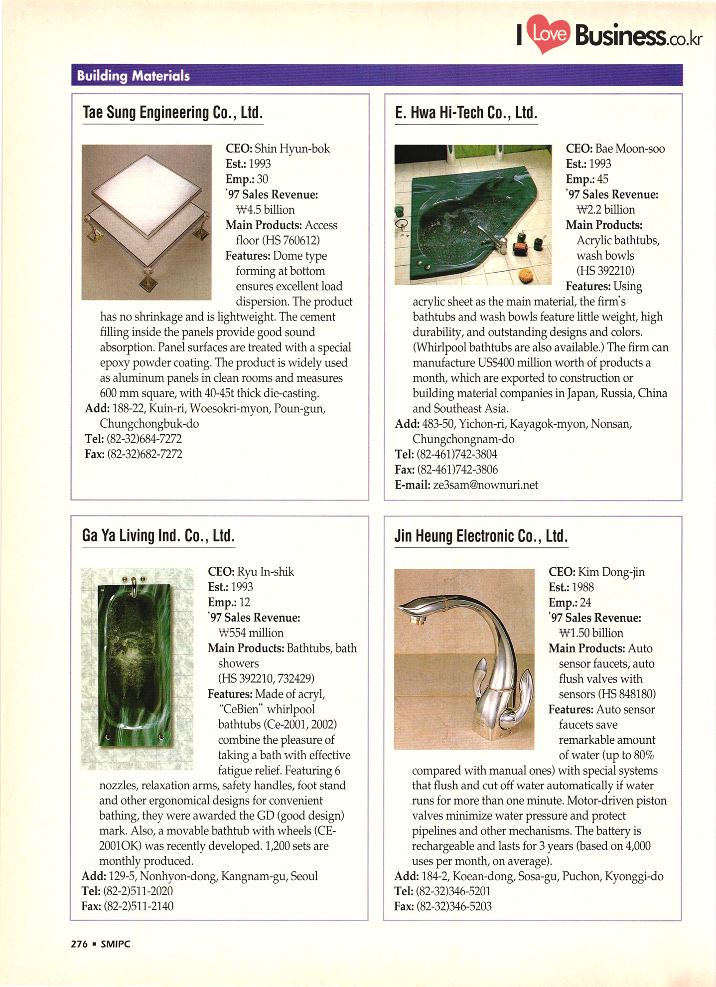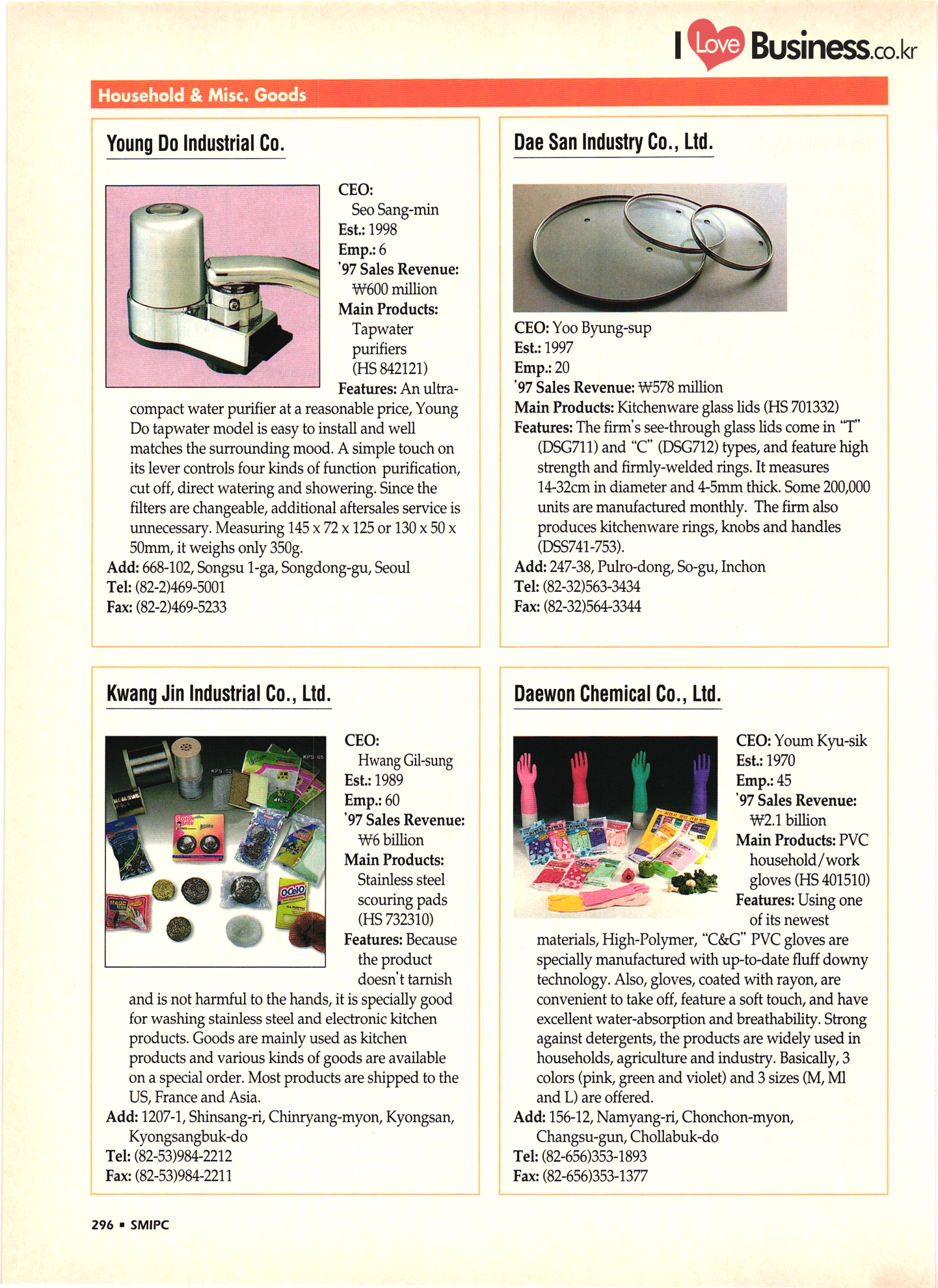 | I Love Business.co.kr small ME www.smallme.co.kr Quality Products from Korea CONTENTS • Metal Products • Machinery ..... Precision Equipment & Instrumentation • Electronic & Electric Products ........ 119 • Automobile Parts & ................... 191 Other Transportation Equipment • Chemical Products • Textile & Leather Products ......... Published on Aug. 5, 1998 by Small & Medium Industry Promotion Corporation (SMIPC) Add: 24-3, Yoido-dong, Yongdungpo-gu, Seoul, Korea Tel: (82-2)769-6841-50 Fax: (82-2)769-6959, 782-9702 E-mail: webmaster@smipc.or.kr URL: http://www.smipc.or.kr http://home.smipc.or.kr • Building Materials · • Household & Misc. Goods ........... Edited by Maekyung Buyers Guide Corp. Add: Trade Center PO Box 8, Seoul, Korea Tel: (82-2)551-2376-90 Fax: (82-2)551-2377, 2383 E-mail: mkbg@buyersguide.co.kr URL: http://www.buyersguide.co.kr Price: W20,000 Love Business Machinery Cutting tools Molds & dies Gears & reducers Material handling equipment Pumps & compressors Valves & fittings Blowers & fans Boilers Heat exchangers Packing M/C Metal working M/C Machine parts Welding M/C Automation equipment Construction equipment Food processing M/C Textile M/C & parts Paper working M/C Printing M/C Plastic processing M/C Semiconductor manufacturing equipment Refrigerators & air handling equipment 'Water treatment equipment Other industrial M/C |