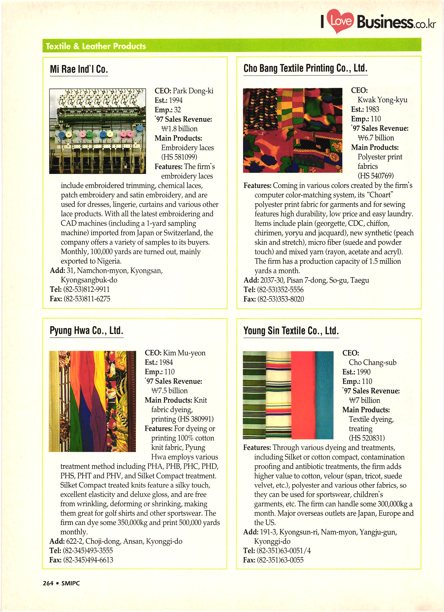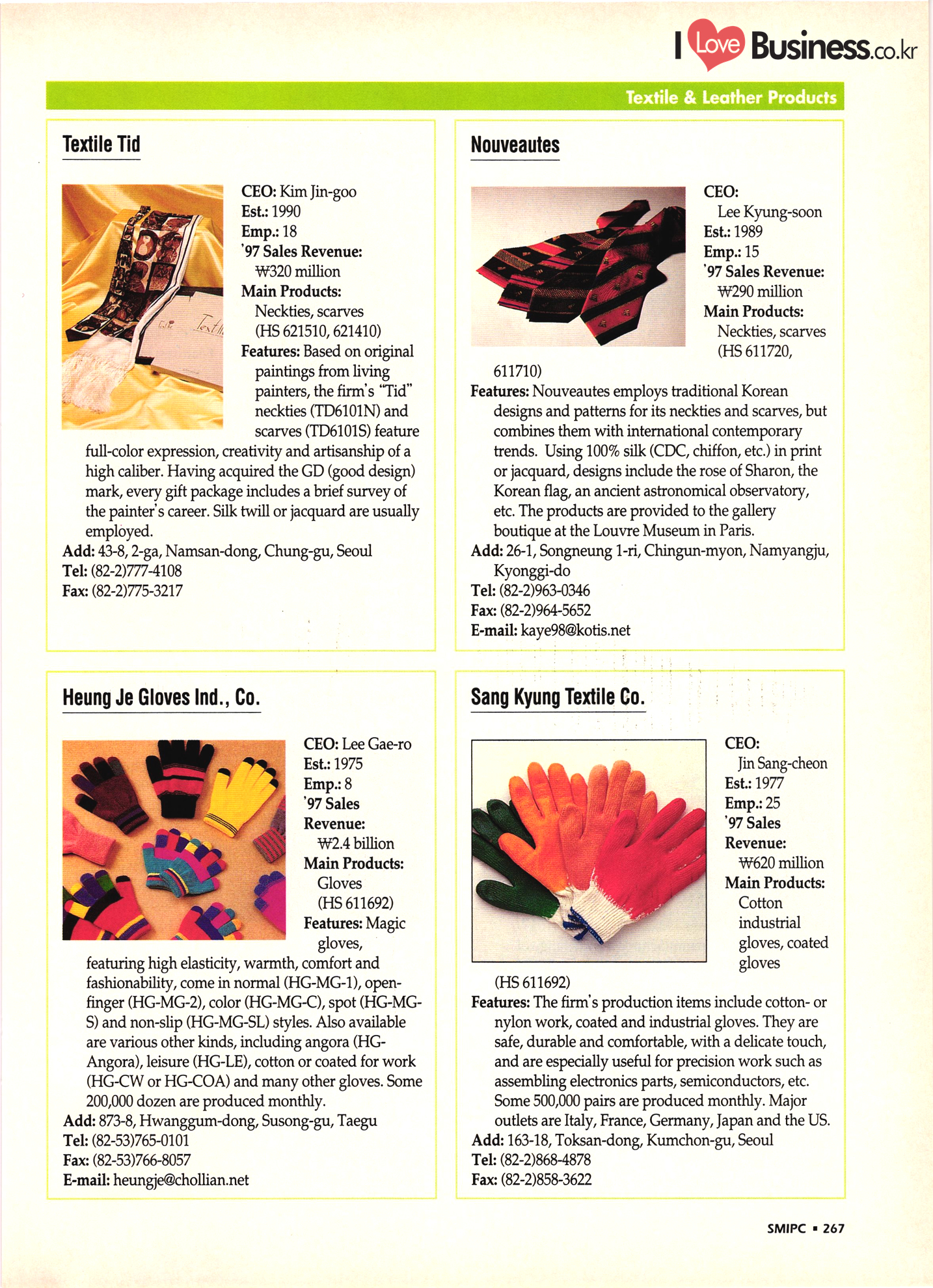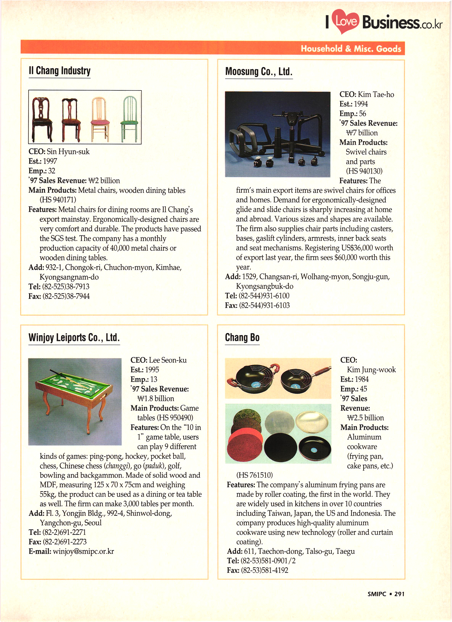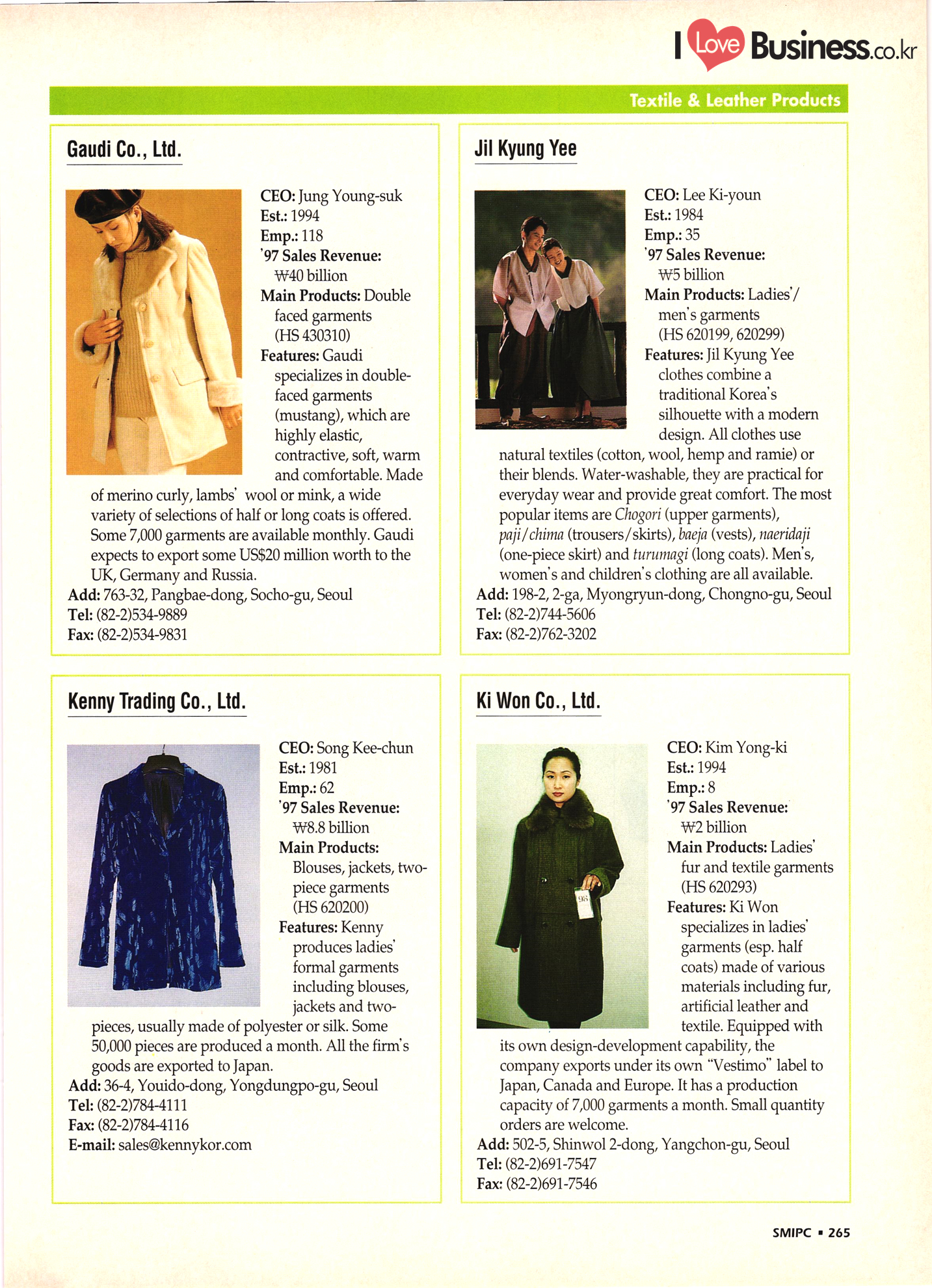 | I Love Business.co.kr small ME www.smallme.co.kr Quality Products from Korea CONTENTS • Metal Products • Machinery ..... Precision Equipment & Instrumentation • Electronic & Electric Products ........ 119 • Automobile Parts & ................... 191 Other Transportation Equipment • Chemical Products • Textile & Leather Products ......... Published on Aug. 5, 1998 by Small & Medium Industry Promotion Corporation (SMIPC) Add: 24-3, Yoido-dong, Yongdungpo-gu, Seoul, Korea Tel: (82-2)769-6841-50 Fax: (82-2)769-6959, 782-9702 E-mail: webmaster@smipc.or.kr URL: http://www.smipc.or.kr http://home.smipc.or.kr • Building Materials · • Household & Misc. Goods ........... Edited by Maekyung Buyers Guide Corp. Add: Trade Center PO Box 8, Seoul, Korea Tel: (82-2)551-2376-90 Fax: (82-2)551-2377, 2383 E-mail: mkbg@buyersguide.co.kr URL: http://www.buyersguide.co.kr Price: W20,000 Love Business Machinery Cutting tools Molds & dies Gears & reducers Material handling equipment Pumps & compressors Valves & fittings Blowers & fans Boilers Heat exchangers Packing M/C Metal working M/C Machine parts Welding M/C Automation equipment Construction equipment Food processing M/C Textile M/C & parts Paper working M/C Printing M/C Plastic processing M/C Semiconductor manufacturing equipment Refrigerators & air handling equipment 'Water treatment equipment Other industrial M/C |
