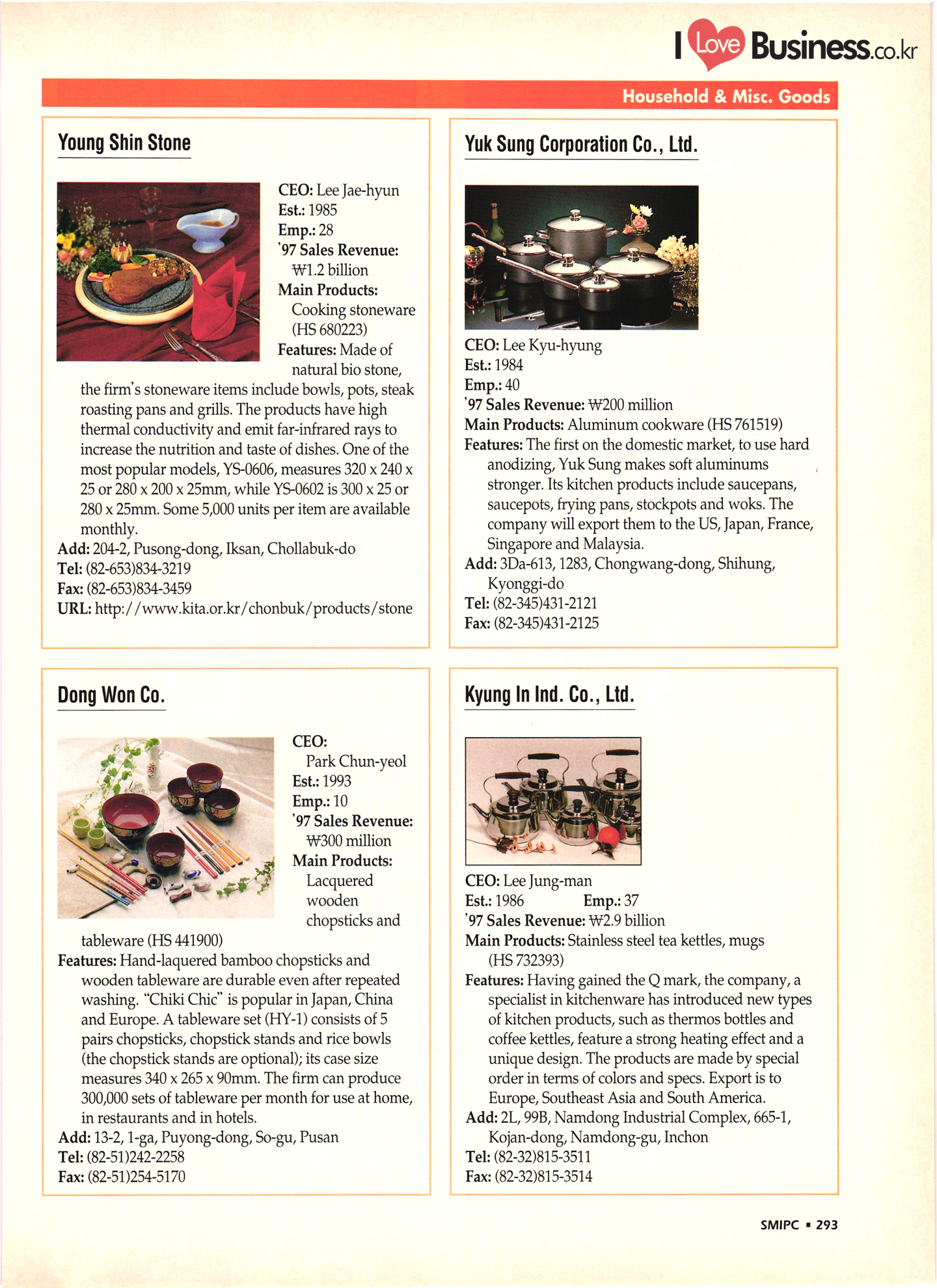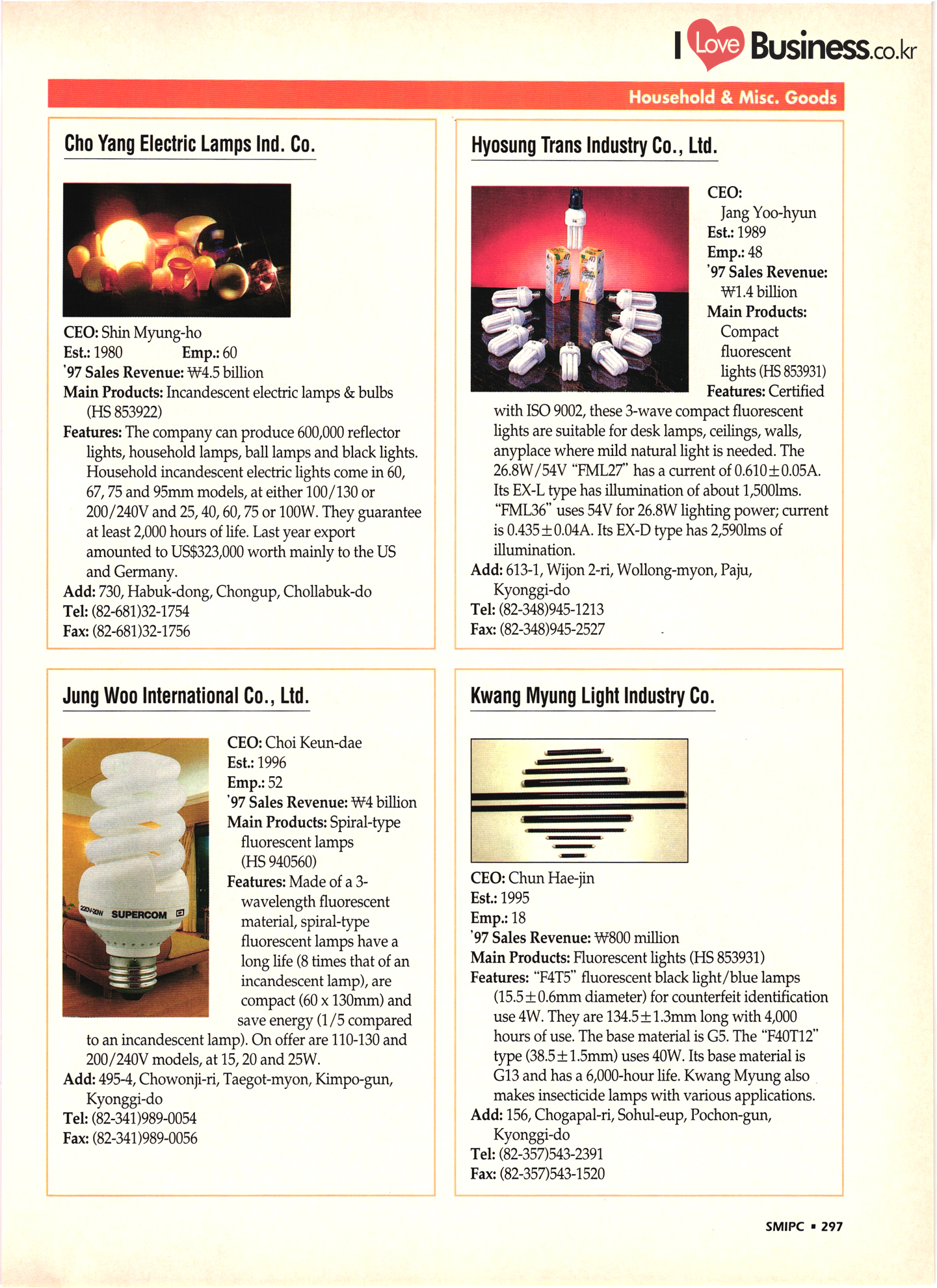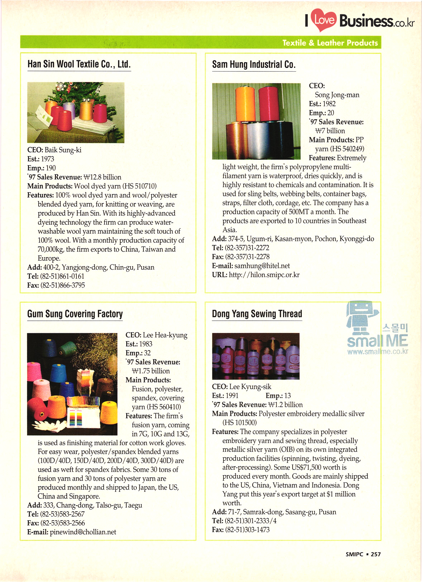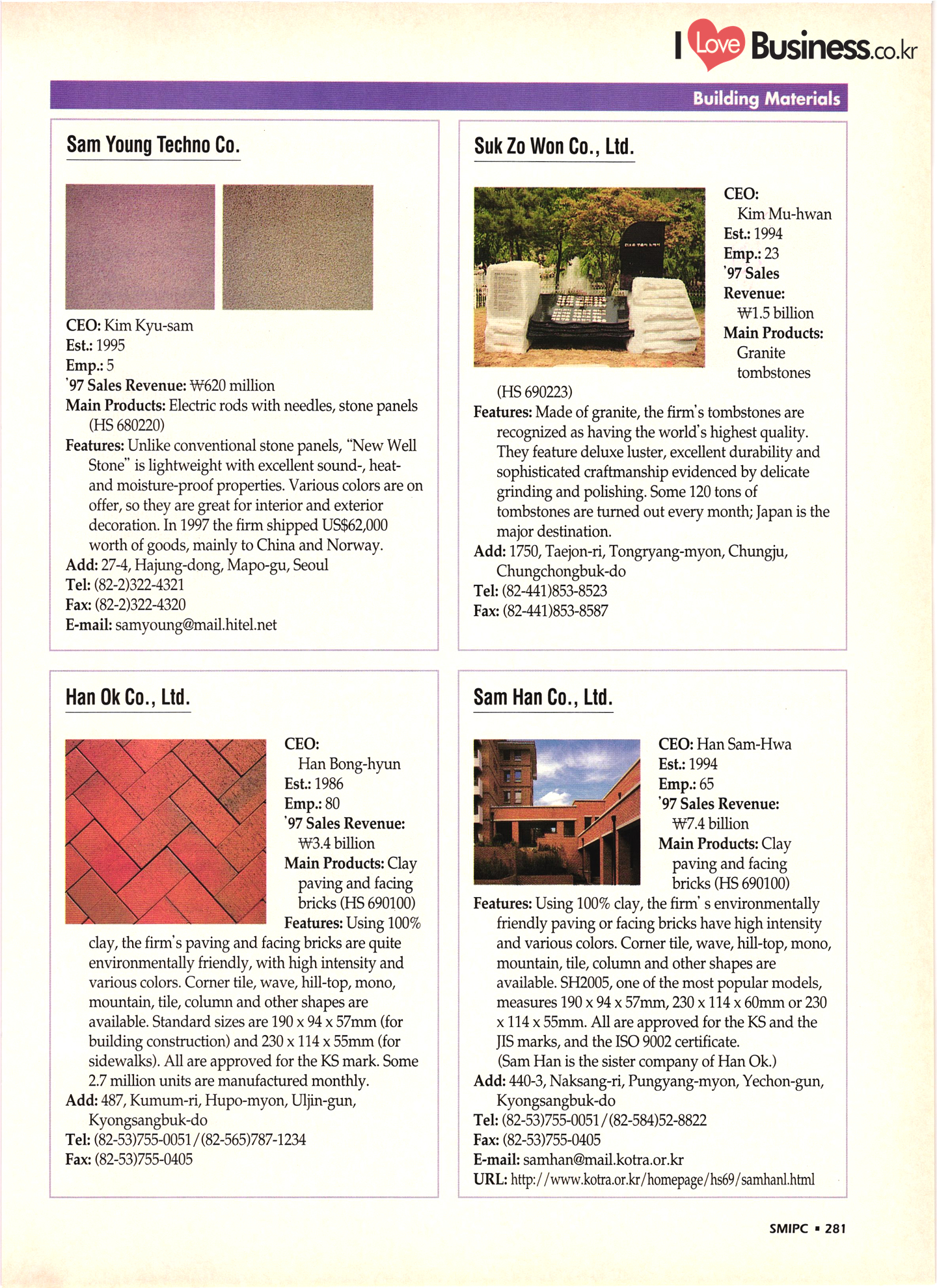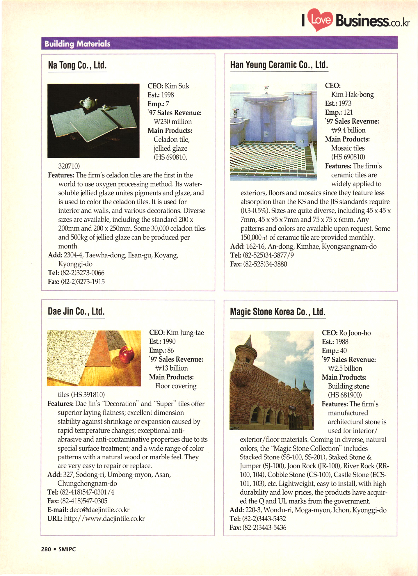 | I Love Business.co.kr small ME www.smallme.co.kr Quality Products from Korea CONTENTS • Metal Products • Machinery ..... Precision Equipment & Instrumentation • Electronic & Electric Products ........ 119 • Automobile Parts & ................... 191 Other Transportation Equipment • Chemical Products • Textile & Leather Products ......... Published on Aug. 5, 1998 by Small & Medium Industry Promotion Corporation (SMIPC) Add: 24-3, Yoido-dong, Yongdungpo-gu, Seoul, Korea Tel: (82-2)769-6841-50 Fax: (82-2)769-6959, 782-9702 E-mail: webmaster@smipc.or.kr URL: http://www.smipc.or.kr http://home.smipc.or.kr • Building Materials · • Household & Misc. Goods ........... Edited by Maekyung Buyers Guide Corp. Add: Trade Center PO Box 8, Seoul, Korea Tel: (82-2)551-2376-90 Fax: (82-2)551-2377, 2383 E-mail: mkbg@buyersguide.co.kr URL: http://www.buyersguide.co.kr Price: W20,000 Love Business Machinery Cutting tools Molds & dies Gears & reducers Material handling equipment Pumps & compressors Valves & fittings Blowers & fans Boilers Heat exchangers Packing M/C Metal working M/C Machine parts Welding M/C Automation equipment Construction equipment Food processing M/C Textile M/C & parts Paper working M/C Printing M/C Plastic processing M/C Semiconductor manufacturing equipment Refrigerators & air handling equipment 'Water treatment equipment Other industrial M/C |