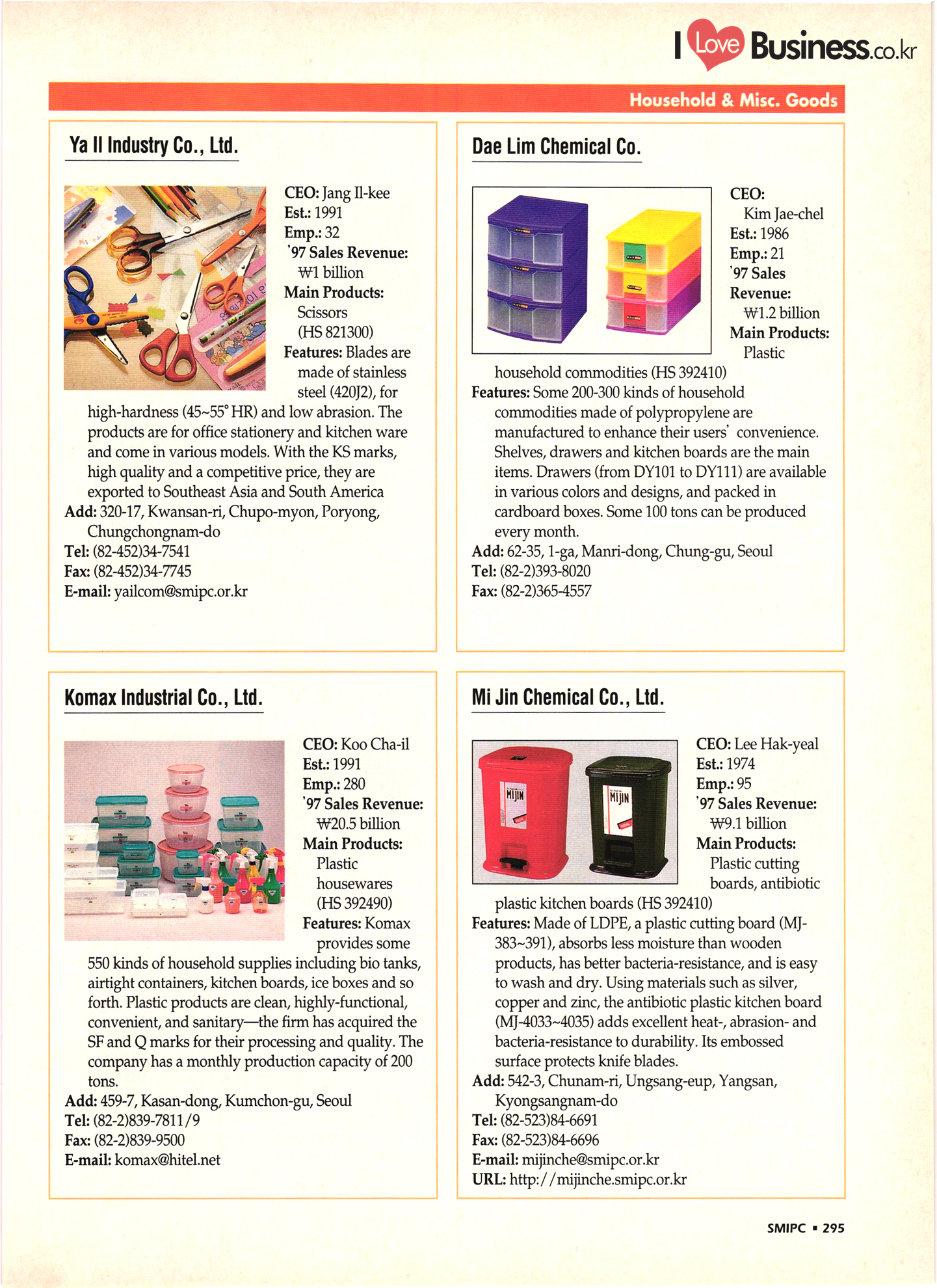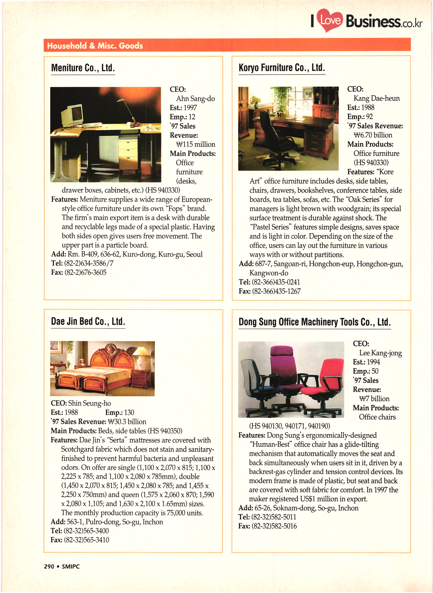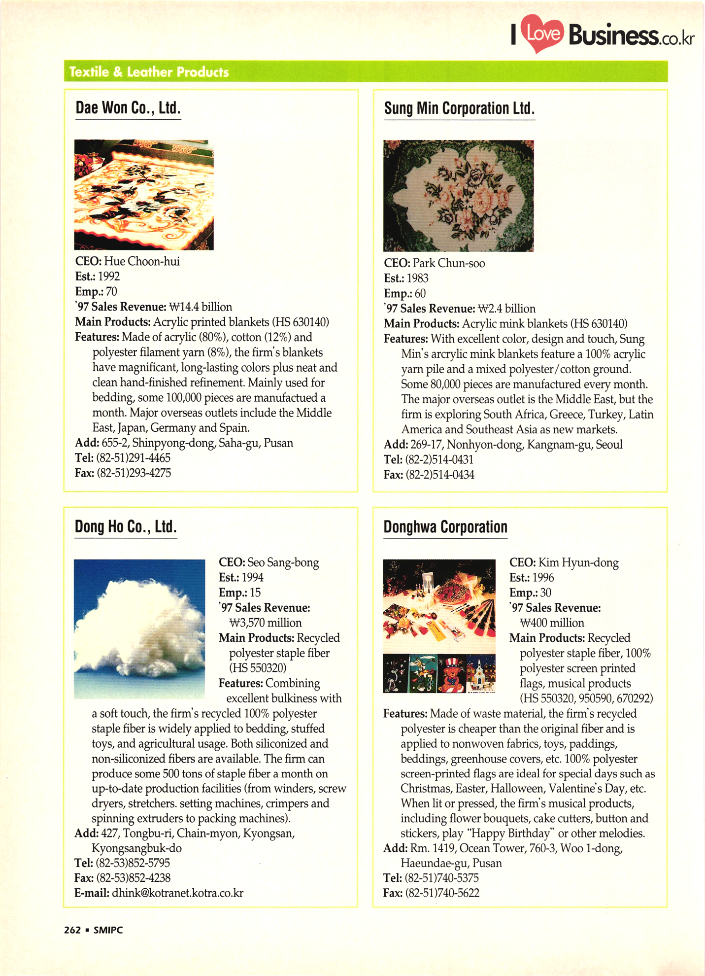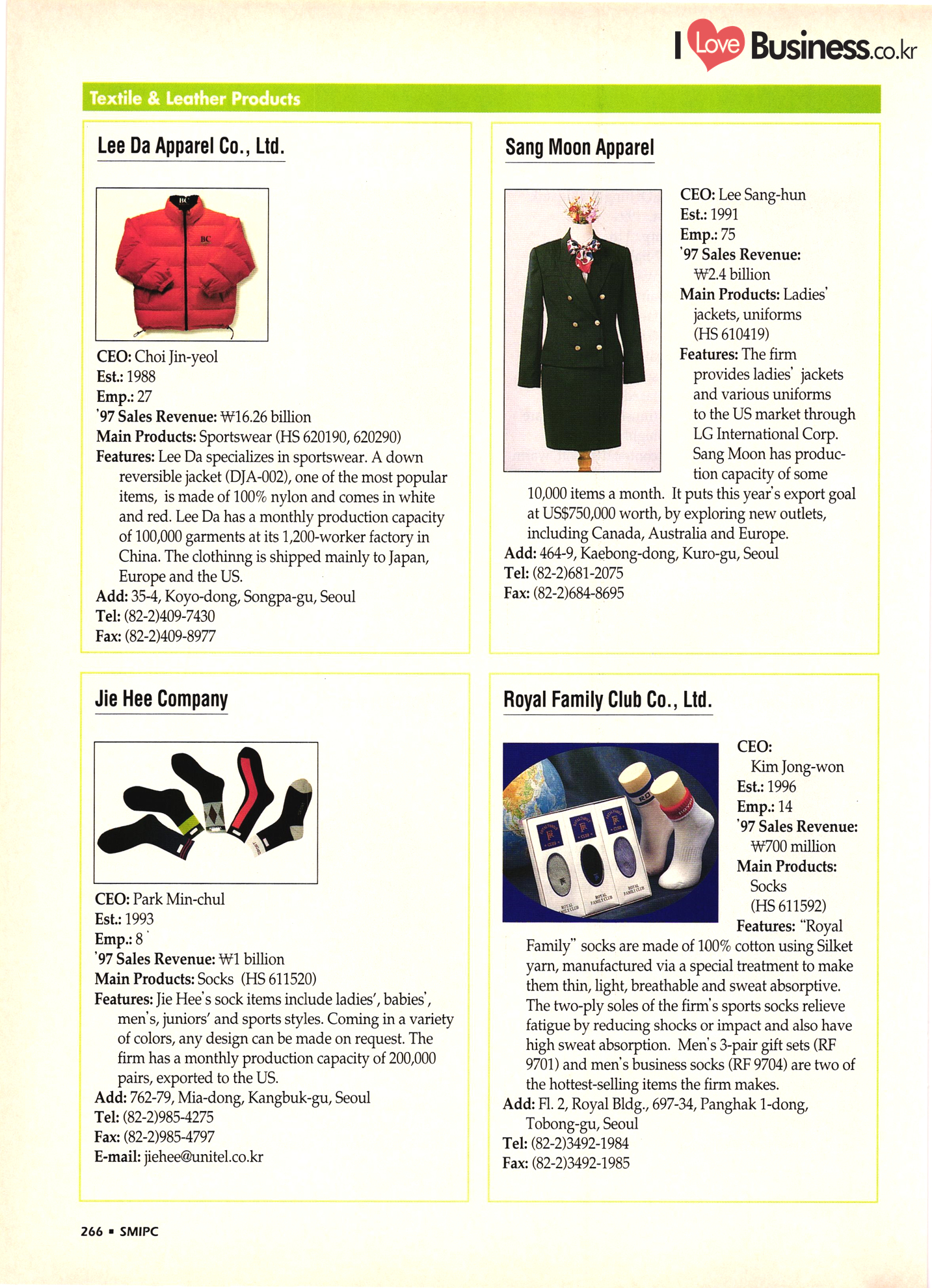 | I Love Business.co.kr small ME www.smallme.co.kr Quality Products from Korea CONTENTS • Metal Products • Machinery ..... Precision Equipment & Instrumentation • Electronic & Electric Products ........ 119 • Automobile Parts & ................... 191 Other Transportation Equipment • Chemical Products • Textile & Leather Products ......... Published on Aug. 5, 1998 by Small & Medium Industry Promotion Corporation (SMIPC) Add: 24-3, Yoido-dong, Yongdungpo-gu, Seoul, Korea Tel: (82-2)769-6841-50 Fax: (82-2)769-6959, 782-9702 E-mail: webmaster@smipc.or.kr URL: http://www.smipc.or.kr http://home.smipc.or.kr • Building Materials · • Household & Misc. Goods ........... Edited by Maekyung Buyers Guide Corp. Add: Trade Center PO Box 8, Seoul, Korea Tel: (82-2)551-2376-90 Fax: (82-2)551-2377, 2383 E-mail: mkbg@buyersguide.co.kr URL: http://www.buyersguide.co.kr Price: W20,000 Love Business Machinery Cutting tools Molds & dies Gears & reducers Material handling equipment Pumps & compressors Valves & fittings Blowers & fans Boilers Heat exchangers Packing M/C Metal working M/C Machine parts Welding M/C Automation equipment Construction equipment Food processing M/C Textile M/C & parts Paper working M/C Printing M/C Plastic processing M/C Semiconductor manufacturing equipment Refrigerators & air handling equipment 'Water treatment equipment Other industrial M/C |