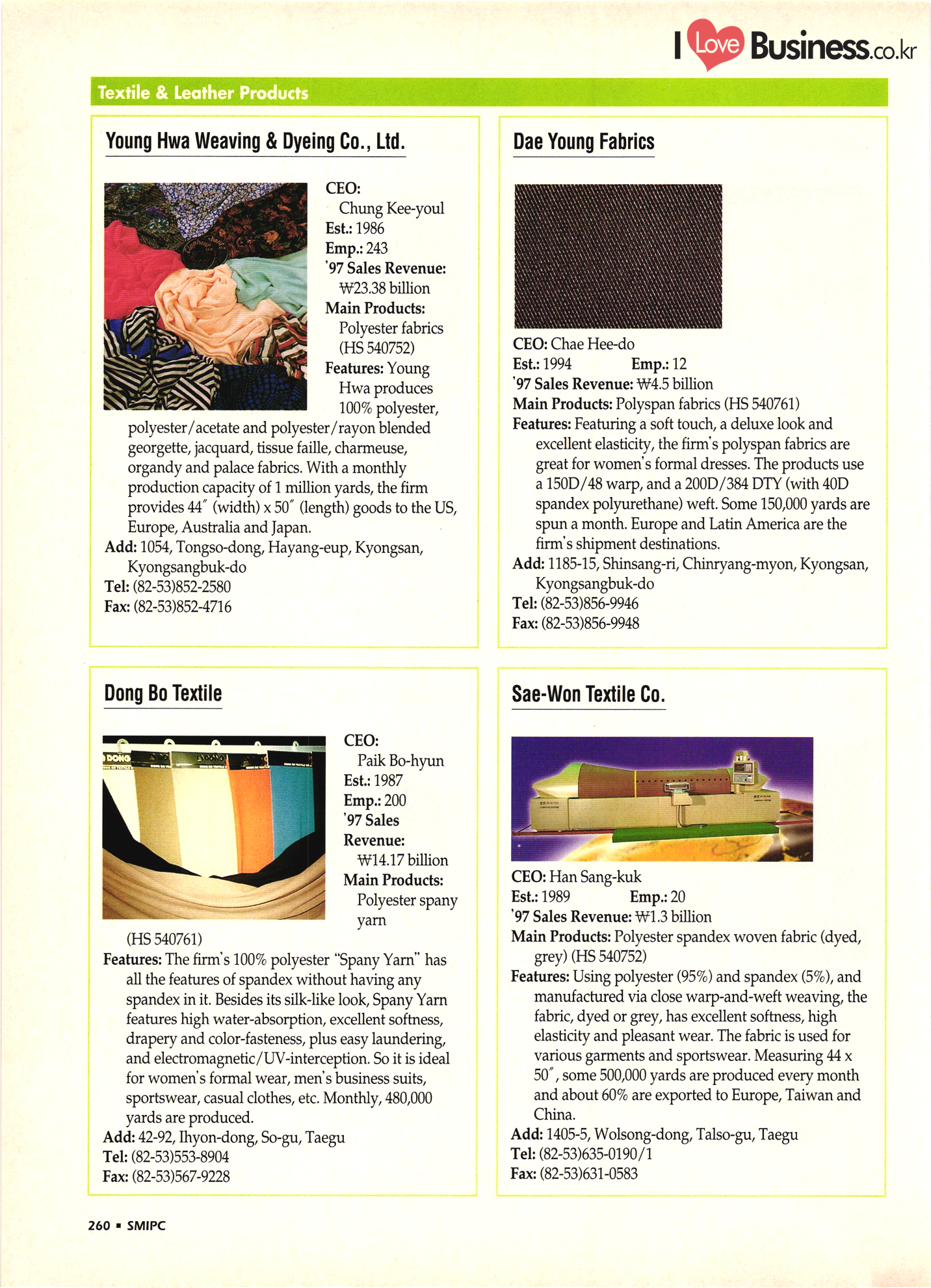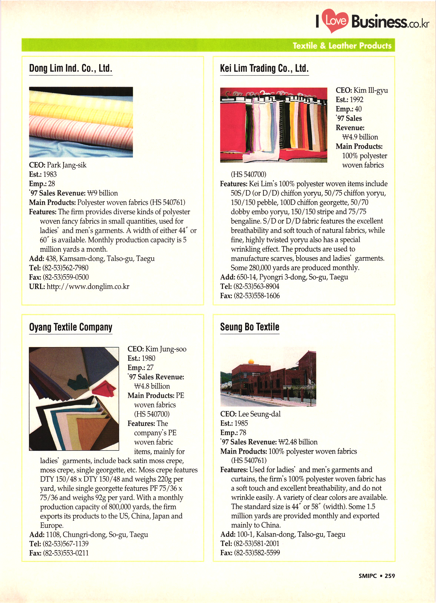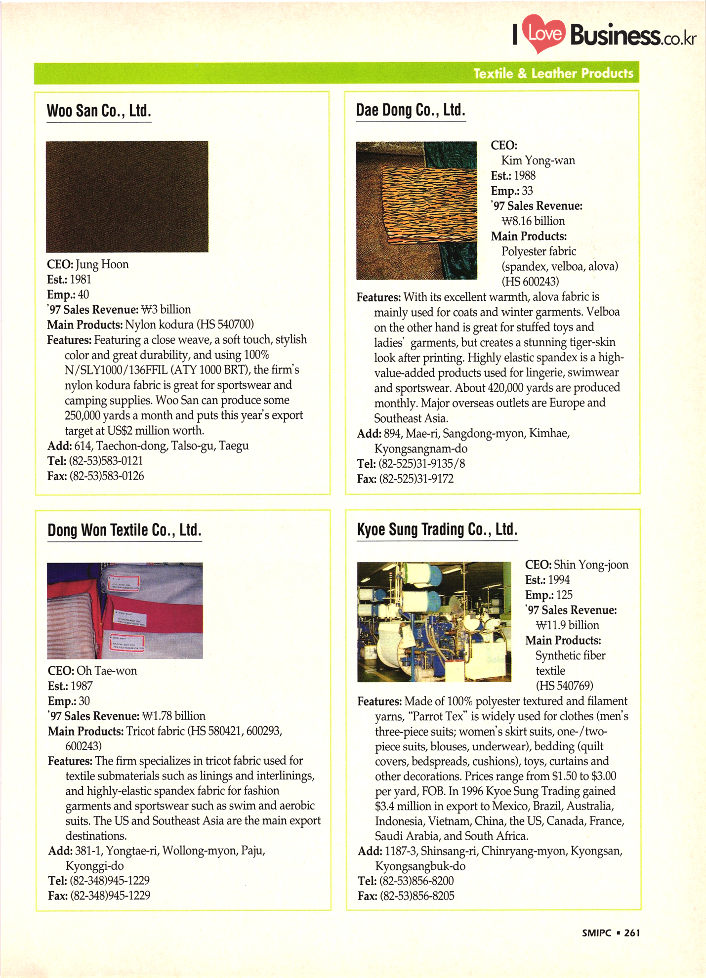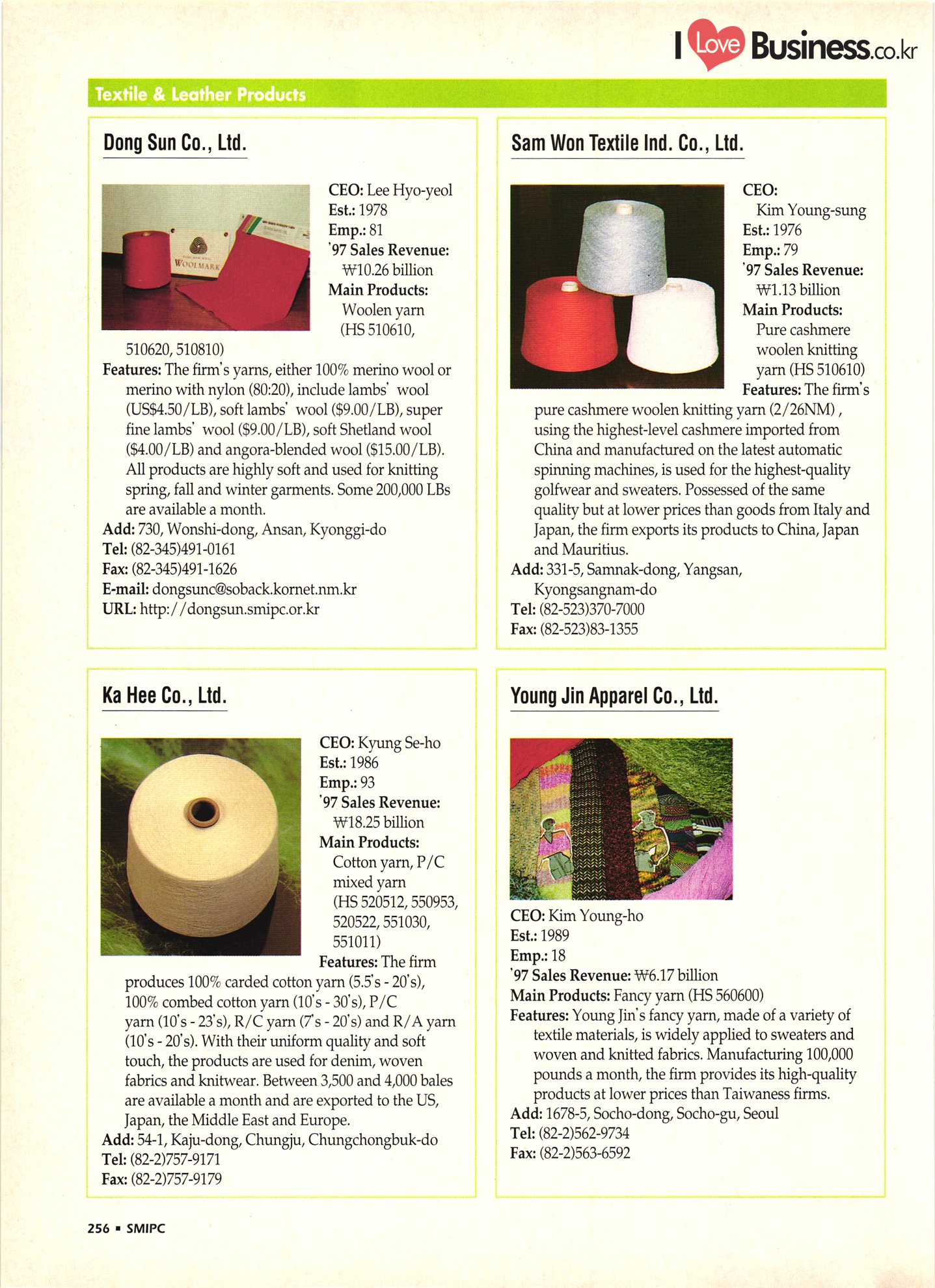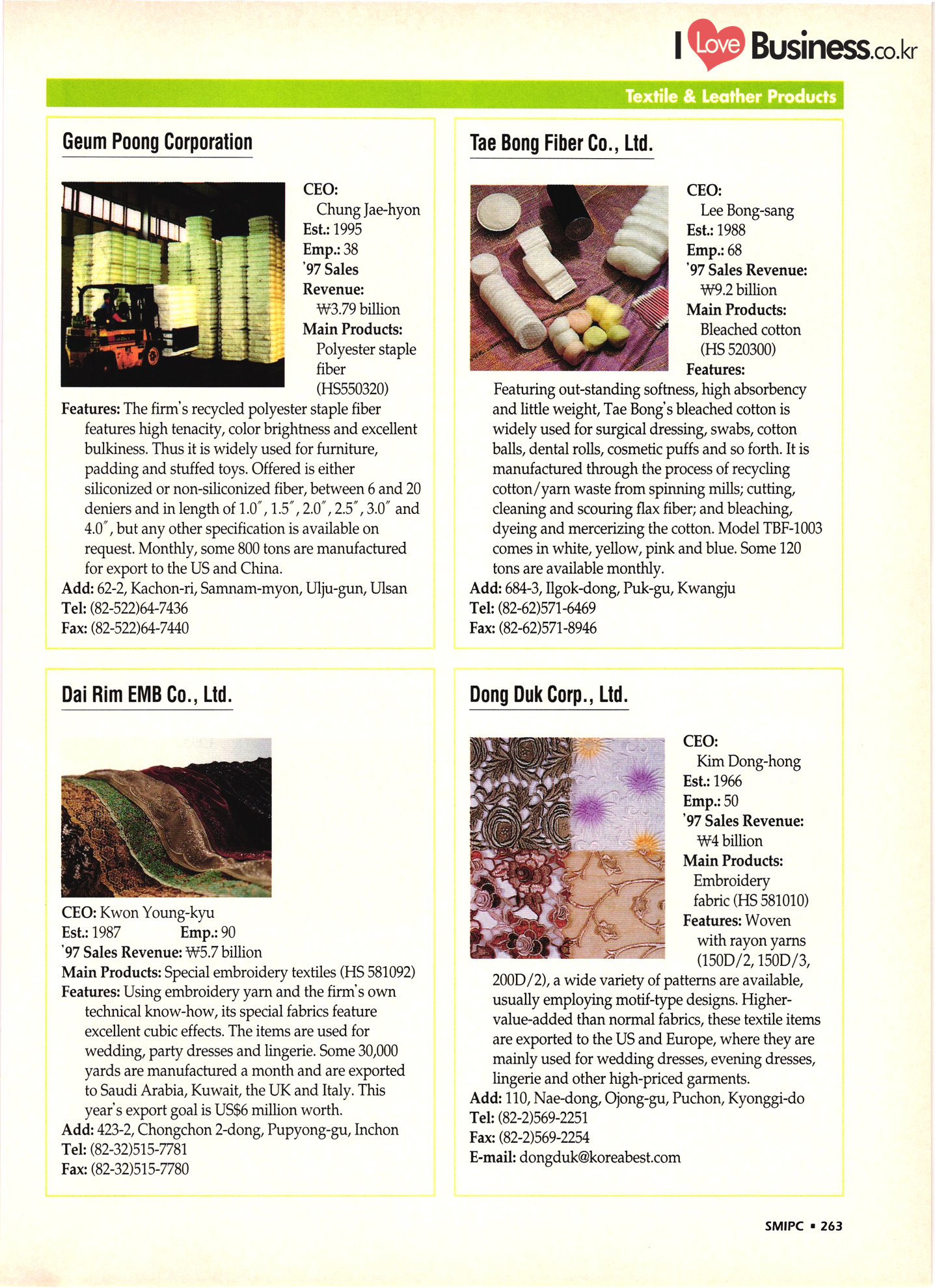 | I Love Business.co.kr small ME www.smallme.co.kr Quality Products from Korea CONTENTS • Metal Products • Machinery ..... Precision Equipment & Instrumentation • Electronic & Electric Products ........ 119 • Automobile Parts & ................... 191 Other Transportation Equipment • Chemical Products • Textile & Leather Products ......... Published on Aug. 5, 1998 by Small & Medium Industry Promotion Corporation (SMIPC) Add: 24-3, Yoido-dong, Yongdungpo-gu, Seoul, Korea Tel: (82-2)769-6841-50 Fax: (82-2)769-6959, 782-9702 E-mail: webmaster@smipc.or.kr URL: http://www.smipc.or.kr http://home.smipc.or.kr • Building Materials · • Household & Misc. Goods ........... Edited by Maekyung Buyers Guide Corp. Add: Trade Center PO Box 8, Seoul, Korea Tel: (82-2)551-2376-90 Fax: (82-2)551-2377, 2383 E-mail: mkbg@buyersguide.co.kr URL: http://www.buyersguide.co.kr Price: W20,000 Love Business Machinery Cutting tools Molds & dies Gears & reducers Material handling equipment Pumps & compressors Valves & fittings Blowers & fans Boilers Heat exchangers Packing M/C Metal working M/C Machine parts Welding M/C Automation equipment Construction equipment Food processing M/C Textile M/C & parts Paper working M/C Printing M/C Plastic processing M/C Semiconductor manufacturing equipment Refrigerators & air handling equipment 'Water treatment equipment Other industrial M/C |