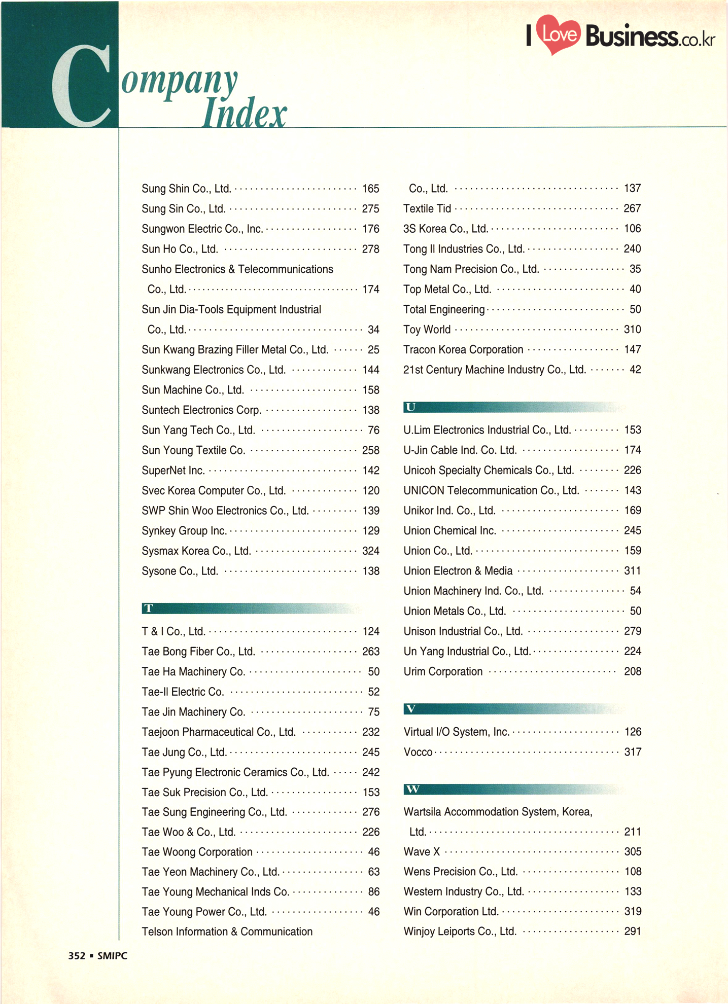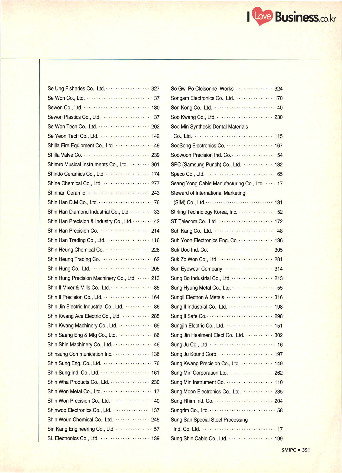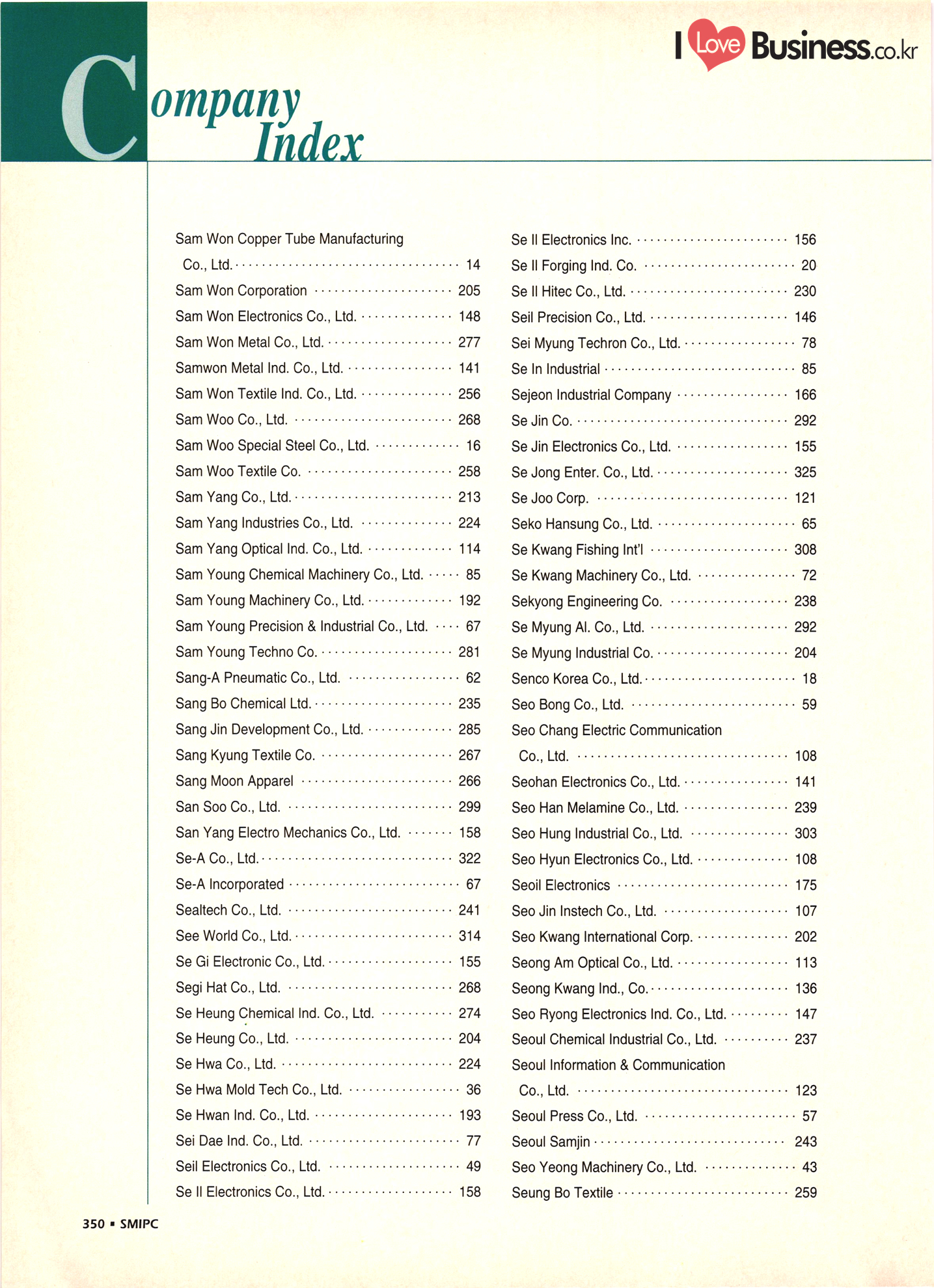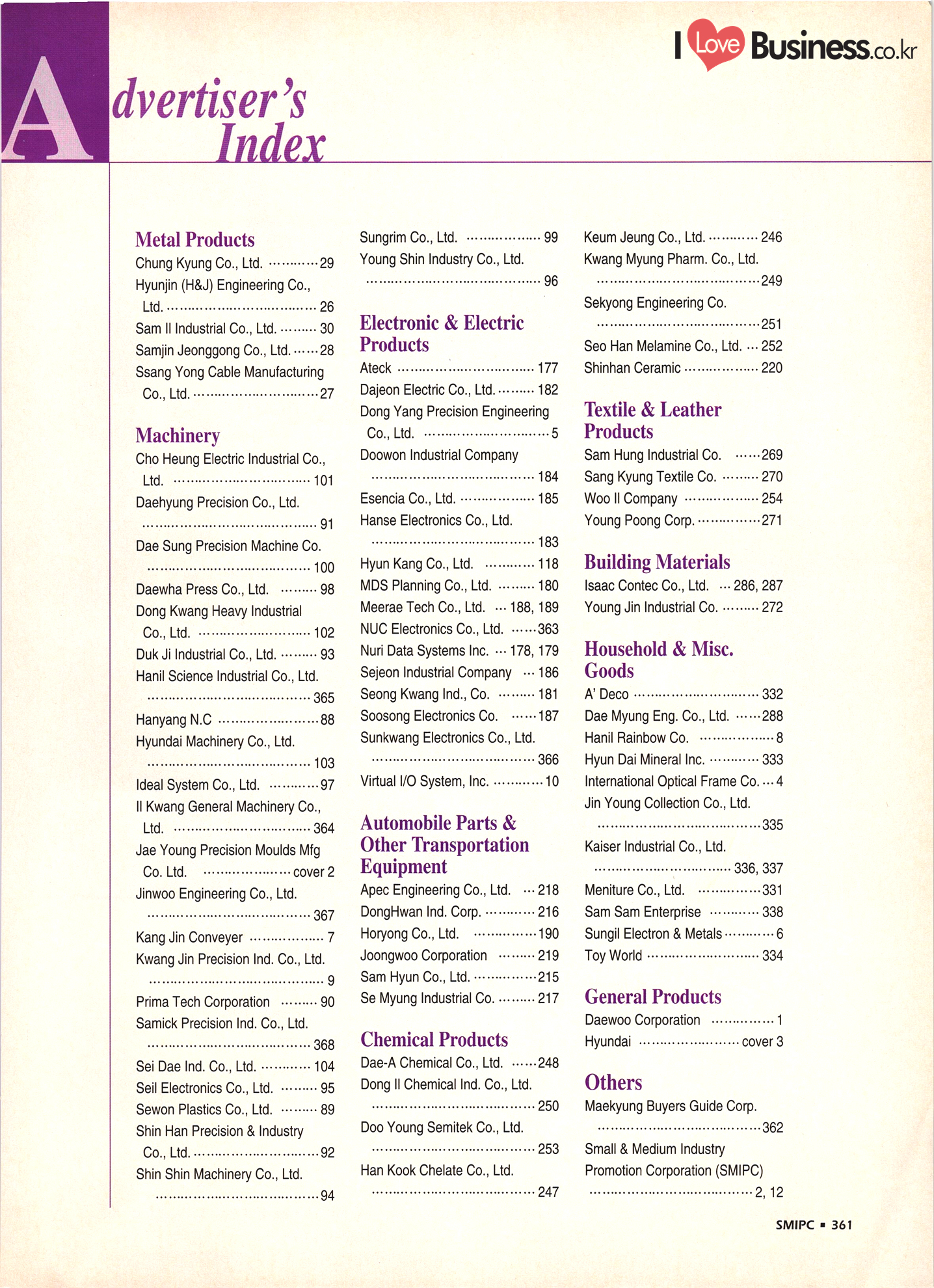 | I Love Business.co.kr ompany Index ................ ....... ... 52 - 222 ......... A' Deco .............. .... 299 Accufar Golf Co., Ltd. ..................... 305 Accu Tech Co., Ltd. . . . . . . . . . . . . . . . . . . . ...... 32 ACN Tech Inc. ............................ A-Do Machinery & Electronics Co., Ltd. ....... Afega Co., Ltd. .......... Agriculture Management Producer's Corp. (Tam Ra Marketing) . . . . . . . . . . . . . . . . . . . . .. 325 Ah Poong Ind. Co., Ltd. .................... 163 A-1 In-Tech Co., Ltd. ............. 143 A-Il Plastics Ind. Co., Ltd. . . . . . . . . . . ... 238 A-Jin Industrial Co. . . . . . . . . . . . . . . . . . . . ... 315 A Ju Exim Inc. ................. Al Chun Industry Co., Ltd. .............. Altec. Korea .......... 282 Amos Co., Ltd. ....... ... 165 Anjun Industrial Co., Ltd. ............... Antonio Shoes Co., Ltd. ....... Anyone Trading Co. ....... Apec Engineering Co., Ltd. .. Aprotech Co., Ltd. ....................... ..... 129 Aquam Co., Ltd. ......... Argus Optical Co., Ltd. ..................... A Rim Machinery & Engineering Co. . . . . . . ... 211 Arisa Co., Ltd. . . . . . . . . . . . . . . . . . . . . . . . . . . ................. 315 A Seong Electronic Co., Ltd. ............. ... 135 Asia Tech Co., Ltd. ................. ... 274 A-Sung Chemical Ind. Co., Ltd. . . . . . . . . . ... ... 233 Ateck: ......... ... 133 Belco International Co., Ltd. ...... Bell Metal Industrial Co., Ltd. ........ Bestech Co., Ltd. ................... Bionics Korea Co., Ltd. . . . . . . . . ....... Biosys Co., Ltd. . . . . . . . . . . . . . . . . . . . . . BoAm R&D Co., Ltd. - ............... Bo Chang Machinery Co. ............. Bo Hyung Industry Co...... Bokwang Media Co., Ltd. ..... Bo Lak Company Limited .................... 329 Bong Oh Electronics Ind. Co., Ltd. ......... Bong Shin Co., Ltd. ........... Boo Il Machinery Co.......... Boo Sung Yang Hyeang Co., Ltd. ............ Boo Won Electronics Co., Ltd. .............. Boo Won Optical Co., Ltd. .................. Boo Young Industrial Electronic Co., Ltd...... 111 Bo Ram Tek Ltd. ......................... Borim Compia ............................ 125 Bowoo System Corporation ...... .......... 44 Boyang Industrial Co., Ltd. . . . . . . . ..... BTC Korea Co., Ltd. . . . . . . . . . . . . . . . . . BTR Co., Ltd. ............. .......... 43 Bu Cheun Mulsan Co.................... Buffalo Sports Ltd. ....... Bu-l Industrial Co., Ltd. ...... Bu Kwang Medical Inc. ... ....... 116 Bum-Ah Harness Co., Ltd. ...... ........ 172 Bum Han Electric Co., Ltd. ...... ........ 110 Bumil Industrial Co., Ltd. ........ Bum Mi Universe Co., Ltd. ................. Bum Woo Co., Ltd. ......................... 79 Bum Yang Ind. Co., Ltd. - .................. Busan Dipping Rubber Ind. Co., Ltd. ......... | Bu Sung Co., Ltd. ..................... Bu Sung R&H Co., Ltd. .................... 319 ..... 208 ....... ....... Art Bug B Bae Eun Precision Co., Ltd........ ... 164 Baik San Han Precision Co., Ltd. ............. 124 Bando Industrial Co., Ltd. .......... ..... 72 Ban Sung Co., Ltd. ................................ 161 Baytech Korea Inc. -..... ... 111 340 - SMIPC |