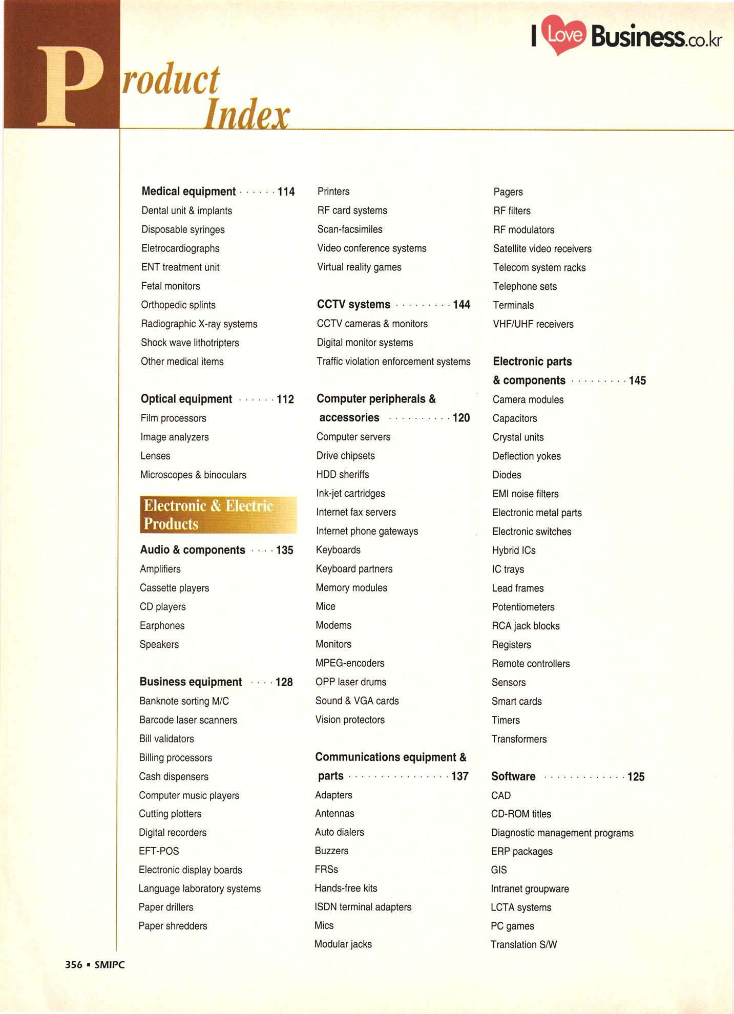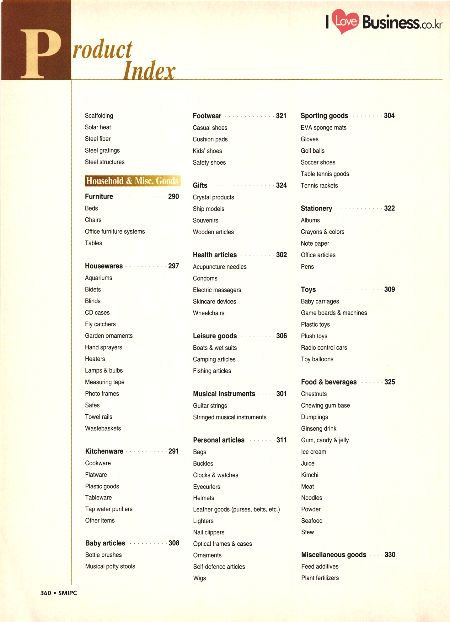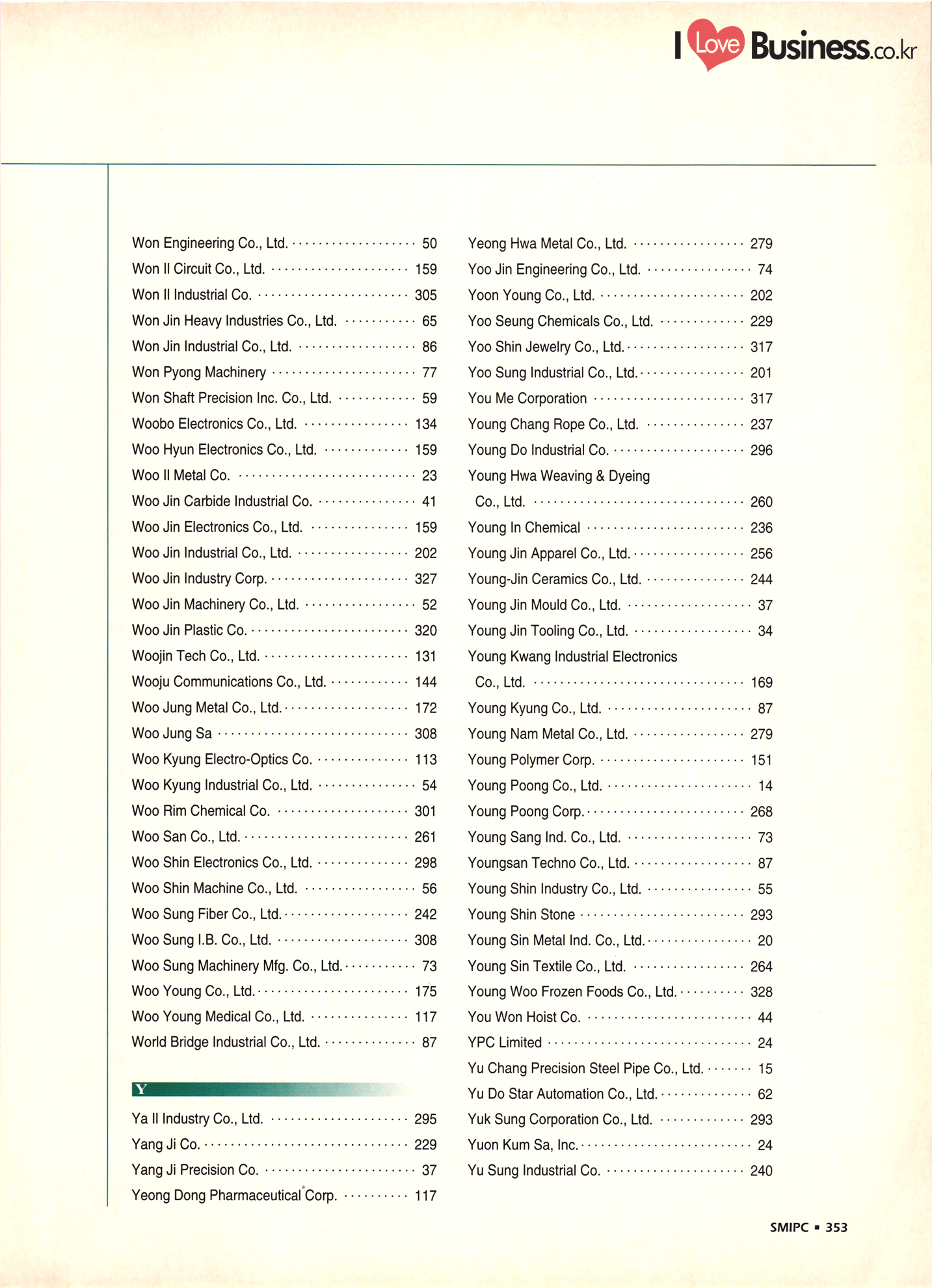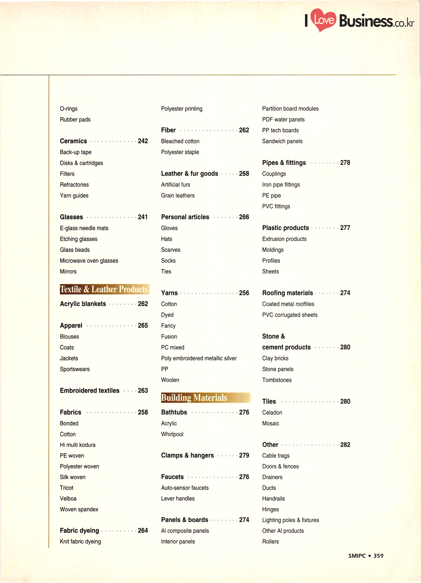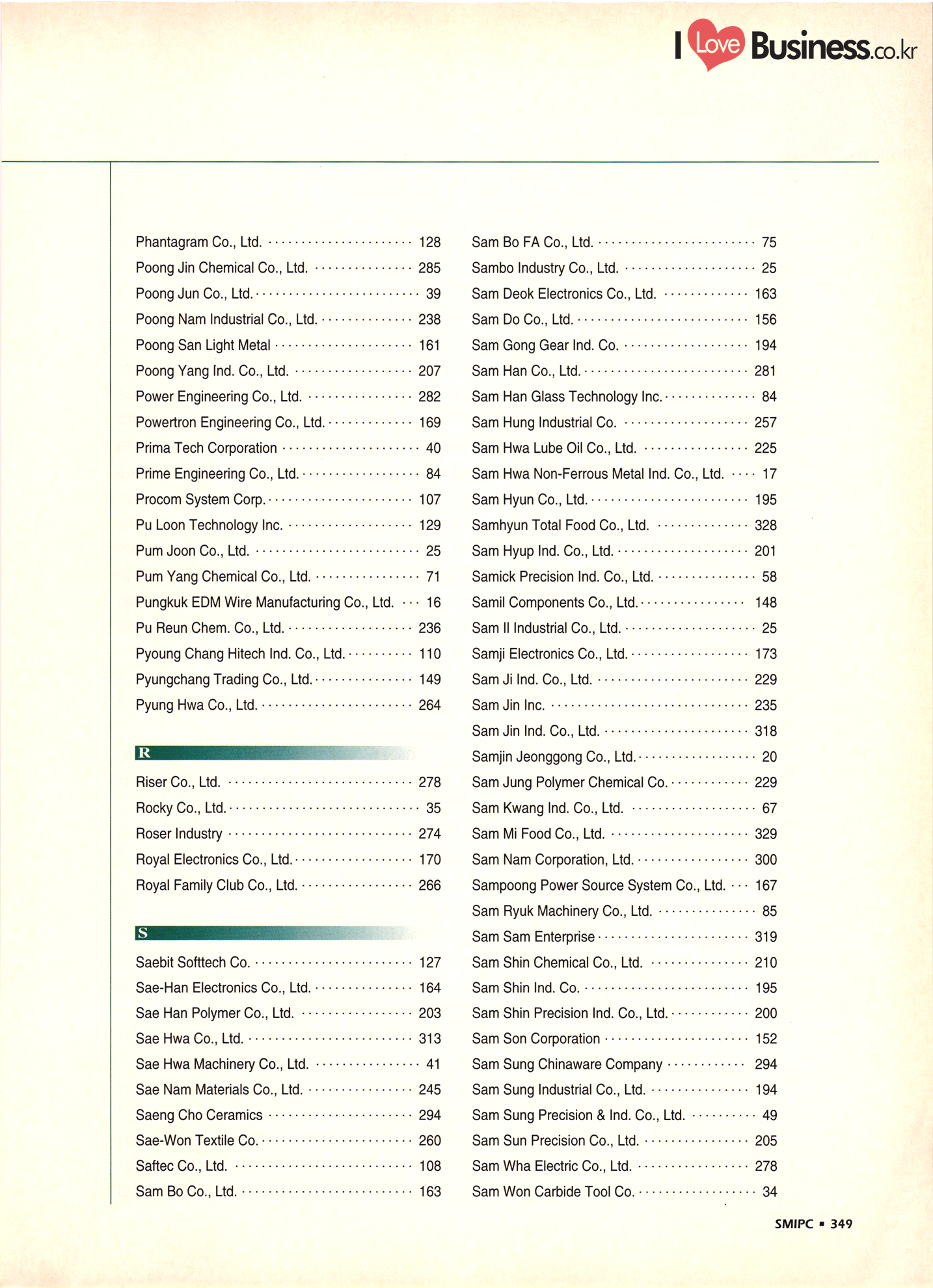 | I Love Business.co.kr ompany Index ................ ....... ... 52 - 222 ......... A' Deco .............. .... 299 Accufar Golf Co., Ltd. ..................... 305 Accu Tech Co., Ltd. . . . . . . . . . . . . . . . . . . . ...... 32 ACN Tech Inc. ............................ A-Do Machinery & Electronics Co., Ltd. ....... Afega Co., Ltd. .......... Agriculture Management Producer's Corp. (Tam Ra Marketing) . . . . . . . . . . . . . . . . . . . . .. 325 Ah Poong Ind. Co., Ltd. .................... 163 A-1 In-Tech Co., Ltd. ............. 143 A-Il Plastics Ind. Co., Ltd. . . . . . . . . . . ... 238 A-Jin Industrial Co. . . . . . . . . . . . . . . . . . . . ... 315 A Ju Exim Inc. ................. Al Chun Industry Co., Ltd. .............. Altec. Korea .......... 282 Amos Co., Ltd. ....... ... 165 Anjun Industrial Co., Ltd. ............... Antonio Shoes Co., Ltd. ....... Anyone Trading Co. ....... Apec Engineering Co., Ltd. .. Aprotech Co., Ltd. ....................... ..... 129 Aquam Co., Ltd. ......... Argus Optical Co., Ltd. ..................... A Rim Machinery & Engineering Co. . . . . . . ... 211 Arisa Co., Ltd. . . . . . . . . . . . . . . . . . . . . . . . . . . ................. 315 A Seong Electronic Co., Ltd. ............. ... 135 Asia Tech Co., Ltd. ................. ... 274 A-Sung Chemical Ind. Co., Ltd. . . . . . . . . . ... ... 233 Ateck: ......... ... 133 Belco International Co., Ltd. ...... Bell Metal Industrial Co., Ltd. ........ Bestech Co., Ltd. ................... Bionics Korea Co., Ltd. . . . . . . . . ....... Biosys Co., Ltd. . . . . . . . . . . . . . . . . . . . . . BoAm R&D Co., Ltd. - ............... Bo Chang Machinery Co. ............. Bo Hyung Industry Co...... Bokwang Media Co., Ltd. ..... Bo Lak Company Limited .................... 329 Bong Oh Electronics Ind. Co., Ltd. ......... Bong Shin Co., Ltd. ........... Boo Il Machinery Co.......... Boo Sung Yang Hyeang Co., Ltd. ............ Boo Won Electronics Co., Ltd. .............. Boo Won Optical Co., Ltd. .................. Boo Young Industrial Electronic Co., Ltd...... 111 Bo Ram Tek Ltd. ......................... Borim Compia ............................ 125 Bowoo System Corporation ...... .......... 44 Boyang Industrial Co., Ltd. . . . . . . . ..... BTC Korea Co., Ltd. . . . . . . . . . . . . . . . . . BTR Co., Ltd. ............. .......... 43 Bu Cheun Mulsan Co.................... Buffalo Sports Ltd. ....... Bu-l Industrial Co., Ltd. ...... Bu Kwang Medical Inc. ... ....... 116 Bum-Ah Harness Co., Ltd. ...... ........ 172 Bum Han Electric Co., Ltd. ...... ........ 110 Bumil Industrial Co., Ltd. ........ Bum Mi Universe Co., Ltd. ................. Bum Woo Co., Ltd. ......................... 79 Bum Yang Ind. Co., Ltd. - .................. Busan Dipping Rubber Ind. Co., Ltd. ......... | Bu Sung Co., Ltd. ..................... Bu Sung R&H Co., Ltd. .................... 319 ..... 208 ....... ....... Art Bug B Bae Eun Precision Co., Ltd........ ... 164 Baik San Han Precision Co., Ltd. ............. 124 Bando Industrial Co., Ltd. .......... ..... 72 Ban Sung Co., Ltd. ................................ 161 Baytech Korea Inc. -..... ... 111 340 - SMIPC |