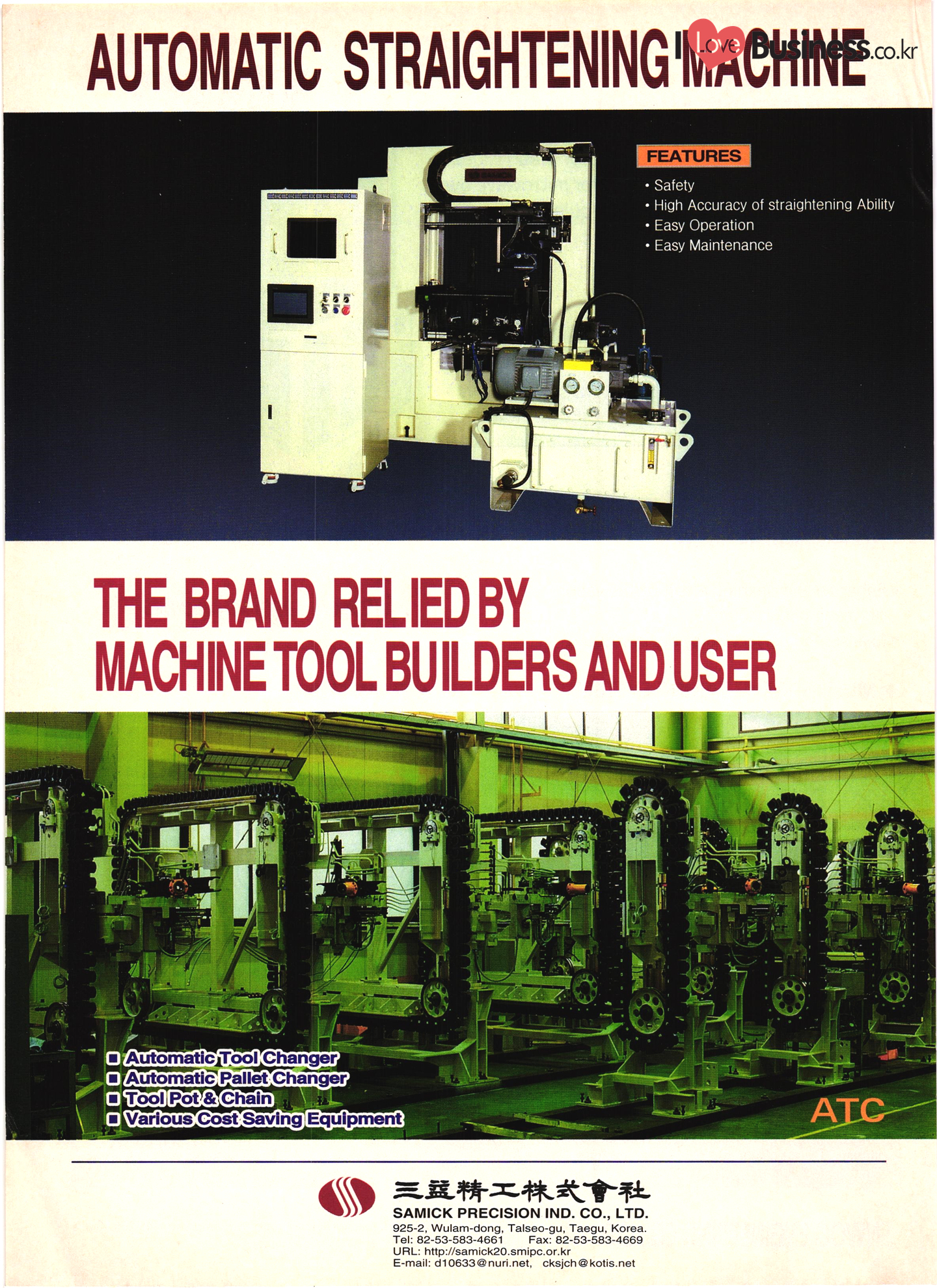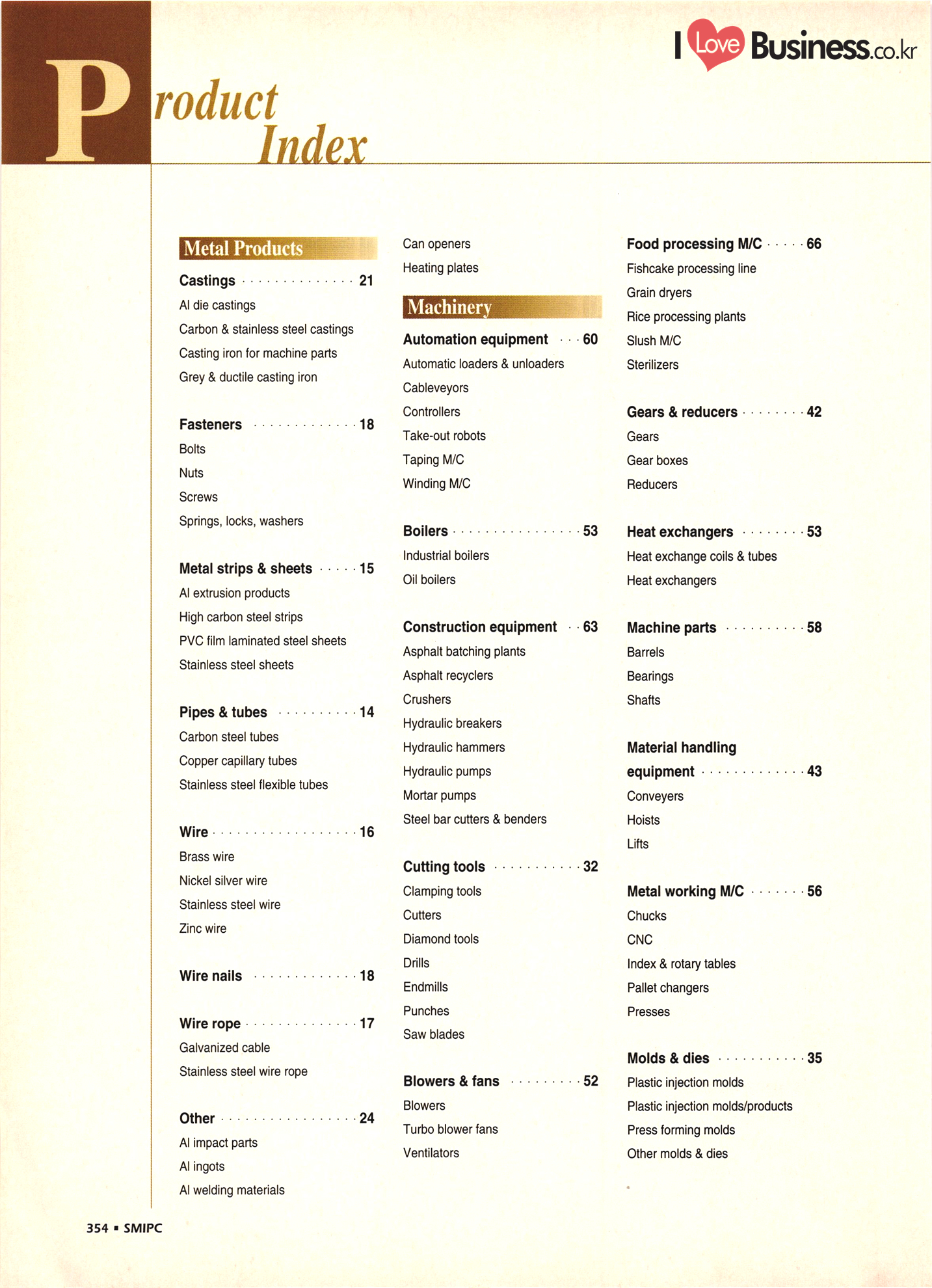 | I Love Business.co.kr small ME www.smallme.co.kr Quality Products from Korea CONTENTS • Metal Products • Machinery ..... Precision Equipment & Instrumentation • Electronic & Electric Products ........ 119 • Automobile Parts & ................... 191 Other Transportation Equipment • Chemical Products • Textile & Leather Products ......... Published on Aug. 5, 1998 by Small & Medium Industry Promotion Corporation (SMIPC) Add: 24-3, Yoido-dong, Yongdungpo-gu, Seoul, Korea Tel: (82-2)769-6841-50 Fax: (82-2)769-6959, 782-9702 E-mail: webmaster@smipc.or.kr URL: http://www.smipc.or.kr http://home.smipc.or.kr • Building Materials · • Household & Misc. Goods ........... Edited by Maekyung Buyers Guide Corp. Add: Trade Center PO Box 8, Seoul, Korea Tel: (82-2)551-2376-90 Fax: (82-2)551-2377, 2383 E-mail: mkbg@buyersguide.co.kr URL: http://www.buyersguide.co.kr Price: W20,000 Love Business Machinery Cutting tools Molds & dies Gears & reducers Material handling equipment Pumps & compressors Valves & fittings Blowers & fans Boilers Heat exchangers Packing M/C Metal working M/C Machine parts Welding M/C Automation equipment Construction equipment Food processing M/C Textile M/C & parts Paper working M/C Printing M/C Plastic processing M/C Semiconductor manufacturing equipment Refrigerators & air handling equipment 'Water treatment equipment Other industrial M/C |
