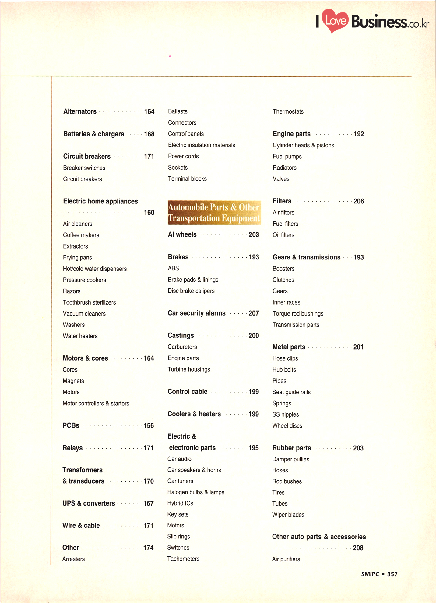 Precision Equipment & Instrumentation Measuring & testing equipment Optical equipment Medical equipment I Love Business.cok Electronic & Electric Products Computer peripherals & accessories Software Business equipment Audio & components Communications equipment & parts CCTV systems Electronic parts & components PCBs Electric home appliances Alternators Motors & cores UPS & converters Batteries & chargers Transformers & transducers Circuit breakers Relays Wire & cable Other I Love Business.co.kr | Automobile Parts & Other Transportation Equipment Engine parts Brakes Gears & transmissions Electric & electronic parts Coolers & heaters Control cable Castings Metal parts Al wheels Rubber parts Filters Car security alarms Other auto parts & accessories Ship machinery & outfitting Lift trucks Heavy equipment parts Bicycle frames |
