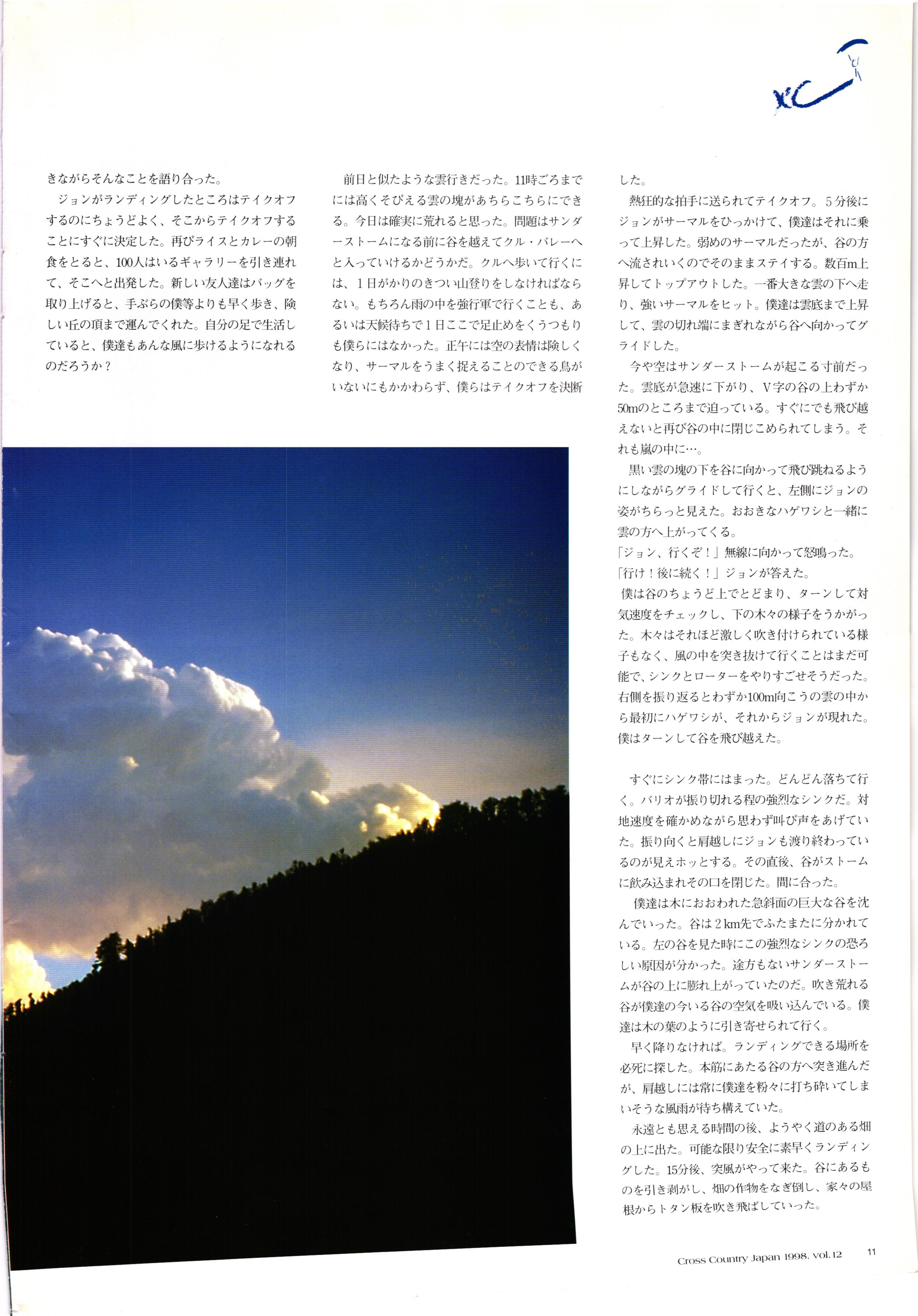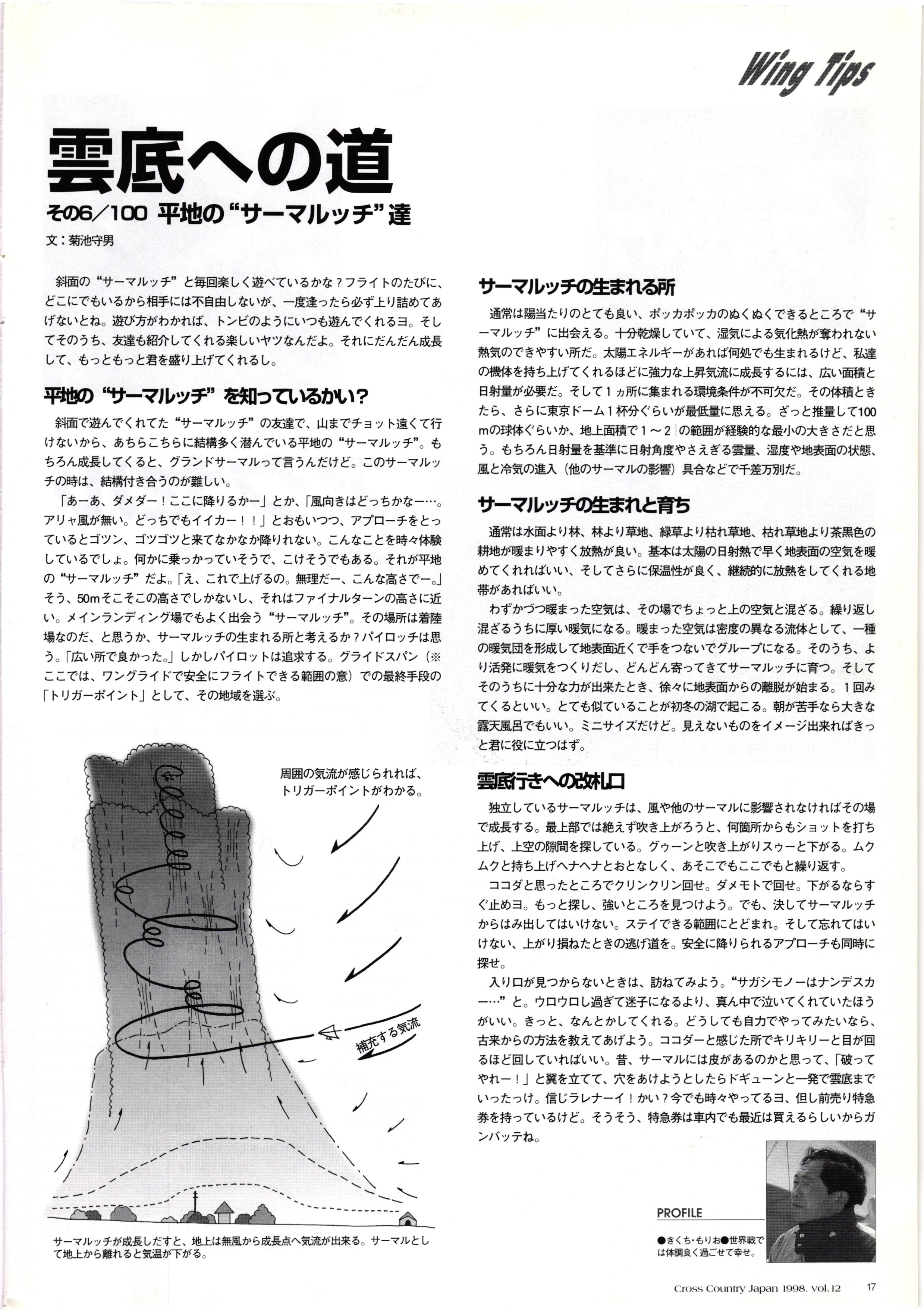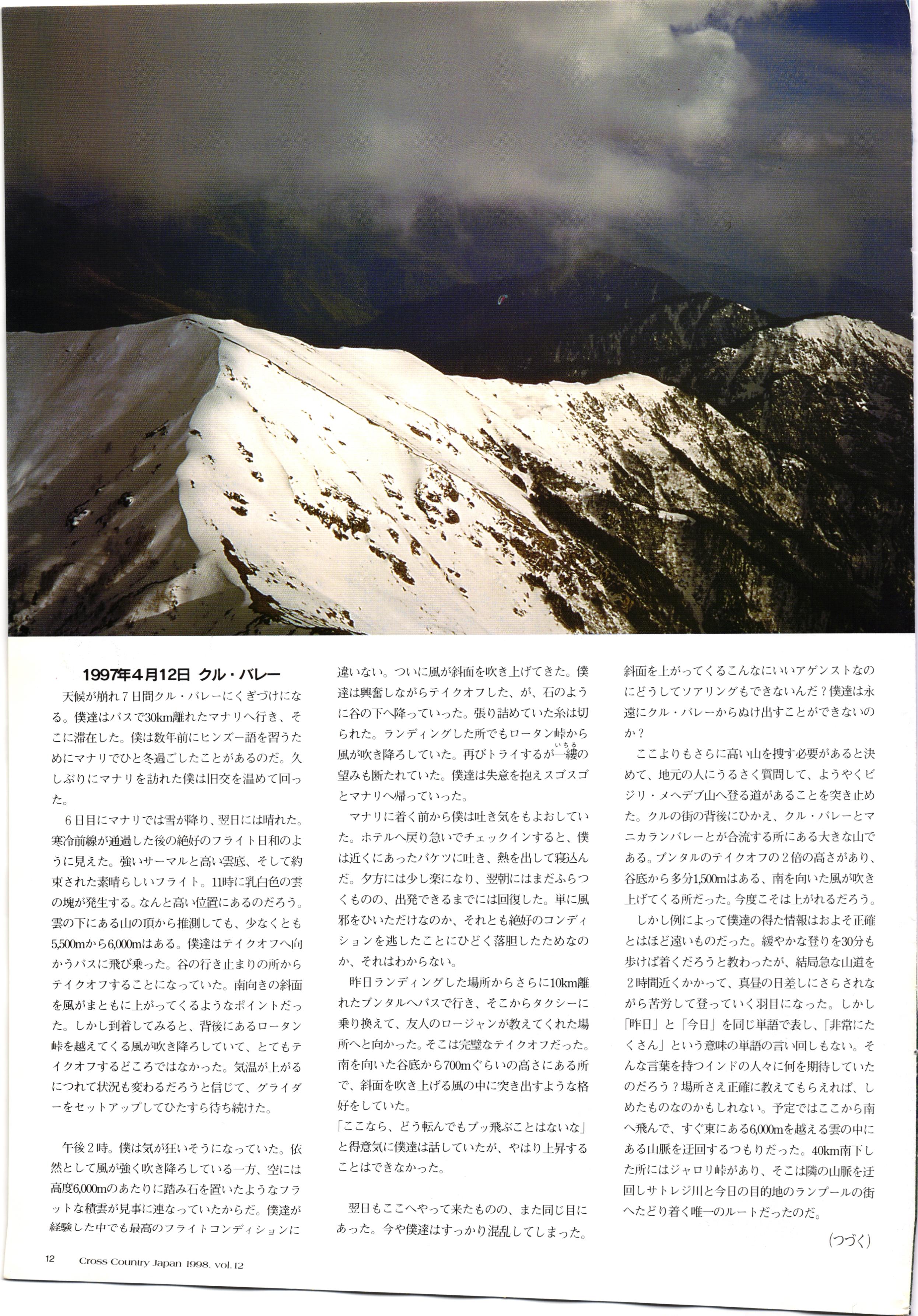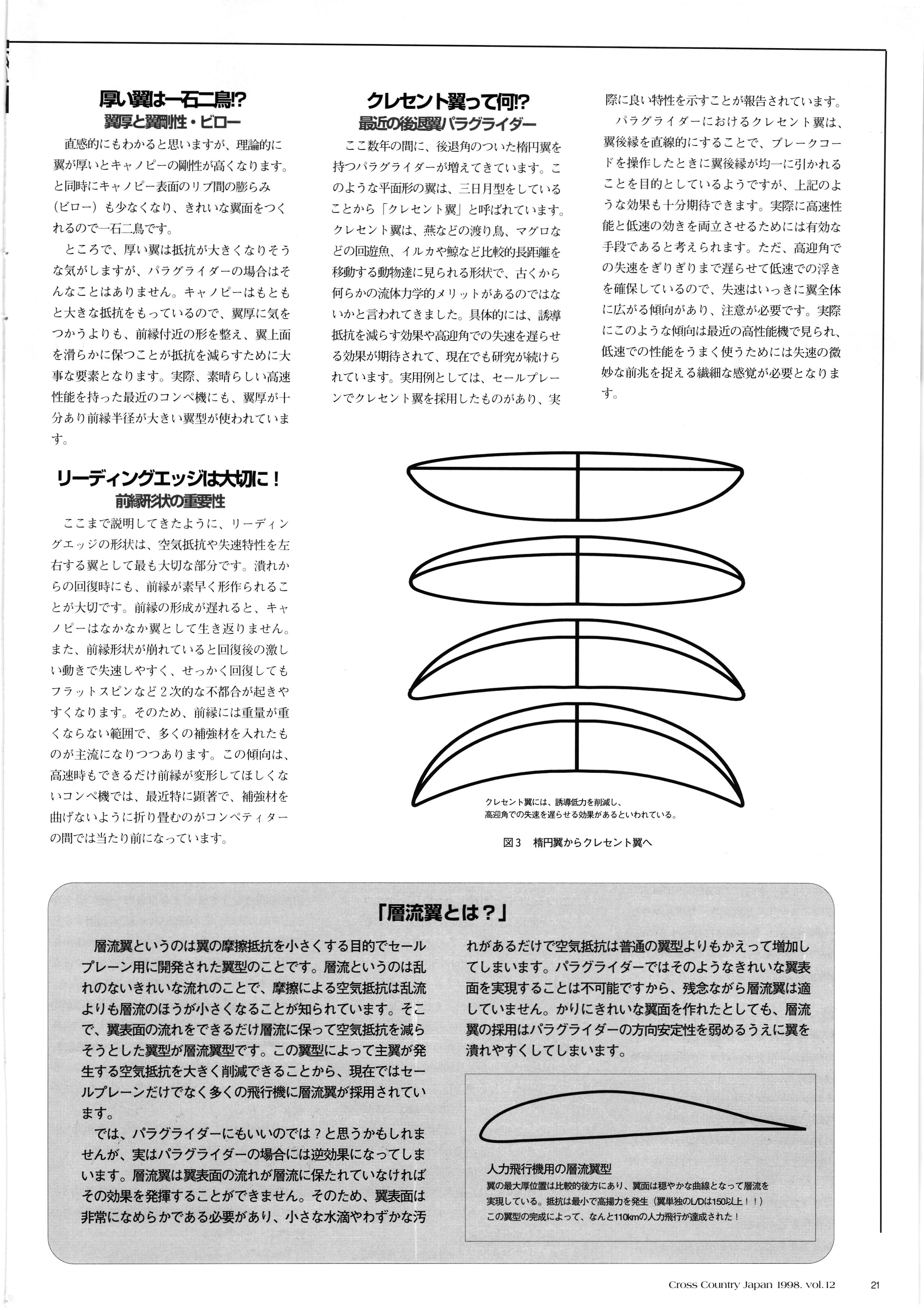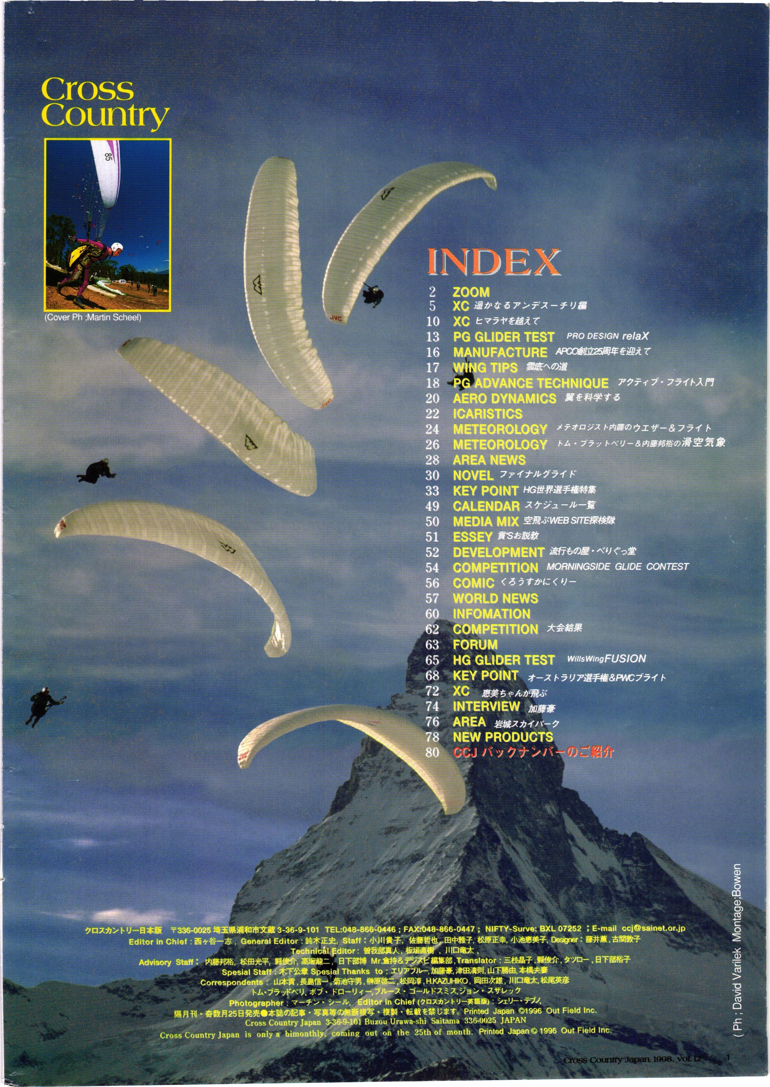 ランス シートはさまる CrOSS Country テる 8 る INDEX (Cover Ph ;Martin Scheel) おいおいおい さっきSafaroid w orld おっさん TIGE SEE にににに な ーーーーーー ちら Download36 wwwwwwwww ww 50 2 ZOOM 5 XC 遥かなるアンデスーチリ編 10 XC ヒマラヤを越えて 13 PG GLIDER TEST PRO DESIGN relax MANUFACTURE APCO立25周年を迎えて WING TIPS への道 ・PG ADVANCE TECHNIQUE アクティブ・フライト入門 20 AERO DYNAMICS 翼を科学する 22 ICARISTICS 24 METEOROLOGY メテオロジスト内藤のウエザー&フライト 26 METEOROLOGY トム・ブラットベリー&内藤邦裕の滑空気象 28 AREA NEWS NOVEL ファイナルグライド KEY POINT HG世界選手権特集 CALENDAR スケジュール一覧 MEDIA MIX 空飛ぶWEB SITE探検隊 51 ESSEY F'Sお説教 52 DEVELOPMENT 流行もの屋・べりぐっ堂 54 COMPETITION MORNINGSIDE GLIDE CONTEST 56.COMIC くろうすかにマリー 57 WORLD NEWS INFOMATION COMPETITION 大会結果 FORUM HG GLIDER TEST Wills WingFUSION 68 KEY POINT オーストラリア選手権&PVCブライト 72 XC 恵美ちゃんが飛ぶ 74 INTERVIEW 加藤豪 AREA 岩城スカイパーク 78 NEW PRODUCTS 80CCJバックナンバーのご紹介 00 ara おはなし ランタン ところまではまた。 勝 ます チタン あると すみま クロスカントリー日本版〒336-0025 埼玉県浦和市文蔵 3-36-9-101 TEL:048-866-0446; FAX:048-866-0447; NIFTY-Surve: BXL 07252 E-mail ccj@sainet.or.jp Editor in Chiet:西ヶ谷一志,General Editor;鈴木正史. Staff:小川貴子,佐藤哲也,田中雅子、松原正幸, 小池恵美子, Designer:藤井薫、古関敦子 Technical Editor:曾我部真人,板堀橋、川口竜太 Advisory Stat: 内藤邦裕、松田光平、休校、高塚龍二,日下部博 Mr.倉持&デジスビ緒集部,Translator:三枝晶子,縣俊介,タツロー、日下部裕子 - Spesial State:木下公• Spesial Thanks to:エリアブルー、加藤原, 津田清則, 山下勝田、本樹夫療 Correspondents: 山本黄、長島信一菊池守男、榊原啓二,松岡寧, H.KAZUHIKO, 岡田次雄、川口竜太、松尾英彦 トム・ブラッドベリ、ボブ・ドローリィーブルース・ゴールドスミス、ジョン・スザレック」 Photographer : マーチン・シール Editor in Chief (クロスカントリー英語版):シェリー・デブリ 月刊・奇数月25日発売●本誌の記事・写感等の無断複写・複製・転載を禁じます。Printed Japan. ©1996 Out Field inc. Cross Country Japan 3-36-9-101 Buzou Urawa-shi Saitama 336-0025 JAPAN Cross Country Japan is only a bimonthly, coming out on the 25th of month. Printed Japan © 1996 Out Field Inc. (Ph; David Varilek Montage;Bowen おは さ行 Cross Country Japan 1998. vol. 12 カントリー cha nasonicon