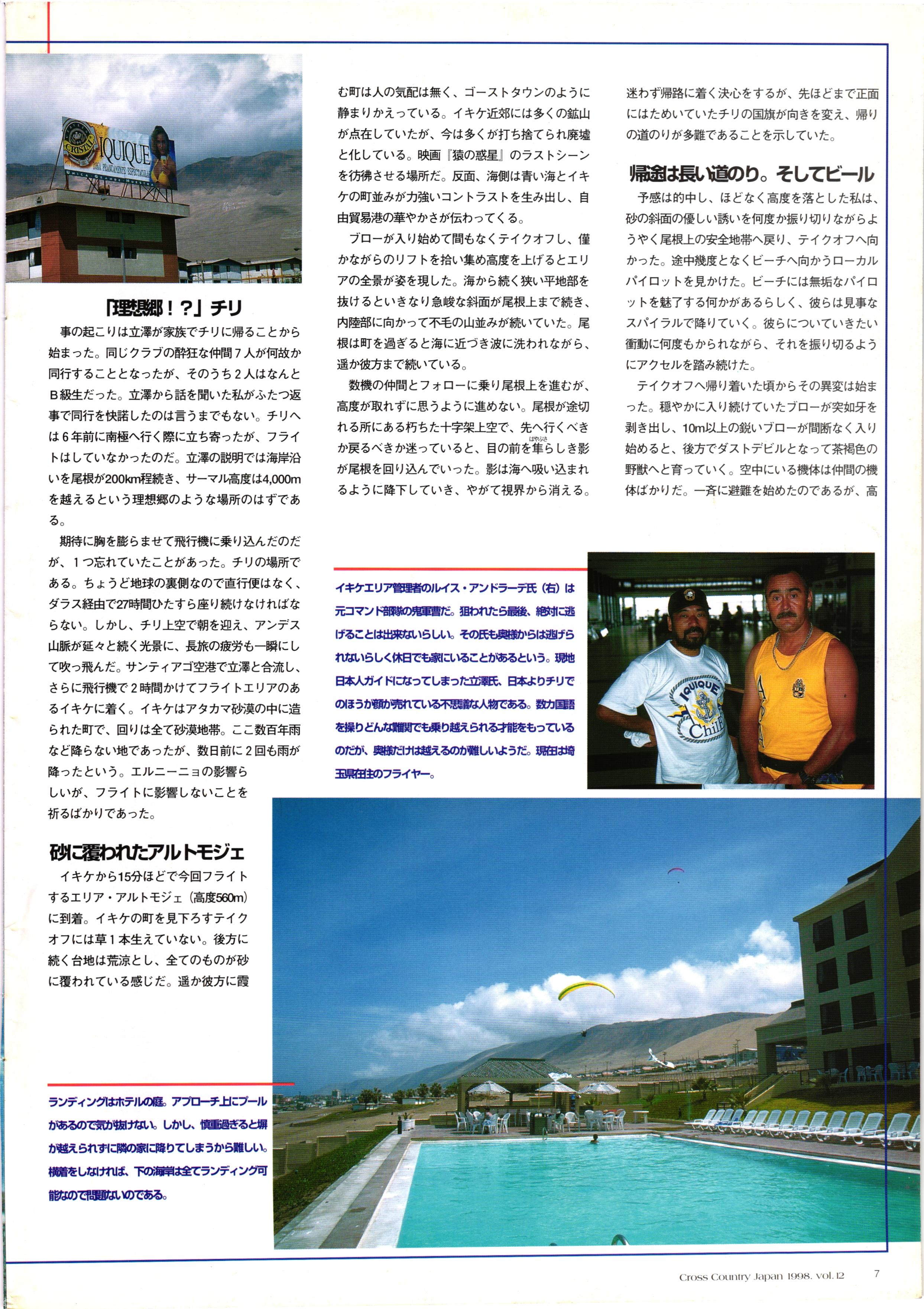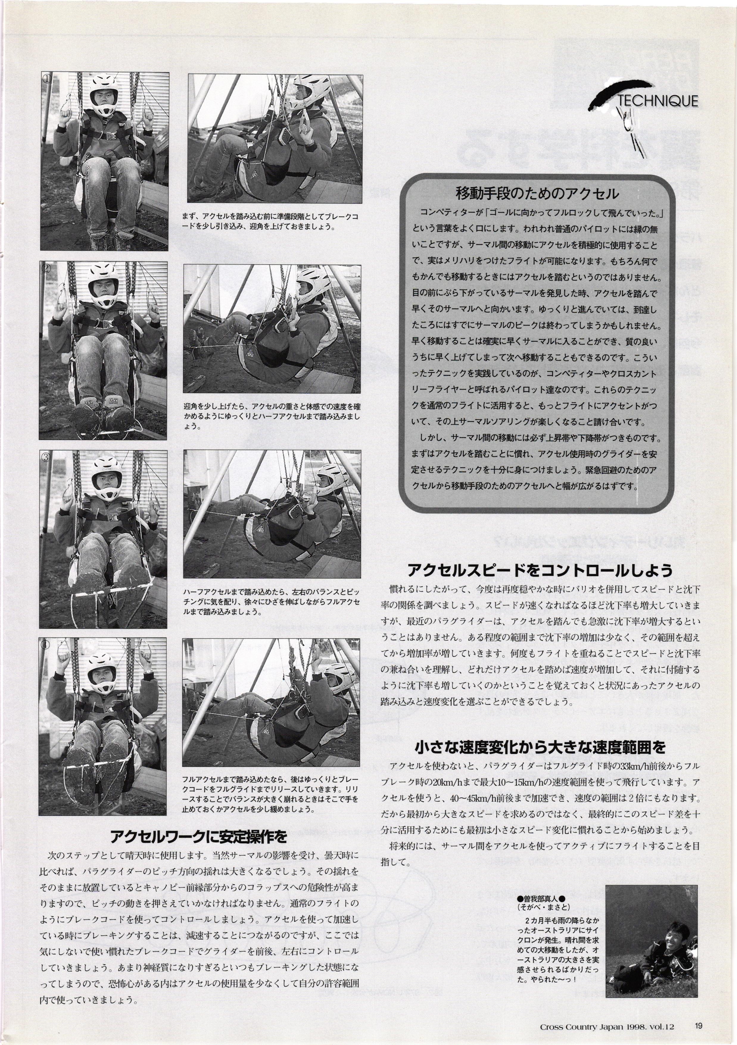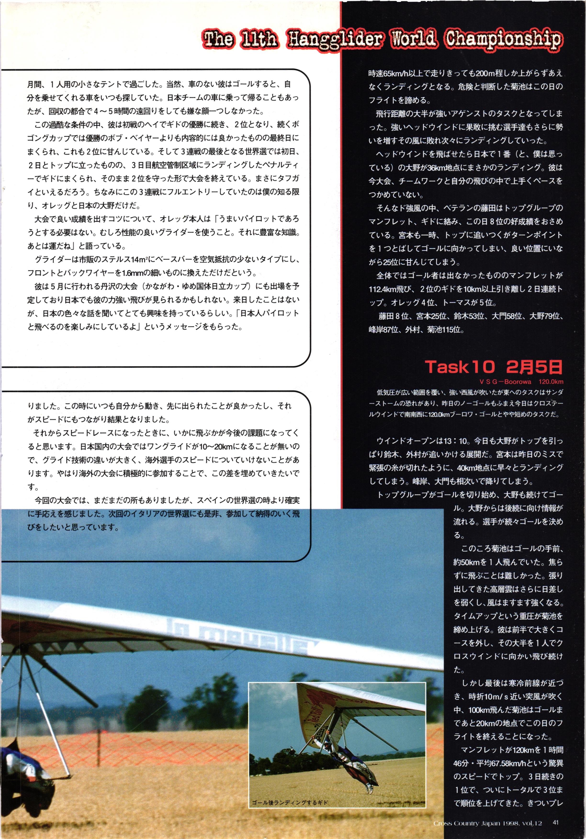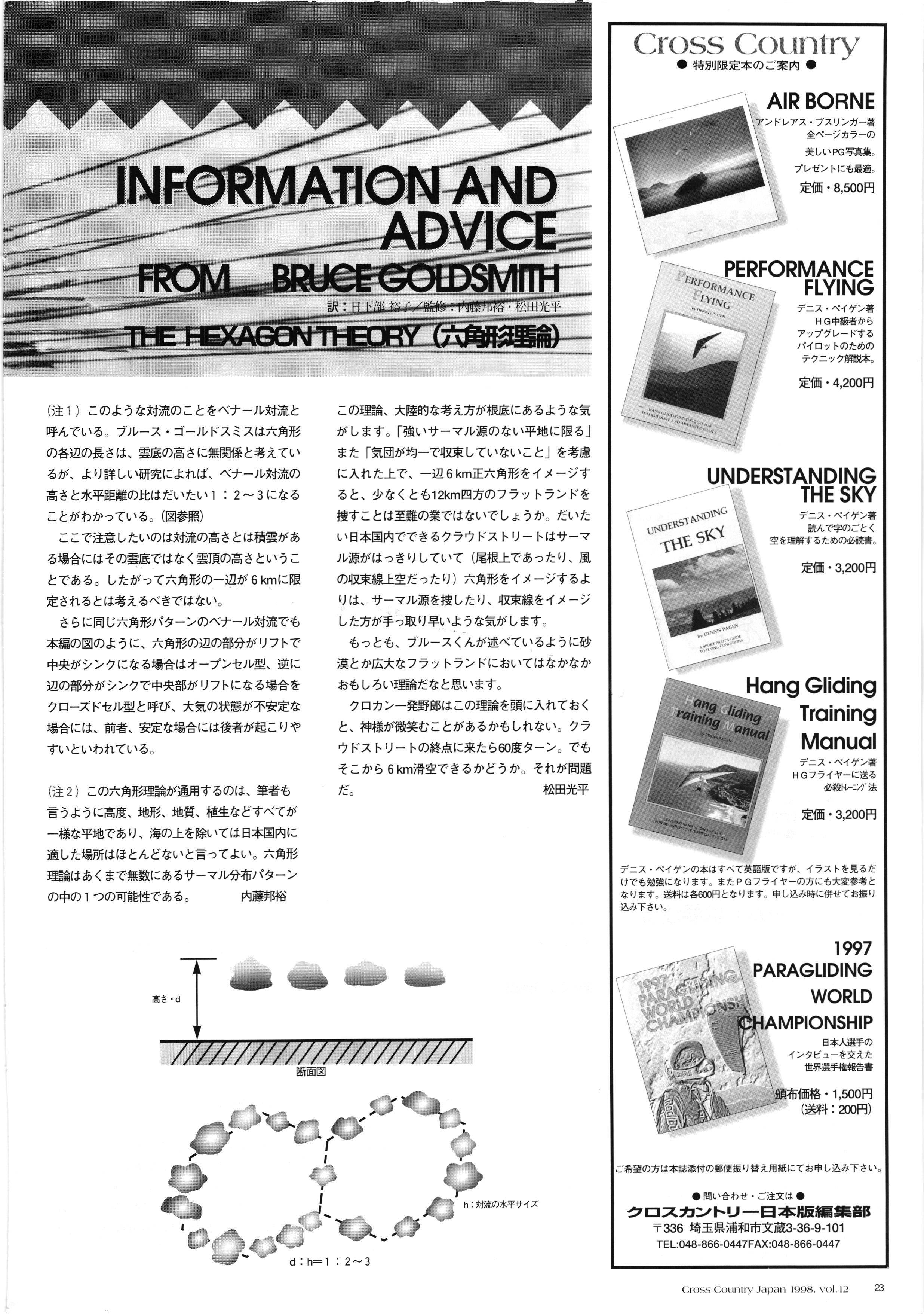 ランス シートはさまる CrOSS Country テる 8 る INDEX (Cover Ph ;Martin Scheel) おいおいおい さっきSafaroid w orld おっさん TIGE SEE にににに な ーーーーーー ちら Download36 wwwwwwwww ww 50 2 ZOOM 5 XC 遥かなるアンデスーチリ編 10 XC ヒマラヤを越えて 13 PG GLIDER TEST PRO DESIGN relax MANUFACTURE APCO立25周年を迎えて WING TIPS への道 ・PG ADVANCE TECHNIQUE アクティブ・フライト入門 20 AERO DYNAMICS 翼を科学する 22 ICARISTICS 24 METEOROLOGY メテオロジスト内藤のウエザー&フライト 26 METEOROLOGY トム・ブラットベリー&内藤邦裕の滑空気象 28 AREA NEWS NOVEL ファイナルグライド KEY POINT HG世界選手権特集 CALENDAR スケジュール一覧 MEDIA MIX 空飛ぶWEB SITE探検隊 51 ESSEY F'Sお説教 52 DEVELOPMENT 流行もの屋・べりぐっ堂 54 COMPETITION MORNINGSIDE GLIDE CONTEST 56.COMIC くろうすかにマリー 57 WORLD NEWS INFOMATION COMPETITION 大会結果 FORUM HG GLIDER TEST Wills WingFUSION 68 KEY POINT オーストラリア選手権&PVCブライト 72 XC 恵美ちゃんが飛ぶ 74 INTERVIEW 加藤豪 AREA 岩城スカイパーク 78 NEW PRODUCTS 80CCJバックナンバーのご紹介 00 ara おはなし ランタン ところまではまた。 勝 ます チタン あると すみま クロスカントリー日本版〒336-0025 埼玉県浦和市文蔵 3-36-9-101 TEL:048-866-0446; FAX:048-866-0447; NIFTY-Surve: BXL 07252 E-mail ccj@sainet.or.jp Editor in Chiet:西ヶ谷一志,General Editor;鈴木正史. Staff:小川貴子,佐藤哲也,田中雅子、松原正幸, 小池恵美子, Designer:藤井薫、古関敦子 Technical Editor:曾我部真人,板堀橋、川口竜太 Advisory Stat: 内藤邦裕、松田光平、休校、高塚龍二,日下部博 Mr.倉持&デジスビ緒集部,Translator:三枝晶子,縣俊介,タツロー、日下部裕子 - Spesial State:木下公• Spesial Thanks to:エリアブルー、加藤原, 津田清則, 山下勝田、本樹夫療 Correspondents: 山本黄、長島信一菊池守男、榊原啓二,松岡寧, H.KAZUHIKO, 岡田次雄、川口竜太、松尾英彦 トム・ブラッドベリ、ボブ・ドローリィーブルース・ゴールドスミス、ジョン・スザレック」 Photographer : マーチン・シール Editor in Chief (クロスカントリー英語版):シェリー・デブリ 月刊・奇数月25日発売●本誌の記事・写感等の無断複写・複製・転載を禁じます。Printed Japan. ©1996 Out Field inc. Cross Country Japan 3-36-9-101 Buzou Urawa-shi Saitama 336-0025 JAPAN Cross Country Japan is only a bimonthly, coming out on the 25th of month. Printed Japan © 1996 Out Field Inc. (Ph; David Varilek Montage;Bowen おは さ行 Cross Country Japan 1998. vol. 12 カントリー cha nasonicon