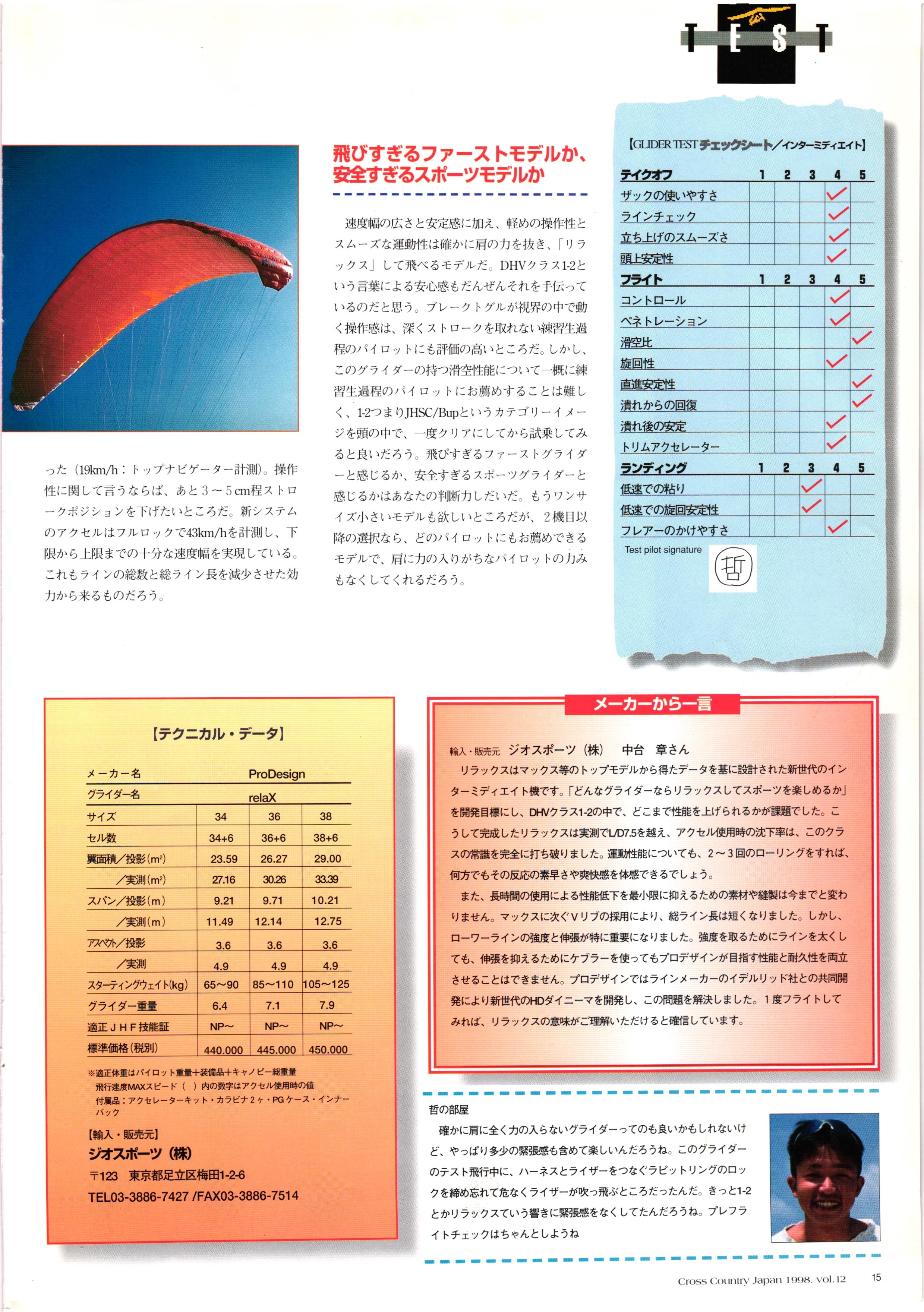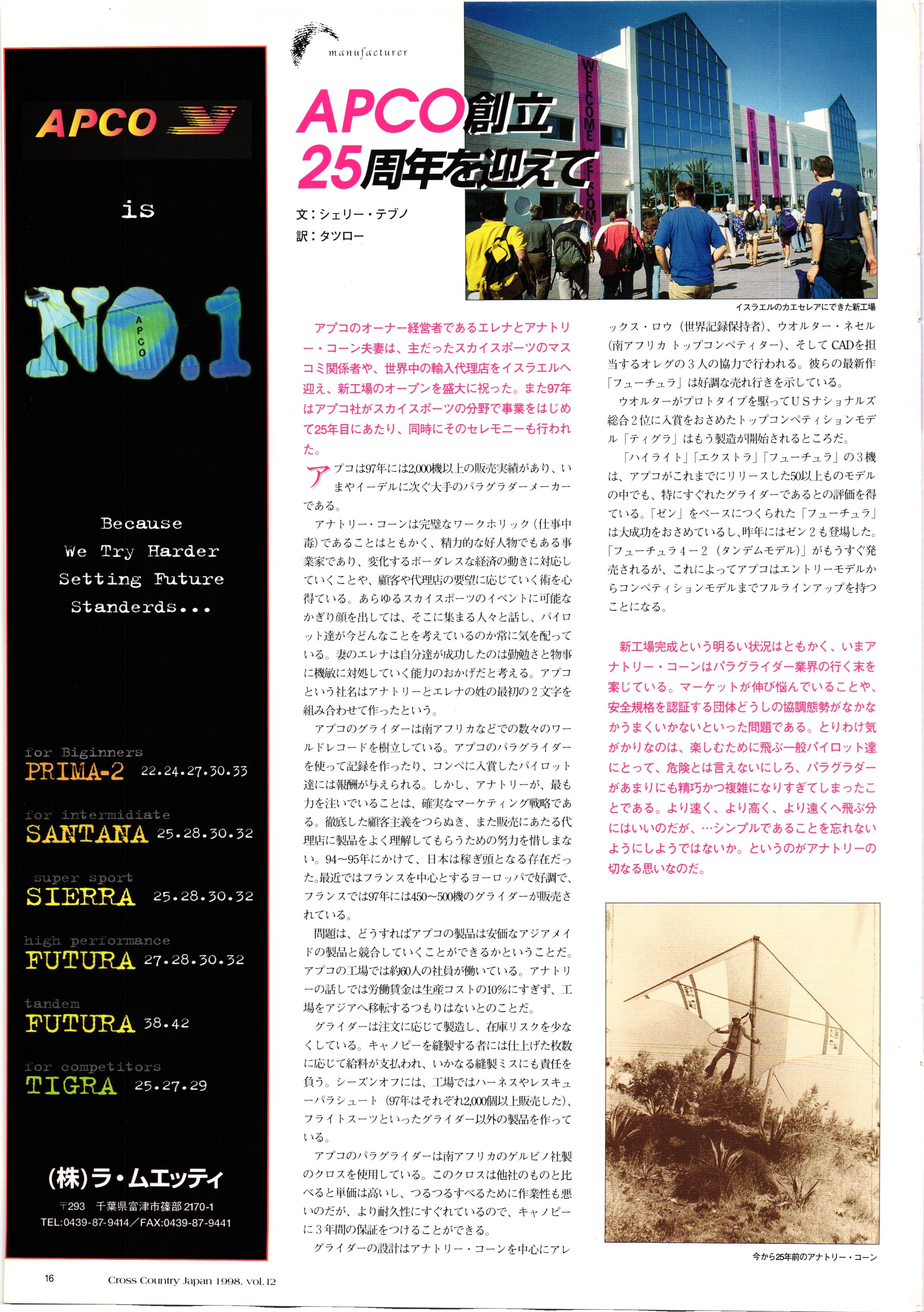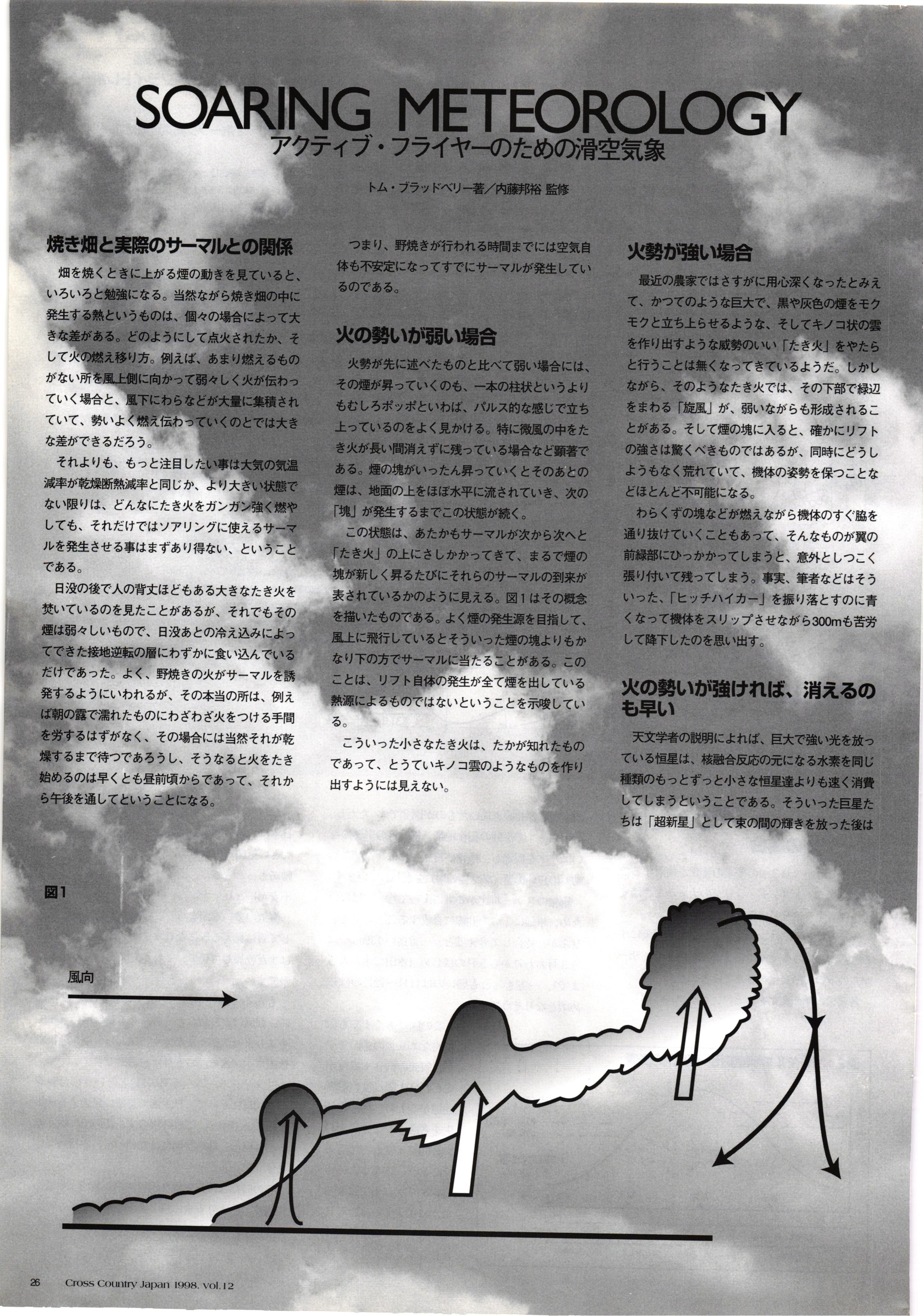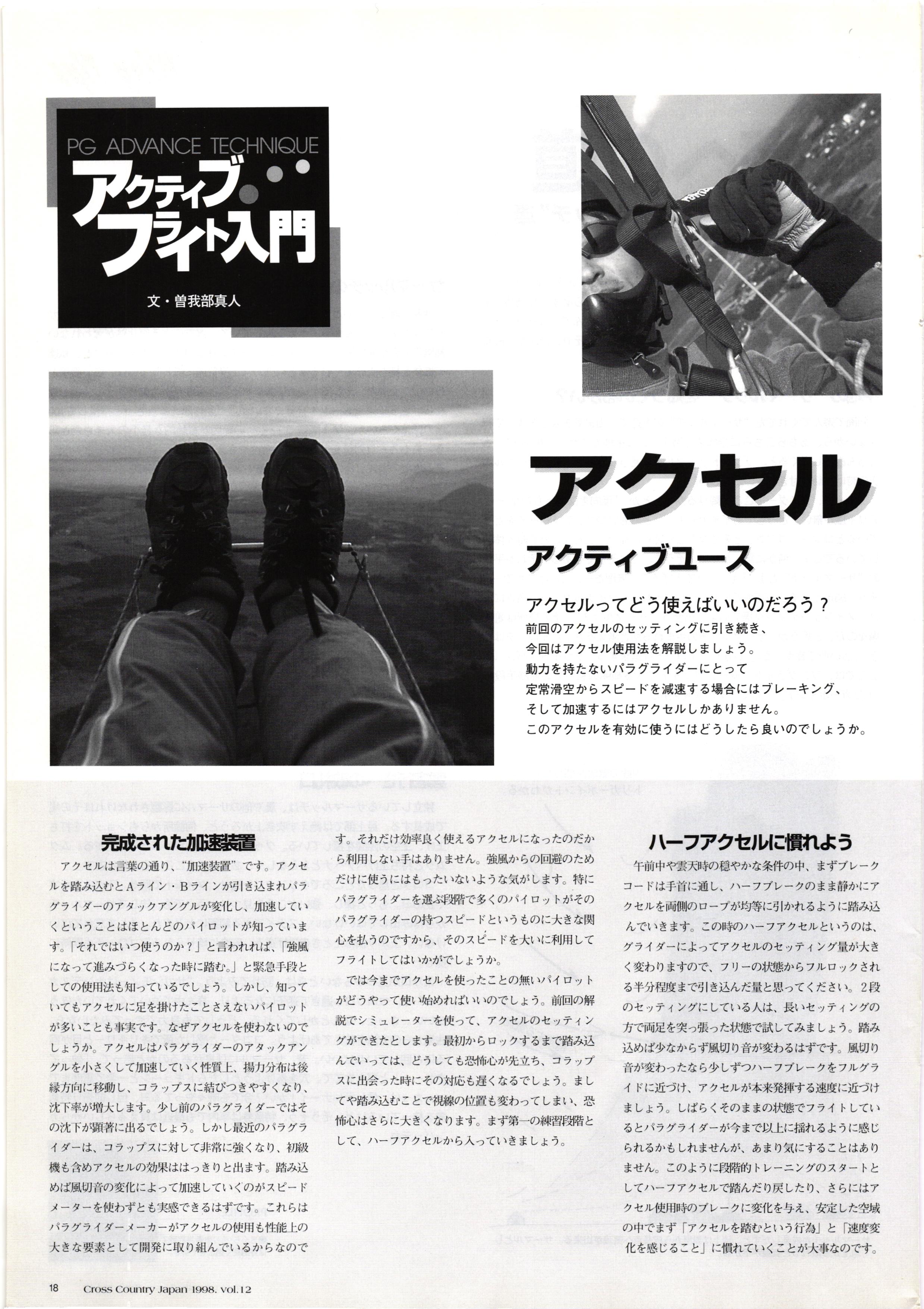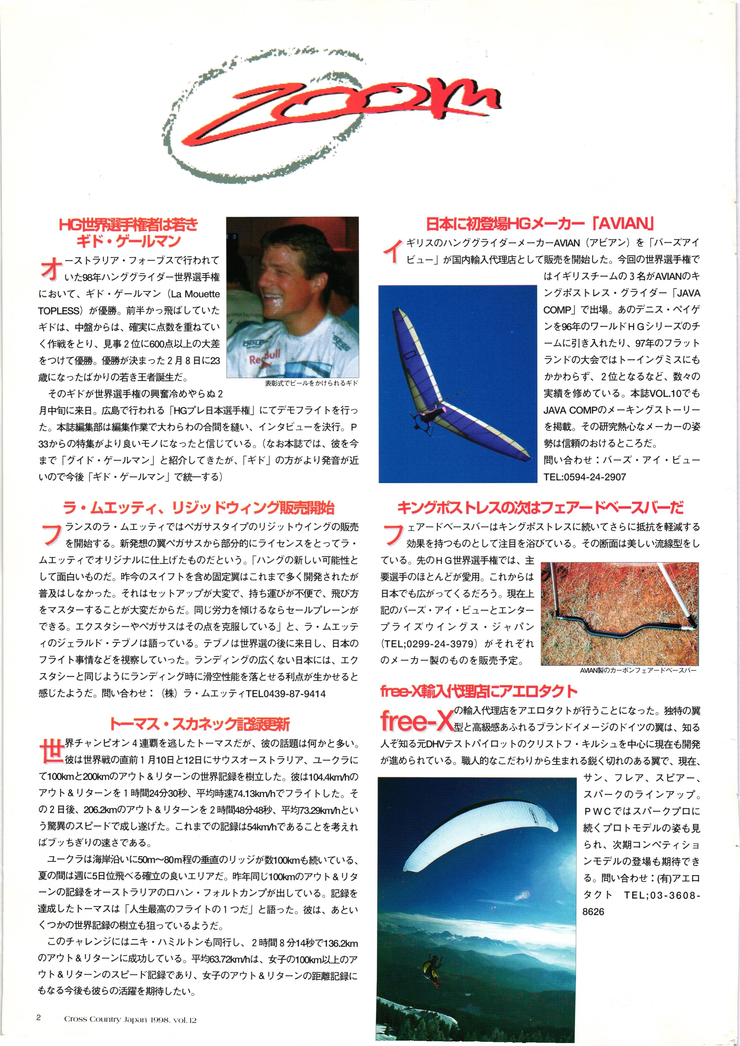 ランス シートはさまる CrOSS Country テる 8 る INDEX (Cover Ph ;Martin Scheel) おいおいおい さっきSafaroid w orld おっさん TIGE SEE にににに な ーーーーーー ちら Download36 wwwwwwwww ww 50 2 ZOOM 5 XC 遥かなるアンデスーチリ編 10 XC ヒマラヤを越えて 13 PG GLIDER TEST PRO DESIGN relax MANUFACTURE APCO立25周年を迎えて WING TIPS への道 ・PG ADVANCE TECHNIQUE アクティブ・フライト入門 20 AERO DYNAMICS 翼を科学する 22 ICARISTICS 24 METEOROLOGY メテオロジスト内藤のウエザー&フライト 26 METEOROLOGY トム・ブラットベリー&内藤邦裕の滑空気象 28 AREA NEWS NOVEL ファイナルグライド KEY POINT HG世界選手権特集 CALENDAR スケジュール一覧 MEDIA MIX 空飛ぶWEB SITE探検隊 51 ESSEY F'Sお説教 52 DEVELOPMENT 流行もの屋・べりぐっ堂 54 COMPETITION MORNINGSIDE GLIDE CONTEST 56.COMIC くろうすかにマリー 57 WORLD NEWS INFOMATION COMPETITION 大会結果 FORUM HG GLIDER TEST Wills WingFUSION 68 KEY POINT オーストラリア選手権&PVCブライト 72 XC 恵美ちゃんが飛ぶ 74 INTERVIEW 加藤豪 AREA 岩城スカイパーク 78 NEW PRODUCTS 80CCJバックナンバーのご紹介 00 ara おはなし ランタン ところまではまた。 勝 ます チタン あると すみま クロスカントリー日本版〒336-0025 埼玉県浦和市文蔵 3-36-9-101 TEL:048-866-0446; FAX:048-866-0447; NIFTY-Surve: BXL 07252 E-mail ccj@sainet.or.jp Editor in Chiet:西ヶ谷一志,General Editor;鈴木正史. Staff:小川貴子,佐藤哲也,田中雅子、松原正幸, 小池恵美子, Designer:藤井薫、古関敦子 Technical Editor:曾我部真人,板堀橋、川口竜太 Advisory Stat: 内藤邦裕、松田光平、休校、高塚龍二,日下部博 Mr.倉持&デジスビ緒集部,Translator:三枝晶子,縣俊介,タツロー、日下部裕子 - Spesial State:木下公• Spesial Thanks to:エリアブルー、加藤原, 津田清則, 山下勝田、本樹夫療 Correspondents: 山本黄、長島信一菊池守男、榊原啓二,松岡寧, H.KAZUHIKO, 岡田次雄、川口竜太、松尾英彦 トム・ブラッドベリ、ボブ・ドローリィーブルース・ゴールドスミス、ジョン・スザレック」 Photographer : マーチン・シール Editor in Chief (クロスカントリー英語版):シェリー・デブリ 月刊・奇数月25日発売●本誌の記事・写感等の無断複写・複製・転載を禁じます。Printed Japan. ©1996 Out Field inc. Cross Country Japan 3-36-9-101 Buzou Urawa-shi Saitama 336-0025 JAPAN Cross Country Japan is only a bimonthly, coming out on the 25th of month. Printed Japan © 1996 Out Field Inc. (Ph; David Varilek Montage;Bowen おは さ行 Cross Country Japan 1998. vol. 12 カントリー cha nasonicon