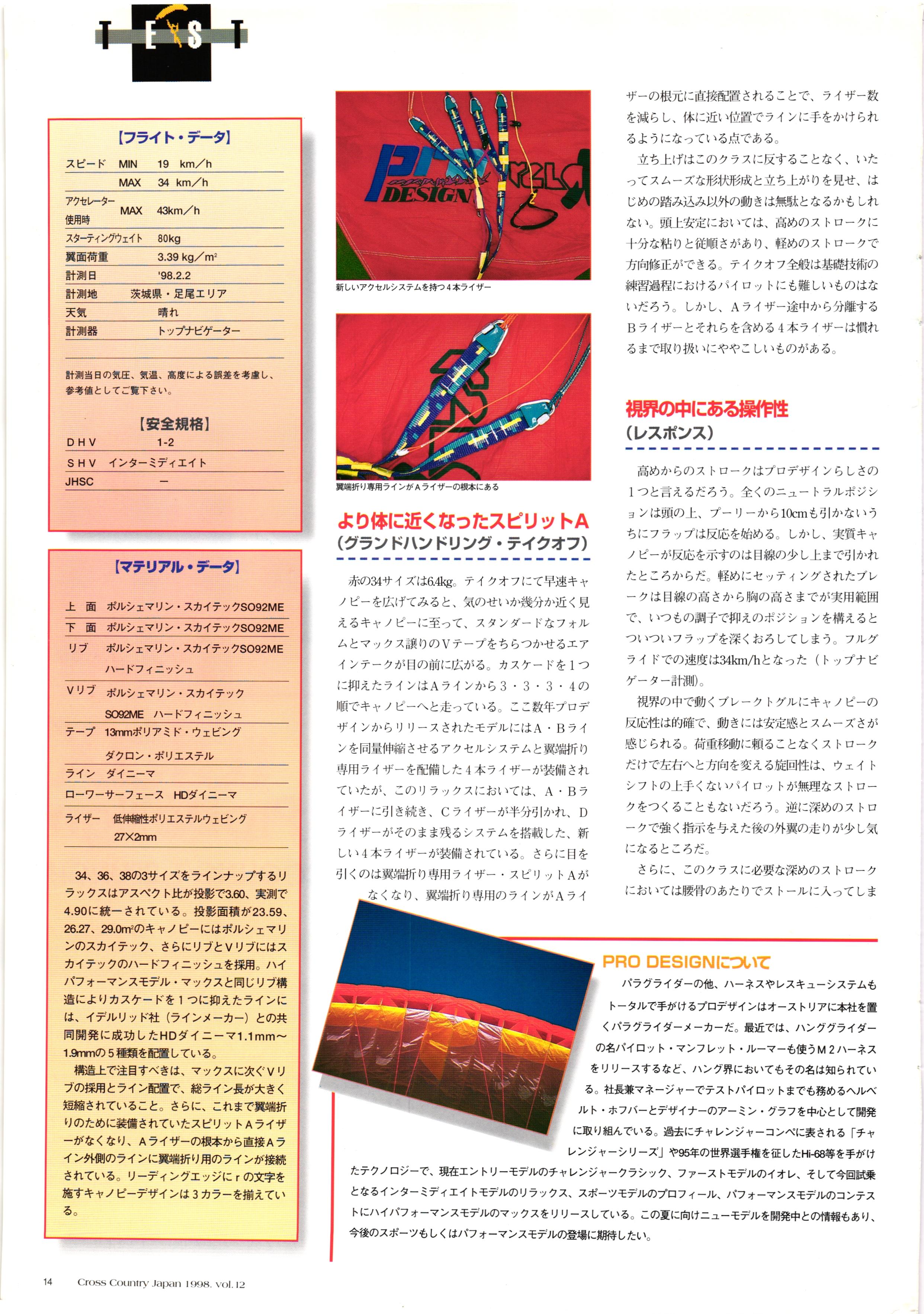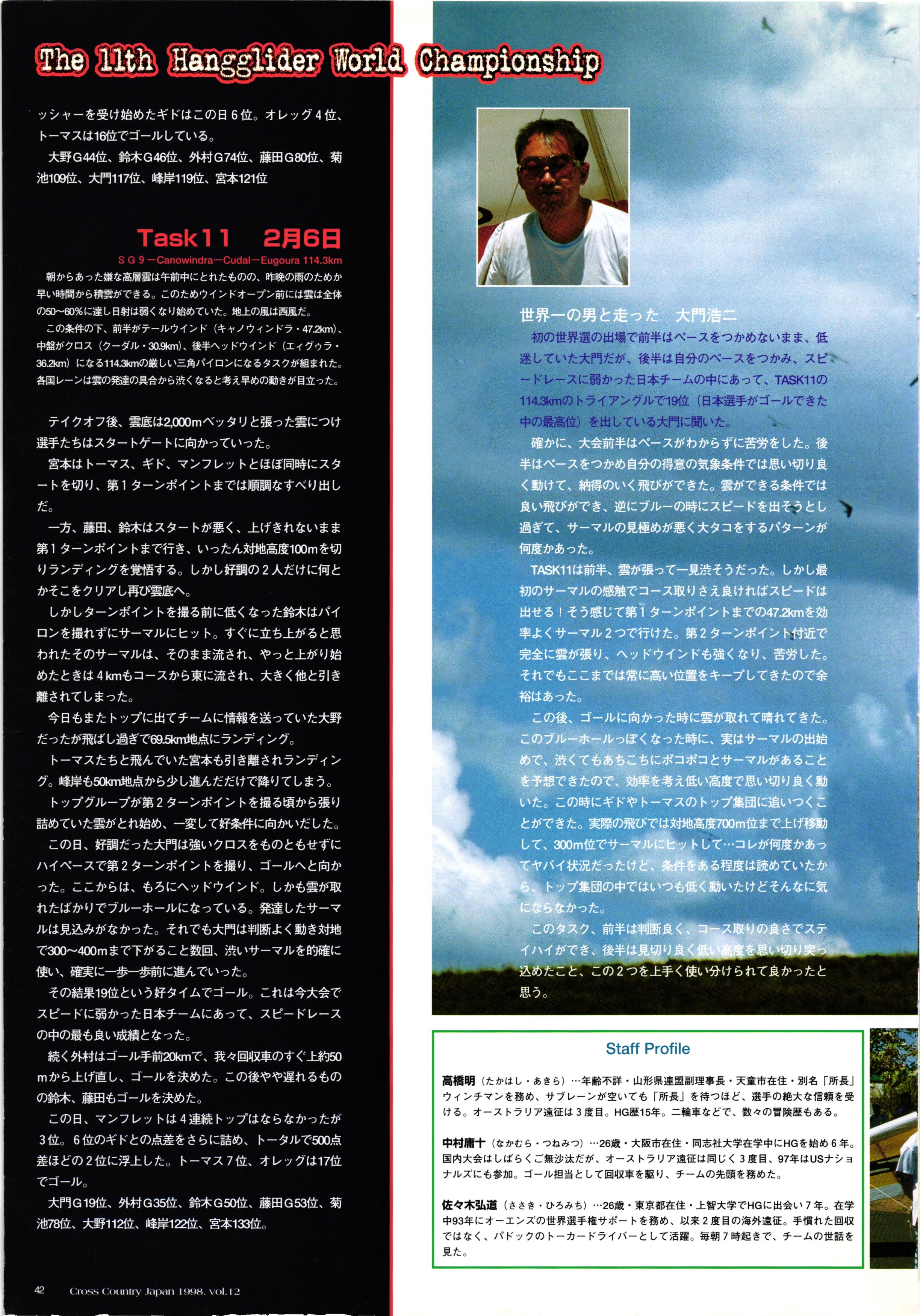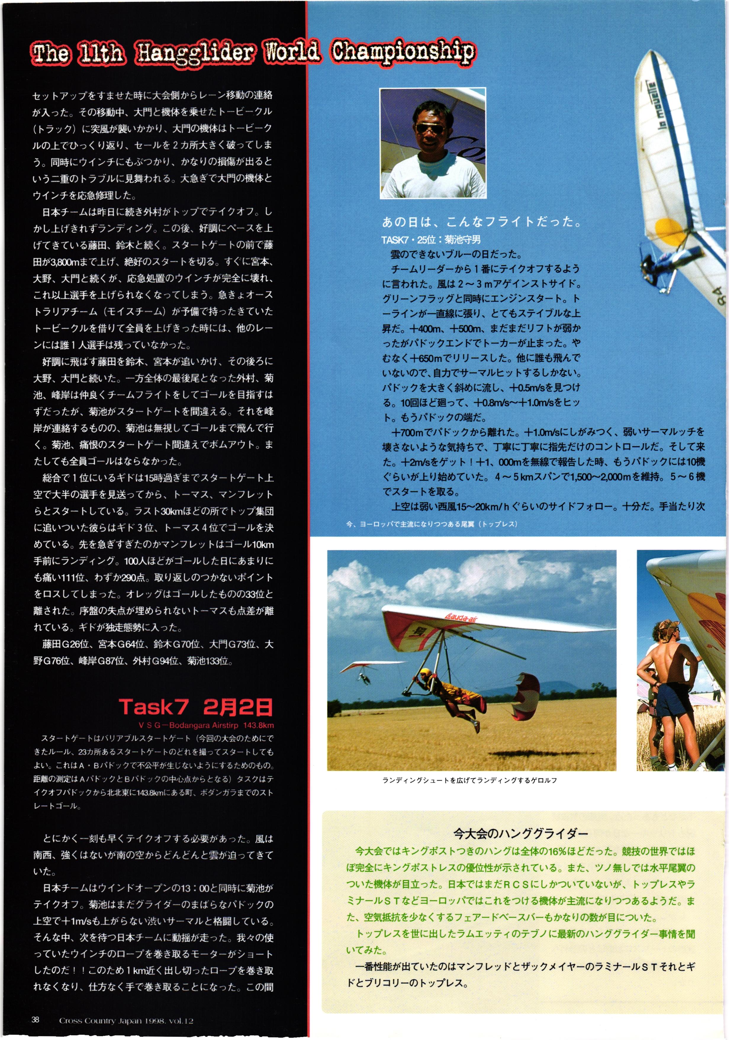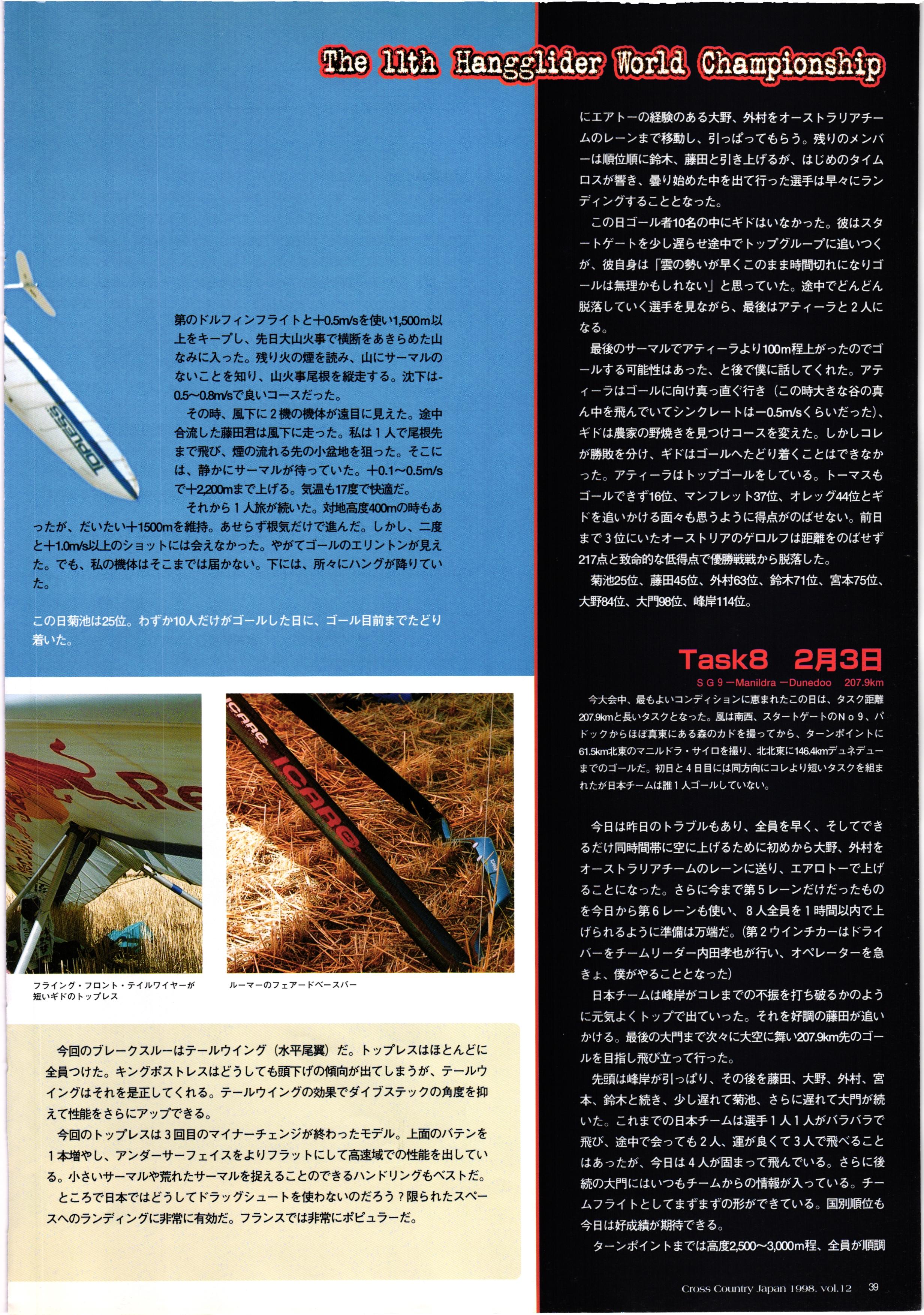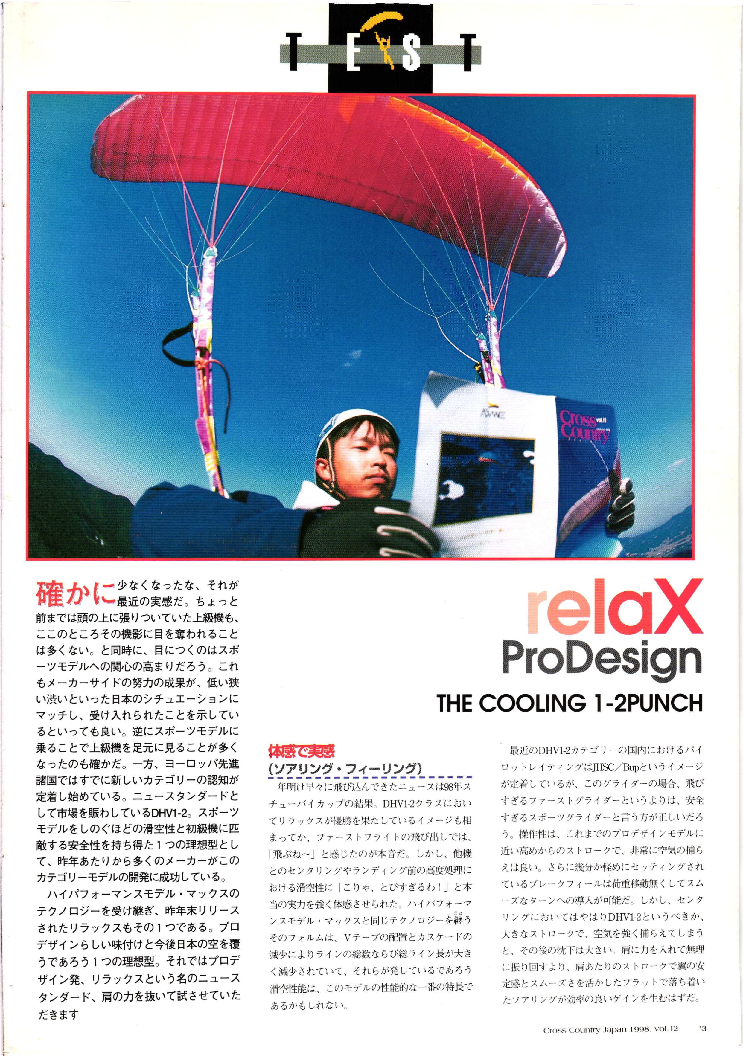 ランス シートはさまる CrOSS Country テる 8 る INDEX (Cover Ph ;Martin Scheel) おいおいおい さっきSafaroid w orld おっさん TIGE SEE にににに な ーーーーーー ちら Download36 wwwwwwwww ww 50 2 ZOOM 5 XC 遥かなるアンデスーチリ編 10 XC ヒマラヤを越えて 13 PG GLIDER TEST PRO DESIGN relax MANUFACTURE APCO立25周年を迎えて WING TIPS への道 ・PG ADVANCE TECHNIQUE アクティブ・フライト入門 20 AERO DYNAMICS 翼を科学する 22 ICARISTICS 24 METEOROLOGY メテオロジスト内藤のウエザー&フライト 26 METEOROLOGY トム・ブラットベリー&内藤邦裕の滑空気象 28 AREA NEWS NOVEL ファイナルグライド KEY POINT HG世界選手権特集 CALENDAR スケジュール一覧 MEDIA MIX 空飛ぶWEB SITE探検隊 51 ESSEY F'Sお説教 52 DEVELOPMENT 流行もの屋・べりぐっ堂 54 COMPETITION MORNINGSIDE GLIDE CONTEST 56.COMIC くろうすかにマリー 57 WORLD NEWS INFOMATION COMPETITION 大会結果 FORUM HG GLIDER TEST Wills WingFUSION 68 KEY POINT オーストラリア選手権&PVCブライト 72 XC 恵美ちゃんが飛ぶ 74 INTERVIEW 加藤豪 AREA 岩城スカイパーク 78 NEW PRODUCTS 80CCJバックナンバーのご紹介 00 ara おはなし ランタン ところまではまた。 勝 ます チタン あると すみま クロスカントリー日本版〒336-0025 埼玉県浦和市文蔵 3-36-9-101 TEL:048-866-0446; FAX:048-866-0447; NIFTY-Surve: BXL 07252 E-mail ccj@sainet.or.jp Editor in Chiet:西ヶ谷一志,General Editor;鈴木正史. Staff:小川貴子,佐藤哲也,田中雅子、松原正幸, 小池恵美子, Designer:藤井薫、古関敦子 Technical Editor:曾我部真人,板堀橋、川口竜太 Advisory Stat: 内藤邦裕、松田光平、休校、高塚龍二,日下部博 Mr.倉持&デジスビ緒集部,Translator:三枝晶子,縣俊介,タツロー、日下部裕子 - Spesial State:木下公• Spesial Thanks to:エリアブルー、加藤原, 津田清則, 山下勝田、本樹夫療 Correspondents: 山本黄、長島信一菊池守男、榊原啓二,松岡寧, H.KAZUHIKO, 岡田次雄、川口竜太、松尾英彦 トム・ブラッドベリ、ボブ・ドローリィーブルース・ゴールドスミス、ジョン・スザレック」 Photographer : マーチン・シール Editor in Chief (クロスカントリー英語版):シェリー・デブリ 月刊・奇数月25日発売●本誌の記事・写感等の無断複写・複製・転載を禁じます。Printed Japan. ©1996 Out Field inc. Cross Country Japan 3-36-9-101 Buzou Urawa-shi Saitama 336-0025 JAPAN Cross Country Japan is only a bimonthly, coming out on the 25th of month. Printed Japan © 1996 Out Field Inc. (Ph; David Varilek Montage;Bowen おは さ行 Cross Country Japan 1998. vol. 12 カントリー cha nasonicon