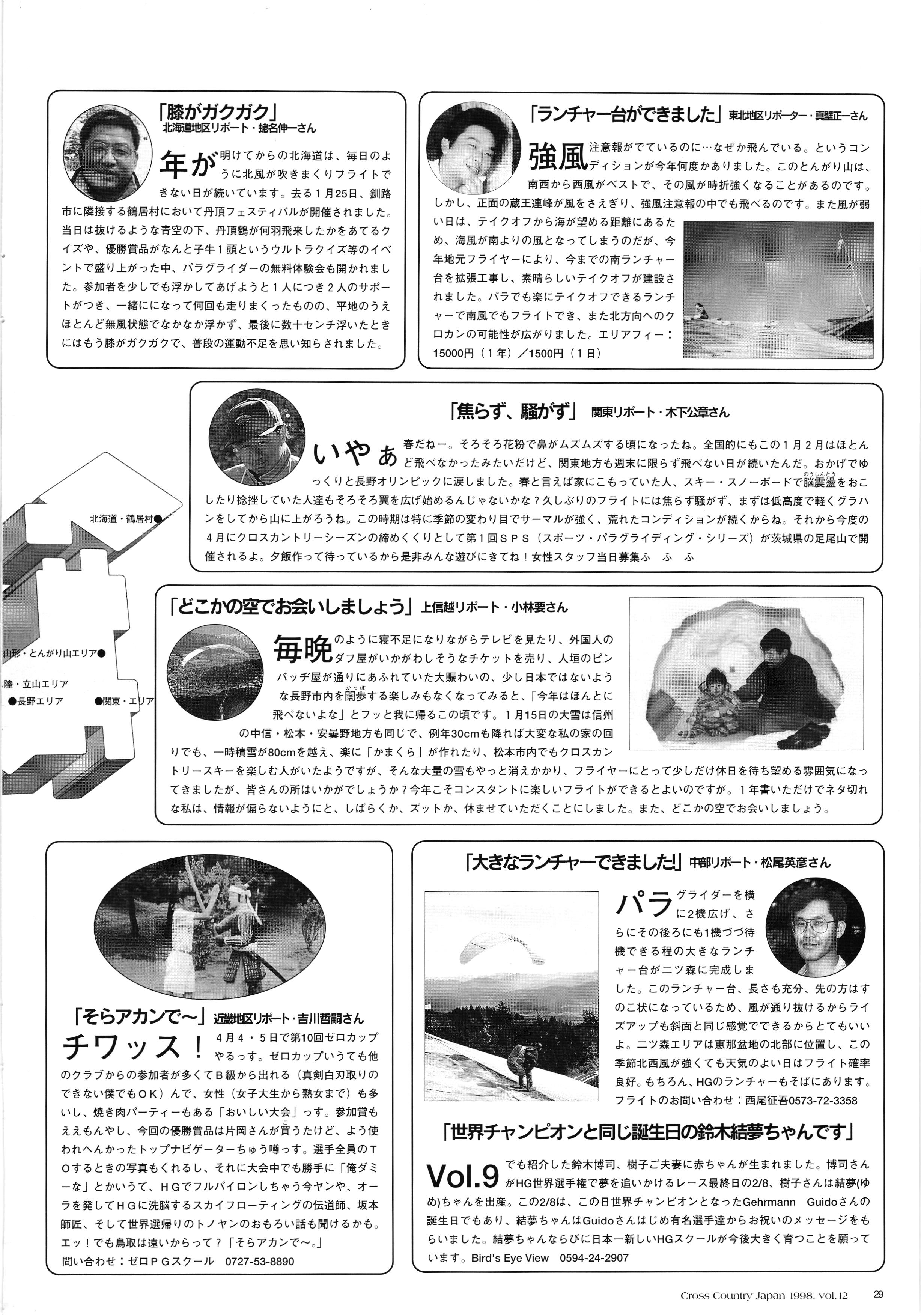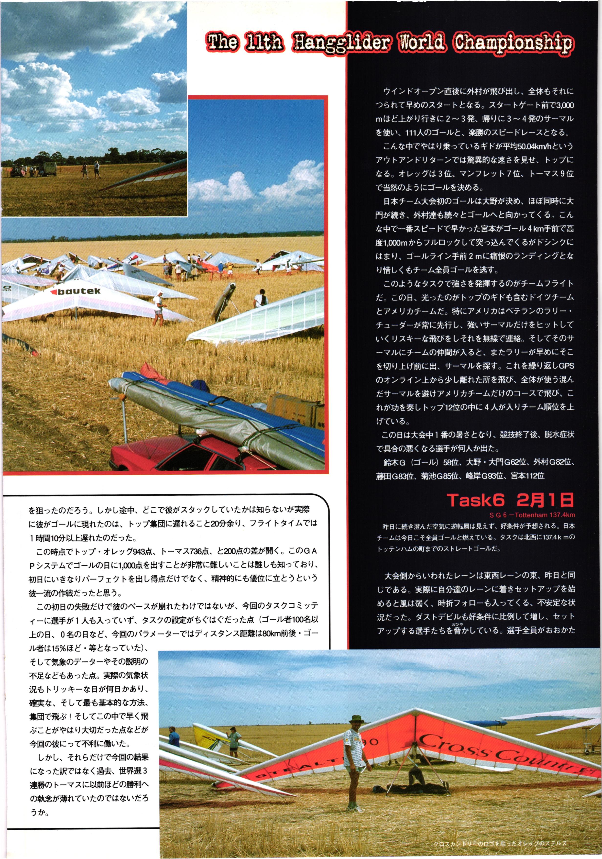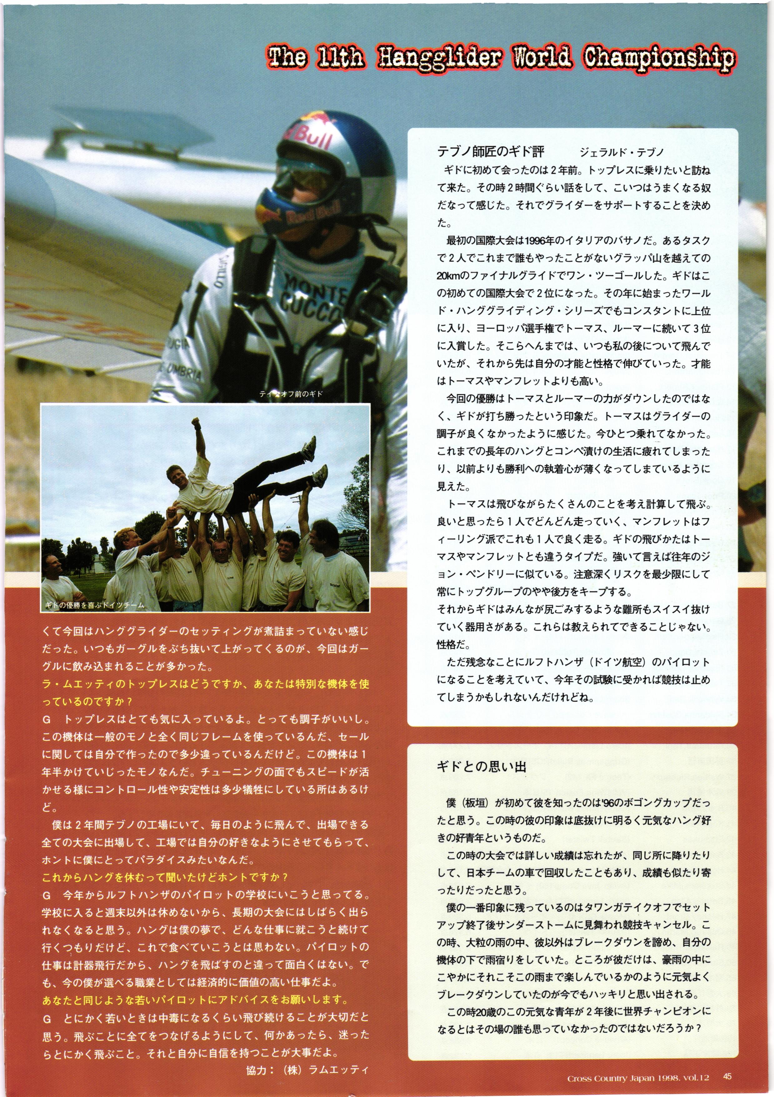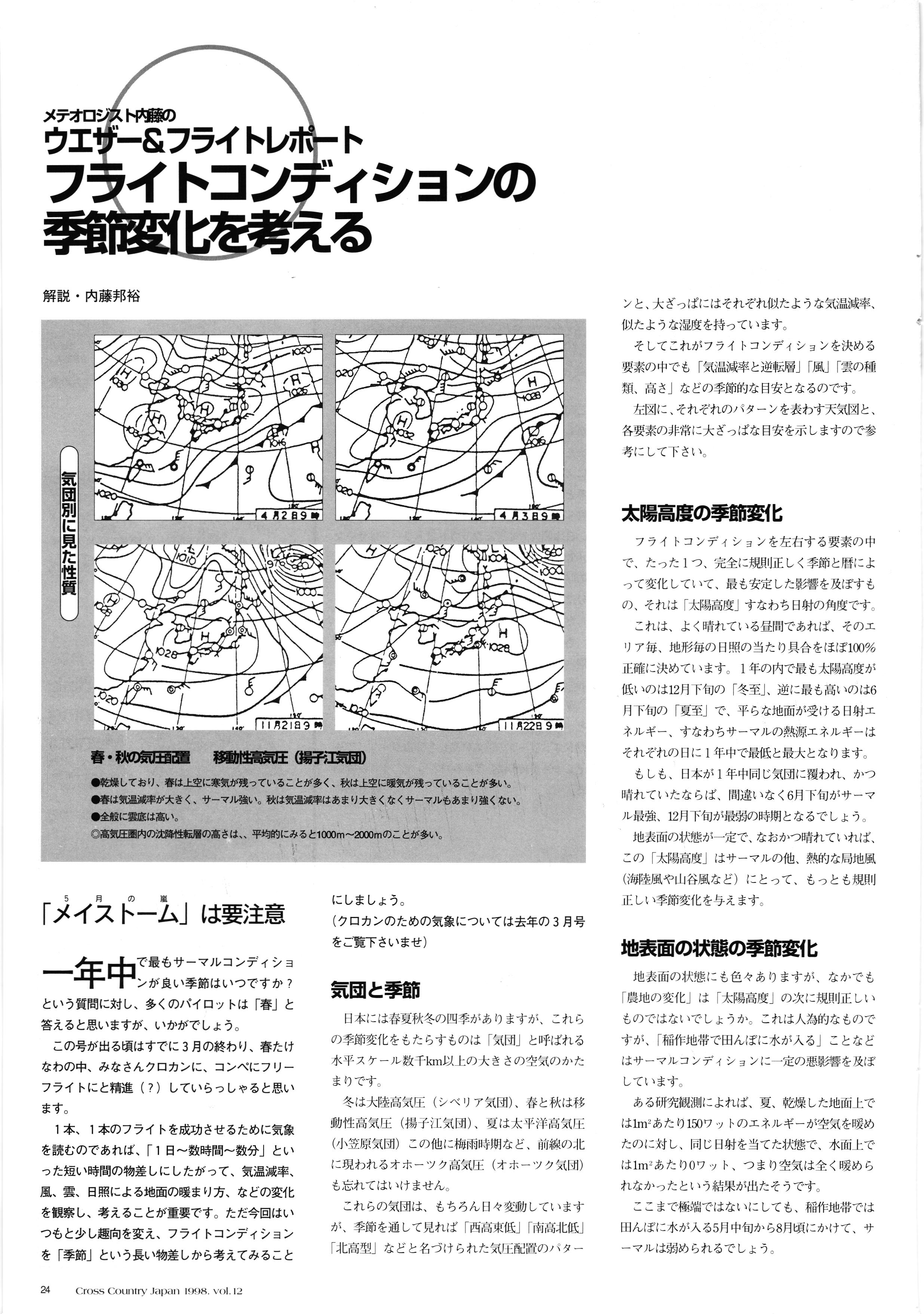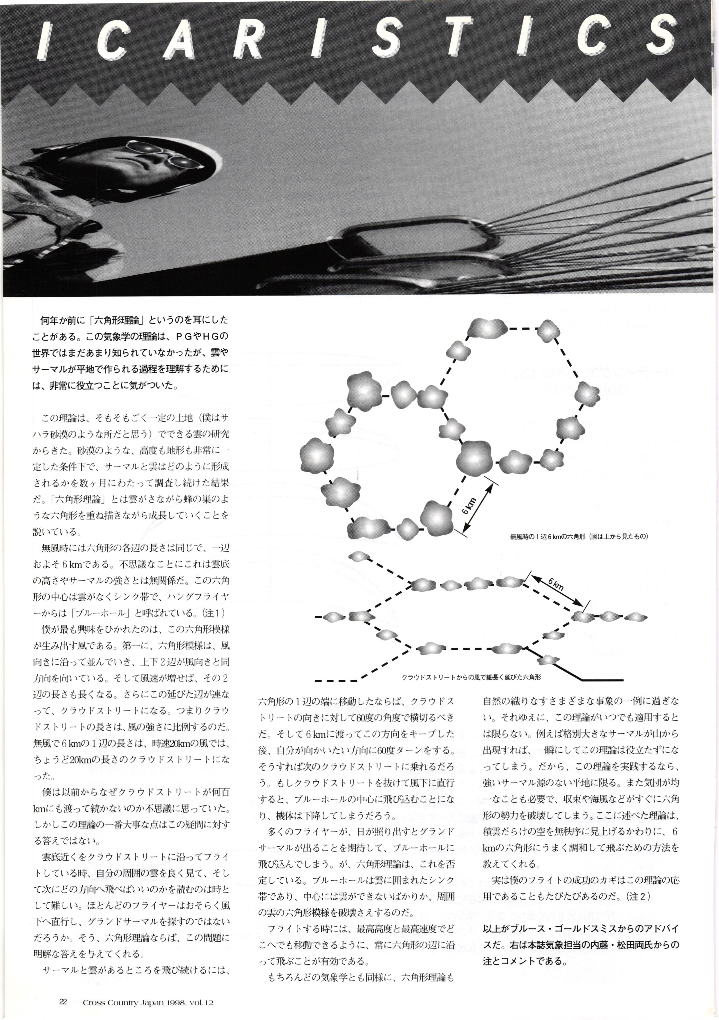 ランス シートはさまる CrOSS Country テる 8 る INDEX (Cover Ph ;Martin Scheel) おいおいおい さっきSafaroid w orld おっさん TIGE SEE にににに な ーーーーーー ちら Download36 wwwwwwwww ww 50 2 ZOOM 5 XC 遥かなるアンデスーチリ編 10 XC ヒマラヤを越えて 13 PG GLIDER TEST PRO DESIGN relax MANUFACTURE APCO立25周年を迎えて WING TIPS への道 ・PG ADVANCE TECHNIQUE アクティブ・フライト入門 20 AERO DYNAMICS 翼を科学する 22 ICARISTICS 24 METEOROLOGY メテオロジスト内藤のウエザー&フライト 26 METEOROLOGY トム・ブラットベリー&内藤邦裕の滑空気象 28 AREA NEWS NOVEL ファイナルグライド KEY POINT HG世界選手権特集 CALENDAR スケジュール一覧 MEDIA MIX 空飛ぶWEB SITE探検隊 51 ESSEY F'Sお説教 52 DEVELOPMENT 流行もの屋・べりぐっ堂 54 COMPETITION MORNINGSIDE GLIDE CONTEST 56.COMIC くろうすかにマリー 57 WORLD NEWS INFOMATION COMPETITION 大会結果 FORUM HG GLIDER TEST Wills WingFUSION 68 KEY POINT オーストラリア選手権&PVCブライト 72 XC 恵美ちゃんが飛ぶ 74 INTERVIEW 加藤豪 AREA 岩城スカイパーク 78 NEW PRODUCTS 80CCJバックナンバーのご紹介 00 ara おはなし ランタン ところまではまた。 勝 ます チタン あると すみま クロスカントリー日本版〒336-0025 埼玉県浦和市文蔵 3-36-9-101 TEL:048-866-0446; FAX:048-866-0447; NIFTY-Surve: BXL 07252 E-mail ccj@sainet.or.jp Editor in Chiet:西ヶ谷一志,General Editor;鈴木正史. Staff:小川貴子,佐藤哲也,田中雅子、松原正幸, 小池恵美子, Designer:藤井薫、古関敦子 Technical Editor:曾我部真人,板堀橋、川口竜太 Advisory Stat: 内藤邦裕、松田光平、休校、高塚龍二,日下部博 Mr.倉持&デジスビ緒集部,Translator:三枝晶子,縣俊介,タツロー、日下部裕子 - Spesial State:木下公• Spesial Thanks to:エリアブルー、加藤原, 津田清則, 山下勝田、本樹夫療 Correspondents: 山本黄、長島信一菊池守男、榊原啓二,松岡寧, H.KAZUHIKO, 岡田次雄、川口竜太、松尾英彦 トム・ブラッドベリ、ボブ・ドローリィーブルース・ゴールドスミス、ジョン・スザレック」 Photographer : マーチン・シール Editor in Chief (クロスカントリー英語版):シェリー・デブリ 月刊・奇数月25日発売●本誌の記事・写感等の無断複写・複製・転載を禁じます。Printed Japan. ©1996 Out Field inc. Cross Country Japan 3-36-9-101 Buzou Urawa-shi Saitama 336-0025 JAPAN Cross Country Japan is only a bimonthly, coming out on the 25th of month. Printed Japan © 1996 Out Field Inc. (Ph; David Varilek Montage;Bowen おは さ行 Cross Country Japan 1998. vol. 12 カントリー cha nasonicon