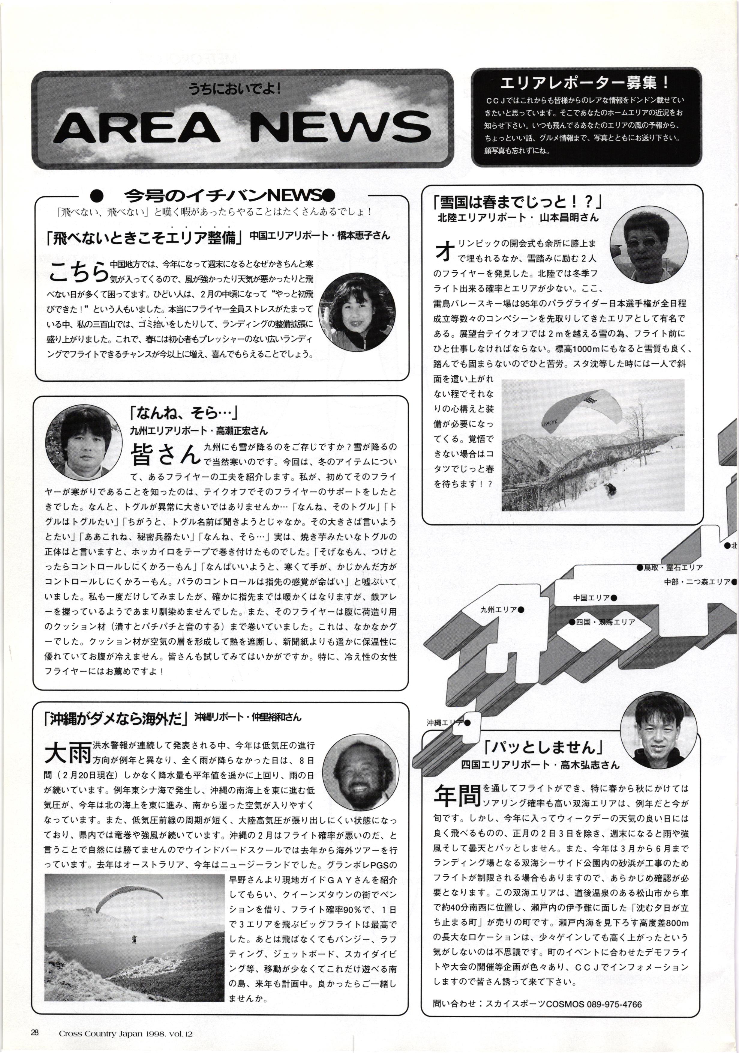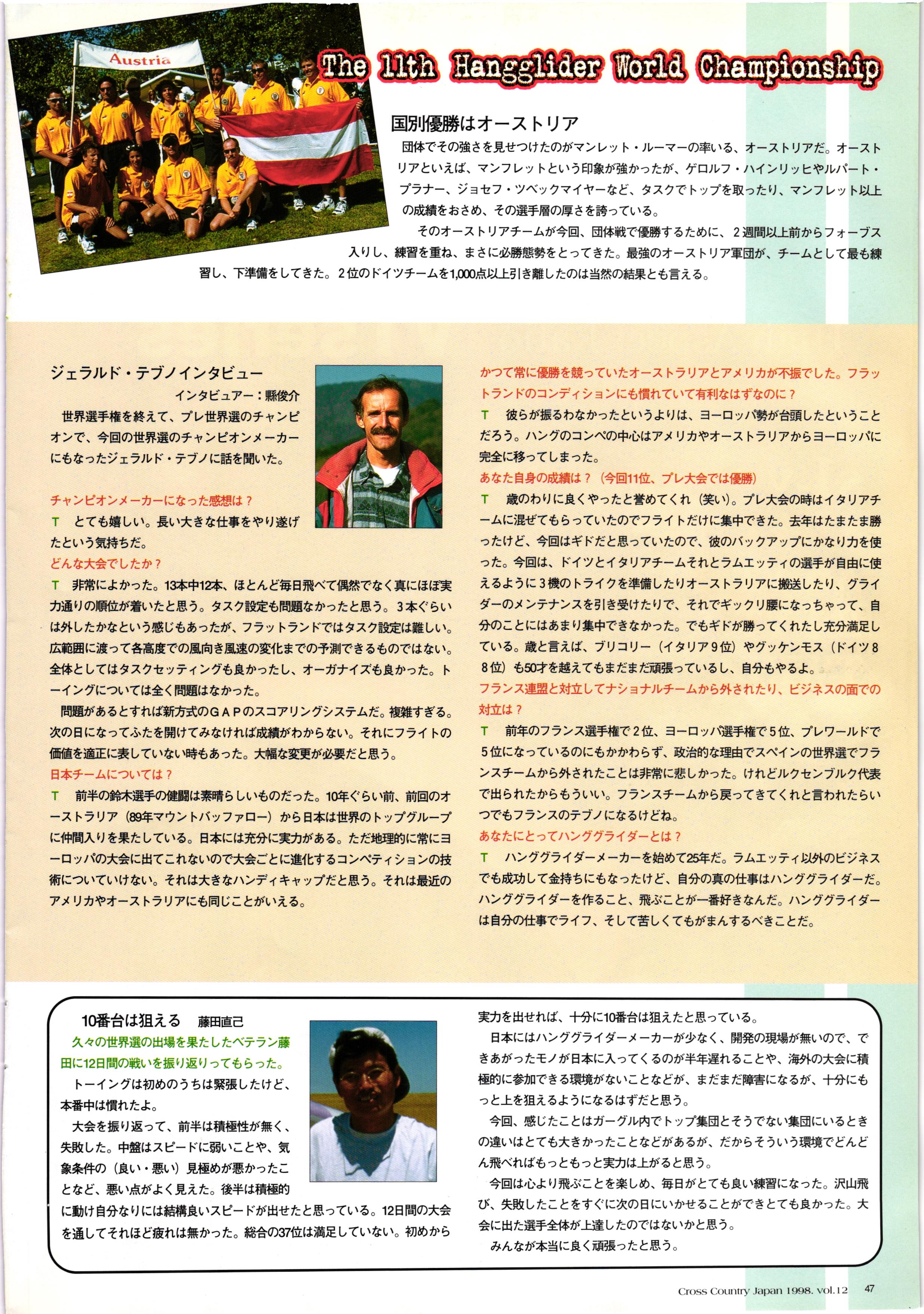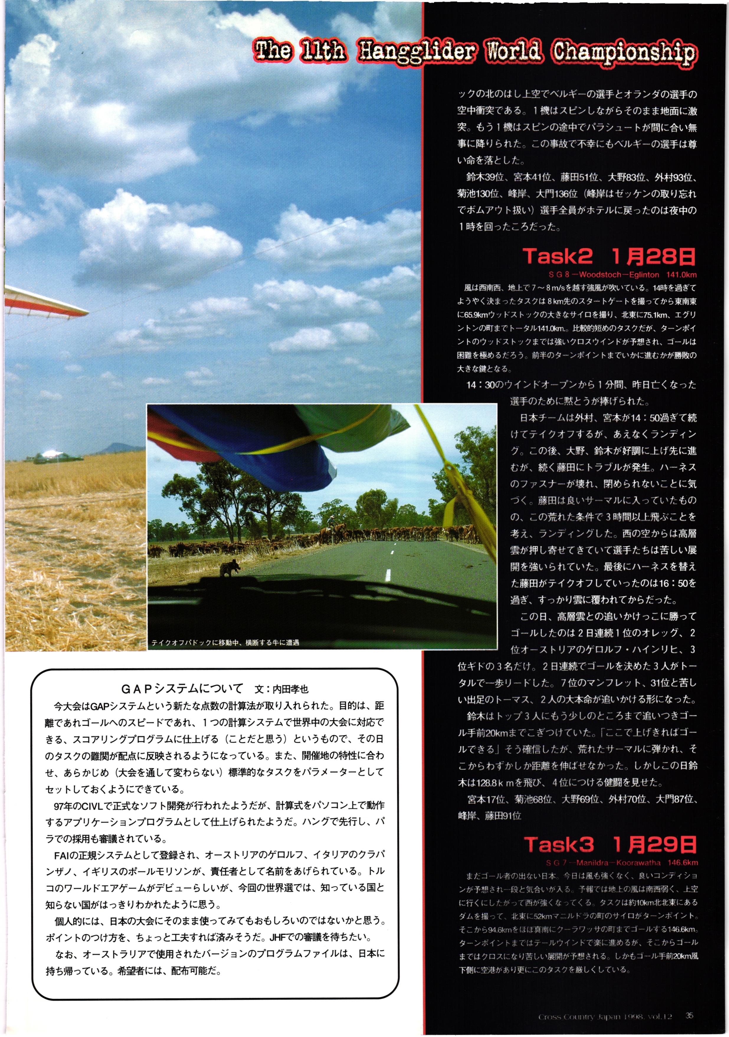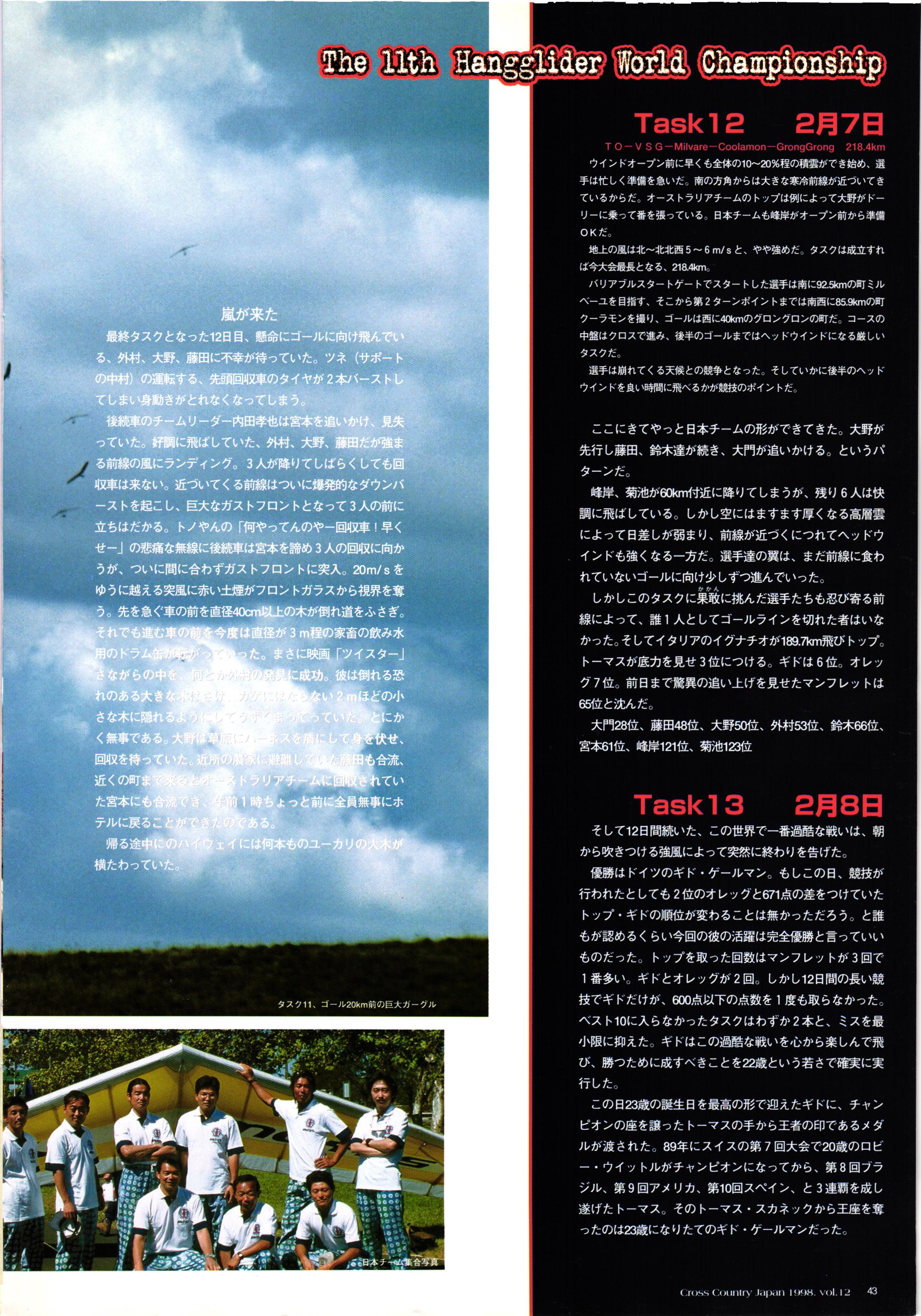 ランス シートはさまる CrOSS Country テる 8 る INDEX (Cover Ph ;Martin Scheel) おいおいおい さっきSafaroid w orld おっさん TIGE SEE にににに な ーーーーーー ちら Download36 wwwwwwwww ww 50 2 ZOOM 5 XC 遥かなるアンデスーチリ編 10 XC ヒマラヤを越えて 13 PG GLIDER TEST PRO DESIGN relax MANUFACTURE APCO立25周年を迎えて WING TIPS への道 ・PG ADVANCE TECHNIQUE アクティブ・フライト入門 20 AERO DYNAMICS 翼を科学する 22 ICARISTICS 24 METEOROLOGY メテオロジスト内藤のウエザー&フライト 26 METEOROLOGY トム・ブラットベリー&内藤邦裕の滑空気象 28 AREA NEWS NOVEL ファイナルグライド KEY POINT HG世界選手権特集 CALENDAR スケジュール一覧 MEDIA MIX 空飛ぶWEB SITE探検隊 51 ESSEY F'Sお説教 52 DEVELOPMENT 流行もの屋・べりぐっ堂 54 COMPETITION MORNINGSIDE GLIDE CONTEST 56.COMIC くろうすかにマリー 57 WORLD NEWS INFOMATION COMPETITION 大会結果 FORUM HG GLIDER TEST Wills WingFUSION 68 KEY POINT オーストラリア選手権&PVCブライト 72 XC 恵美ちゃんが飛ぶ 74 INTERVIEW 加藤豪 AREA 岩城スカイパーク 78 NEW PRODUCTS 80CCJバックナンバーのご紹介 00 ara おはなし ランタン ところまではまた。 勝 ます チタン あると すみま クロスカントリー日本版〒336-0025 埼玉県浦和市文蔵 3-36-9-101 TEL:048-866-0446; FAX:048-866-0447; NIFTY-Surve: BXL 07252 E-mail ccj@sainet.or.jp Editor in Chiet:西ヶ谷一志,General Editor;鈴木正史. Staff:小川貴子,佐藤哲也,田中雅子、松原正幸, 小池恵美子, Designer:藤井薫、古関敦子 Technical Editor:曾我部真人,板堀橋、川口竜太 Advisory Stat: 内藤邦裕、松田光平、休校、高塚龍二,日下部博 Mr.倉持&デジスビ緒集部,Translator:三枝晶子,縣俊介,タツロー、日下部裕子 - Spesial State:木下公• Spesial Thanks to:エリアブルー、加藤原, 津田清則, 山下勝田、本樹夫療 Correspondents: 山本黄、長島信一菊池守男、榊原啓二,松岡寧, H.KAZUHIKO, 岡田次雄、川口竜太、松尾英彦 トム・ブラッドベリ、ボブ・ドローリィーブルース・ゴールドスミス、ジョン・スザレック」 Photographer : マーチン・シール Editor in Chief (クロスカントリー英語版):シェリー・デブリ 月刊・奇数月25日発売●本誌の記事・写感等の無断複写・複製・転載を禁じます。Printed Japan. ©1996 Out Field inc. Cross Country Japan 3-36-9-101 Buzou Urawa-shi Saitama 336-0025 JAPAN Cross Country Japan is only a bimonthly, coming out on the 25th of month. Printed Japan © 1996 Out Field Inc. (Ph; David Varilek Montage;Bowen おは さ行 Cross Country Japan 1998. vol. 12 カントリー cha nasonicon