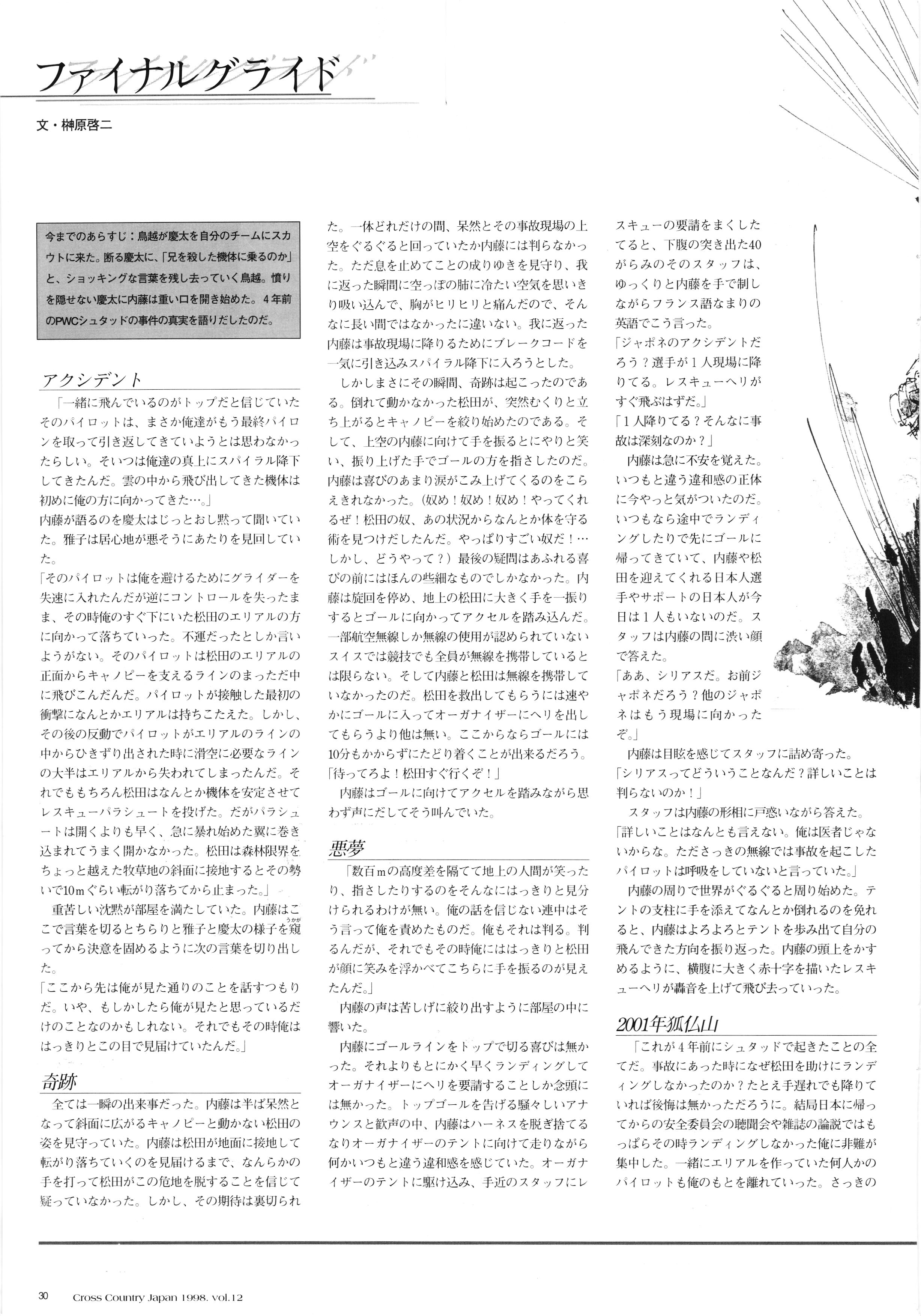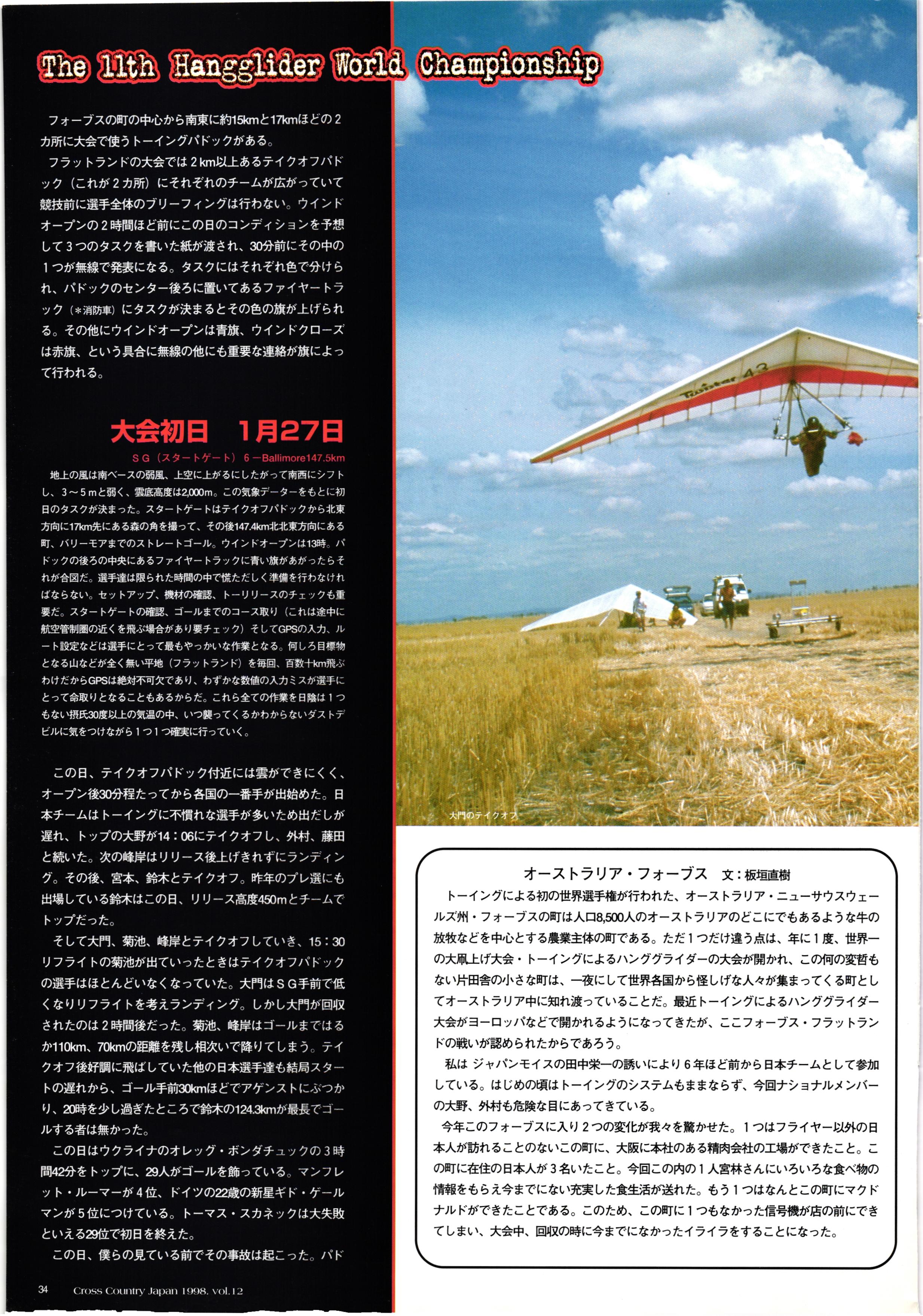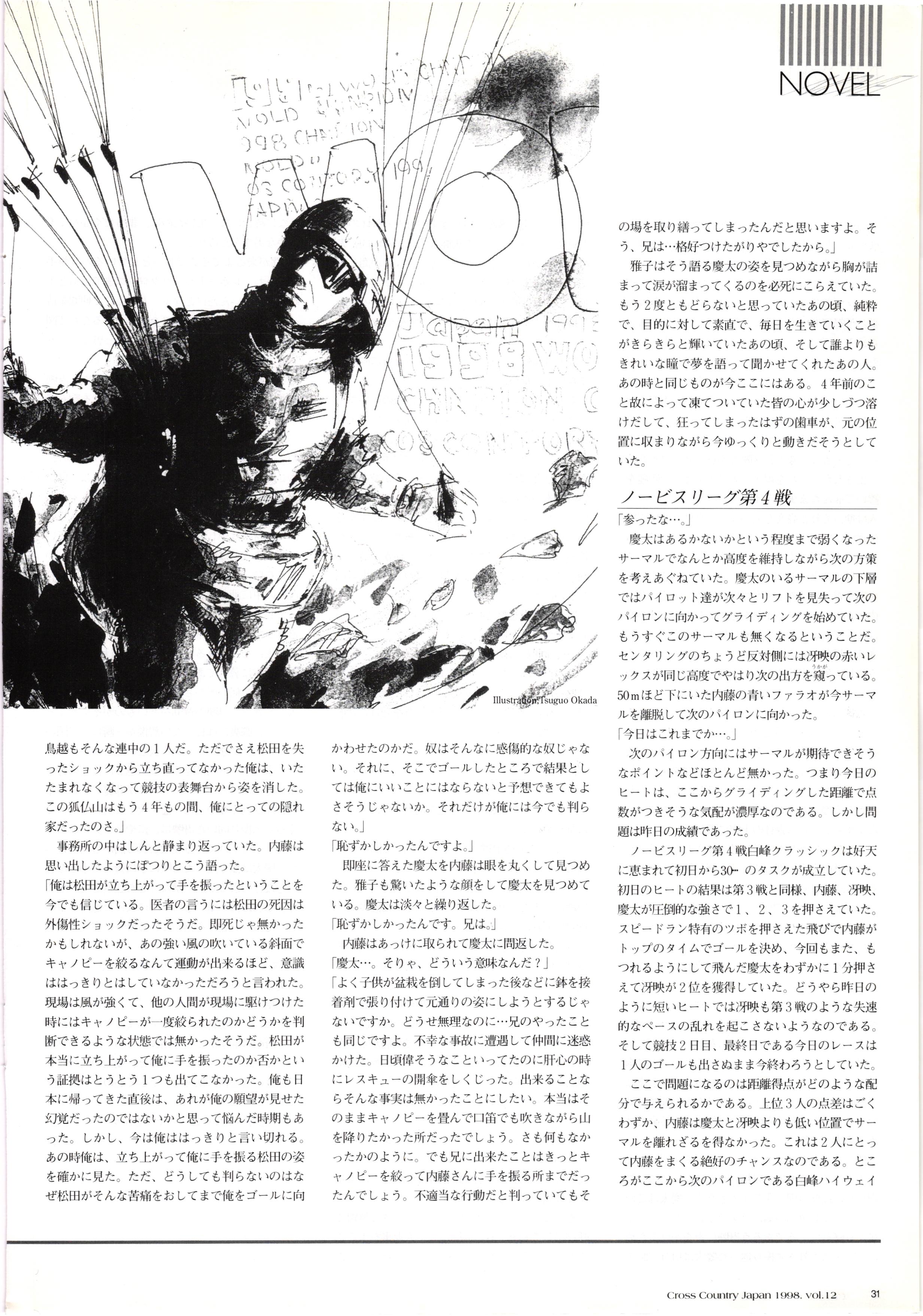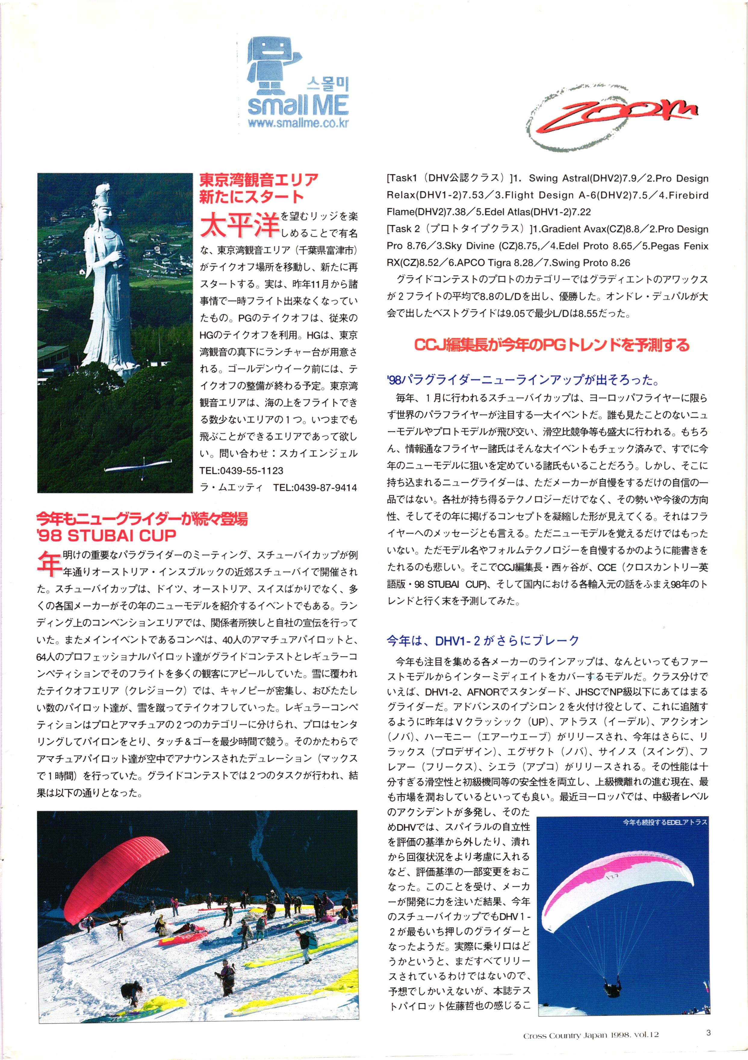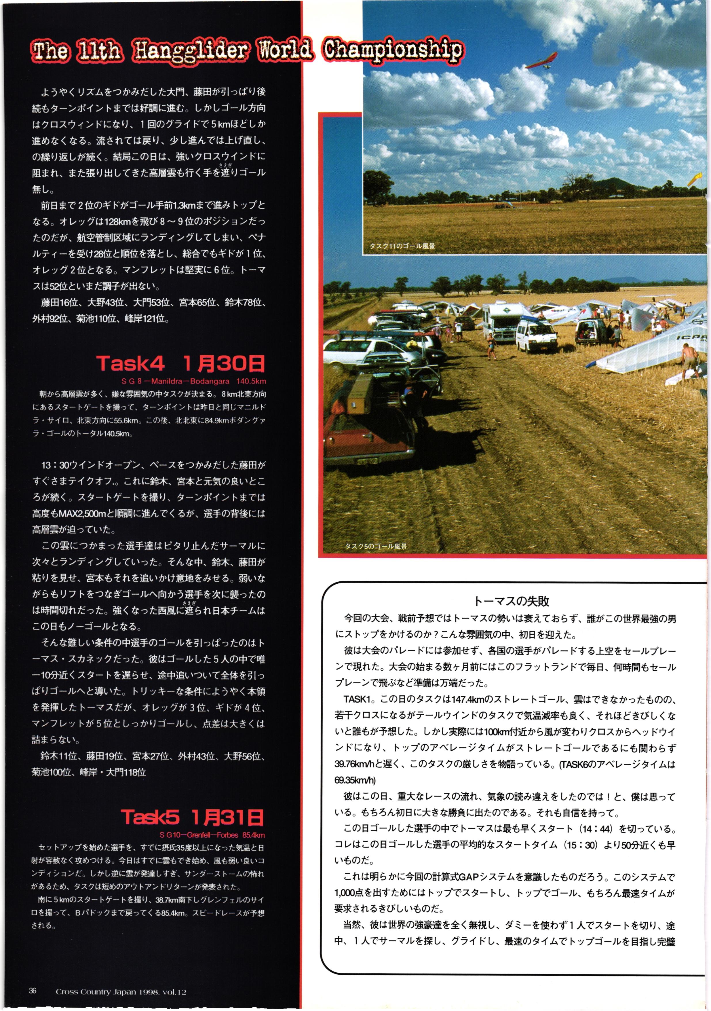 ランス シートはさまる CrOSS Country テる 8 る INDEX (Cover Ph ;Martin Scheel) おいおいおい さっきSafaroid w orld おっさん TIGE SEE にににに な ーーーーーー ちら Download36 wwwwwwwww ww 50 2 ZOOM 5 XC 遥かなるアンデスーチリ編 10 XC ヒマラヤを越えて 13 PG GLIDER TEST PRO DESIGN relax MANUFACTURE APCO立25周年を迎えて WING TIPS への道 ・PG ADVANCE TECHNIQUE アクティブ・フライト入門 20 AERO DYNAMICS 翼を科学する 22 ICARISTICS 24 METEOROLOGY メテオロジスト内藤のウエザー&フライト 26 METEOROLOGY トム・ブラットベリー&内藤邦裕の滑空気象 28 AREA NEWS NOVEL ファイナルグライド KEY POINT HG世界選手権特集 CALENDAR スケジュール一覧 MEDIA MIX 空飛ぶWEB SITE探検隊 51 ESSEY F'Sお説教 52 DEVELOPMENT 流行もの屋・べりぐっ堂 54 COMPETITION MORNINGSIDE GLIDE CONTEST 56.COMIC くろうすかにマリー 57 WORLD NEWS INFOMATION COMPETITION 大会結果 FORUM HG GLIDER TEST Wills WingFUSION 68 KEY POINT オーストラリア選手権&PVCブライト 72 XC 恵美ちゃんが飛ぶ 74 INTERVIEW 加藤豪 AREA 岩城スカイパーク 78 NEW PRODUCTS 80CCJバックナンバーのご紹介 00 ara おはなし ランタン ところまではまた。 勝 ます チタン あると すみま クロスカントリー日本版〒336-0025 埼玉県浦和市文蔵 3-36-9-101 TEL:048-866-0446; FAX:048-866-0447; NIFTY-Surve: BXL 07252 E-mail ccj@sainet.or.jp Editor in Chiet:西ヶ谷一志,General Editor;鈴木正史. Staff:小川貴子,佐藤哲也,田中雅子、松原正幸, 小池恵美子, Designer:藤井薫、古関敦子 Technical Editor:曾我部真人,板堀橋、川口竜太 Advisory Stat: 内藤邦裕、松田光平、休校、高塚龍二,日下部博 Mr.倉持&デジスビ緒集部,Translator:三枝晶子,縣俊介,タツロー、日下部裕子 - Spesial State:木下公• Spesial Thanks to:エリアブルー、加藤原, 津田清則, 山下勝田、本樹夫療 Correspondents: 山本黄、長島信一菊池守男、榊原啓二,松岡寧, H.KAZUHIKO, 岡田次雄、川口竜太、松尾英彦 トム・ブラッドベリ、ボブ・ドローリィーブルース・ゴールドスミス、ジョン・スザレック」 Photographer : マーチン・シール Editor in Chief (クロスカントリー英語版):シェリー・デブリ 月刊・奇数月25日発売●本誌の記事・写感等の無断複写・複製・転載を禁じます。Printed Japan. ©1996 Out Field inc. Cross Country Japan 3-36-9-101 Buzou Urawa-shi Saitama 336-0025 JAPAN Cross Country Japan is only a bimonthly, coming out on the 25th of month. Printed Japan © 1996 Out Field Inc. (Ph; David Varilek Montage;Bowen おは さ行 Cross Country Japan 1998. vol. 12 カントリー cha nasonicon
