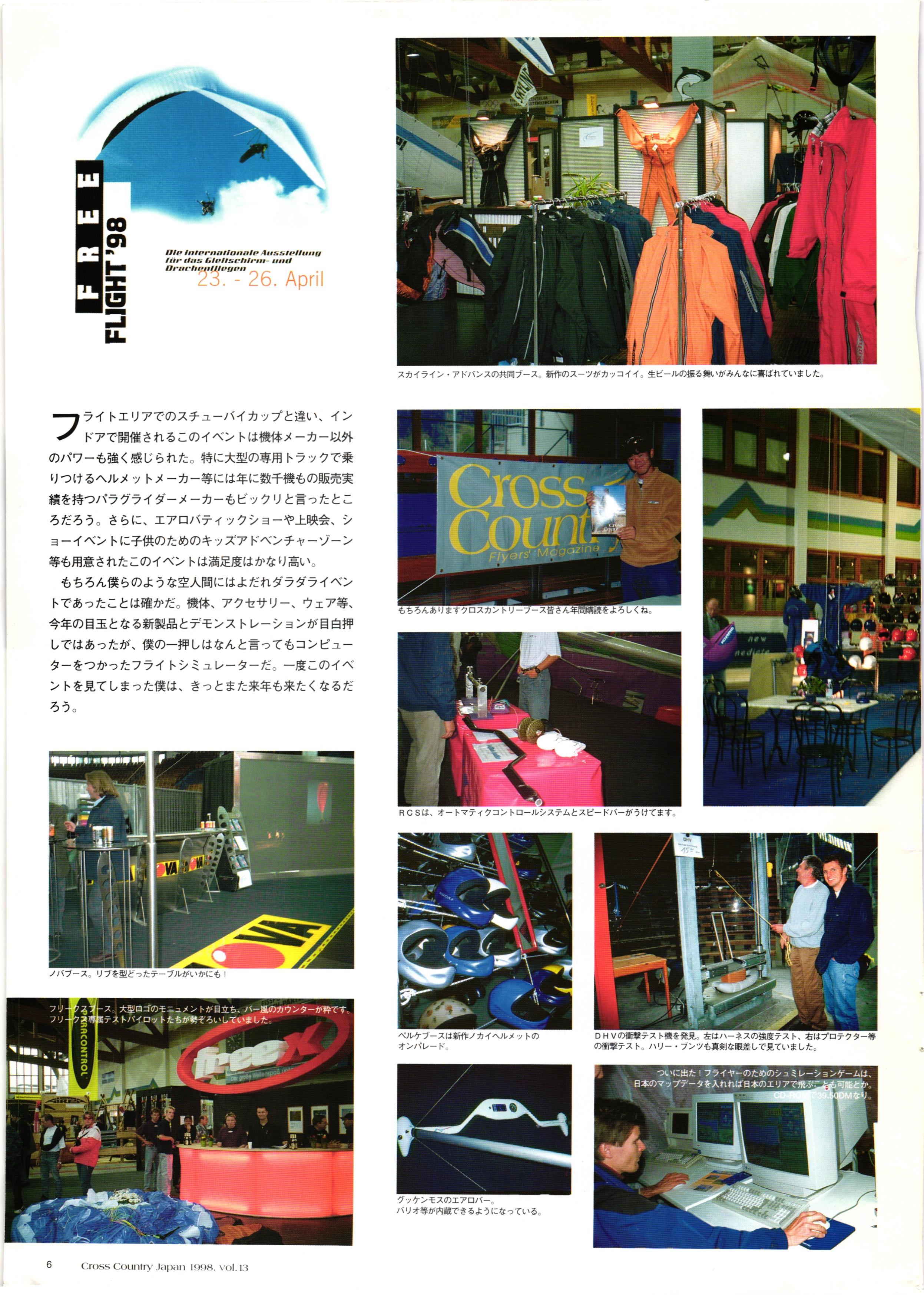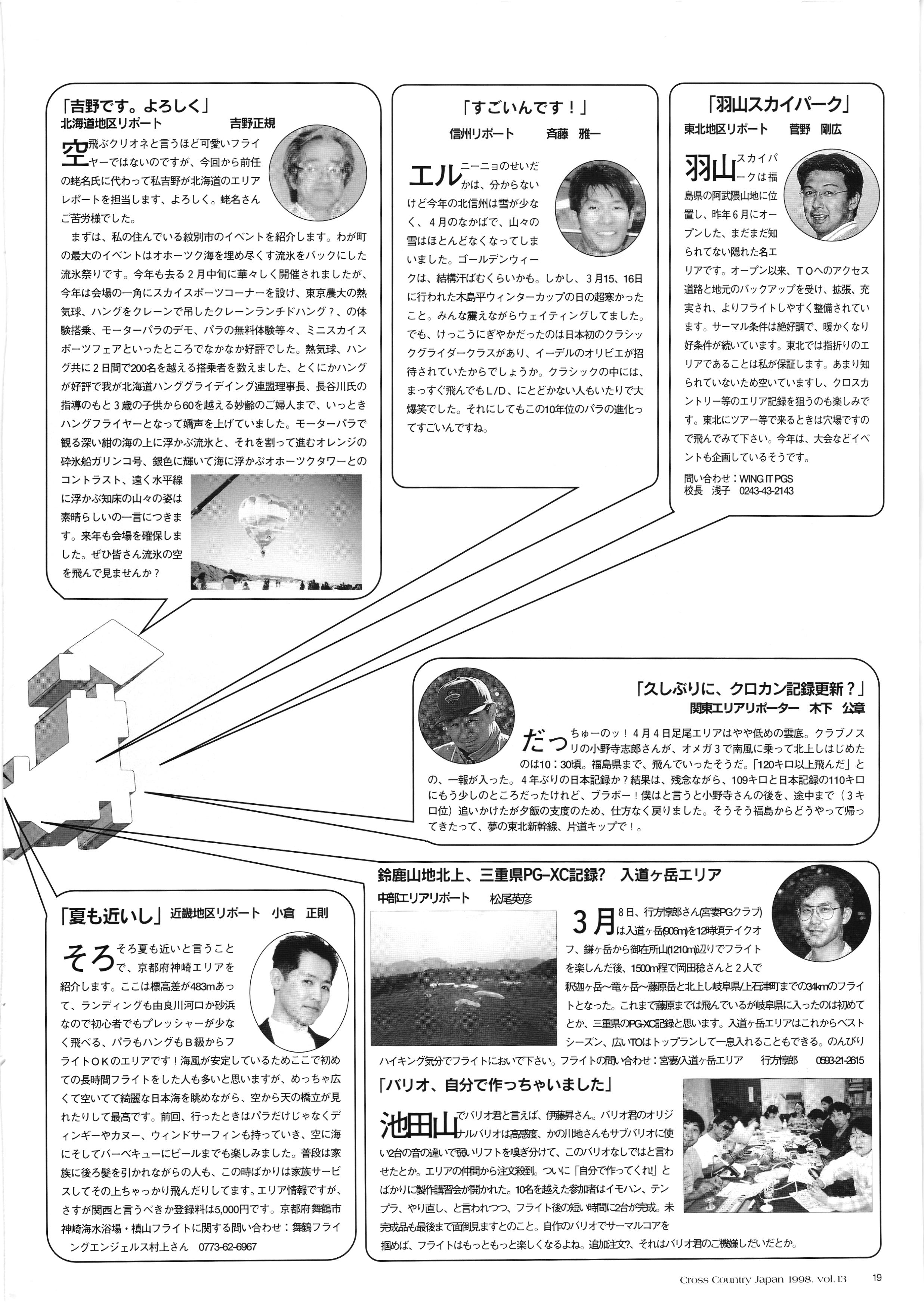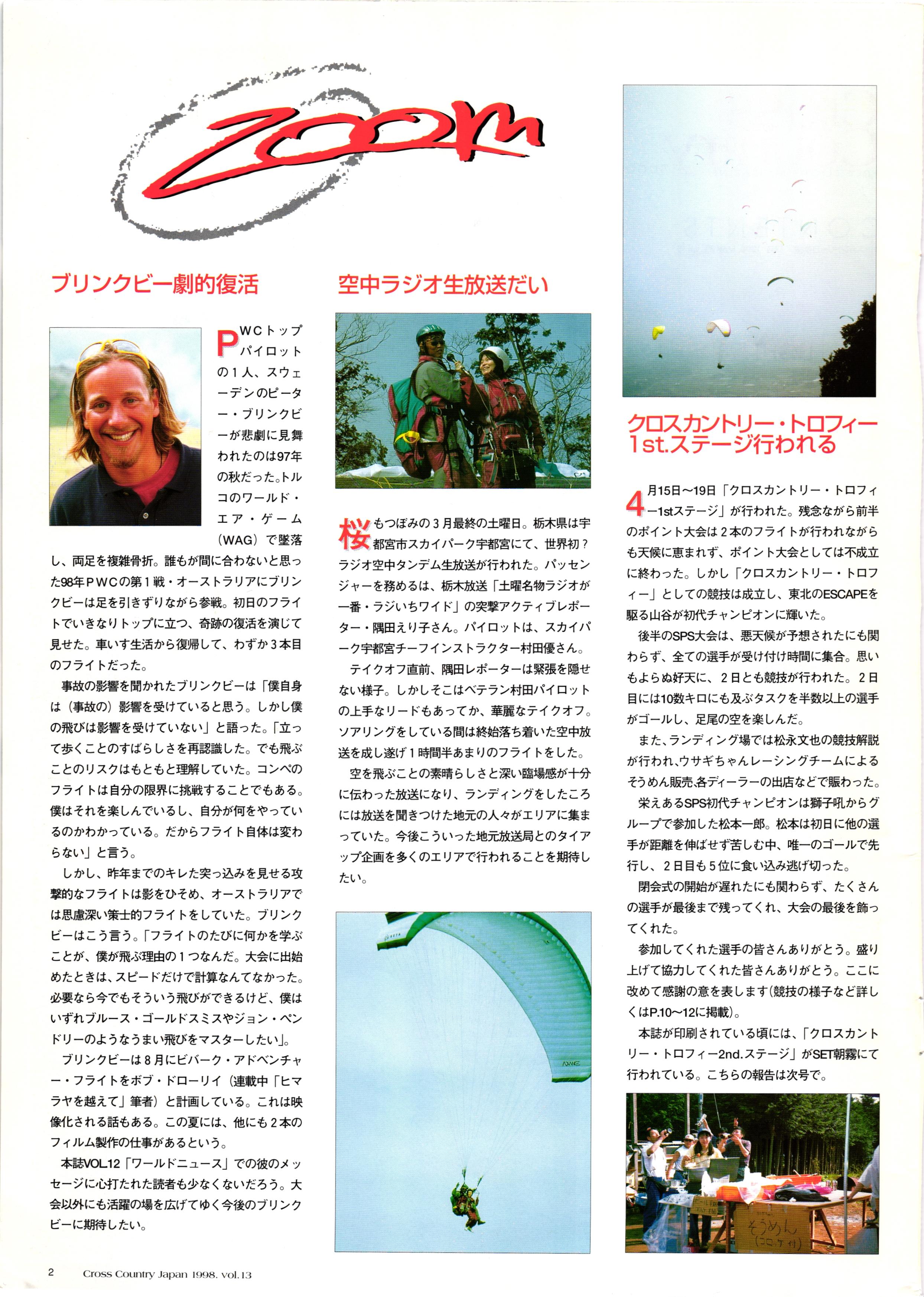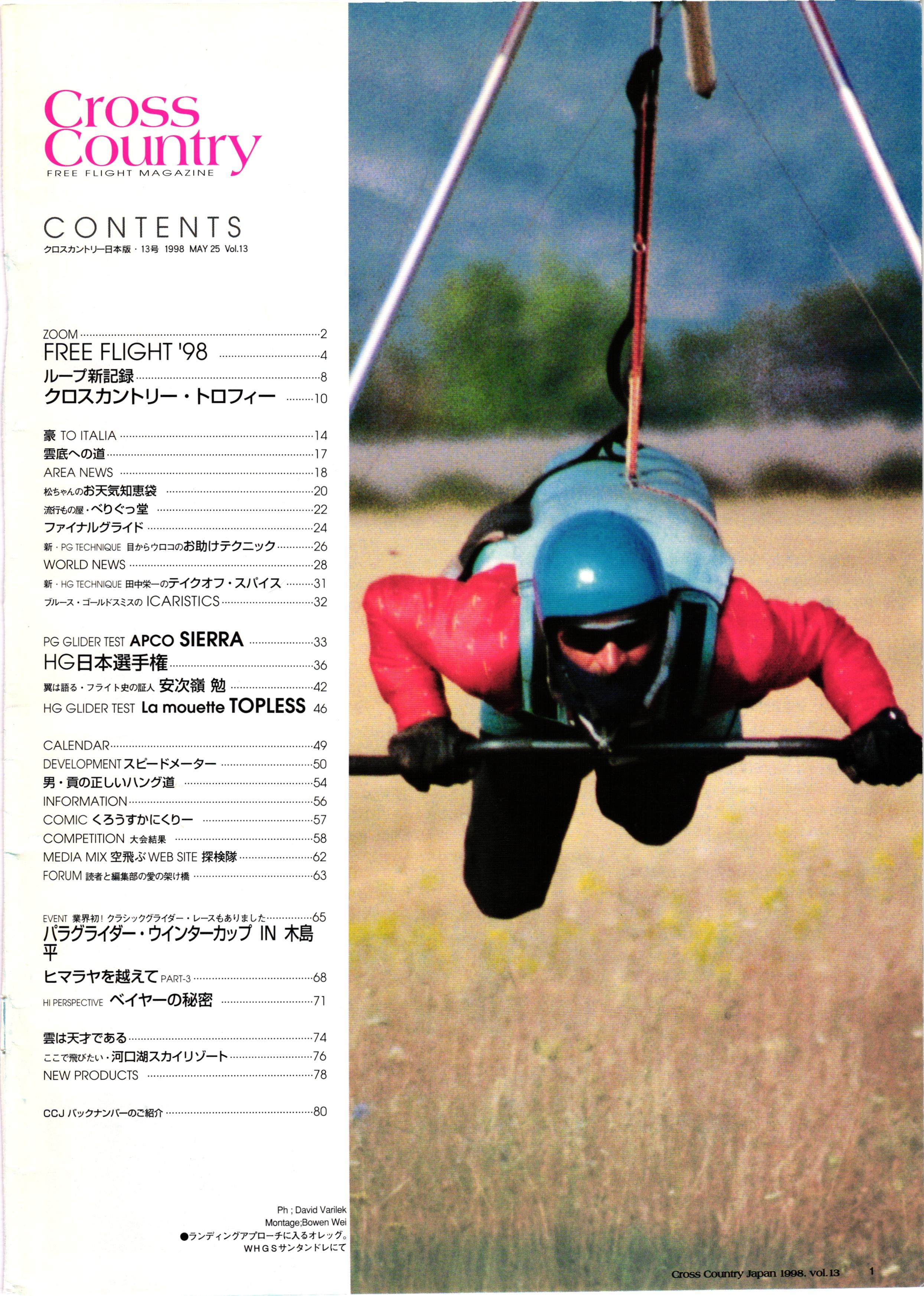 きれい CrOSS Country FREE FLIGHT MAGAZINE CONTENTS クロスカントリー日本版・13号 1998 MAY 25 Vol.13 2 あん リンク インター なんとか 4 ZOOM ...... FREE FLIGHT '98 .. ループ新記録 ... .. クロスカントリー・トロフィー ... 8 おまけ品 2017 0_ おきたいな ながる ..... I ............ 7 8 0 TO ITALIA .............. 雲底への道・ AREA NEWS 松ちゃんのお天気知恵袋 ............ 流行もの屋・べりぐっ堂 ファイナルグライド 新・PG TECHNIQUE 目からウロコのお助けテクニック...... WORLD NEWS .......... .. ...... 新・HG TECHNIQUE 田中栄一のテイクオフ・スパイス ....... .............. 4 % 3 ブルース・ゴールドスミス .............. .......... PG GLIDER TEST APCO SIERRA HG日本選手権 翼は語る・フライト史の証人 安次嶺 勉 HG GLIDER TEST La mouette TOPLESS ............. ........... ......... CALENDAR... DEVELOPMENT スピードメーター ..... 男・貢の正しいハング道 ............ INFORMATION. COMIC くろうすかにくり一 ... COMPETITION 大会結果 MEDIA MIX 空飛ぶWEB SITE 探検隊 ... FORUM 読者と編集部の愛の架け橋 ...... ... EVENT 業界初! クラシックグライダー・レースもありました .........65 パラグライダー・ウインターカップ IN 木島 平 .........................68 中国 ヒマラヤを越えて PART-3 . HI PERSPECTIVE ベイヤーの秘密 ..............71 BO ※ Kawa 雲は天才である ここで飛びたい・河口湖スカイリゾート・ NEW PRODUCTS ............ CCJ バックナンバーのご紹介... Ph; David Varilek Montage;Bowen Wei ●ランディングアプローチに入るオレッグ。 WHGSサンタンドレにて おい Cross Country Japan 1998. vol.13