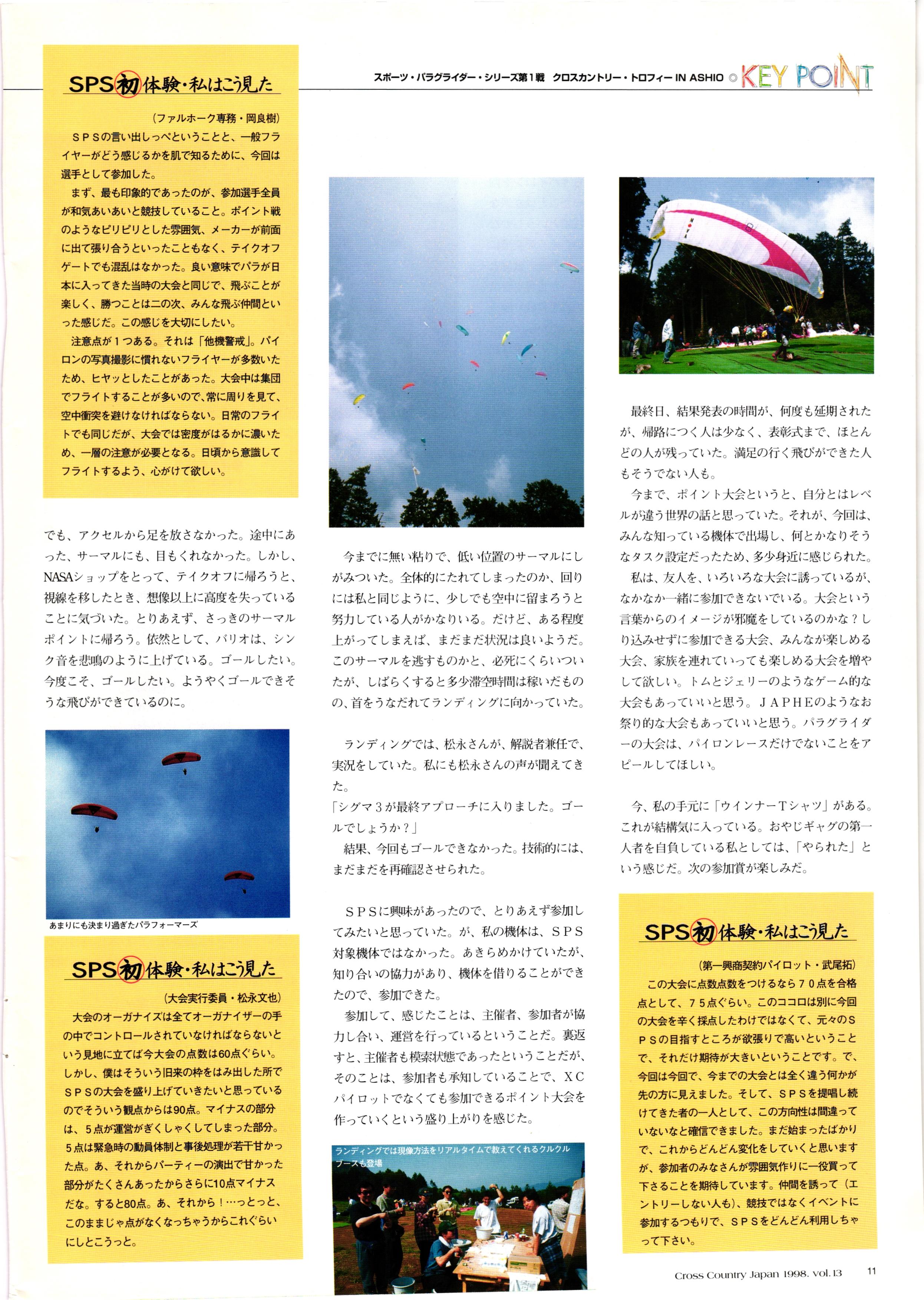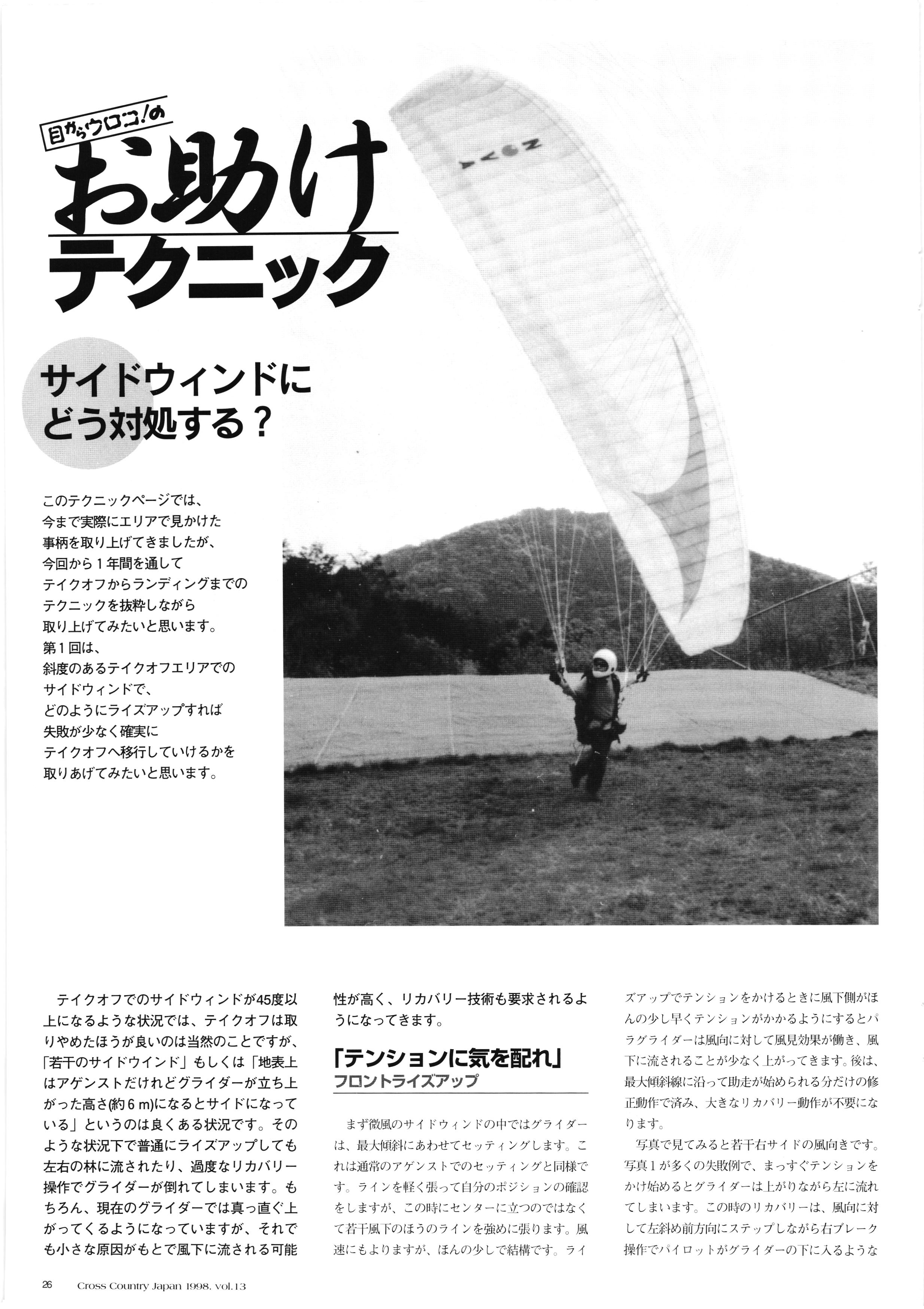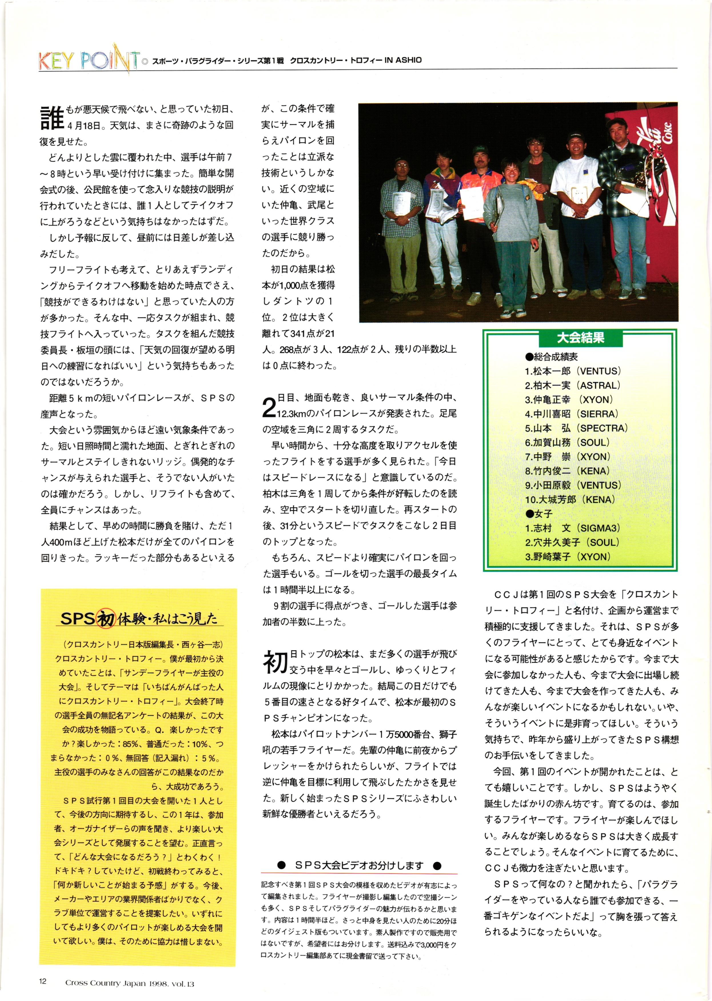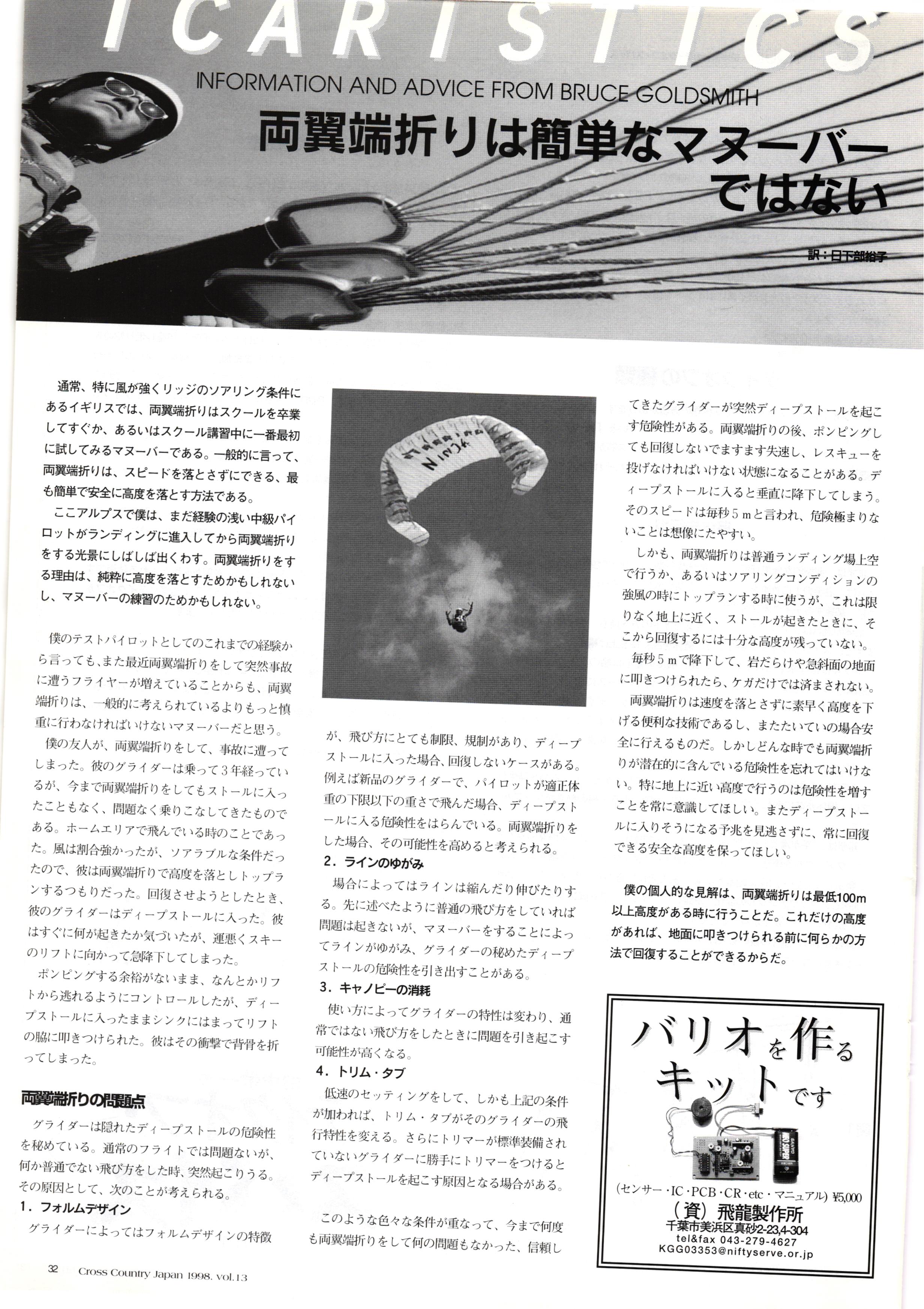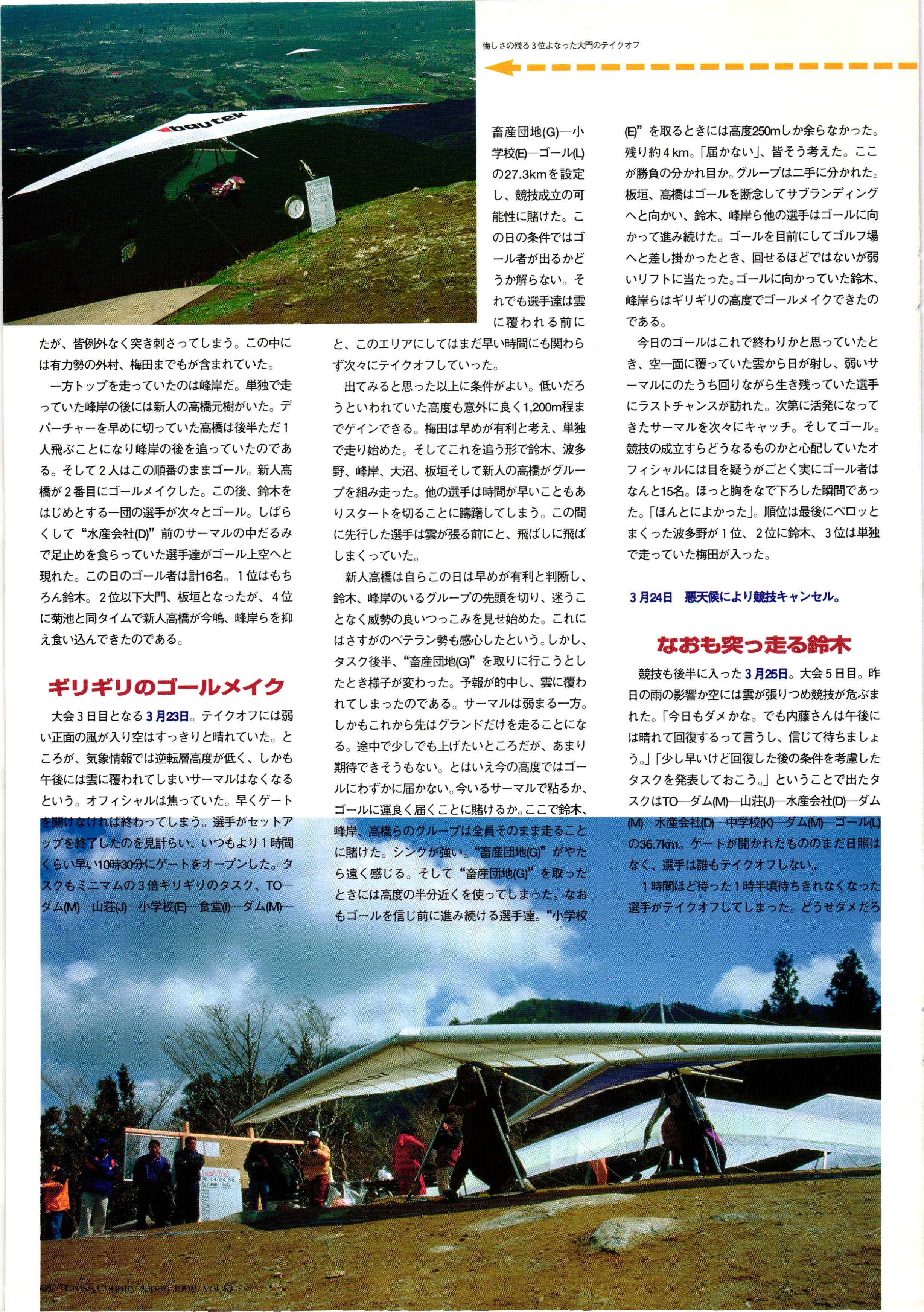 きれい CrOSS Country FREE FLIGHT MAGAZINE CONTENTS クロスカントリー日本版・13号 1998 MAY 25 Vol.13 2 あん リンク インター なんとか 4 ZOOM ...... FREE FLIGHT '98 .. ループ新記録 ... .. クロスカントリー・トロフィー ... 8 おまけ品 2017 0_ おきたいな ながる ..... I ............ 7 8 0 TO ITALIA .............. 雲底への道・ AREA NEWS 松ちゃんのお天気知恵袋 ............ 流行もの屋・べりぐっ堂 ファイナルグライド 新・PG TECHNIQUE 目からウロコのお助けテクニック...... WORLD NEWS .......... .. ...... 新・HG TECHNIQUE 田中栄一のテイクオフ・スパイス ....... .............. 4 % 3 ブルース・ゴールドスミス .............. .......... PG GLIDER TEST APCO SIERRA HG日本選手権 翼は語る・フライト史の証人 安次嶺 勉 HG GLIDER TEST La mouette TOPLESS ............. ........... ......... CALENDAR... DEVELOPMENT スピードメーター ..... 男・貢の正しいハング道 ............ INFORMATION. COMIC くろうすかにくり一 ... COMPETITION 大会結果 MEDIA MIX 空飛ぶWEB SITE 探検隊 ... FORUM 読者と編集部の愛の架け橋 ...... ... EVENT 業界初! クラシックグライダー・レースもありました .........65 パラグライダー・ウインターカップ IN 木島 平 .........................68 中国 ヒマラヤを越えて PART-3 . HI PERSPECTIVE ベイヤーの秘密 ..............71 BO ※ Kawa 雲は天才である ここで飛びたい・河口湖スカイリゾート・ NEW PRODUCTS ............ CCJ バックナンバーのご紹介... Ph; David Varilek Montage;Bowen Wei ●ランディングアプローチに入るオレッグ。 WHGSサンタンドレにて おい Cross Country Japan 1998. vol.13
