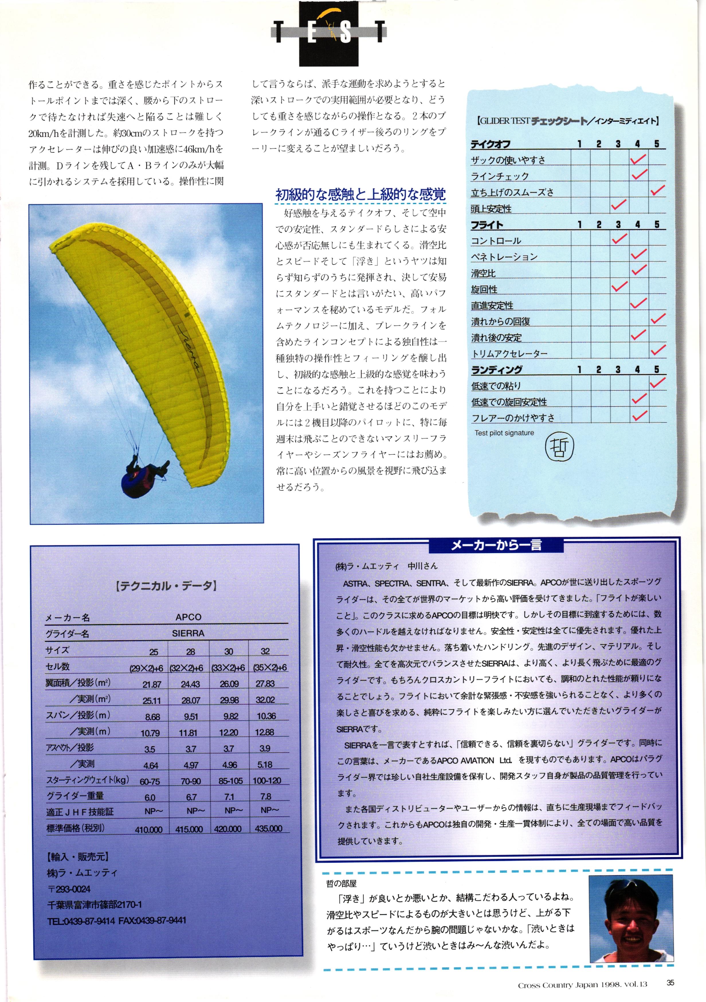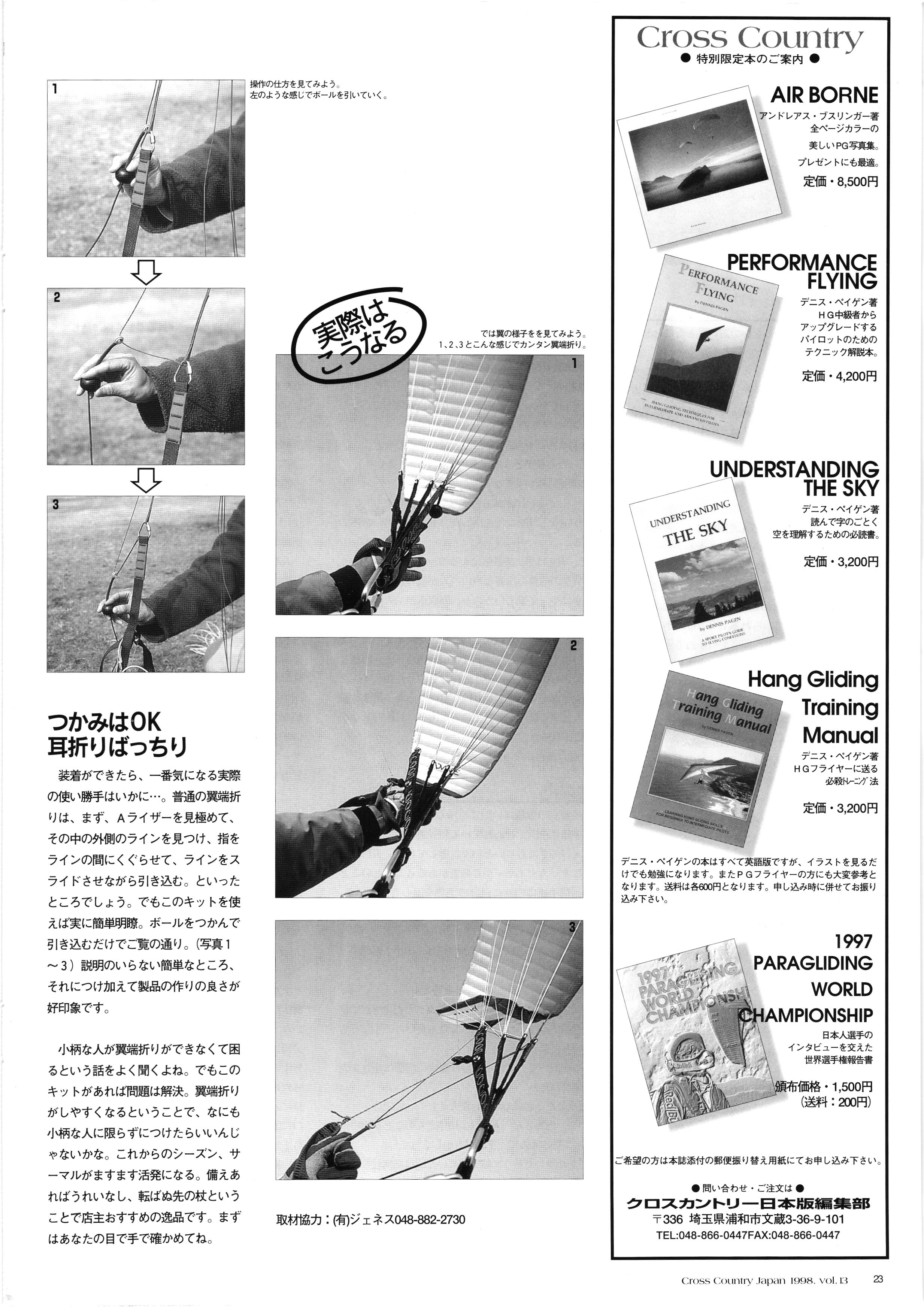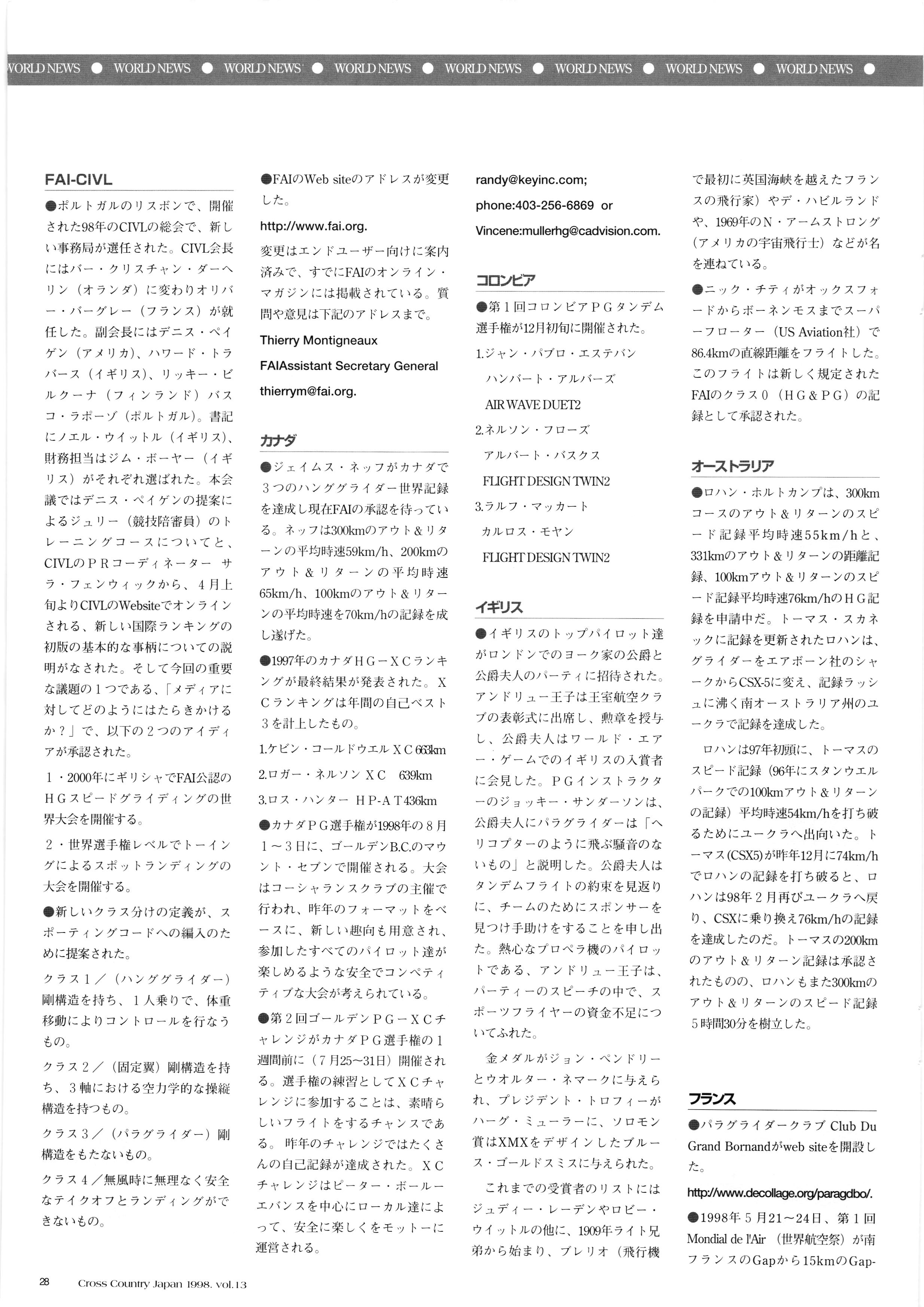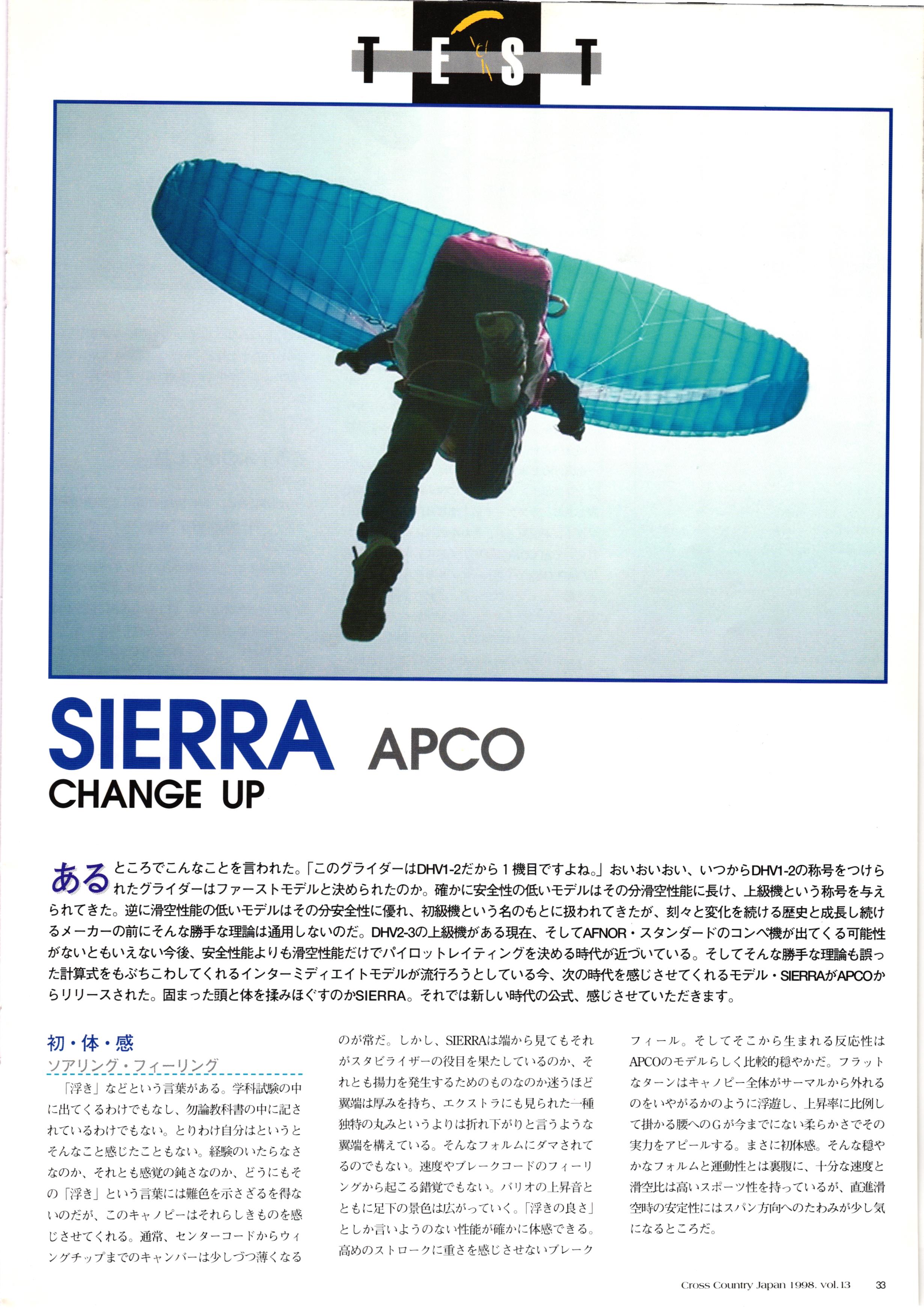 きれい CrOSS Country FREE FLIGHT MAGAZINE CONTENTS クロスカントリー日本版・13号 1998 MAY 25 Vol.13 2 あん リンク インター なんとか 4 ZOOM ...... FREE FLIGHT '98 .. ループ新記録 ... .. クロスカントリー・トロフィー ... 8 おまけ品 2017 0_ おきたいな ながる ..... I ............ 7 8 0 TO ITALIA .............. 雲底への道・ AREA NEWS 松ちゃんのお天気知恵袋 ............ 流行もの屋・べりぐっ堂 ファイナルグライド 新・PG TECHNIQUE 目からウロコのお助けテクニック...... WORLD NEWS .......... .. ...... 新・HG TECHNIQUE 田中栄一のテイクオフ・スパイス ....... .............. 4 % 3 ブルース・ゴールドスミス .............. .......... PG GLIDER TEST APCO SIERRA HG日本選手権 翼は語る・フライト史の証人 安次嶺 勉 HG GLIDER TEST La mouette TOPLESS ............. ........... ......... CALENDAR... DEVELOPMENT スピードメーター ..... 男・貢の正しいハング道 ............ INFORMATION. COMIC くろうすかにくり一 ... COMPETITION 大会結果 MEDIA MIX 空飛ぶWEB SITE 探検隊 ... FORUM 読者と編集部の愛の架け橋 ...... ... EVENT 業界初! クラシックグライダー・レースもありました .........65 パラグライダー・ウインターカップ IN 木島 平 .........................68 中国 ヒマラヤを越えて PART-3 . HI PERSPECTIVE ベイヤーの秘密 ..............71 BO ※ Kawa 雲は天才である ここで飛びたい・河口湖スカイリゾート・ NEW PRODUCTS ............ CCJ バックナンバーのご紹介... Ph; David Varilek Montage;Bowen Wei ●ランディングアプローチに入るオレッグ。 WHGSサンタンドレにて おい Cross Country Japan 1998. vol.13